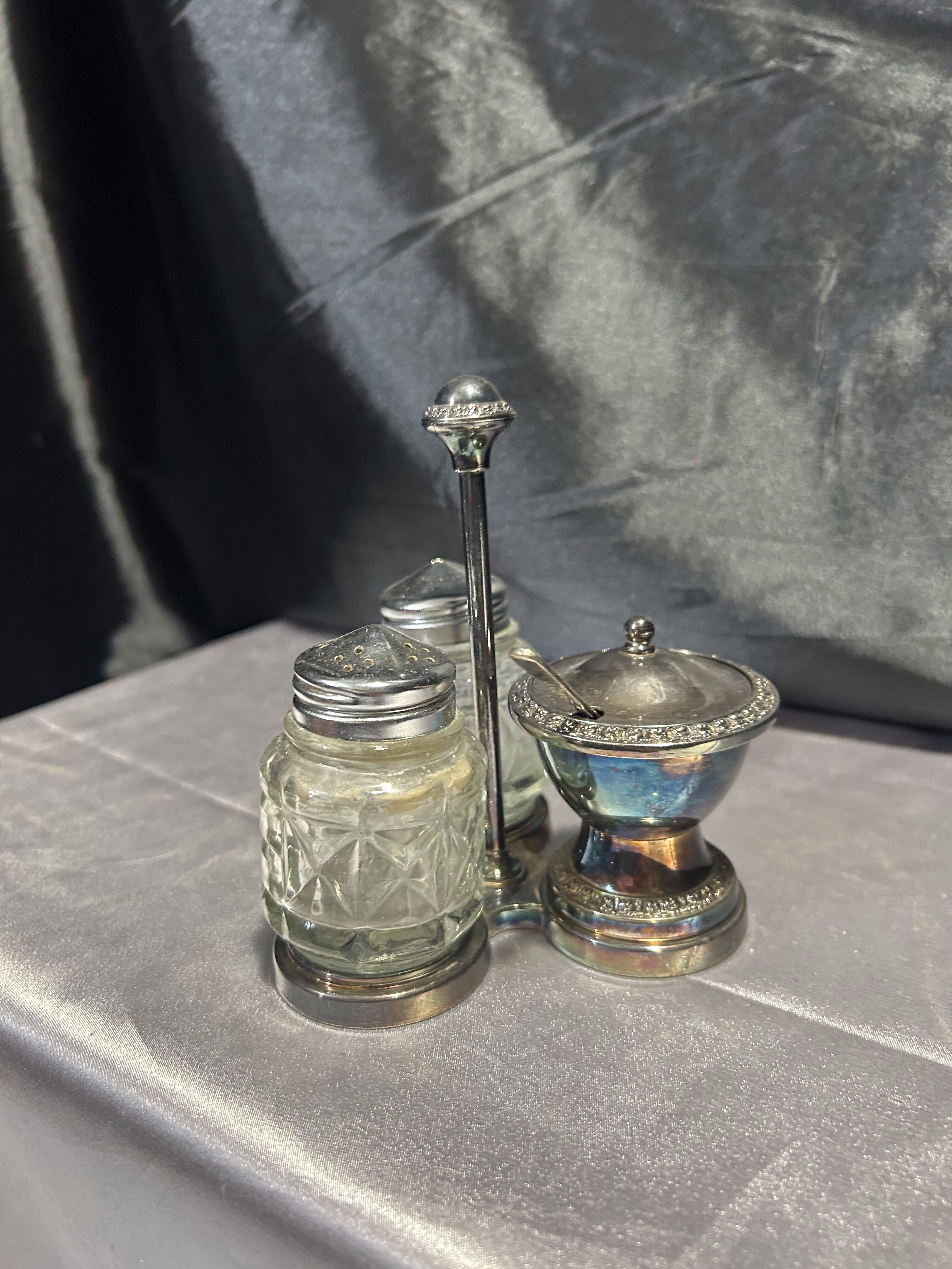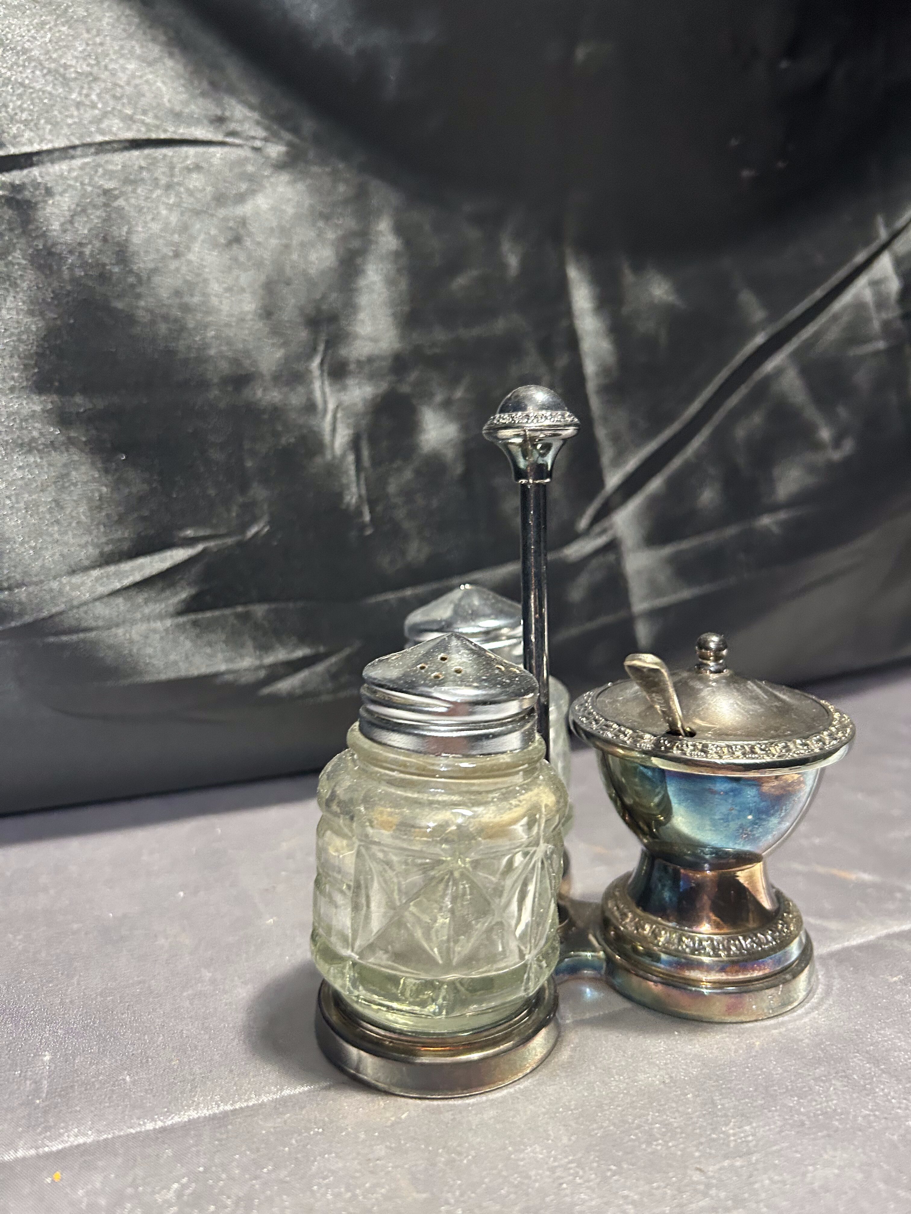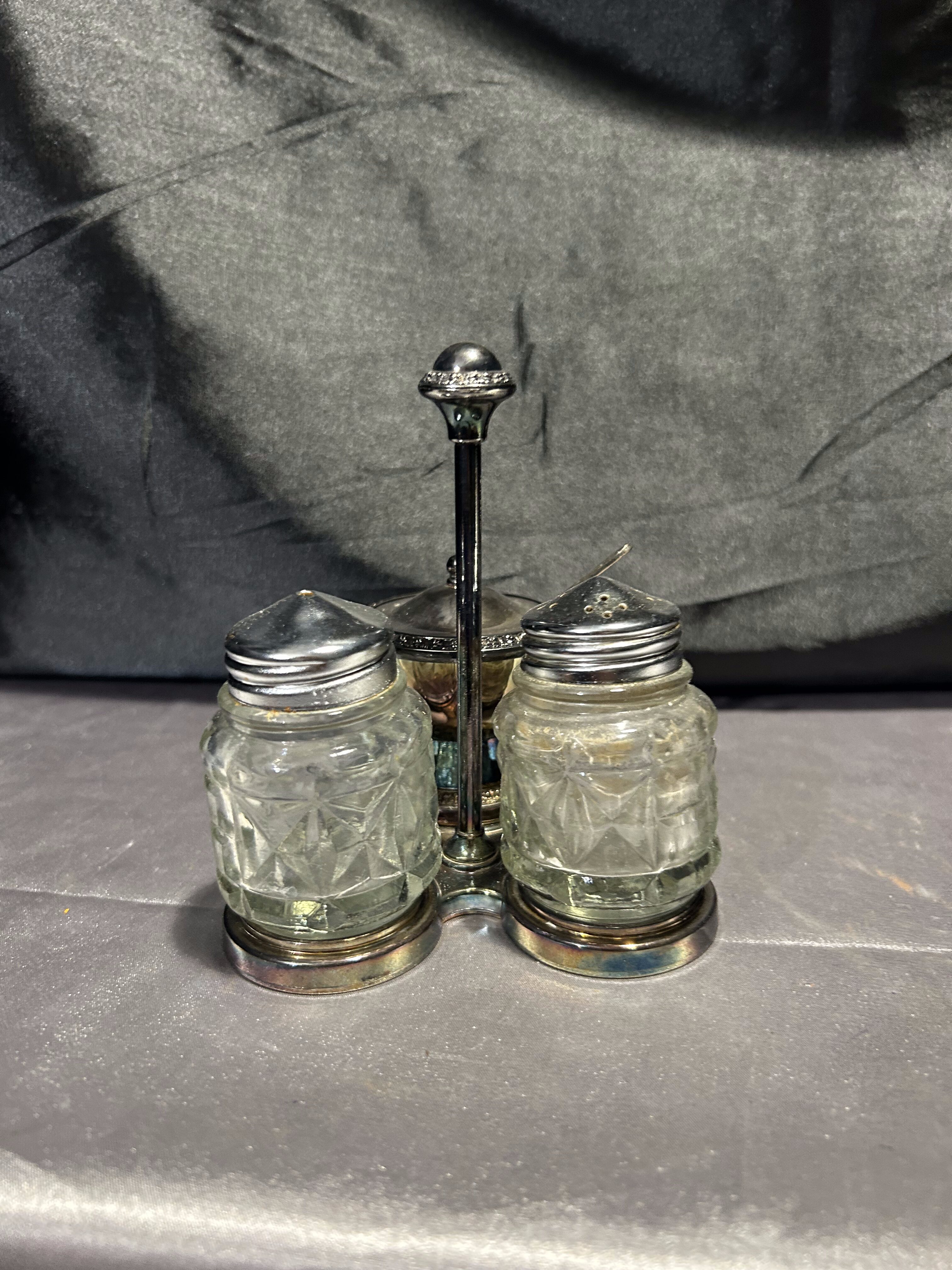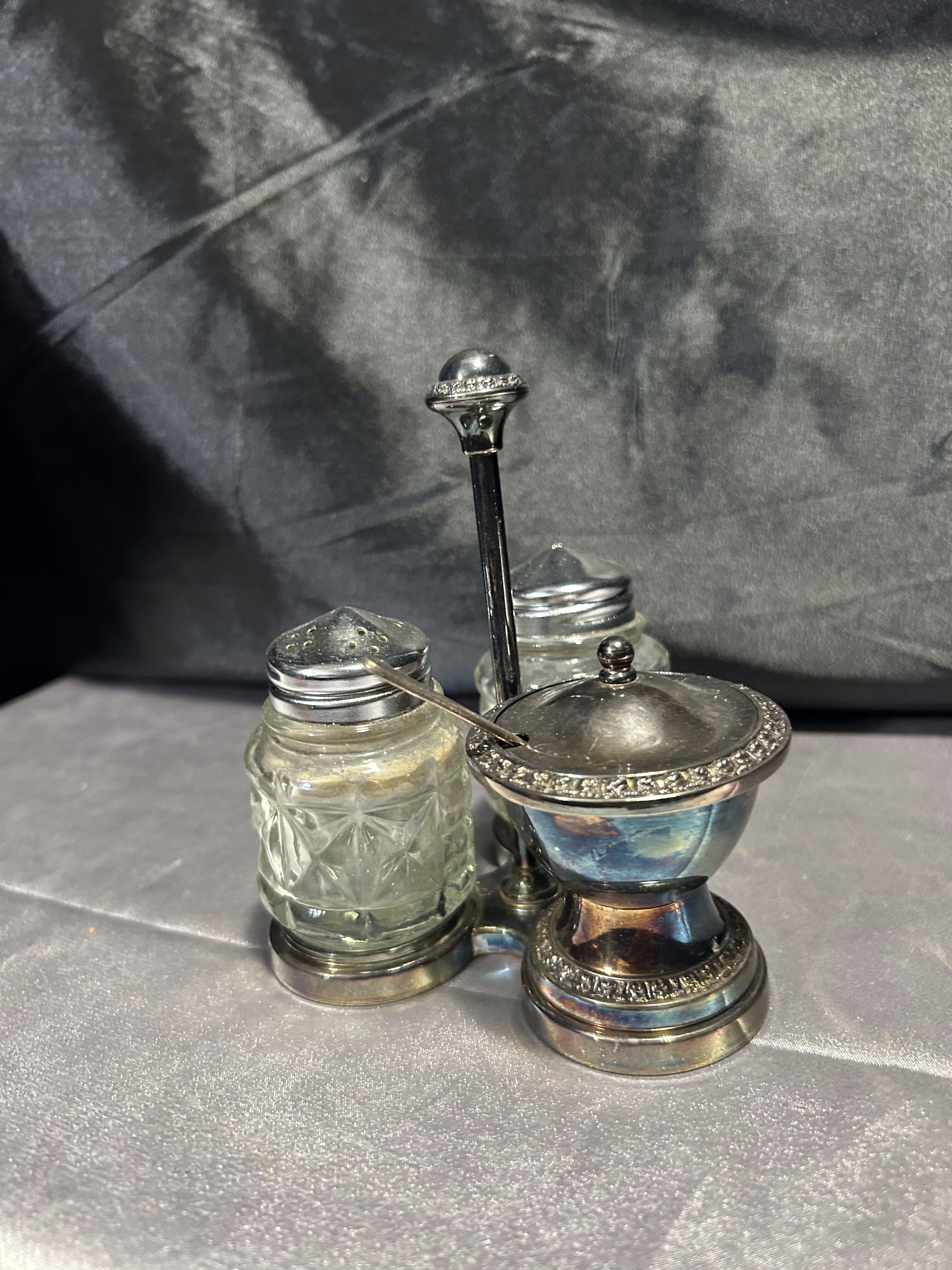Stylowy, potrójny przyprawnik na stojaku – komplet składający się z solniczki, pieprzniczki oraz cukiernicy (lub pojemniczka na musztardę) z pokrywką i łyżeczką. Całość oparta na dekoracyjnym metalowym stojaku o delikatnym zdobieniu. Szkło szlifowane w geometryczny wzór, a metalowe elementy z piękną patyną czasu. Praktyczny i elegancki dodatek do kuchni lub jadalni w stylu retro czy klasycznym.