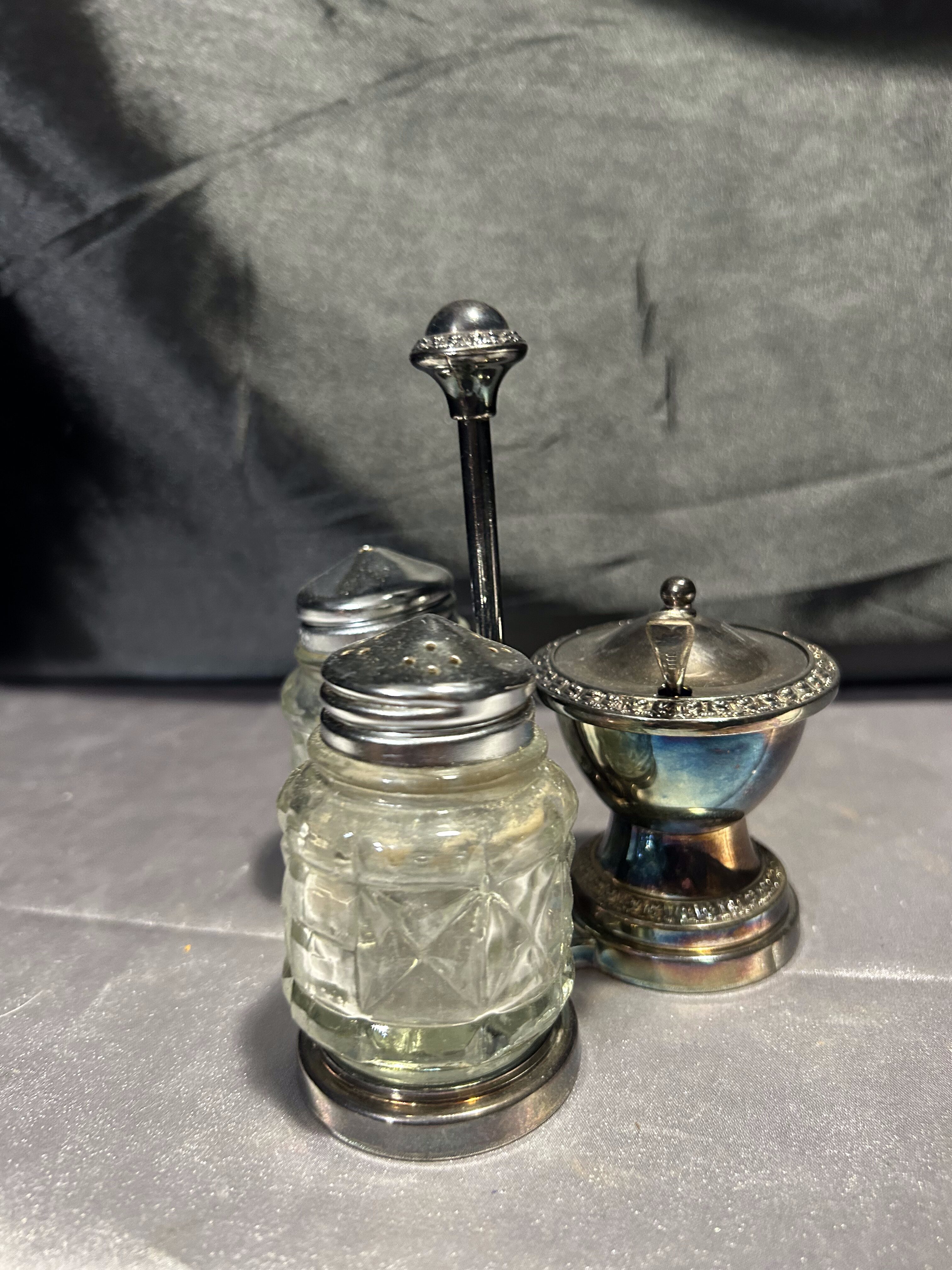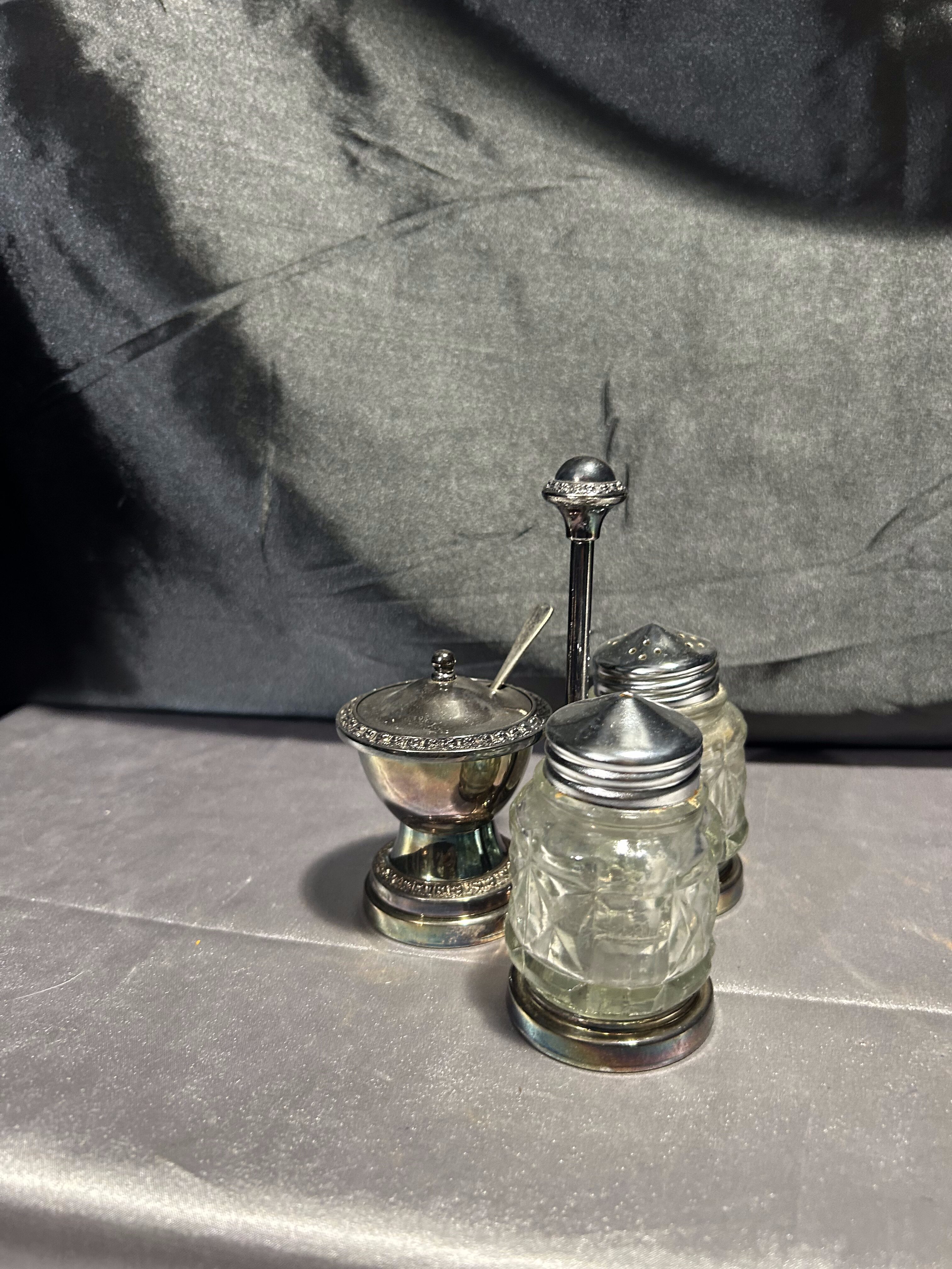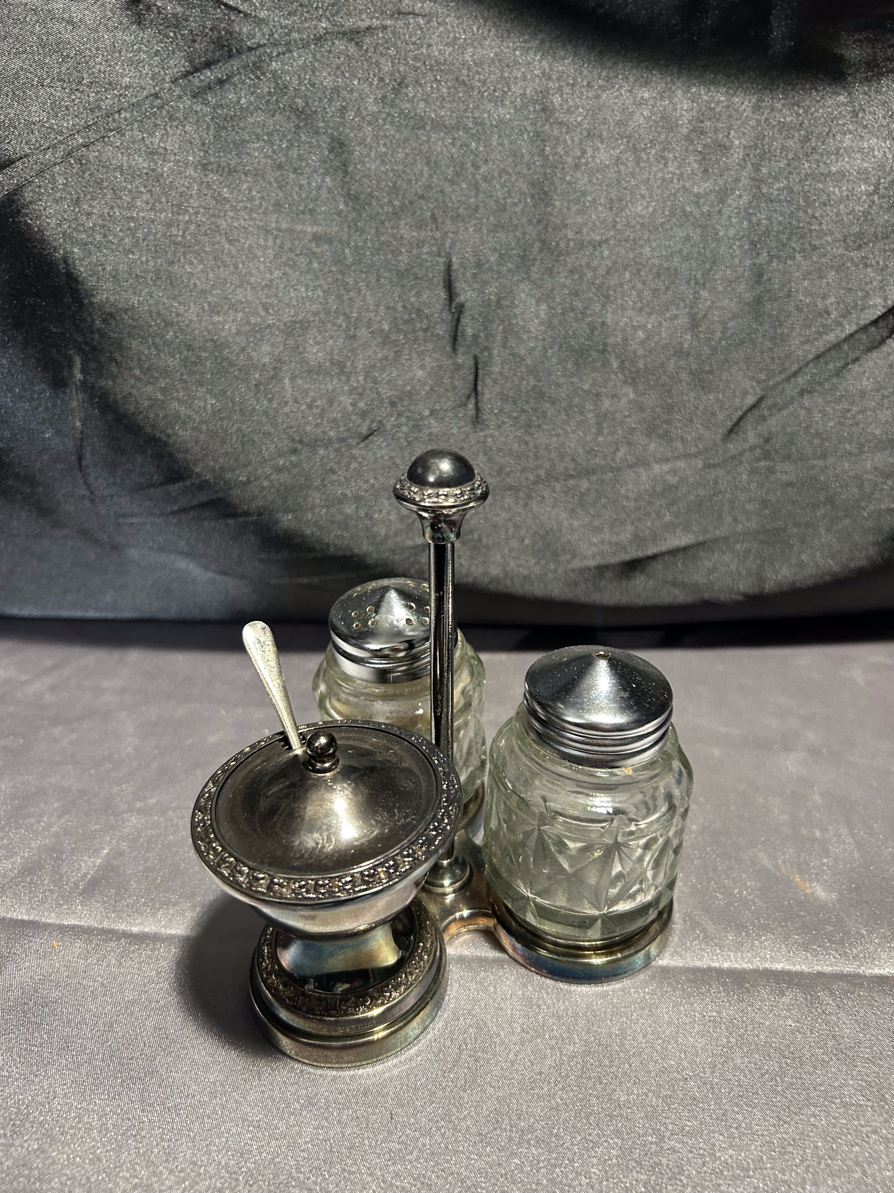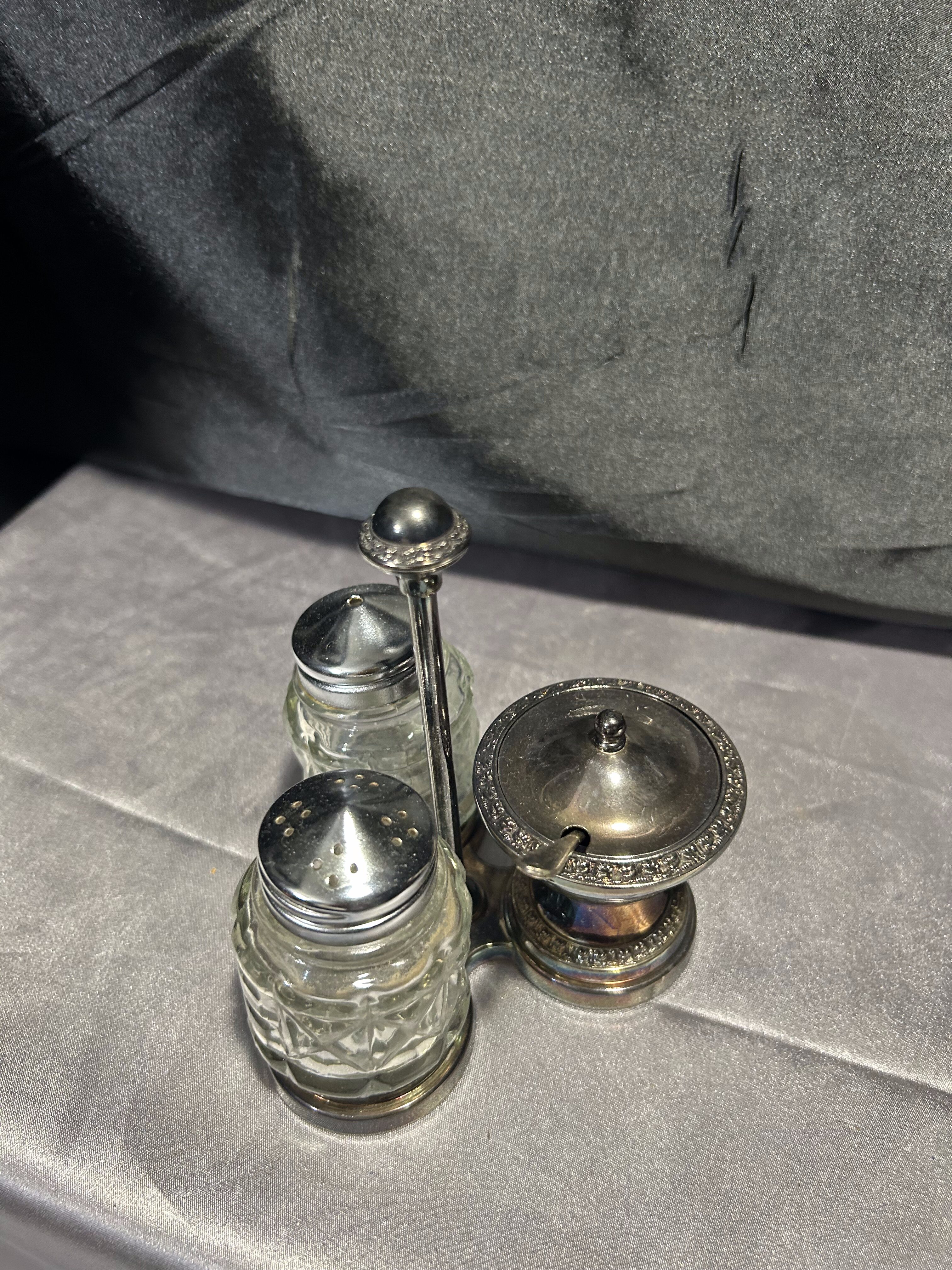 Stylowy, potrójny przyprawnik na stojaku – komplet składający się z solniczki, pieprzniczki oraz cukiernicy (lub pojemniczka na musztardę) z pokrywką i łyżeczką. Całość oparta na dekoracyjnym metalowym stojaku o delikatnym zdobieniu. Szkło szlifowane w geometryczny wzór, a metalowe elementy z piękną patyną czasu. Praktyczny i elegancki dodatek do kuchni lub jadalni w stylu retro czy klasycznym.