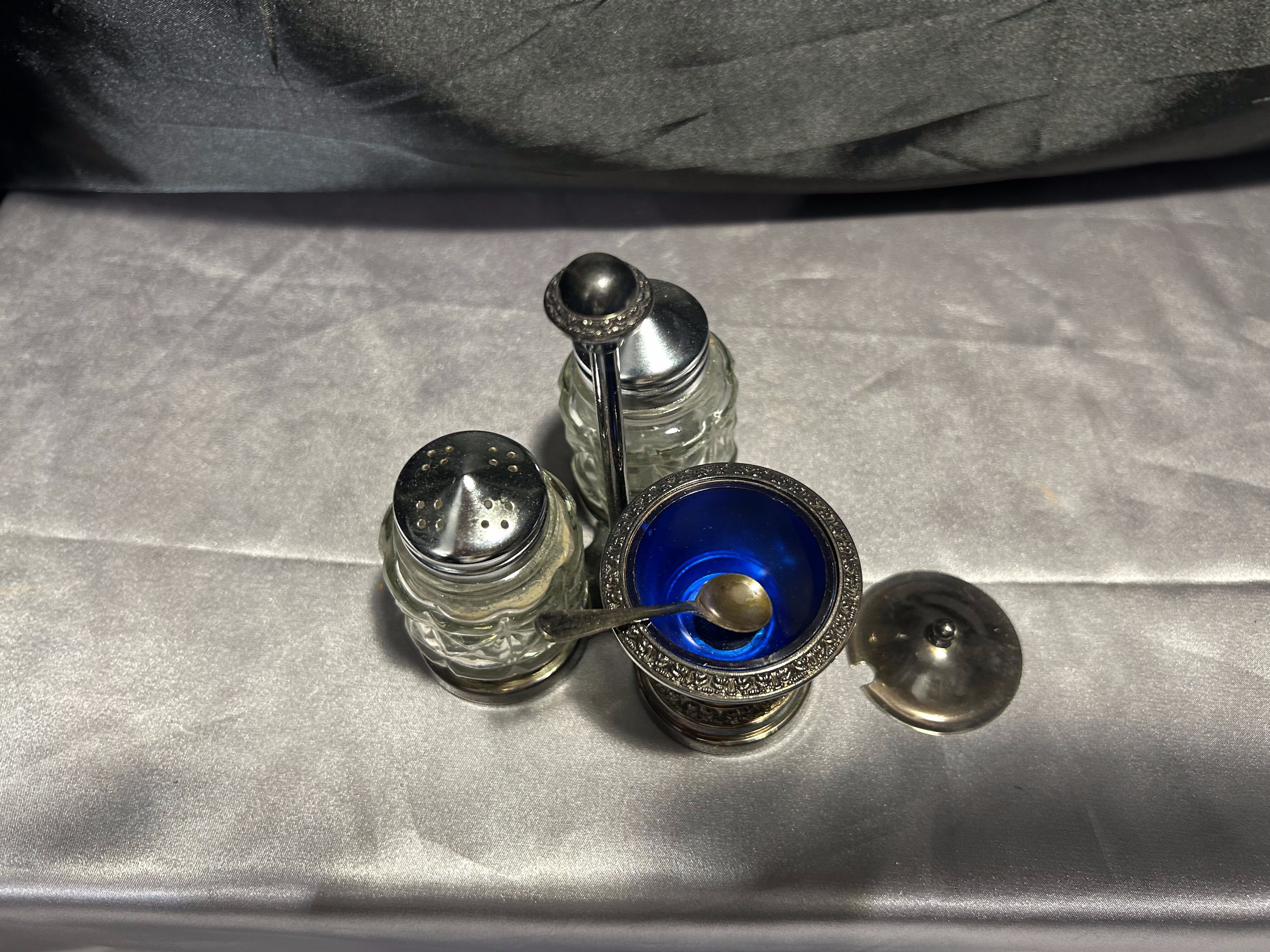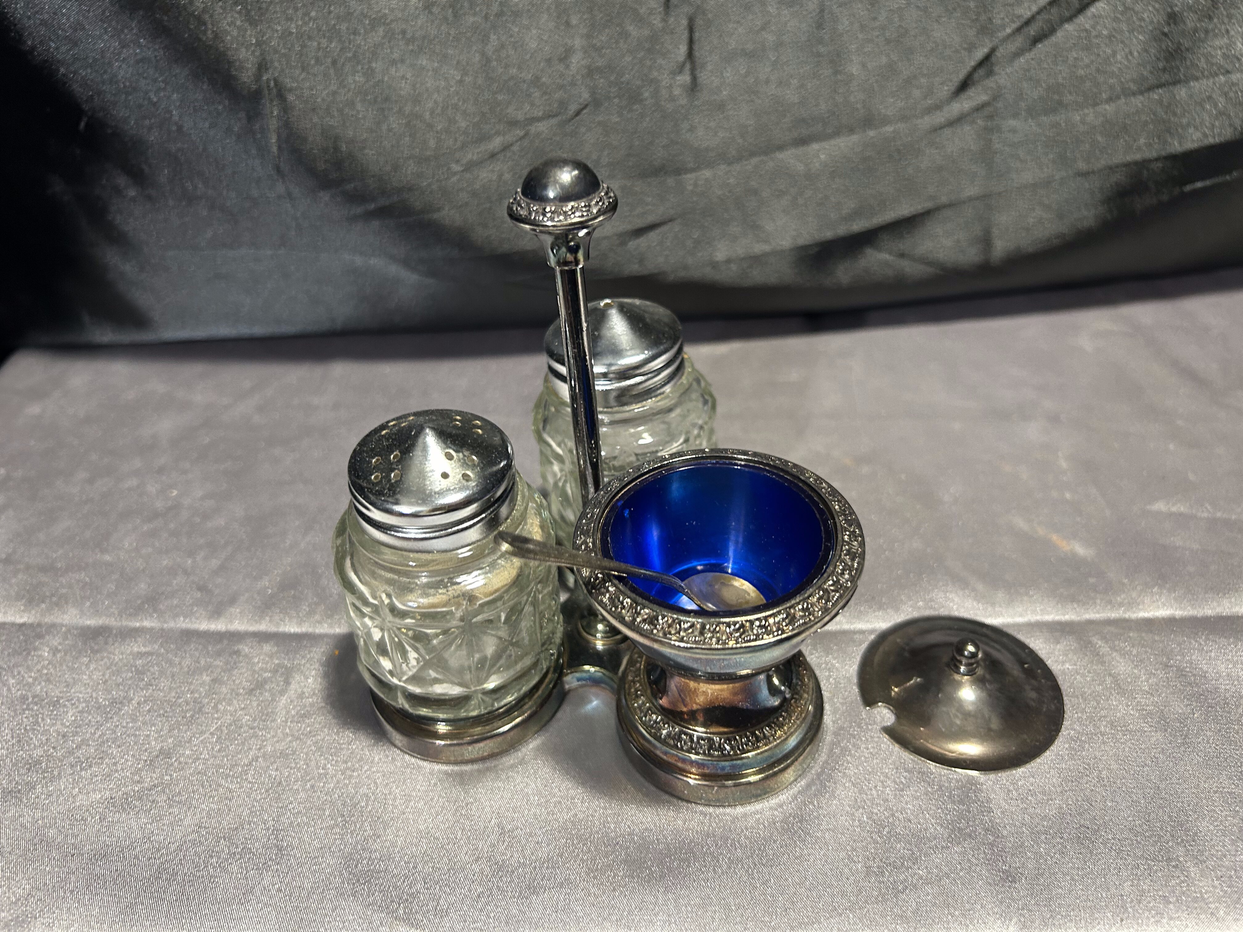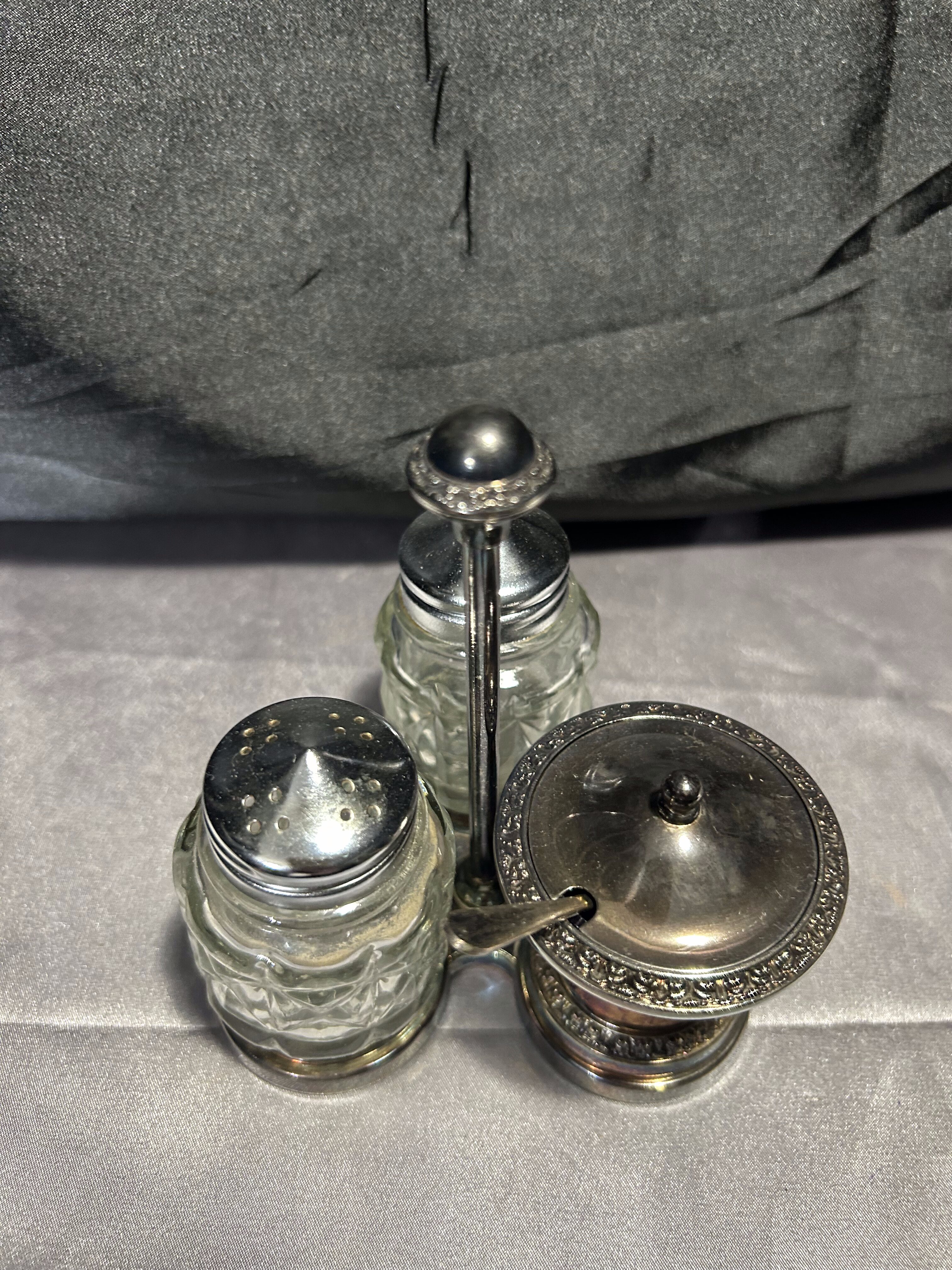 Potrójny przyprawnik na stojaku – Solniczka, pieprzniczka i cukiernica – Styl vintage
