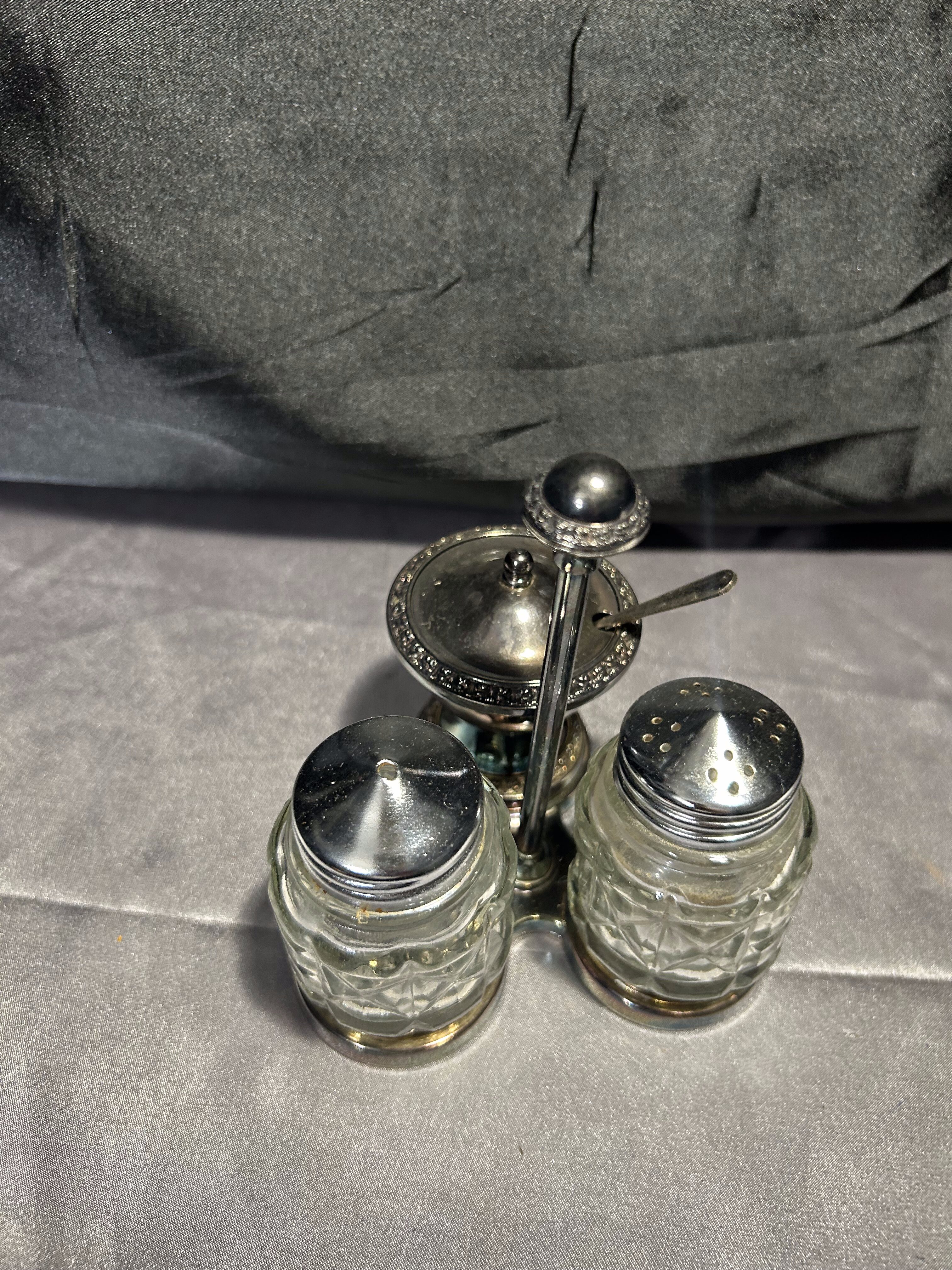 - Potrójny przyprawnik na stojaku – Solniczka, pieprzniczka i cukiernica – Styl vintage