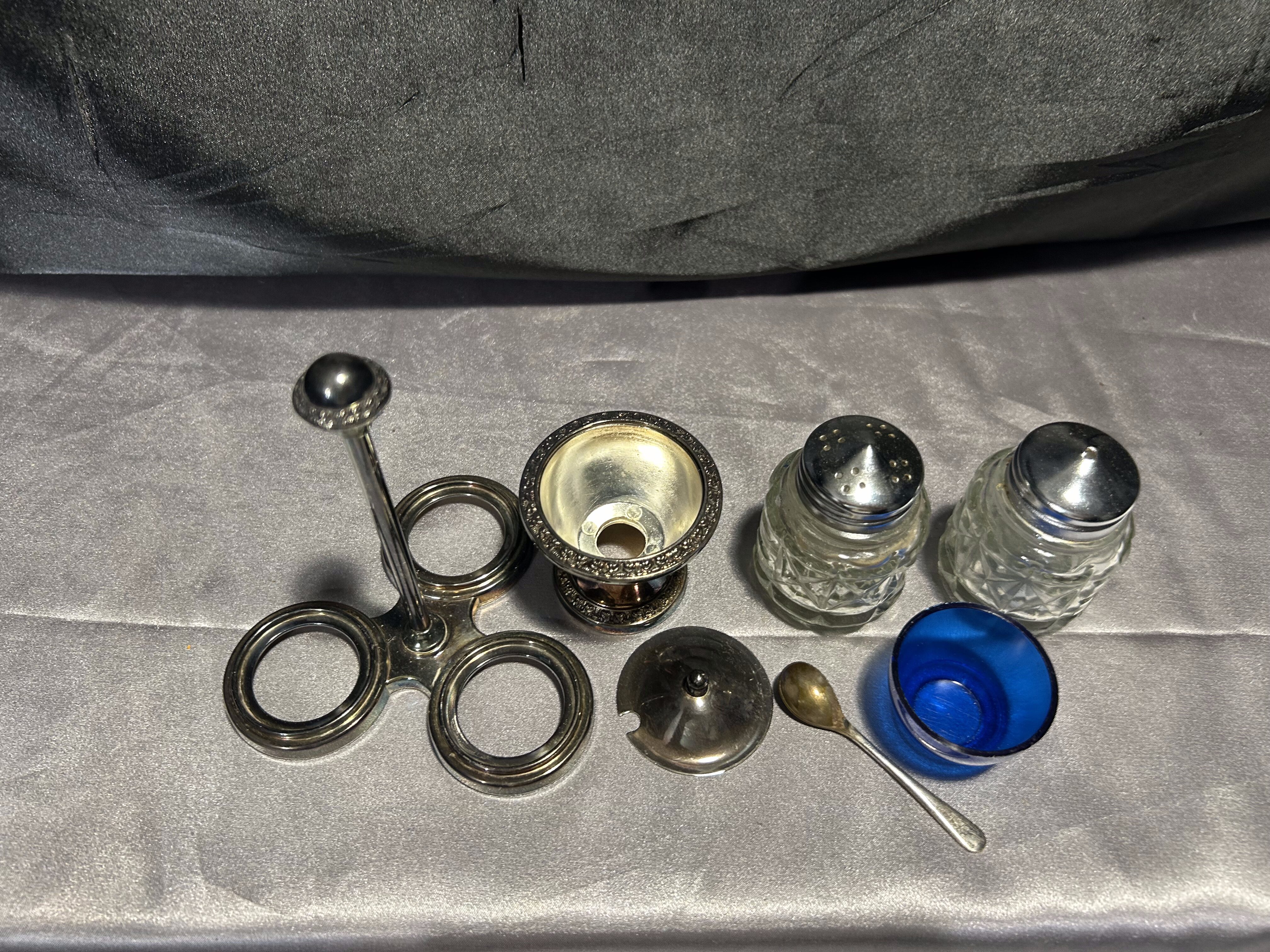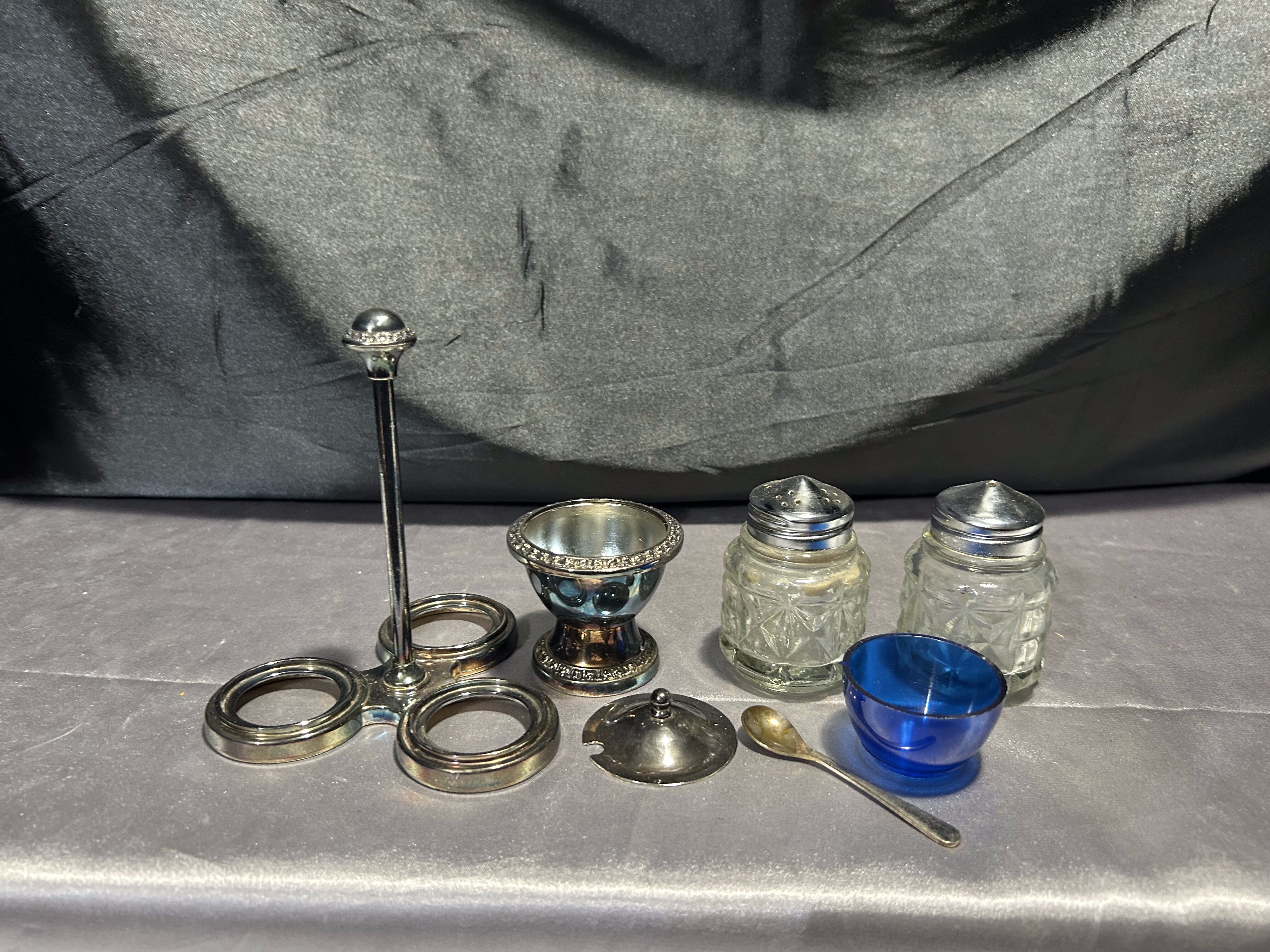 Elementy: solniczka, pieprzniczka, cukiernica/musztardniczka z łyżeczką i pokrywką