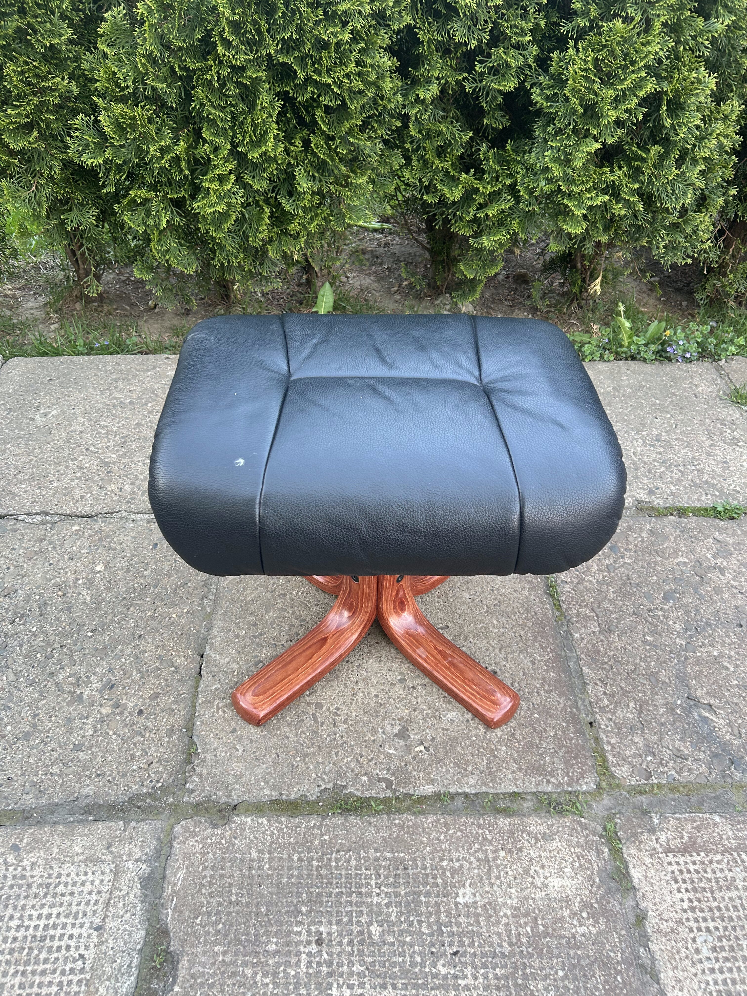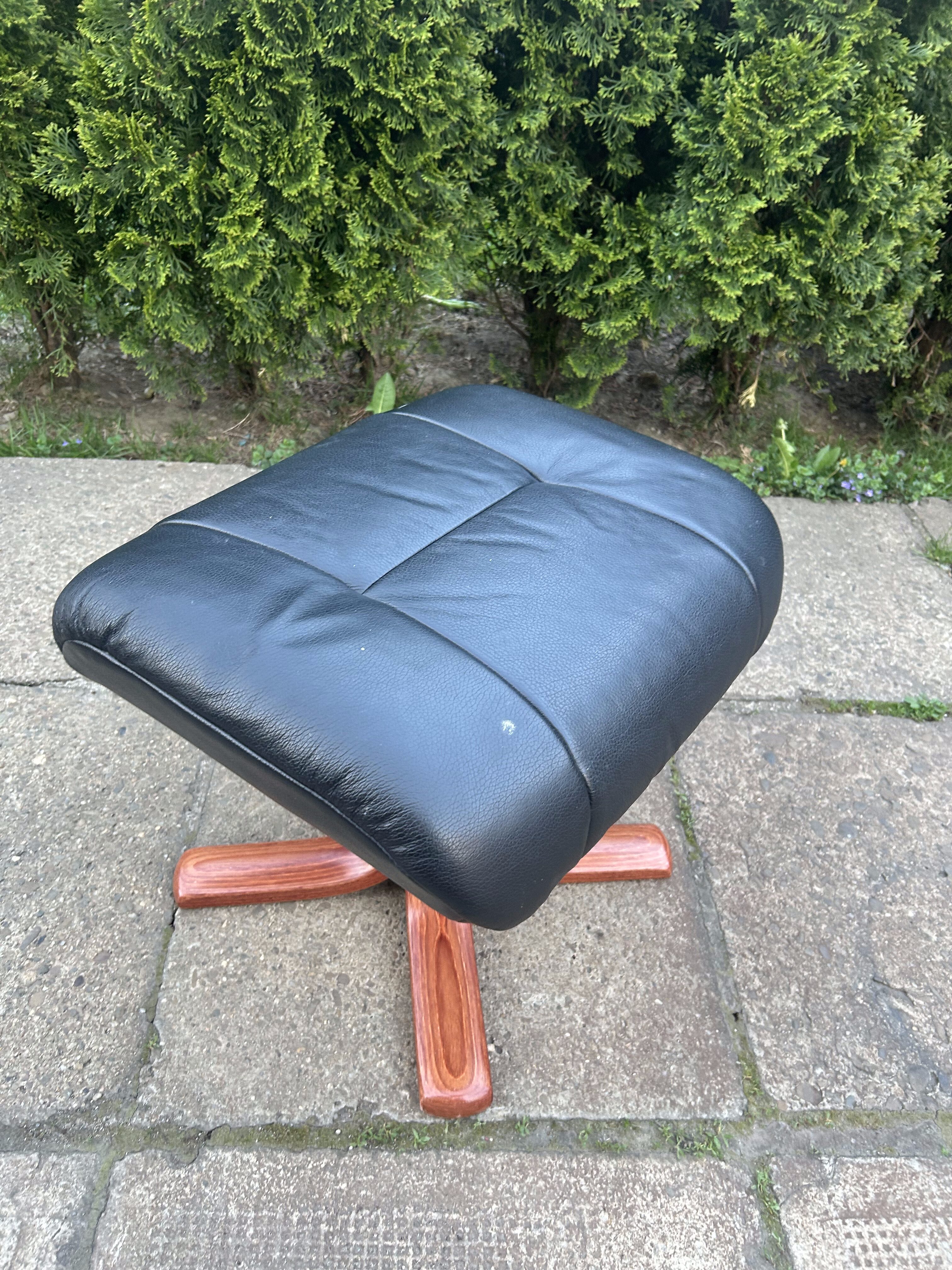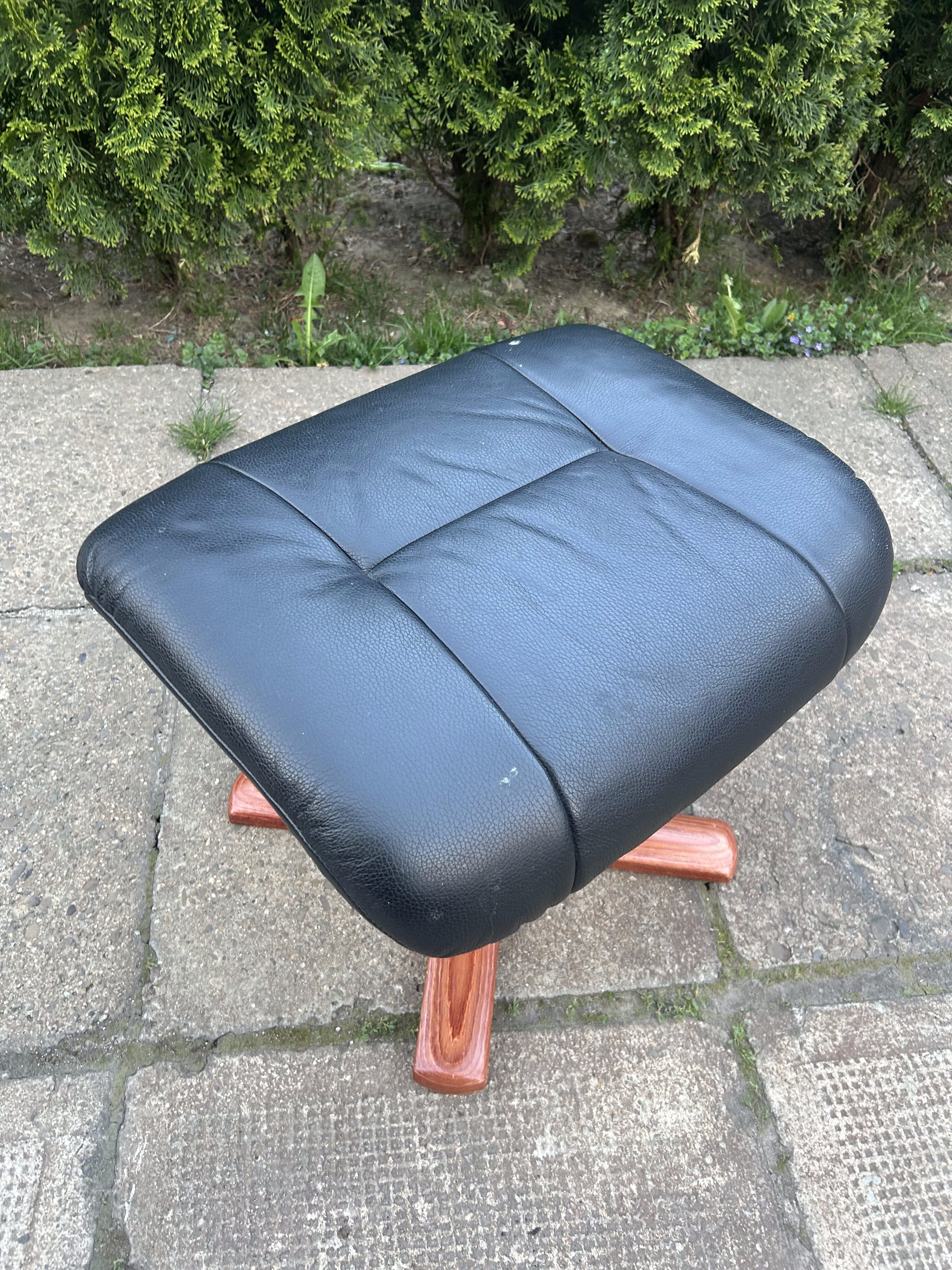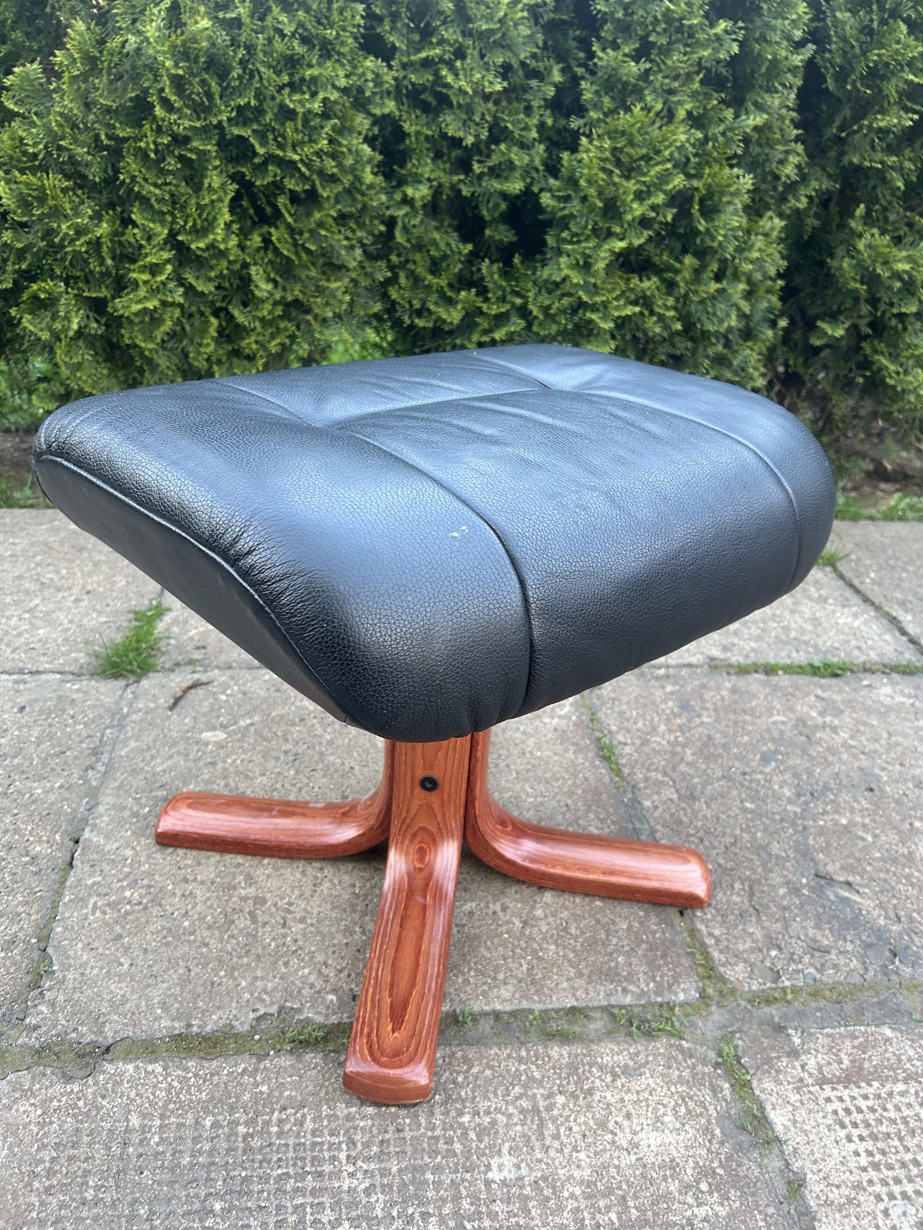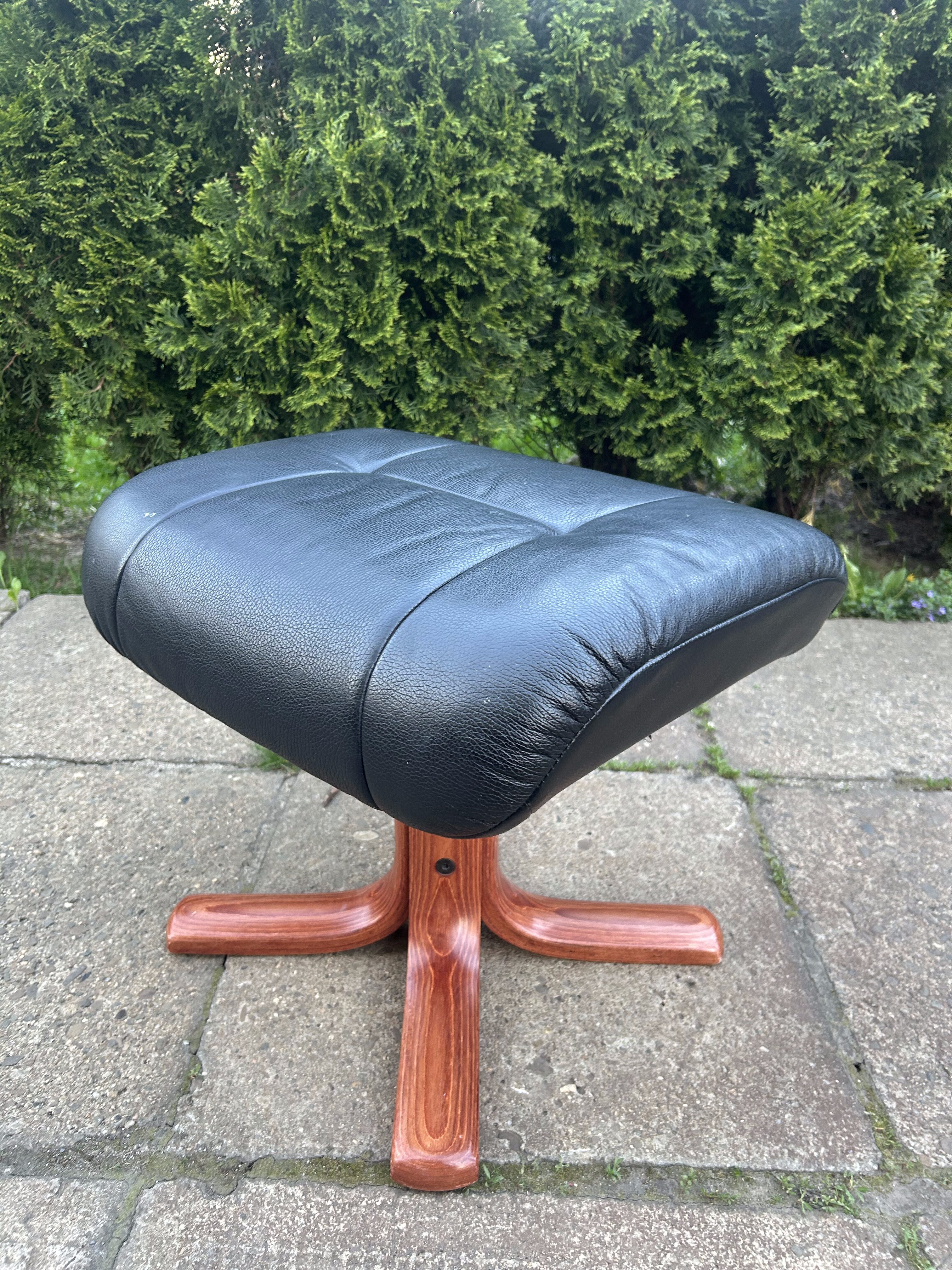 Wygodna i solidna pufa pełniąca również funkcję podnóżka, wykonana z czarnej skóry oraz osadzona na efektownej, drewnianej podstawie w kształcie litery X. Elegancki wygląd i praktyczne wymiary sprawiają, że świetnie sprawdzi się zarówno w salonie, gabinecie, jak i sypialni. Idealny dodatek do fotela relaksacyjnego.