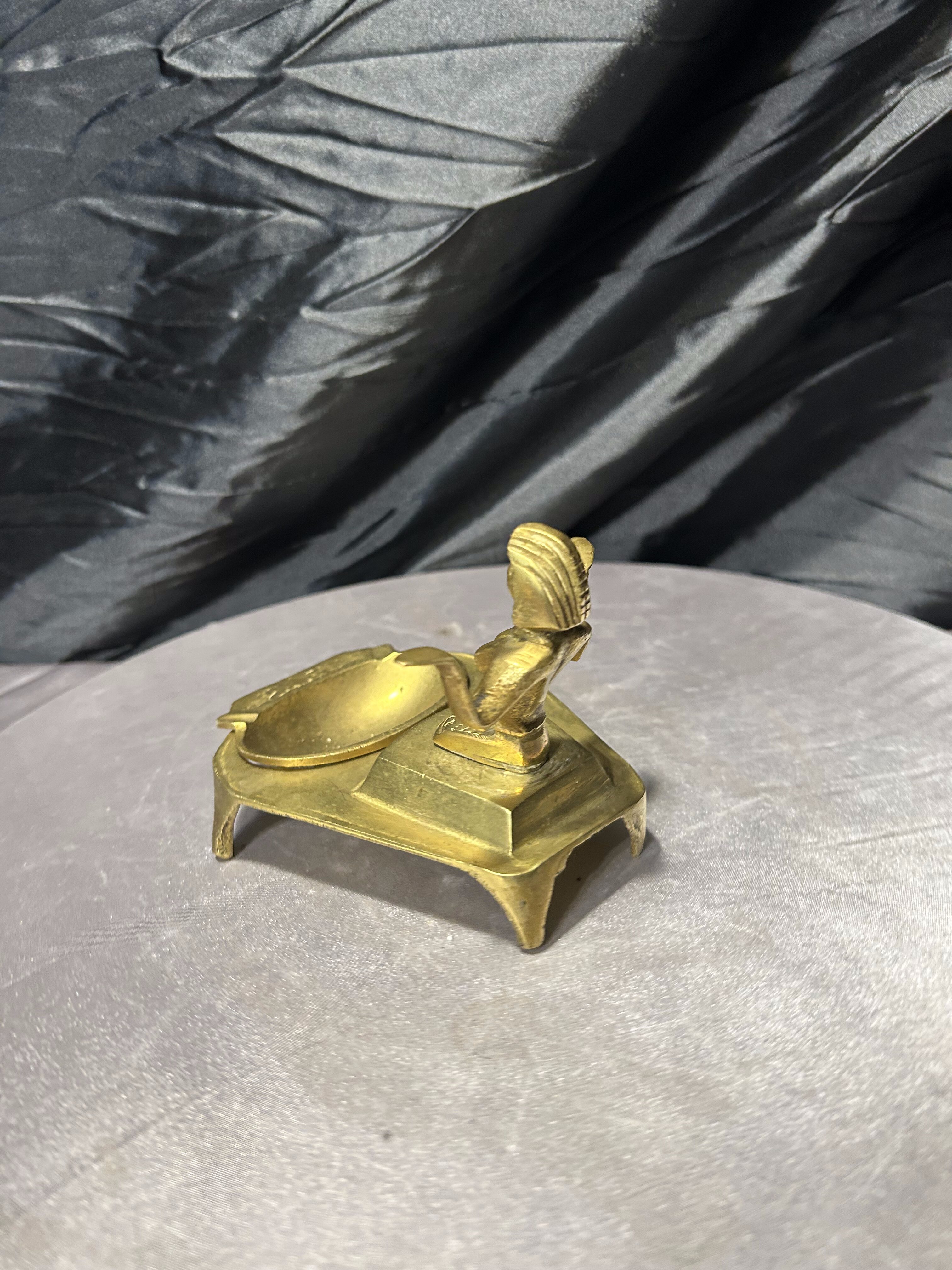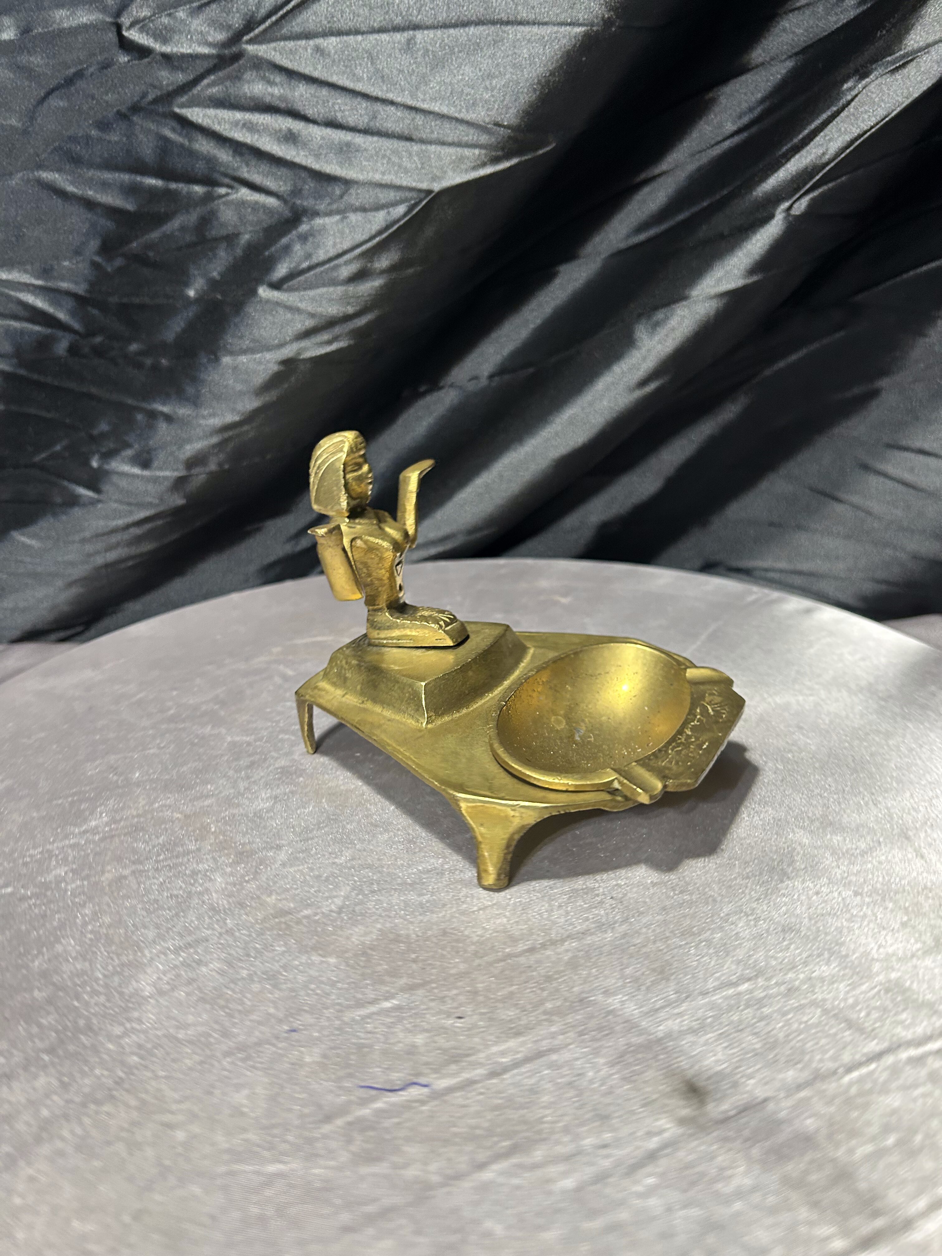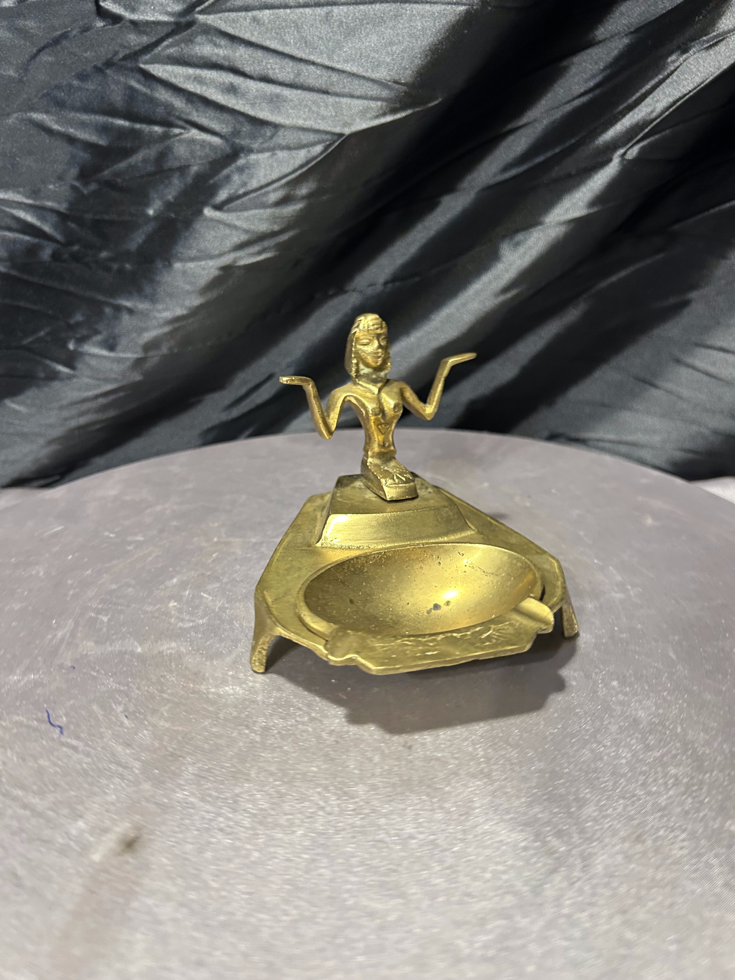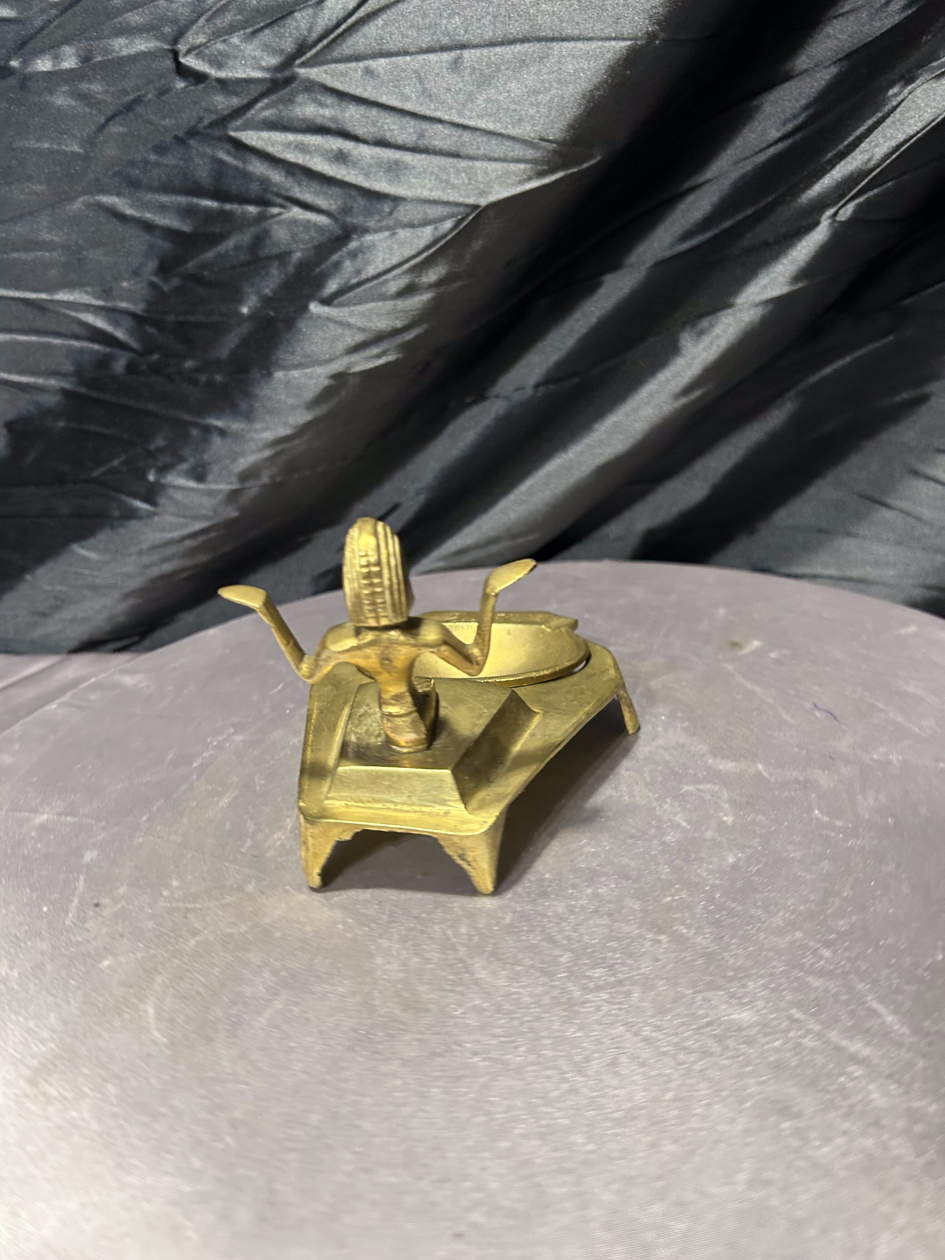 Dekoracyjne puzderko wykonane z mosiądzu, zdobione figurką w stylu starożytnego Egiptu. Przedstawia postać faraona lub wysokiego egipskiego dostojnika w charakterystycznym stroju i nakryciu głowy. Puzderko osadzone jest na stabilnej, czteronożnej podstawie, z wyraźnie wyodrębnioną misą.
