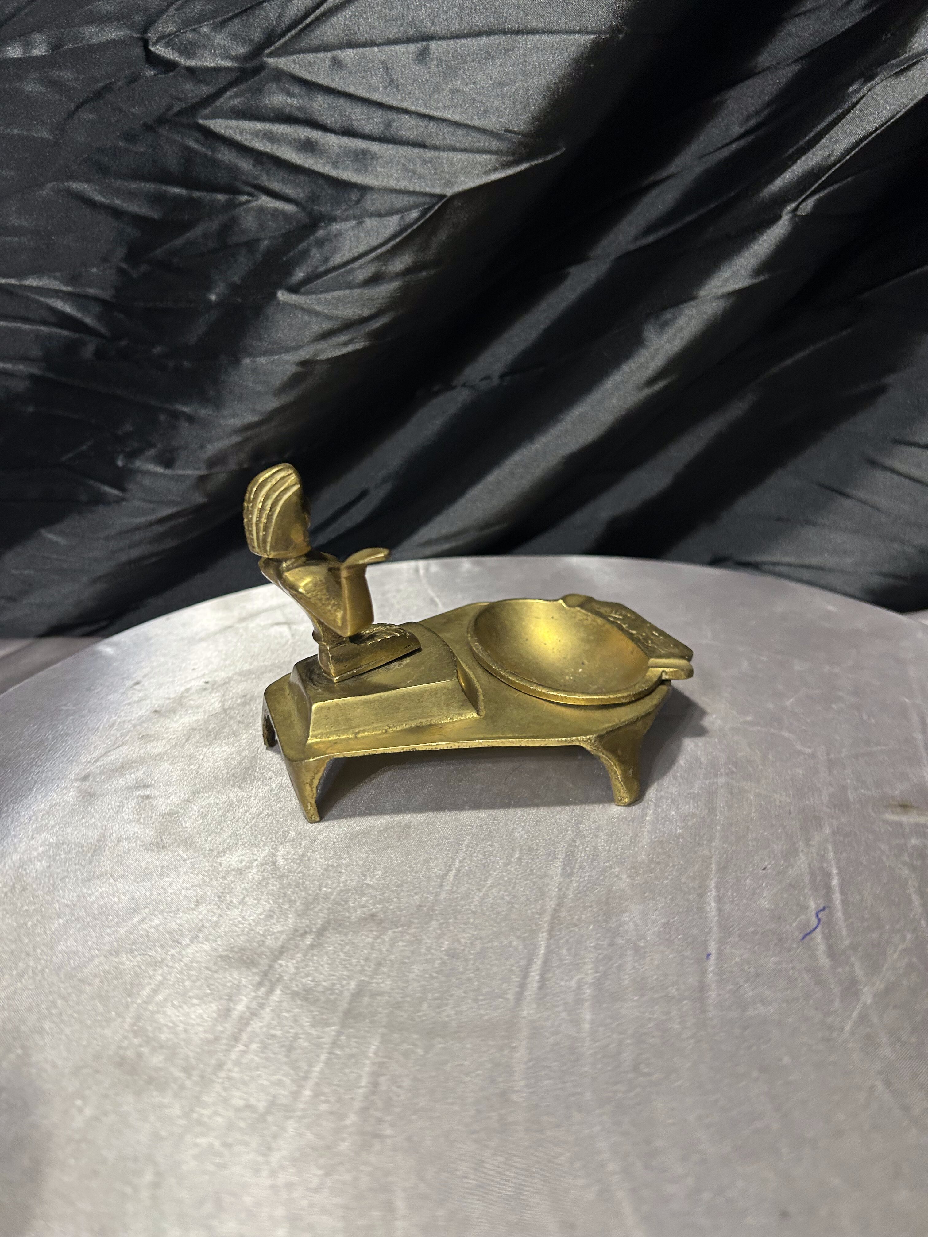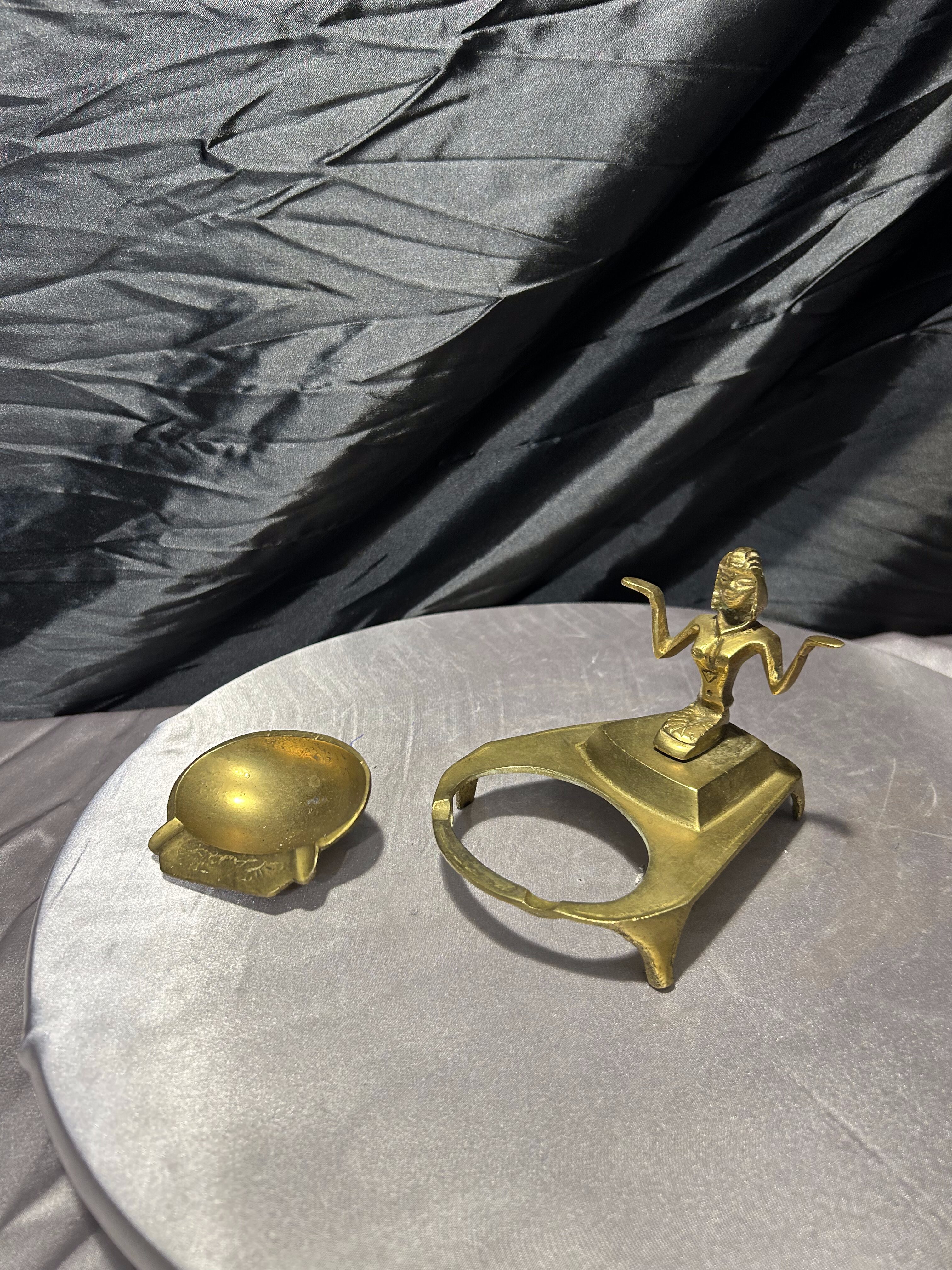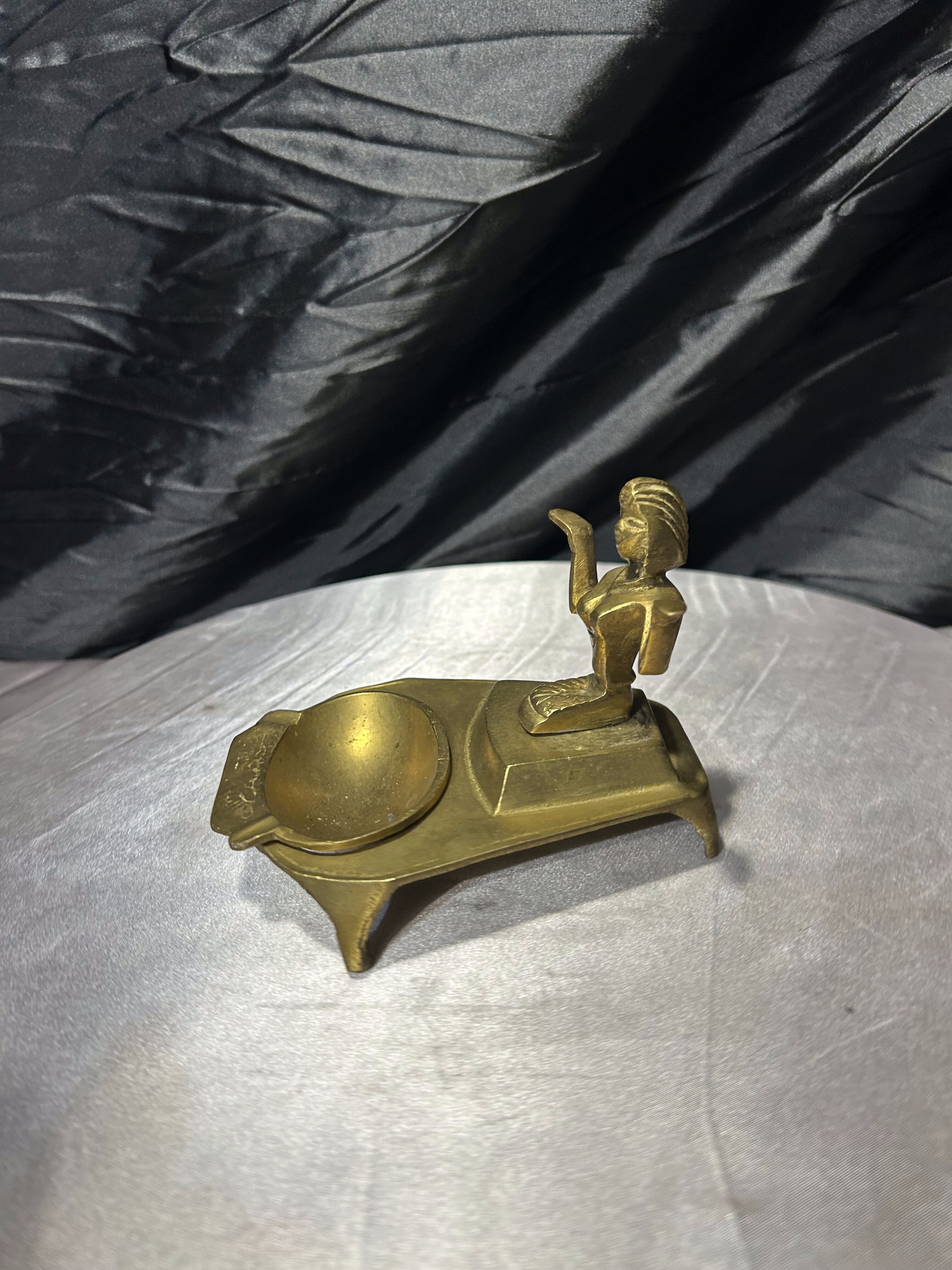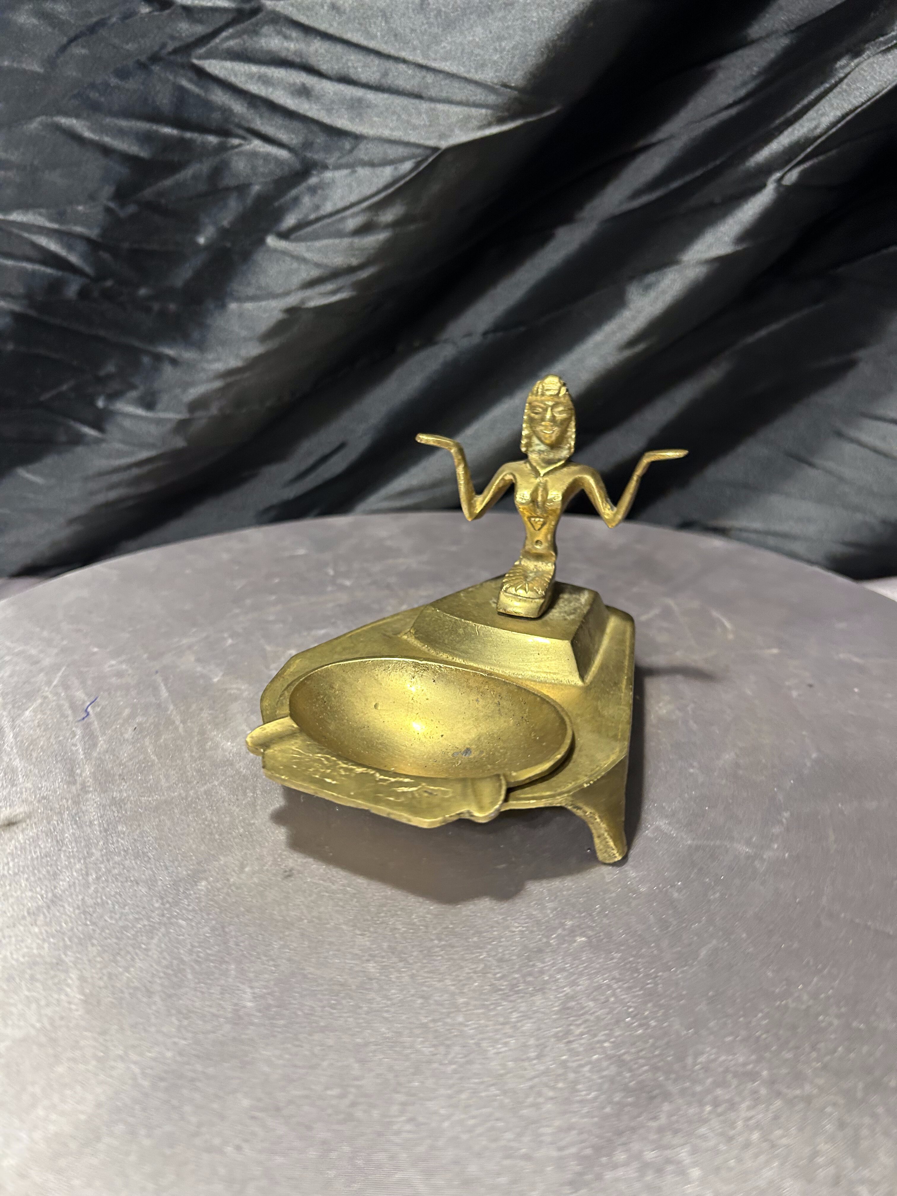 Dekoracyjne puzderko wykonane z mosiądzu, zdobione figurką w stylu starożytnego Egiptu. Przedstawia postać faraona lub wysokiego egipskiego dostojnika w charakterystycznym stroju i nakryciu głowy. Puzderko osadzone jest na stabilnej, czteronożnej podstawie, z wyraźnie wyodrębnioną misą.