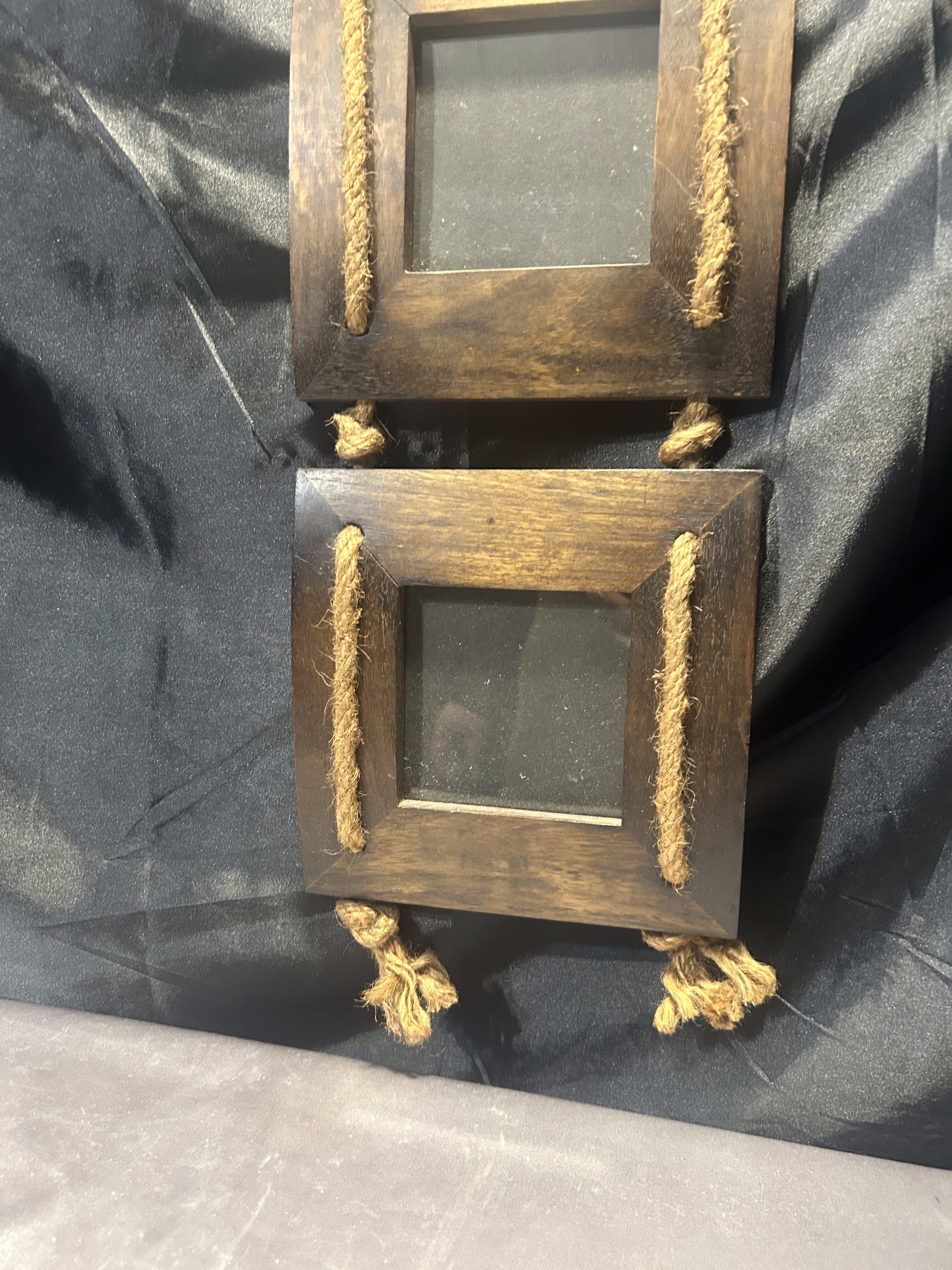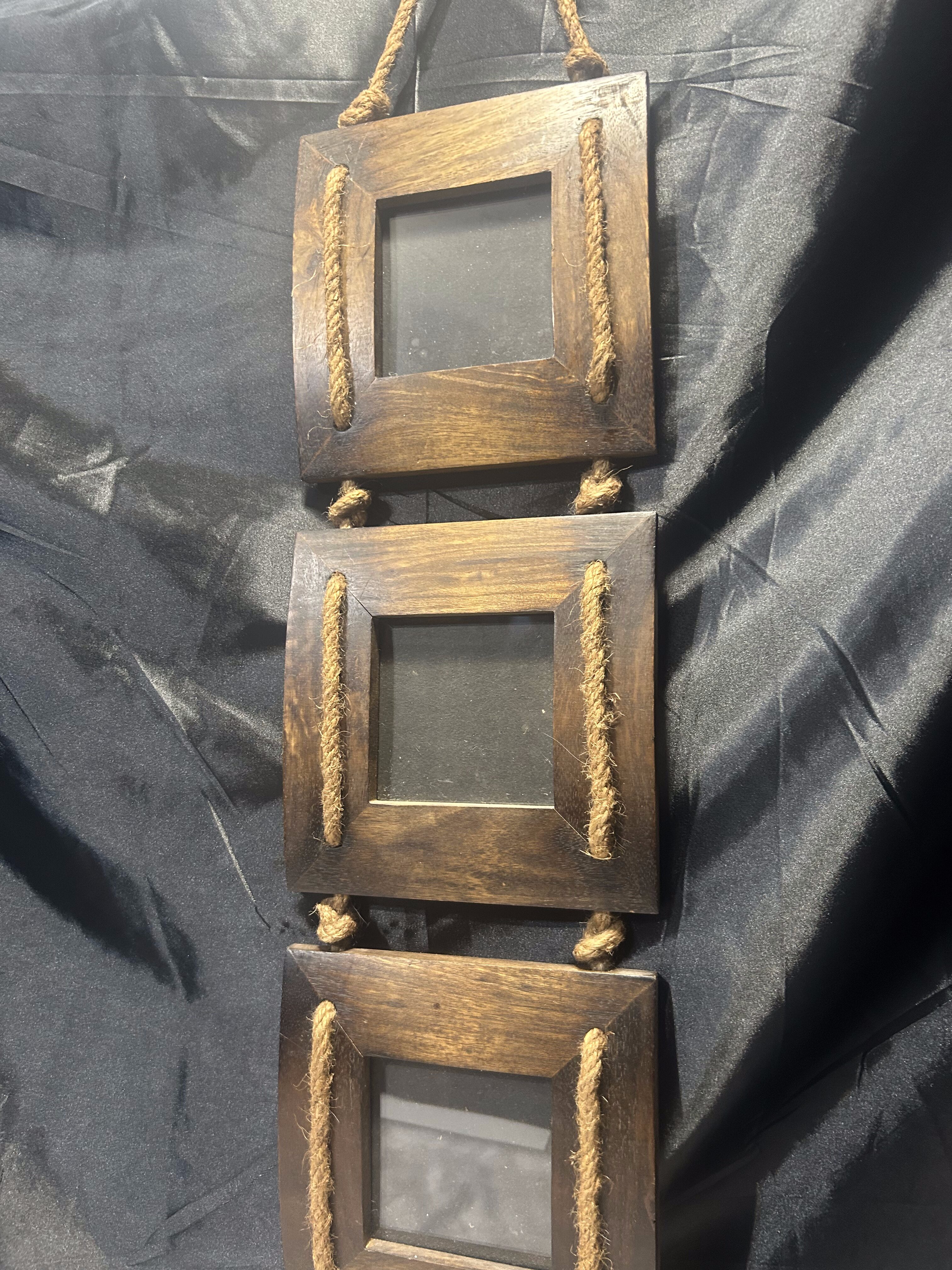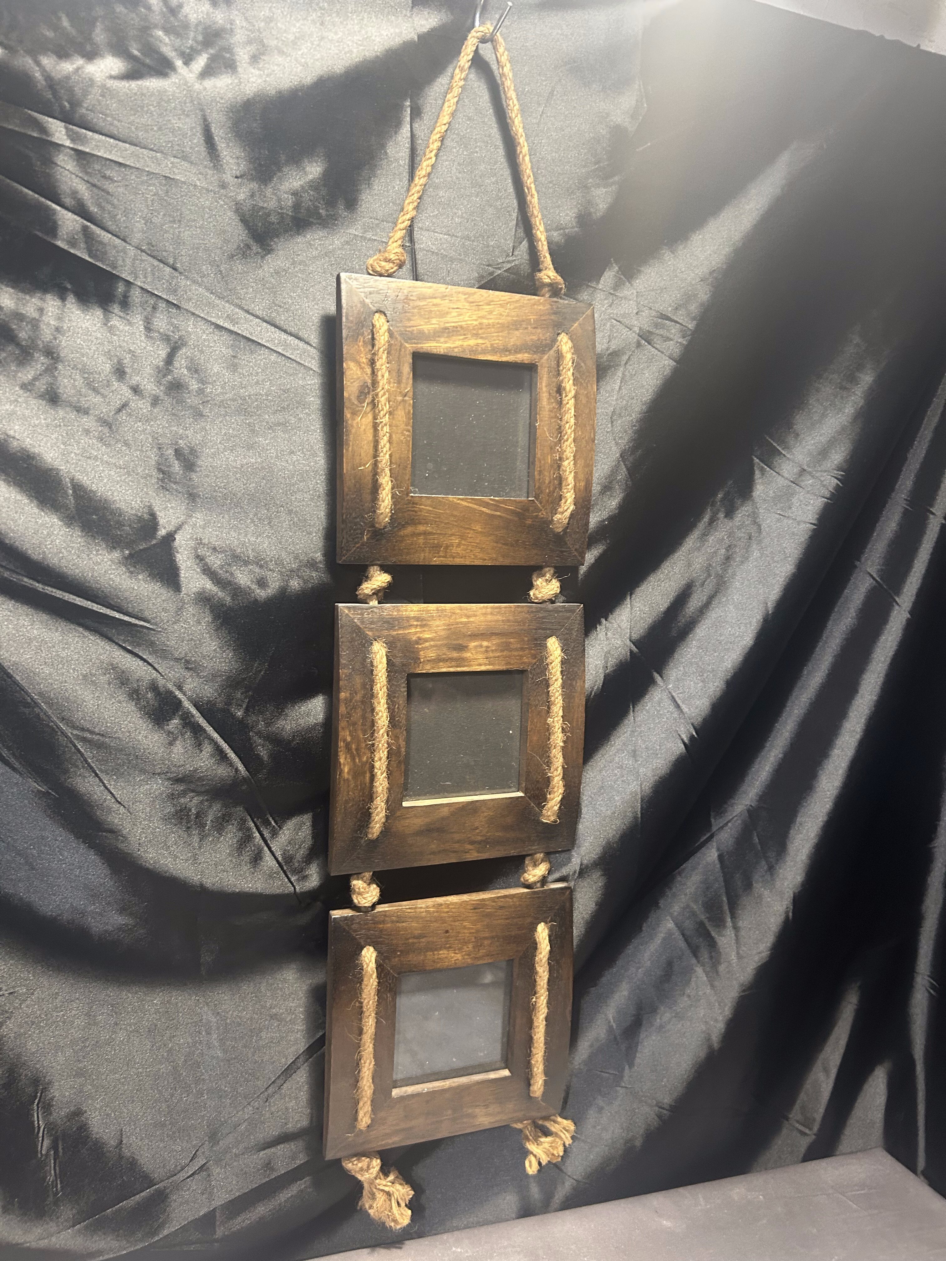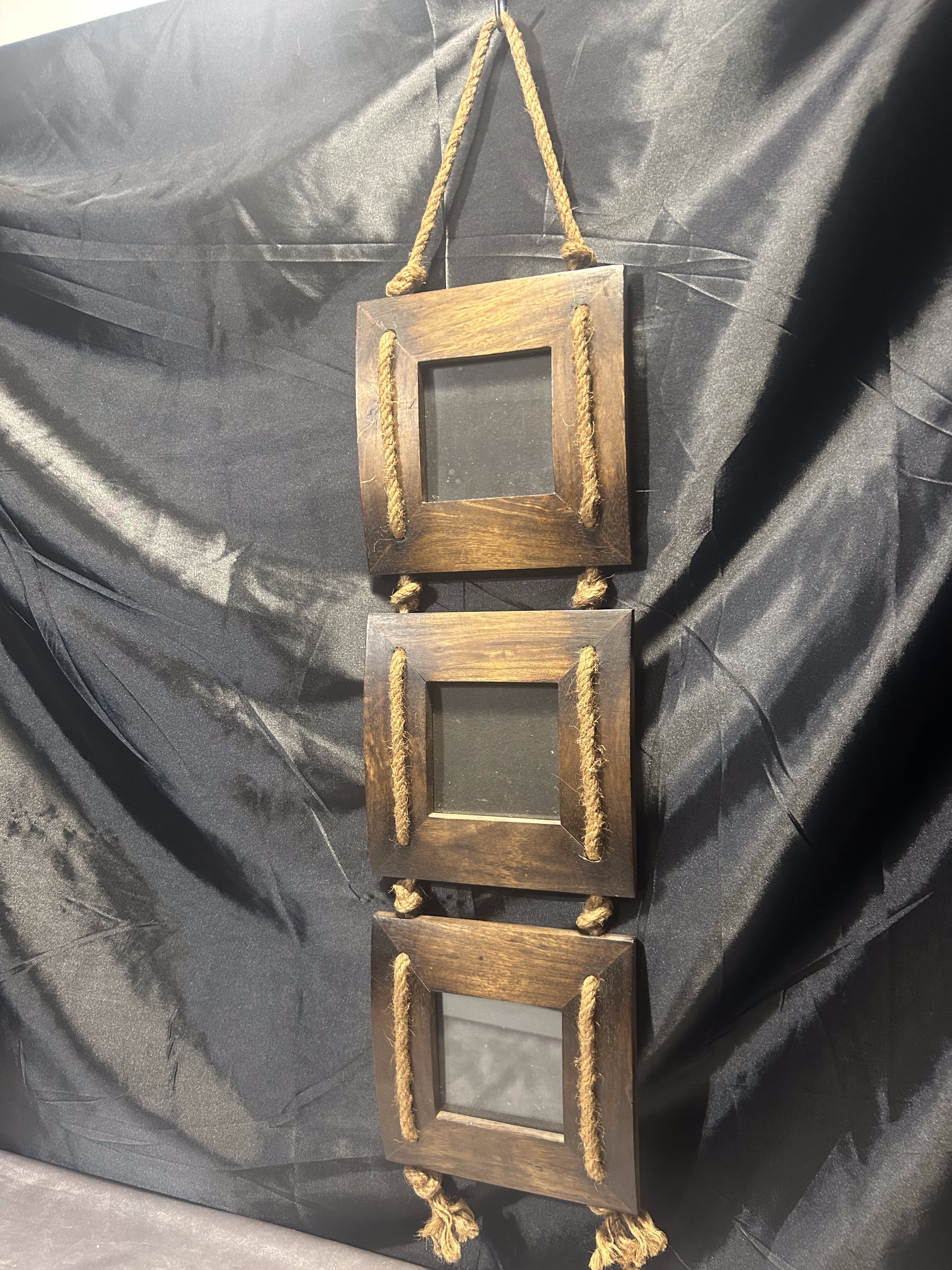 Na sprzedaż drewniana ramka na zdjęcia, składająca się z trzech kwadratowych ramek zawieszonych jedna pod drugą. Oprawiona w eleganckie drewno polisander, łączona dekoracyjnym sznurem, gotowa do zawieszenia na ścianie. Ramka wyróżnia się naturalnym, ciepłym wyglądem i klasycznym stylem, który doskonale wpisze się w aranżacje wnętrz rustykalnych, skandynawskich, retro czy klasycznych.
