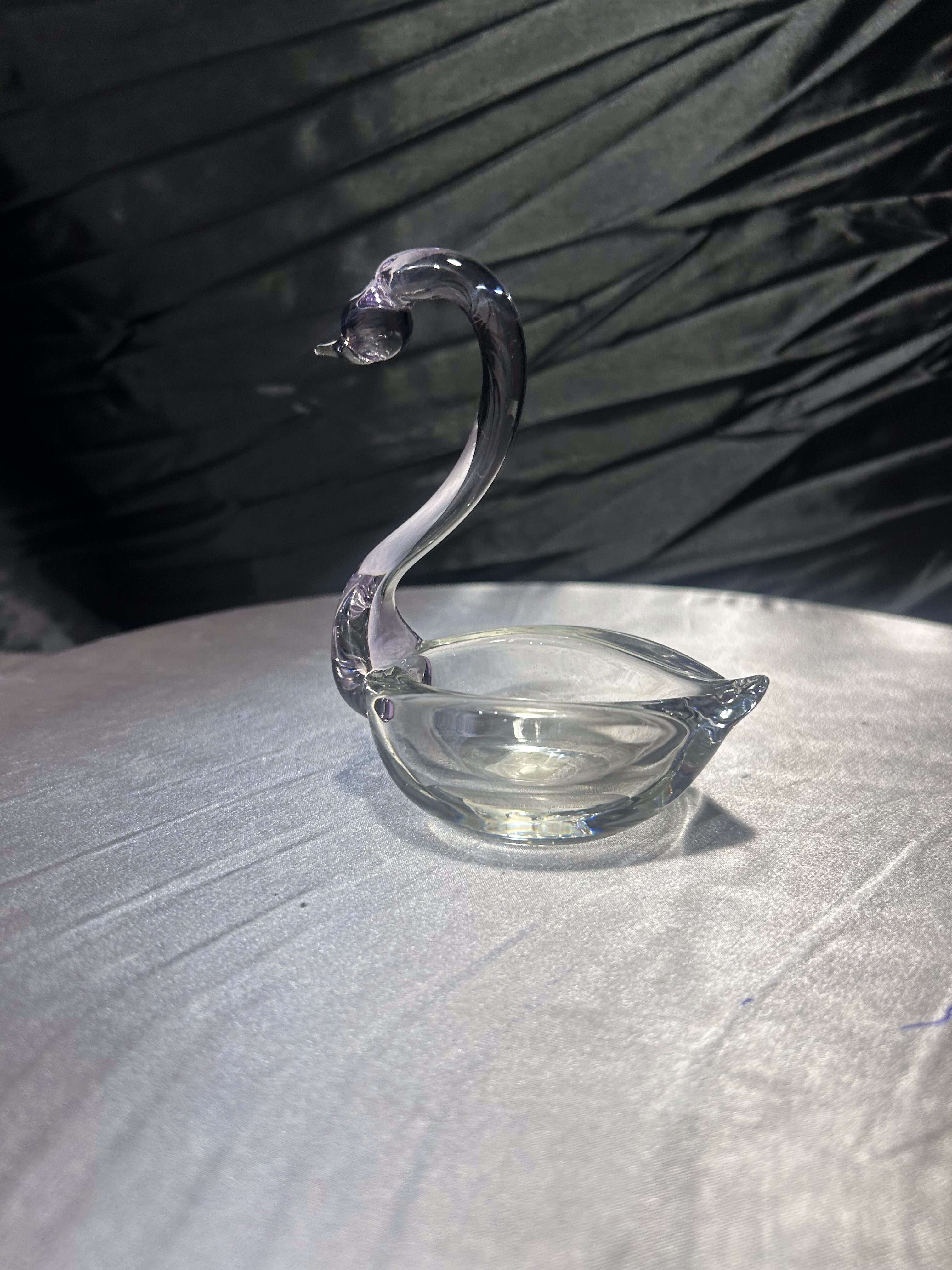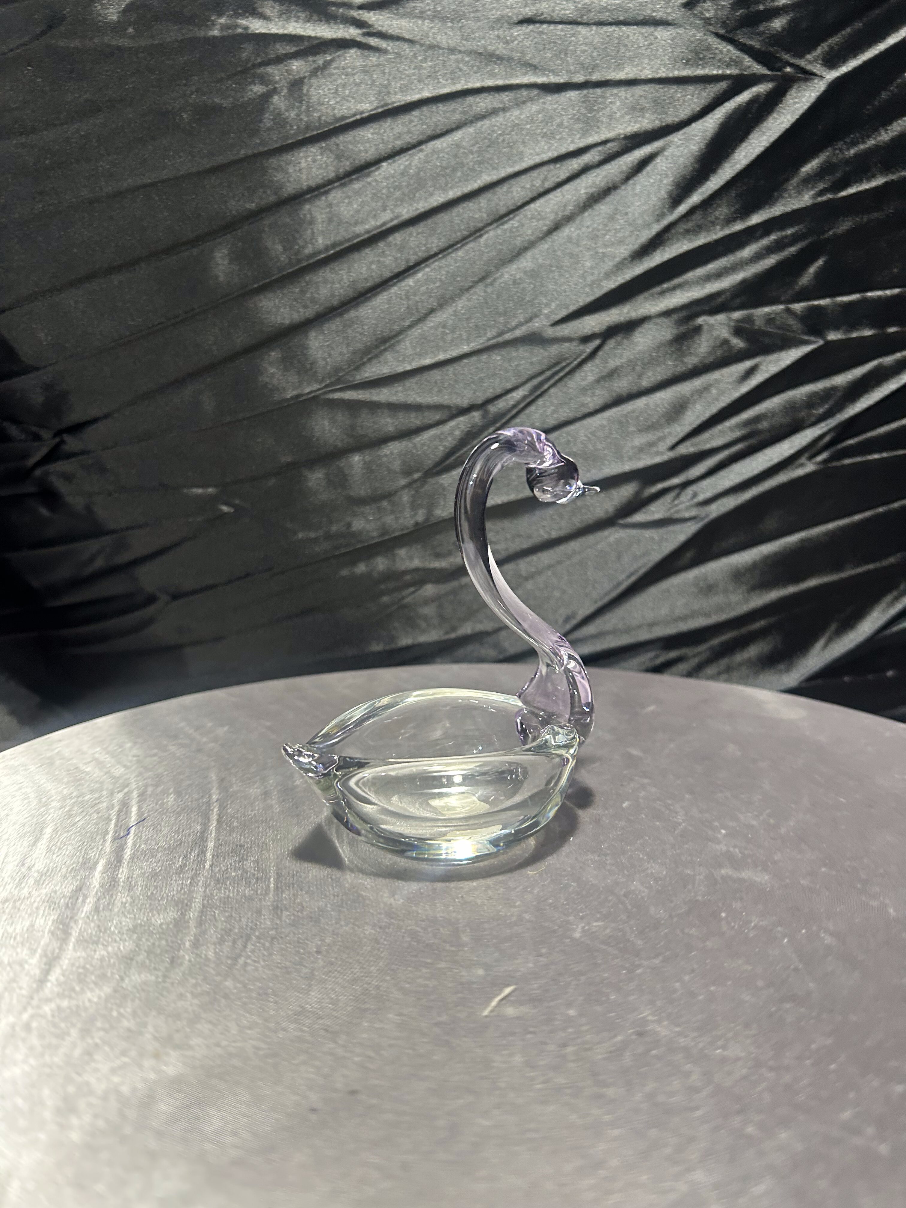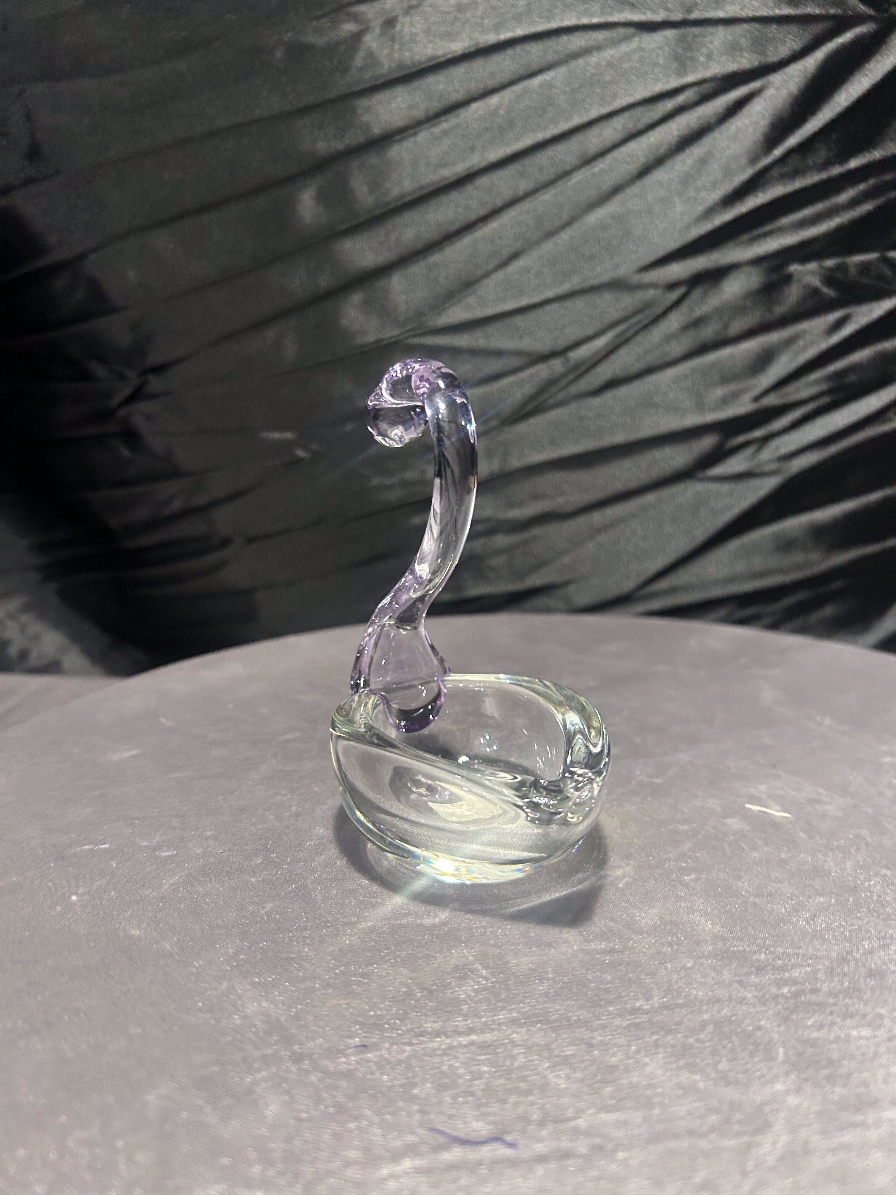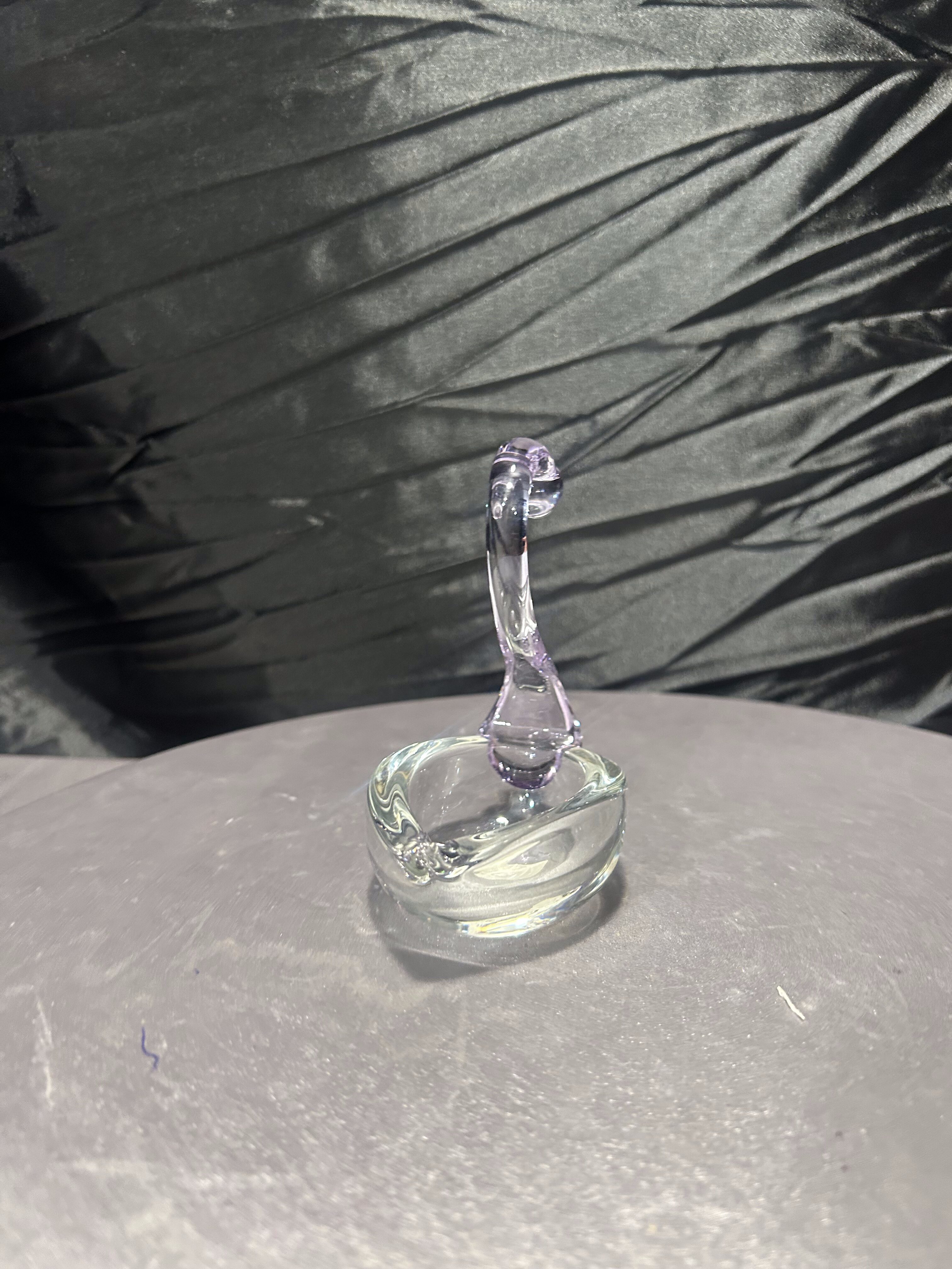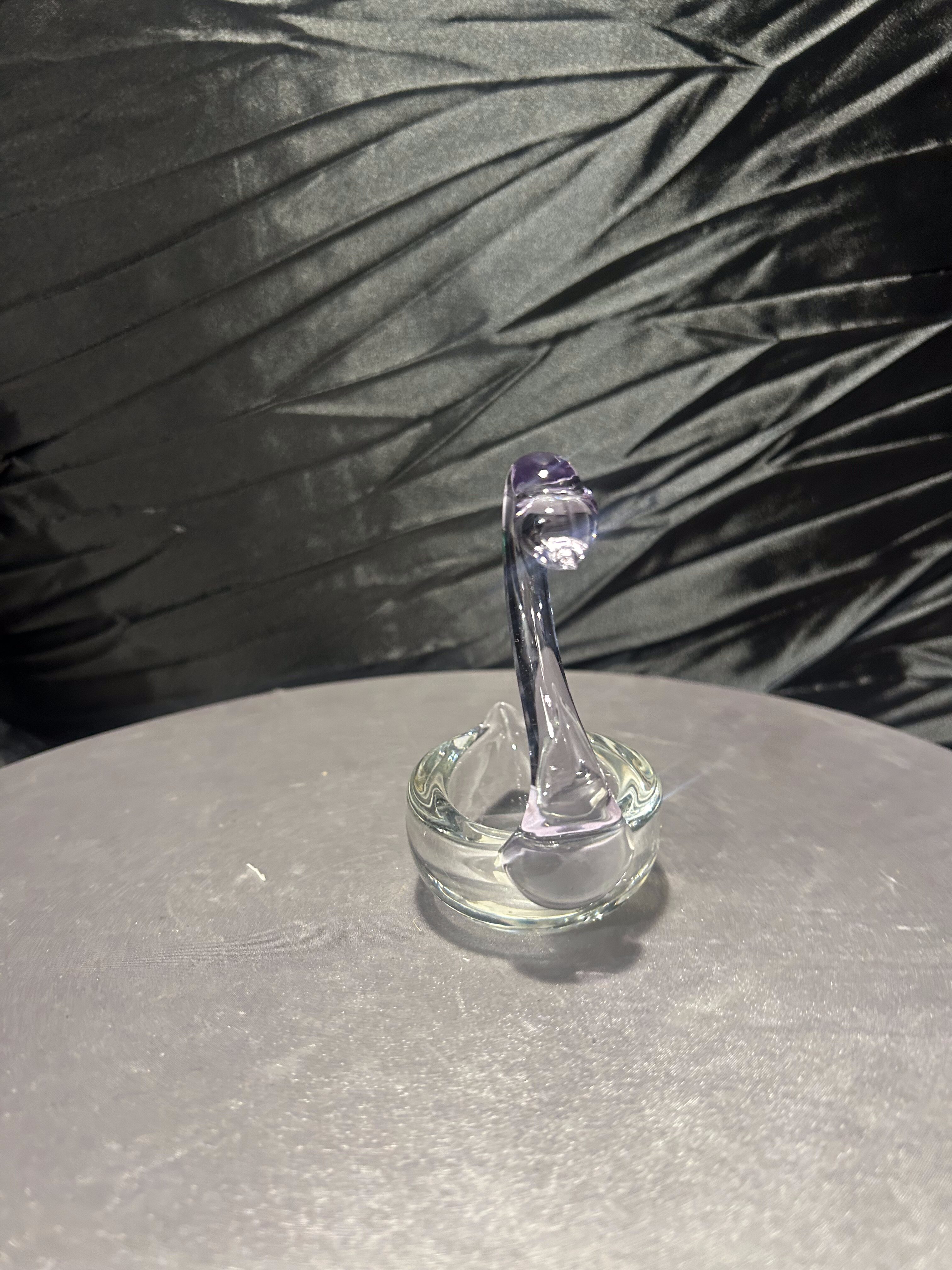 Elegancka dekoracja – szklana figurka łabędzia wykonana przez norweską markę Lillehammer Kunstglass, ze znakiem „HANDMADE LILLEHAMMER KUNST GLASS HYTTA” na spodzie. Figurka ma wysokość 11,5 cm, szerokość ok. 10 × 6 cm. Szyja i głowa wykonane w subtelnym fiolecie — piękny akcent kolorystyczny w czystym szkle.