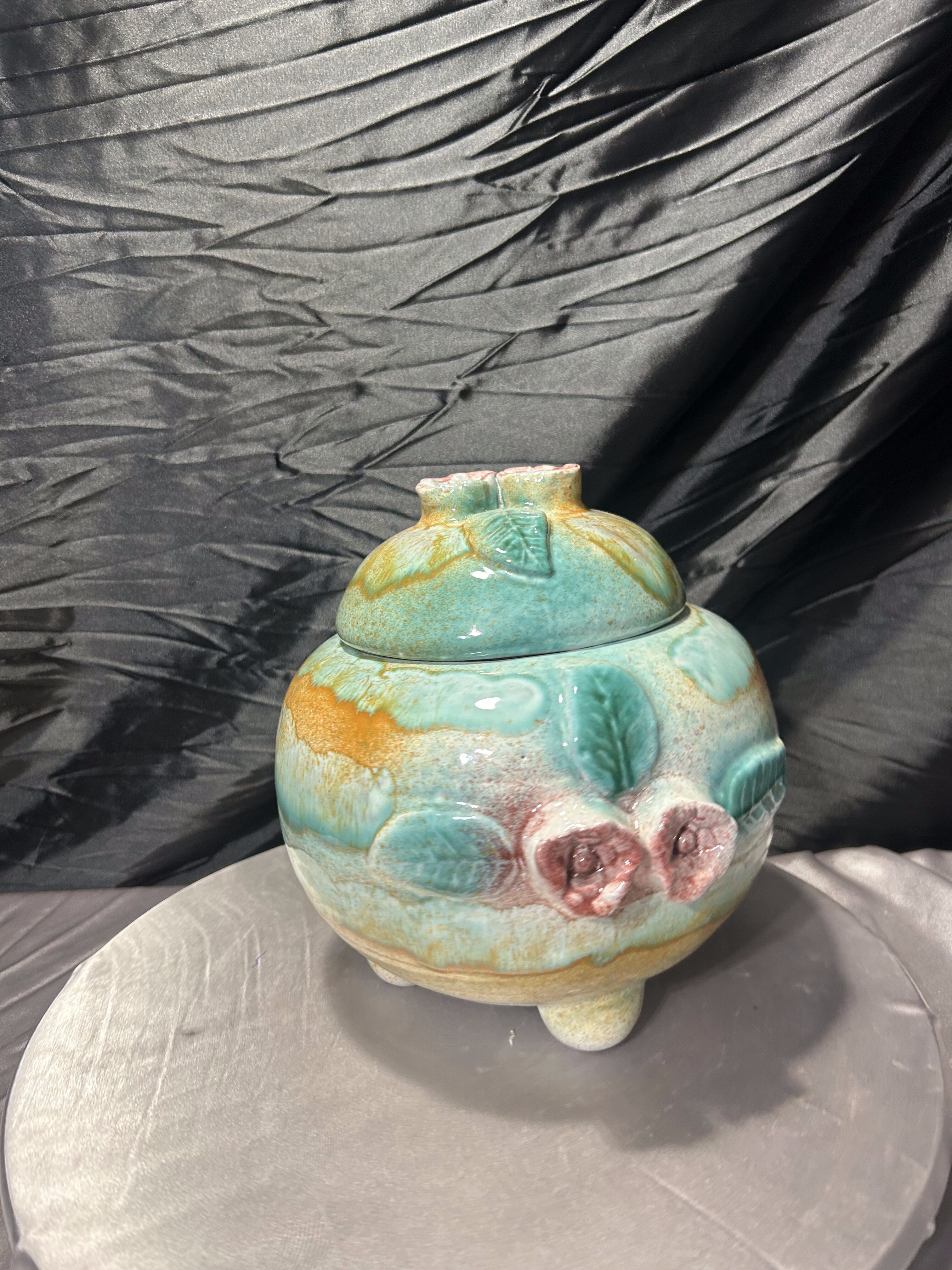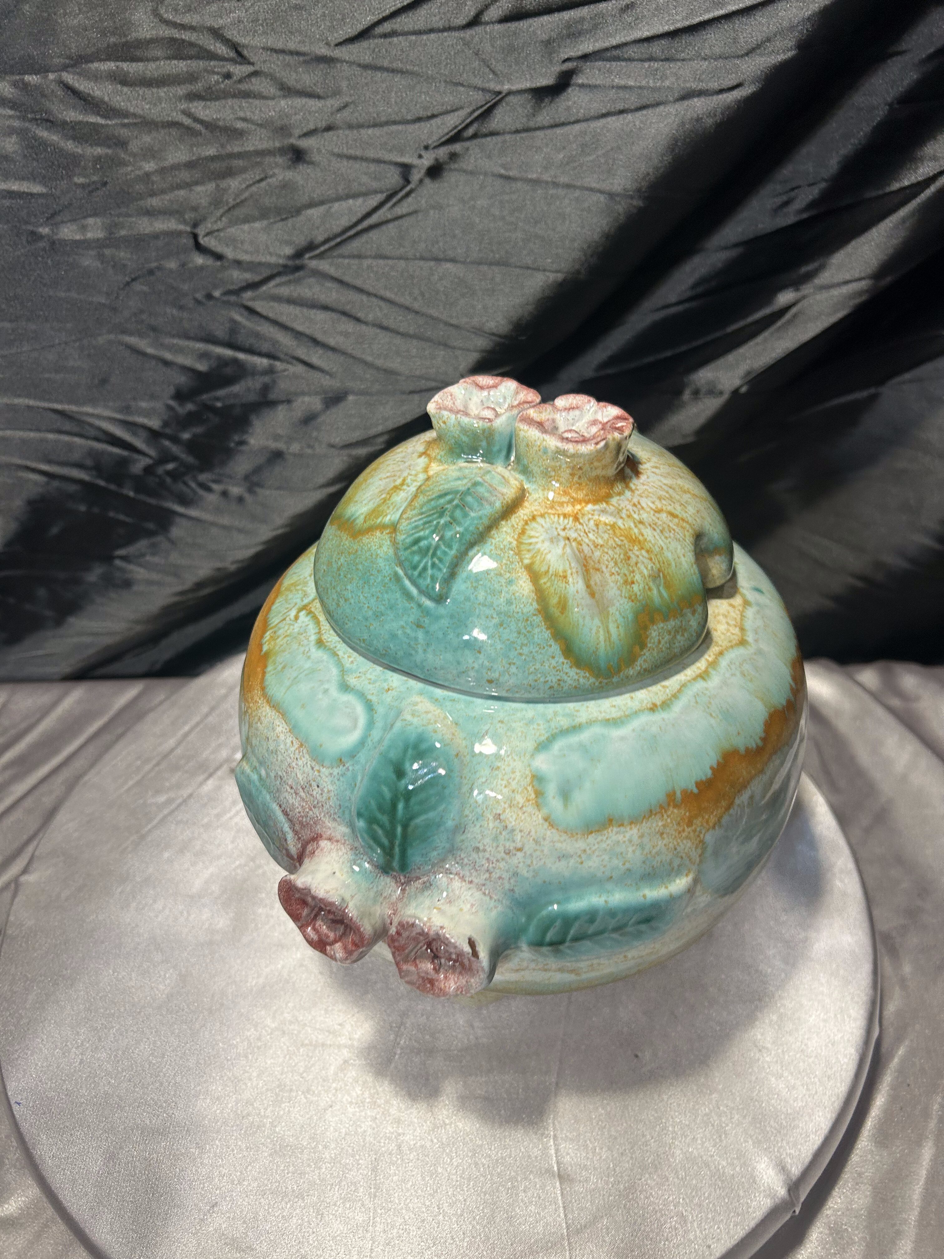 Waza wyróżnia się bogatą strukturą powierzchni oraz dekoracyjnymi elementami kwiatowymi i liściastymi, które subtelnie przechodzą w obły kształt naczynia. Wielobarwne szkliwienie – od turkusów i zieleni, po ciepłe, piaskowe tony – tworzy efekt malarskiej głębi.