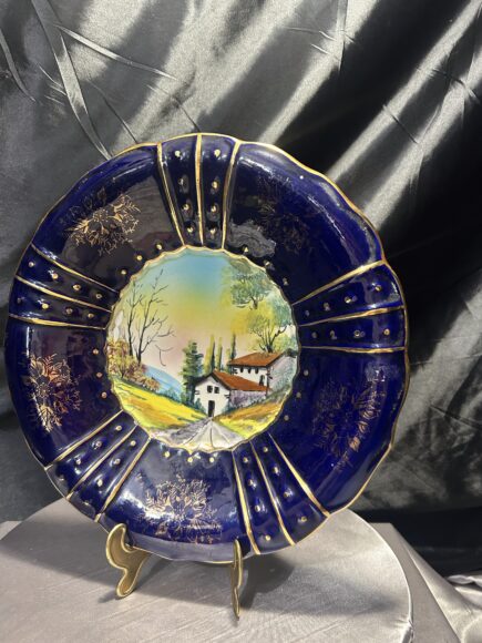 Dekoracyjny talerz porcelanowy – ręcznie malowany pejzaż – cobalt & złoto – Italy