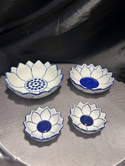 Zestaw 4 talerzyków i miseczek – biało-niebieskie – kwiat lotosu – Tajlandia