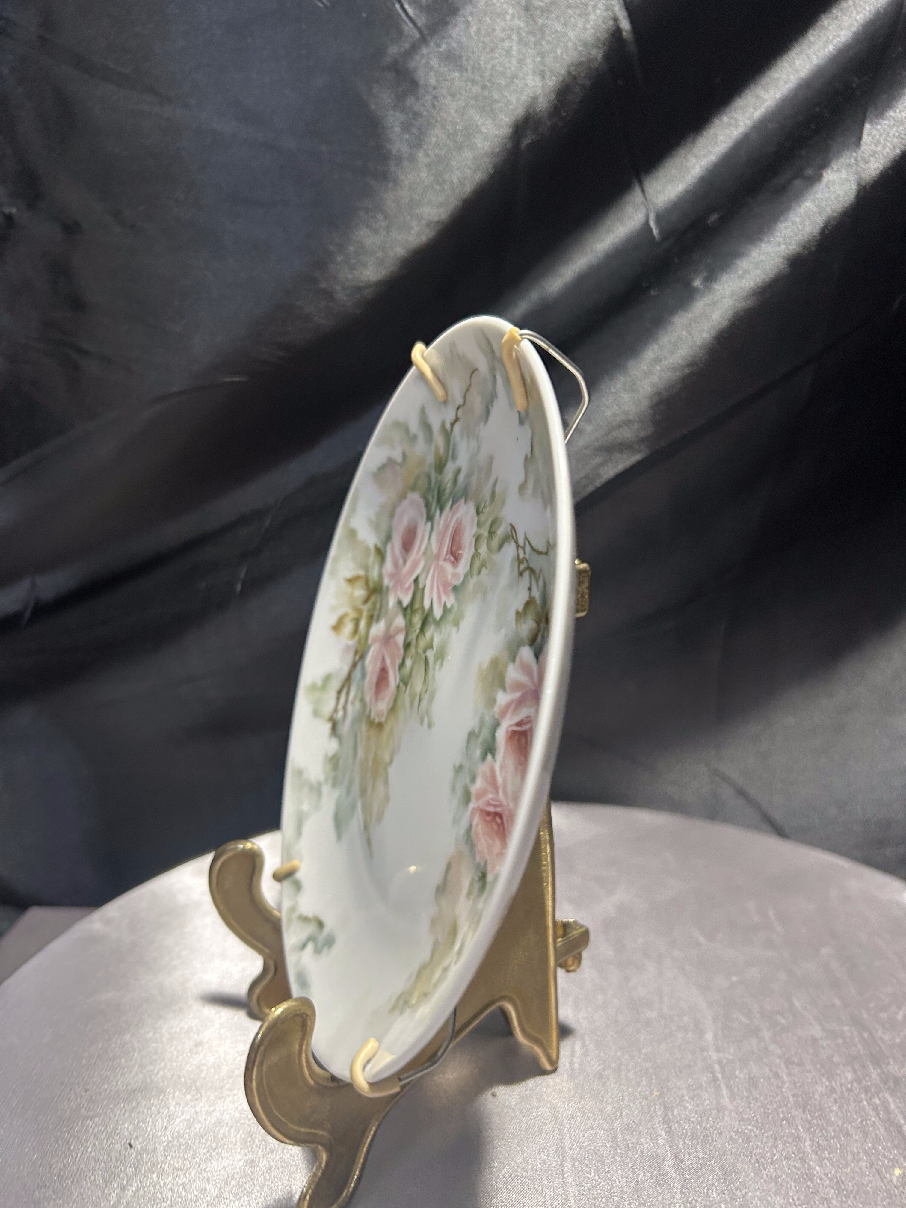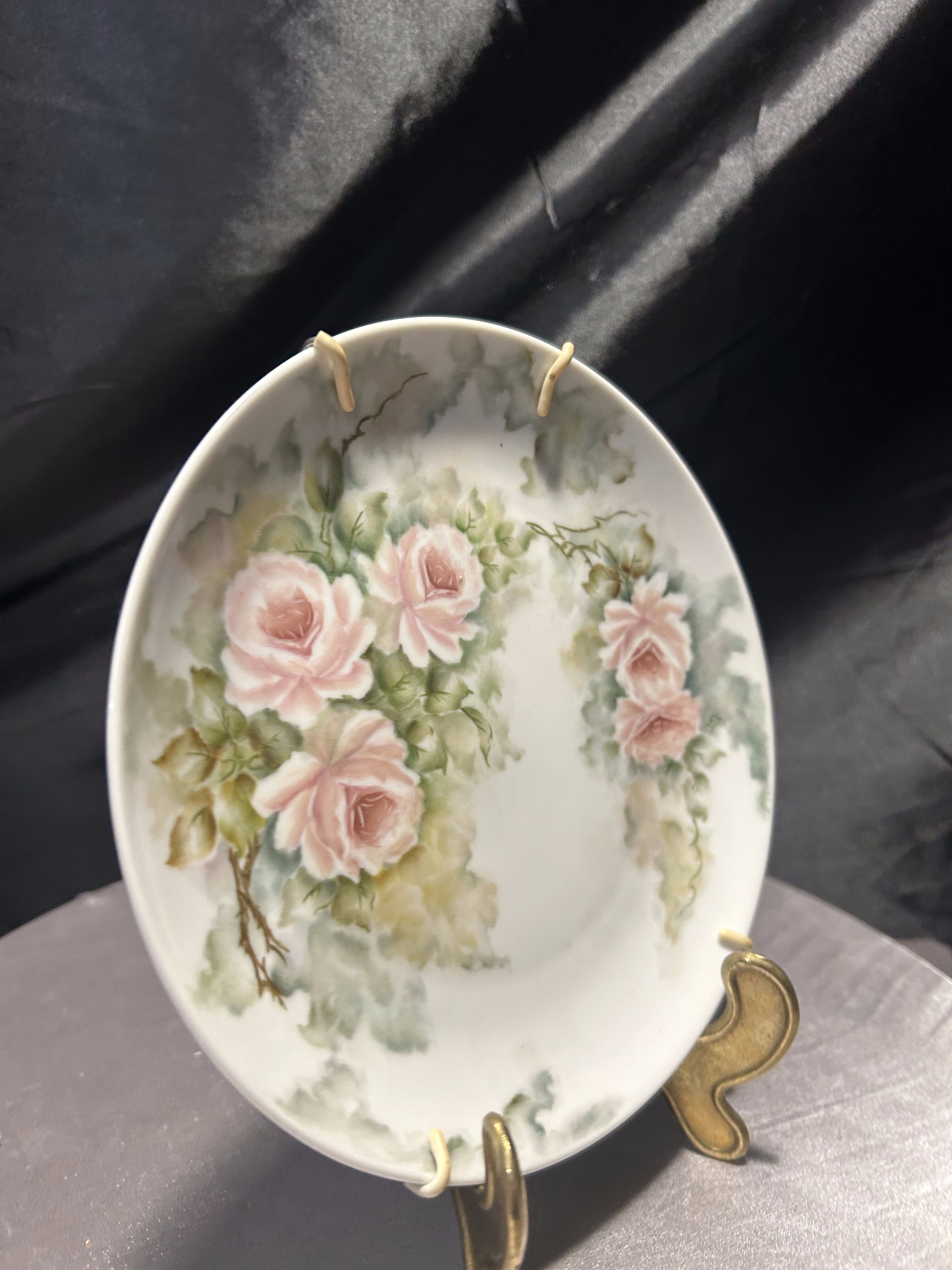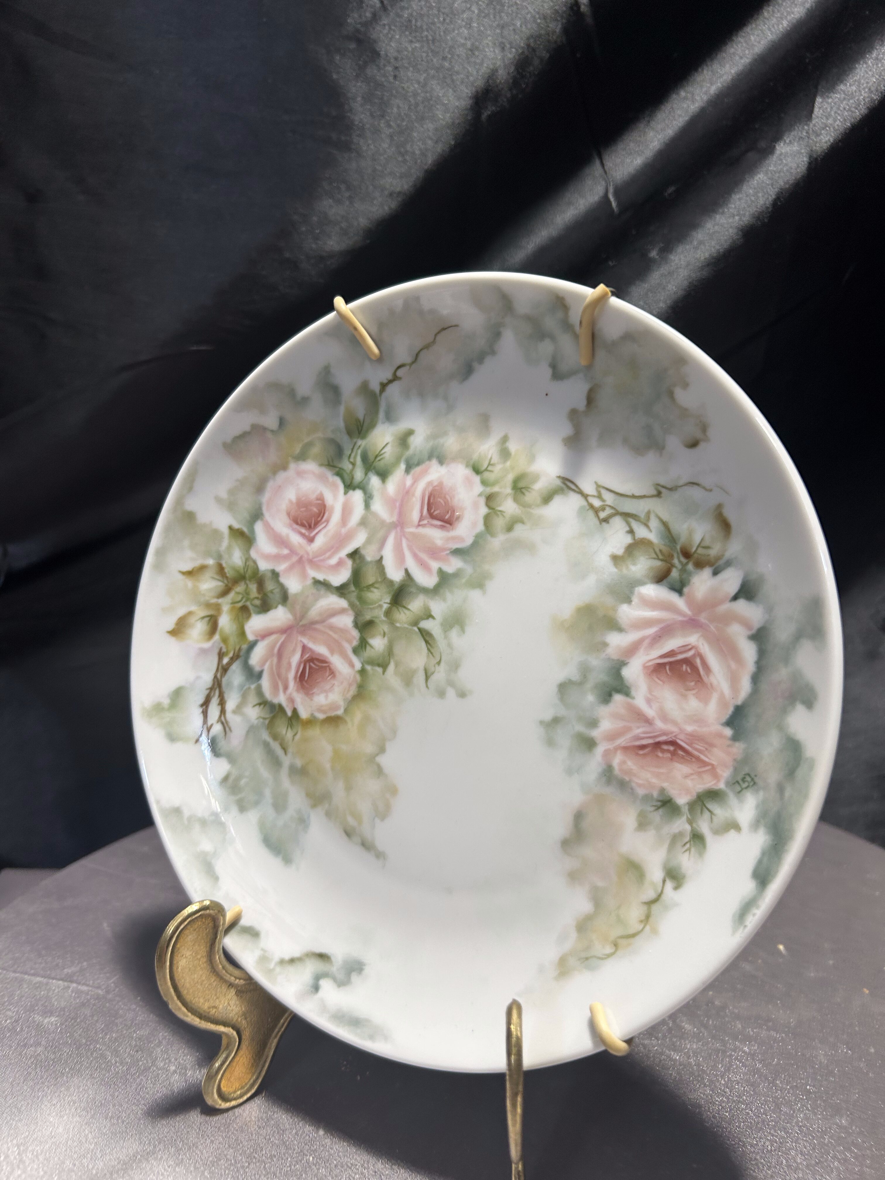 Wyjątkowy, ręcznie malowany talerz dekoracyjny sprowadzony z Norwegii, sygnowany i datowany – to unikat, który zachwyca subtelnością i precyzją wykonania. Na śnieżnobiałej porcelanie rozkwitają pastelowe róże otulone delikatną mgiełką zieleni – kompozycja przypominająca akwarelowy pejzaż kwiatowy, pełen spokoju i elegancji. Praca została wykonana i podpisana przez artystę o nazwisku J.S.S. Jørgensborg, a na odwrocie widnieją również wpisy: