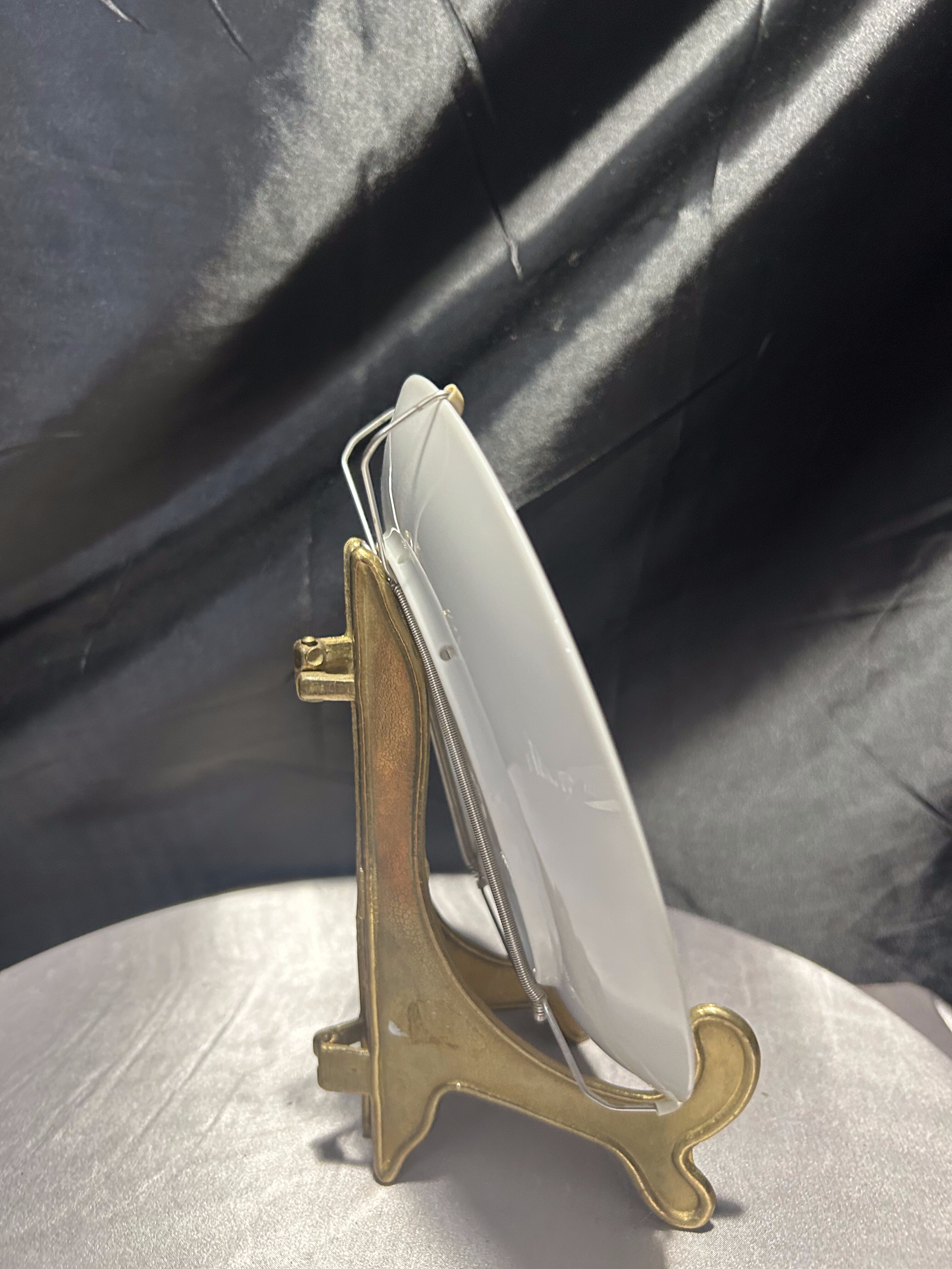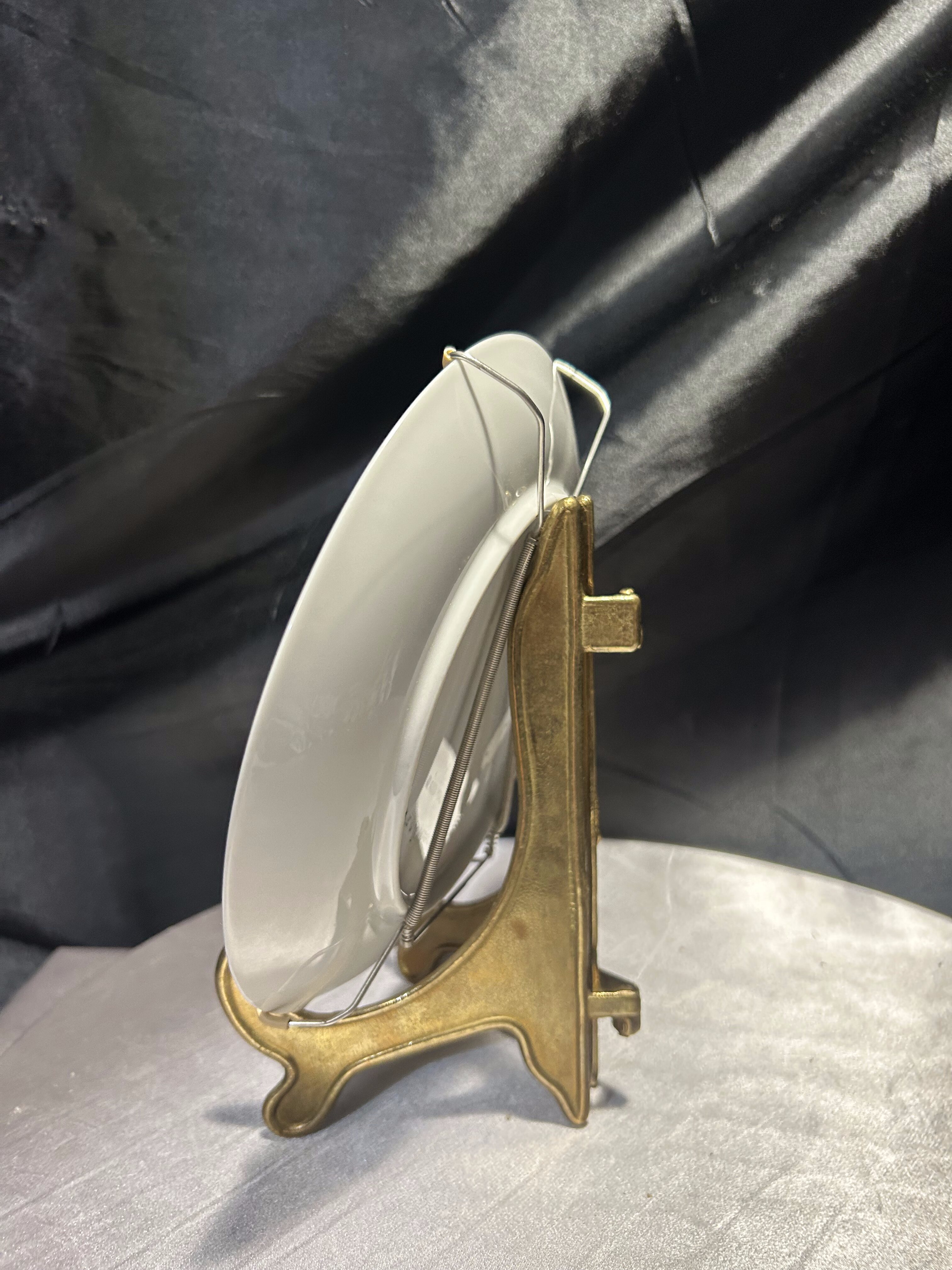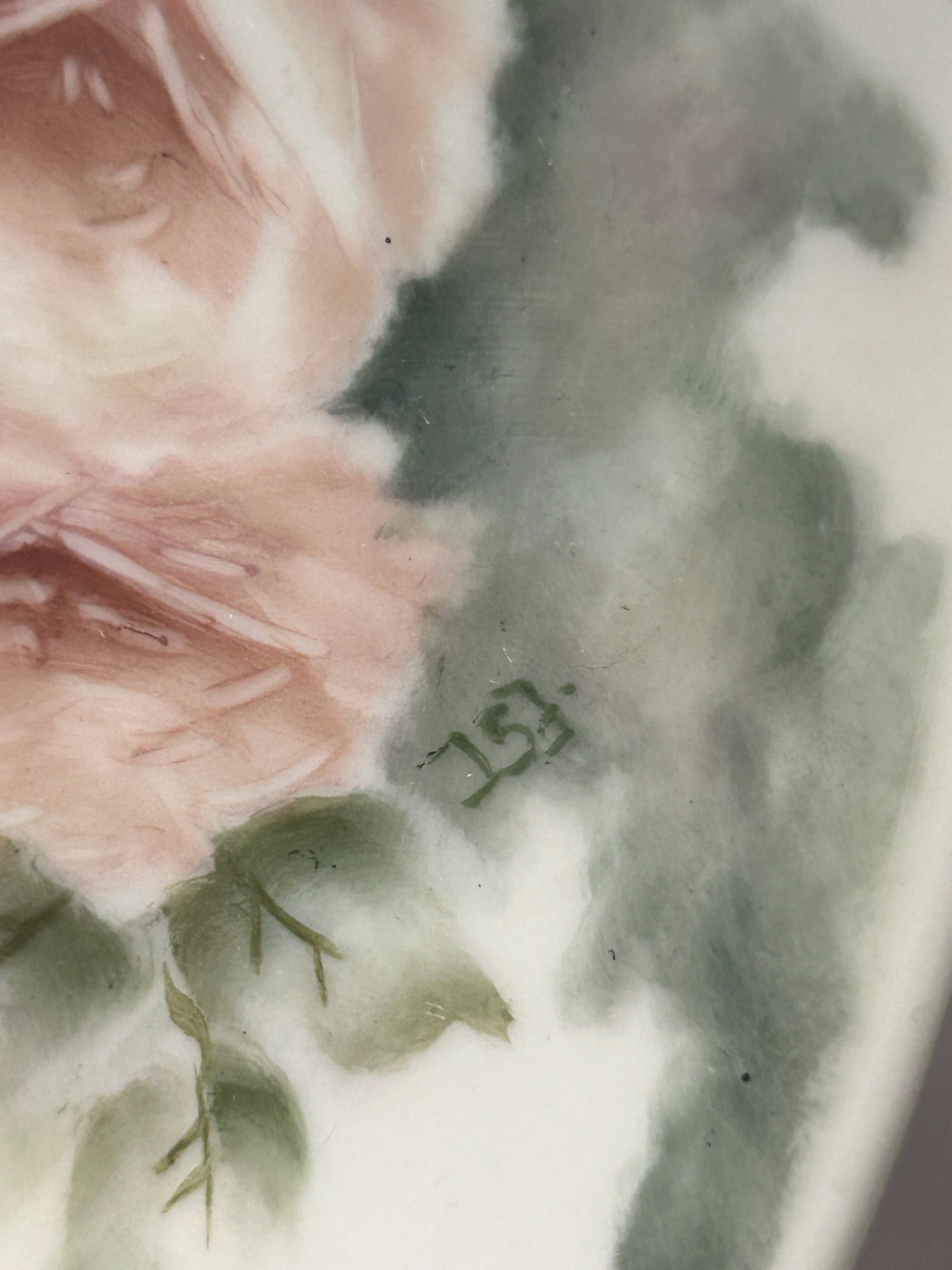Wyjątkowy, ręcznie malowany talerz dekoracyjny sprowadzony z Norwegii, sygnowany i datowany – to unikat, który zachwyca subtelnością i precyzją wykonania. Na śnieżnobiałej porcelanie rozkwitają pastelowe róże otulone delikatną mgiełką zieleni – kompozycja przypominająca akwarelowy pejzaż kwiatowy, pełen spokoju i elegancji. Praca została wykonana i podpisana przez artystę o nazwisku J.S.S. Jørgensborg, a na odwrocie widnieją również wpisy: