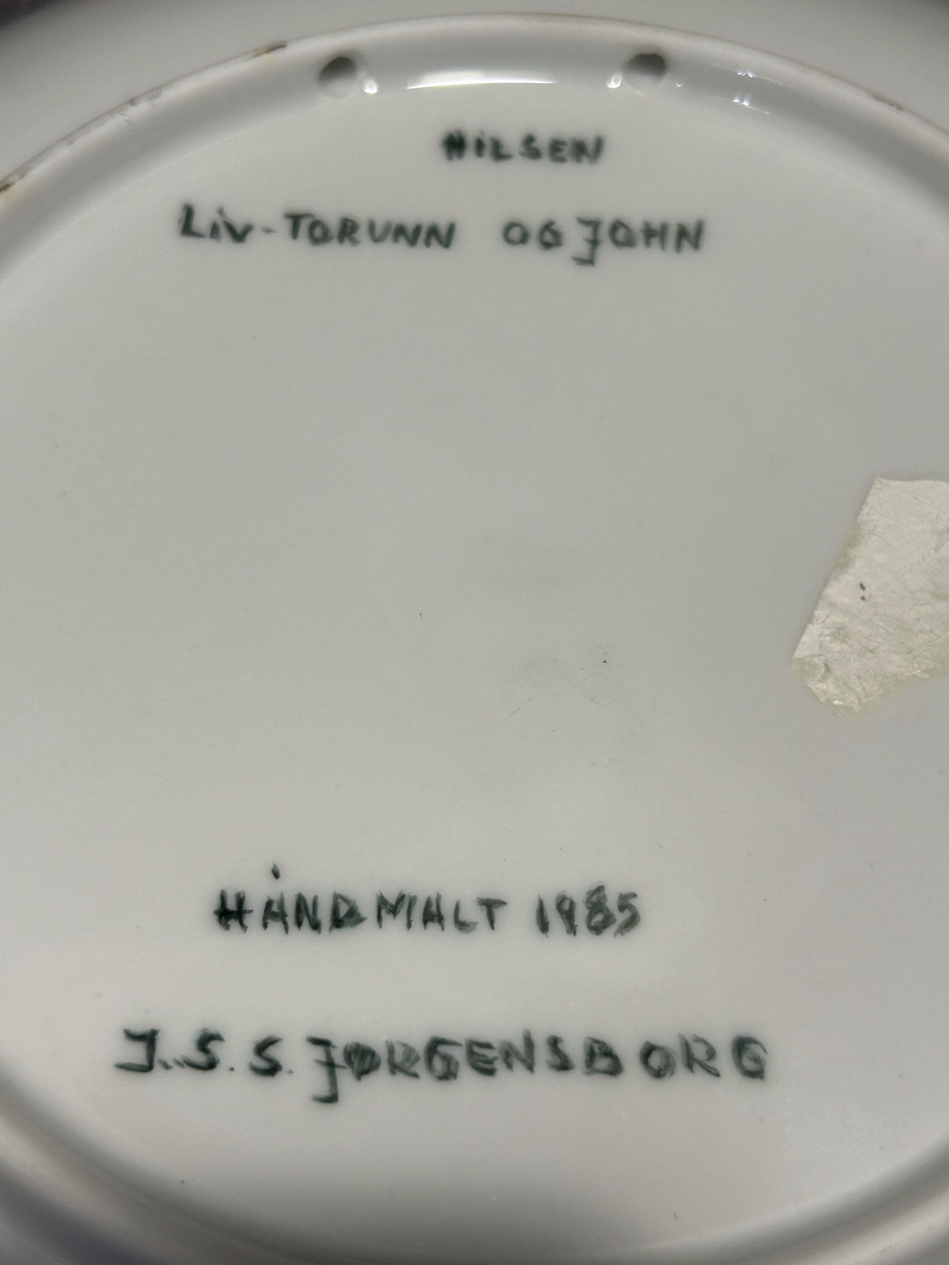 co oznacza: „Pozdrowienia od Liv-Torunn i Johna” oraz „Ręcznie malowane 1985”.