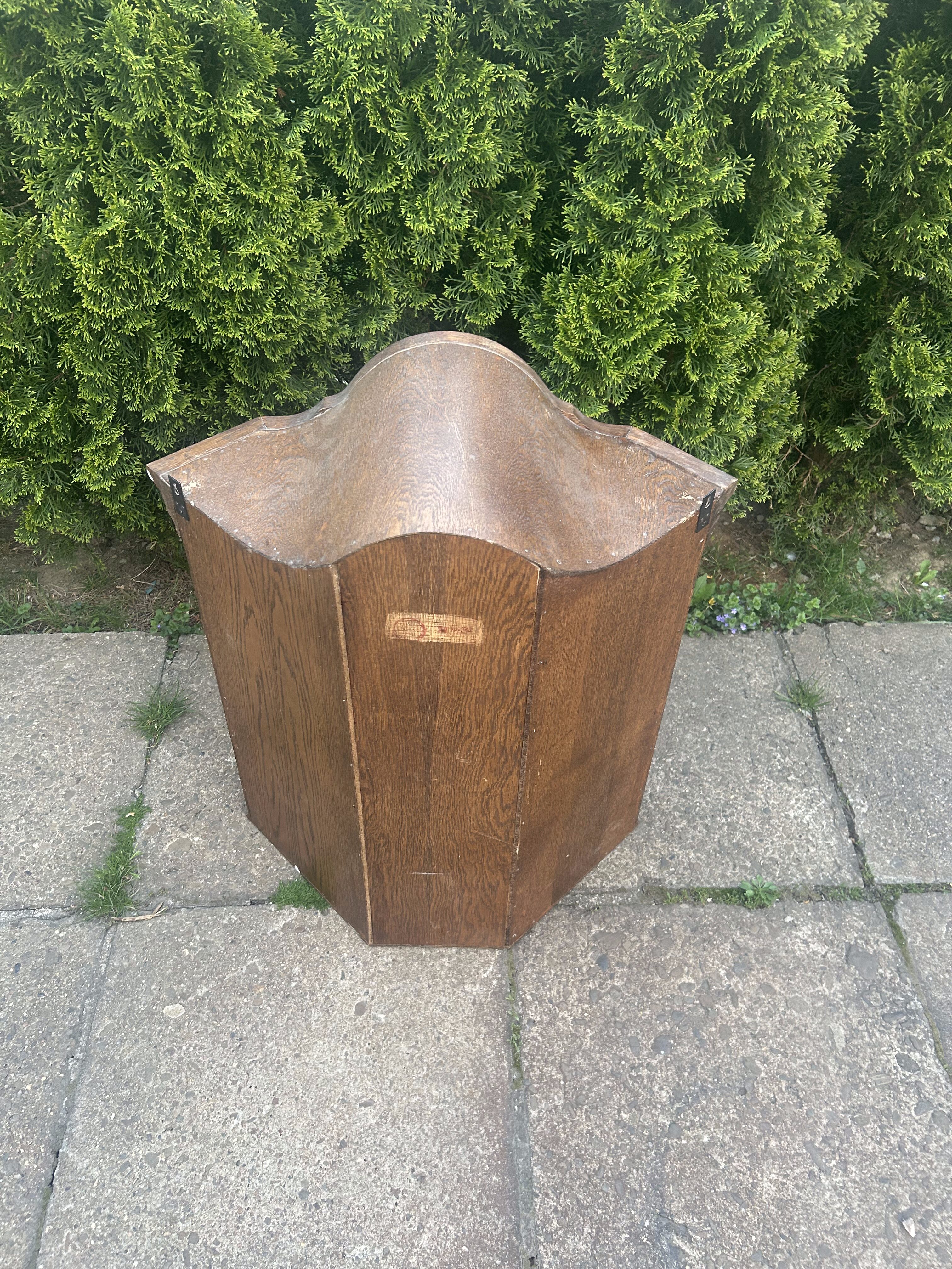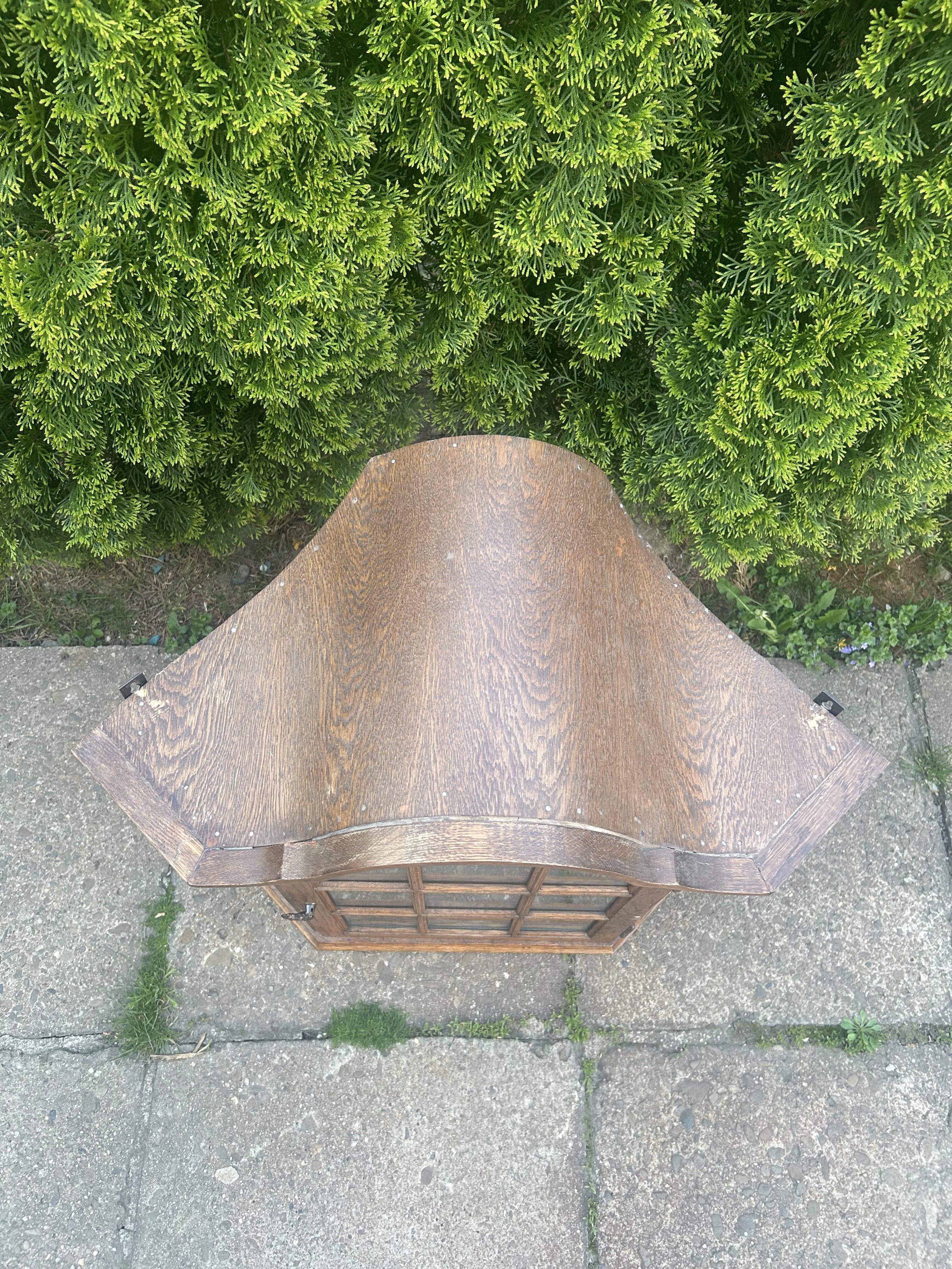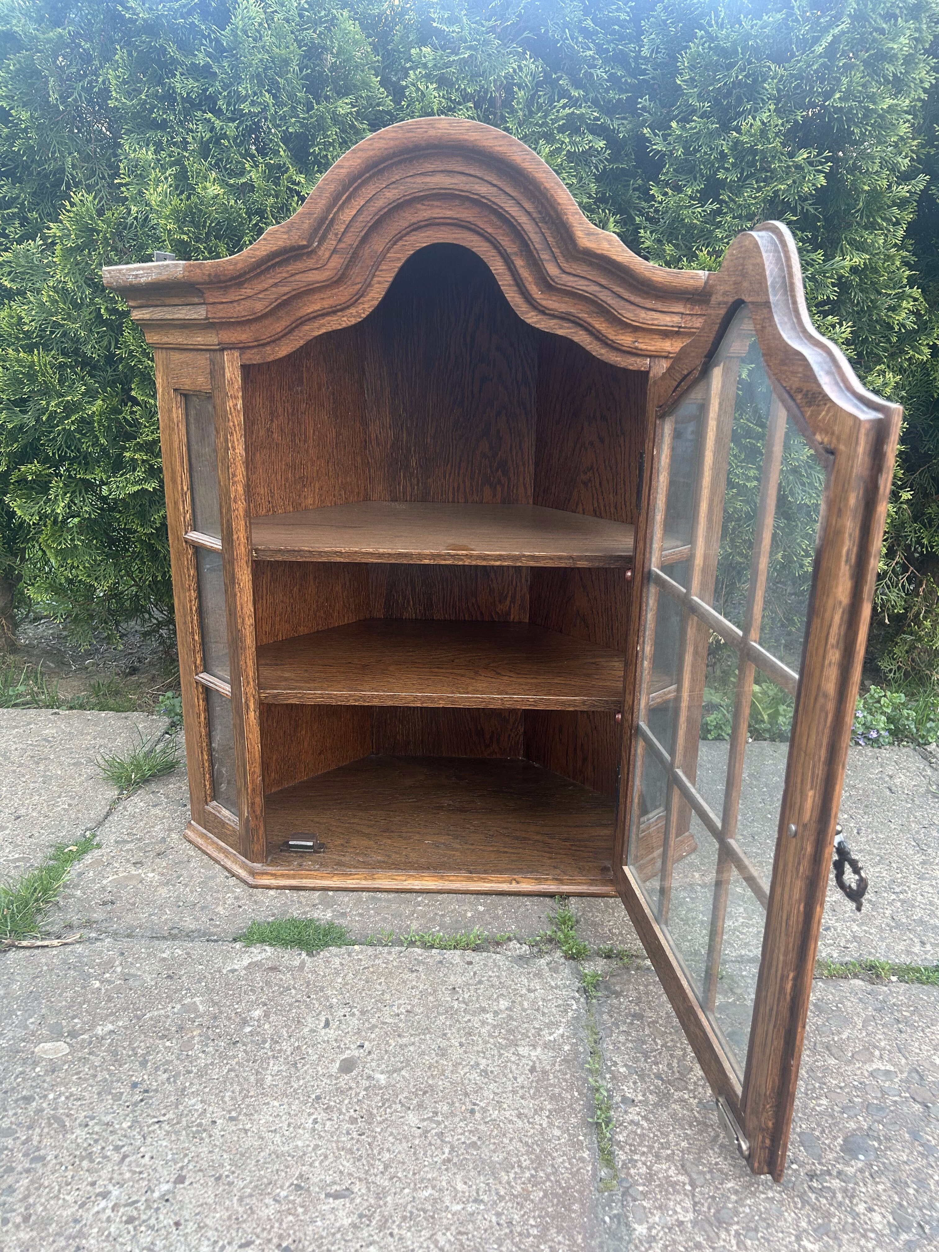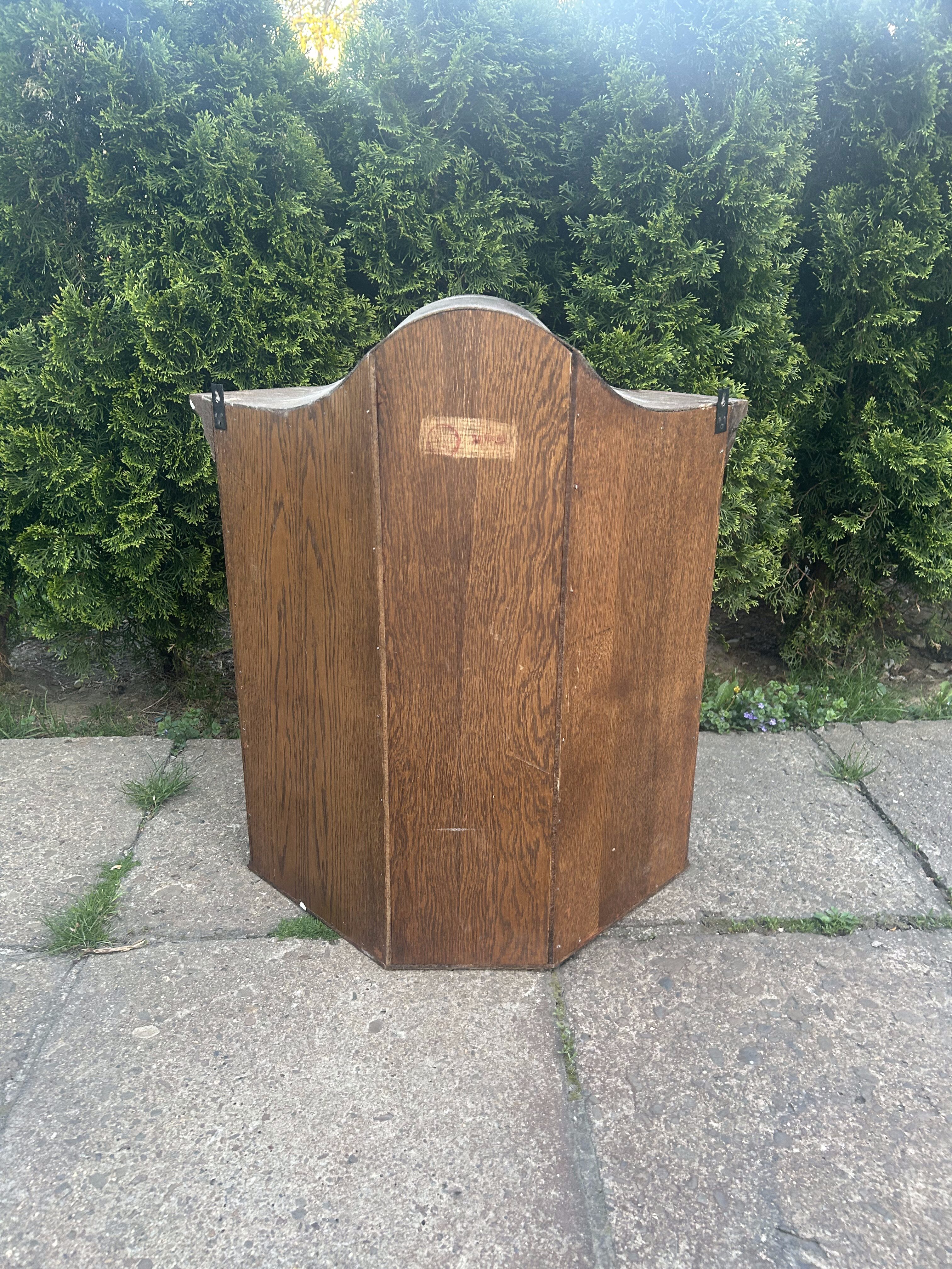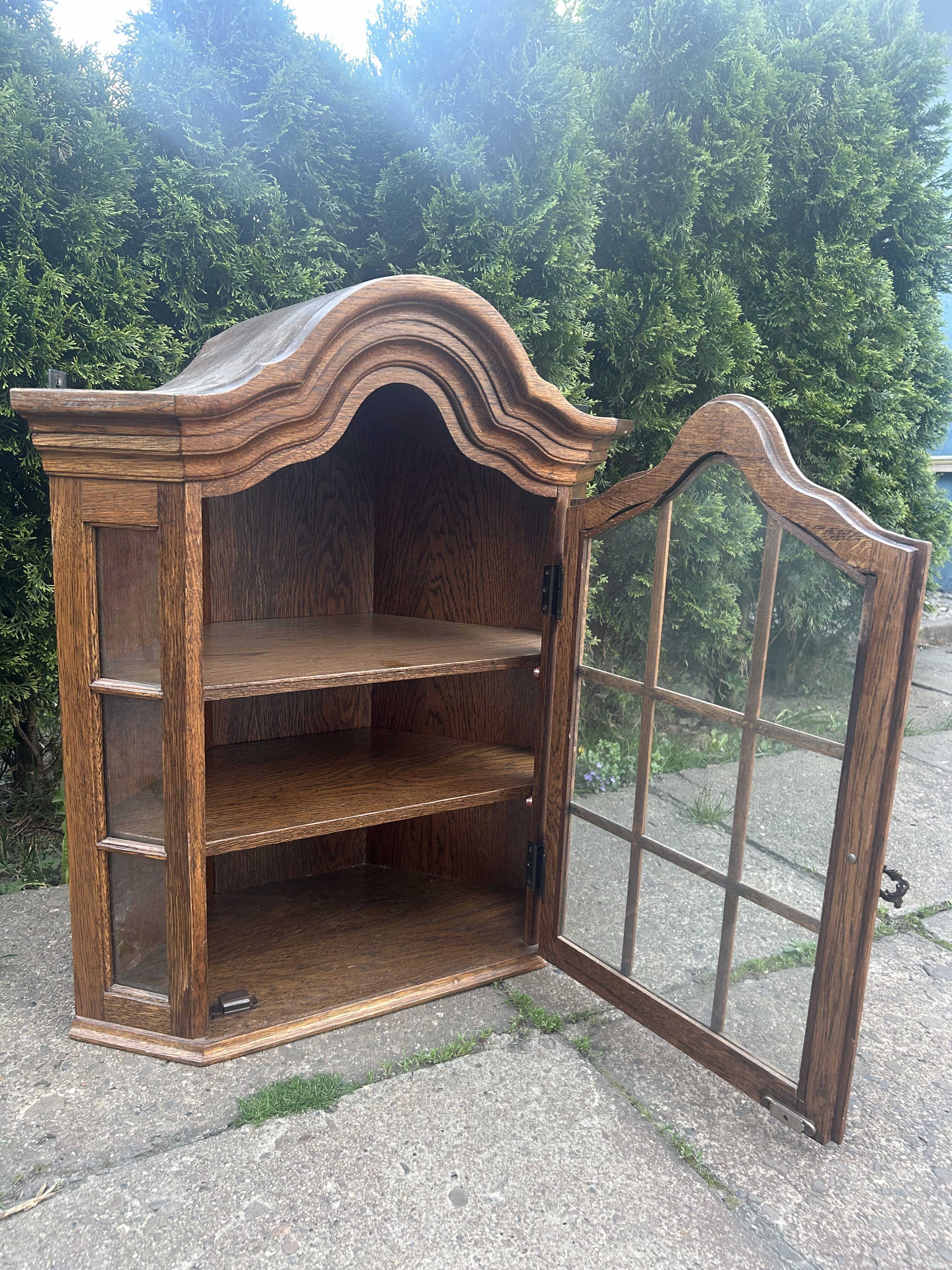 Urokliwa rogowa witryna wisząca z 1966 roku, w klasycznym rustykalnym stylu. Wykonana z drewna, z przeszklonymi drzwiami podzielonymi szprosami i efektownym, falistym gzymsem. Wewnątrz znajdują się dwie półki, które dzielą wnętrze na trzy praktyczne przestrzenie ekspozycyjne. Mebel idealny do zawieszenia w rogu pomieszczenia – pięknie zaprezentuje kolekcję filiżanek, szkła czy dekoracyjnych drobiazgów.