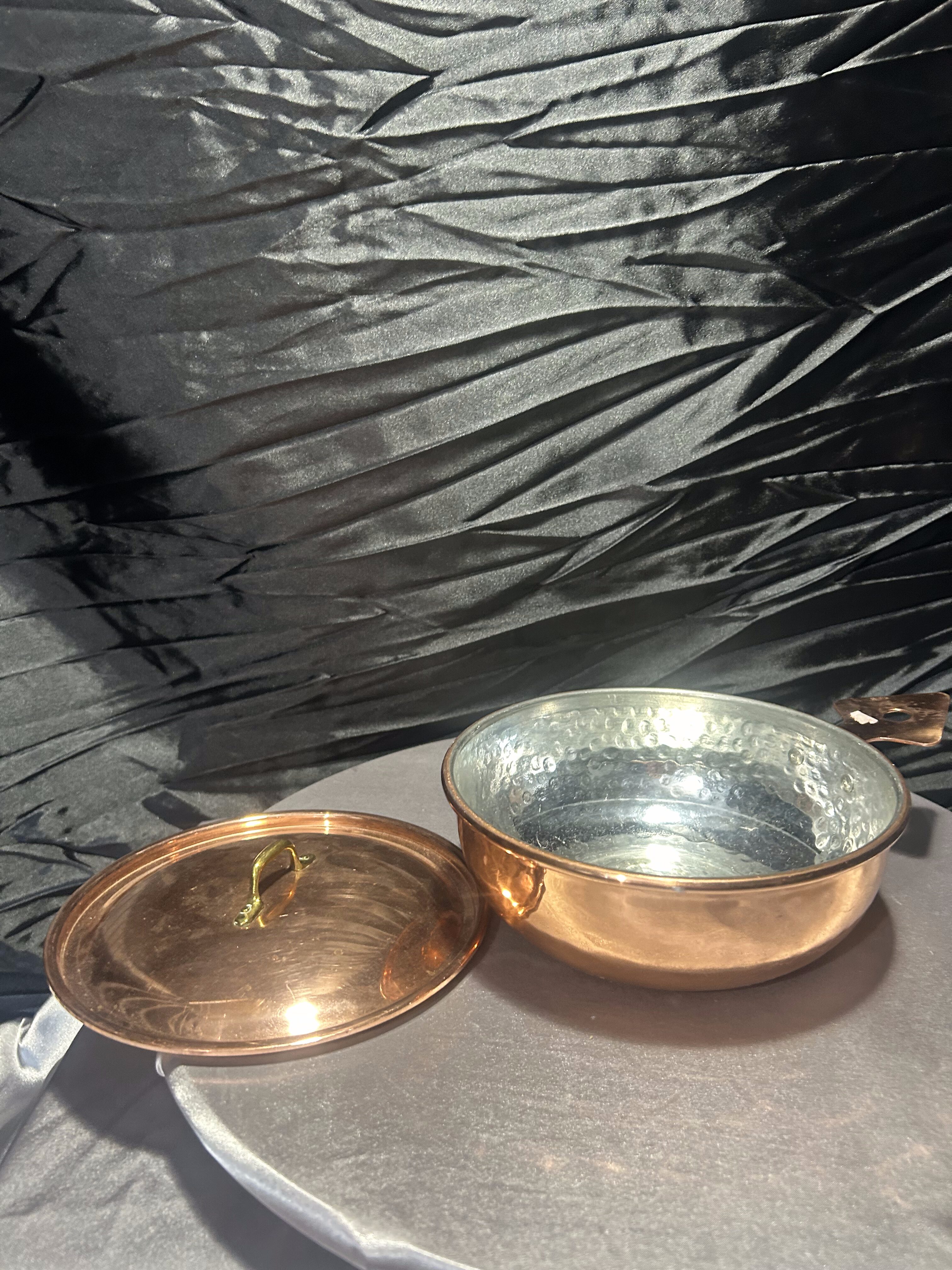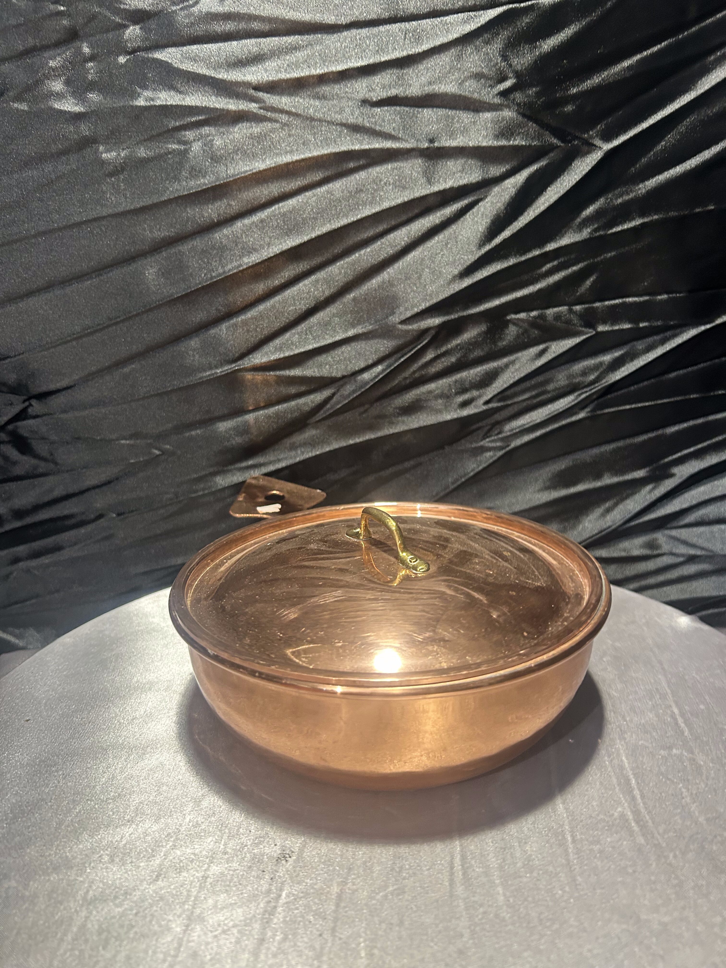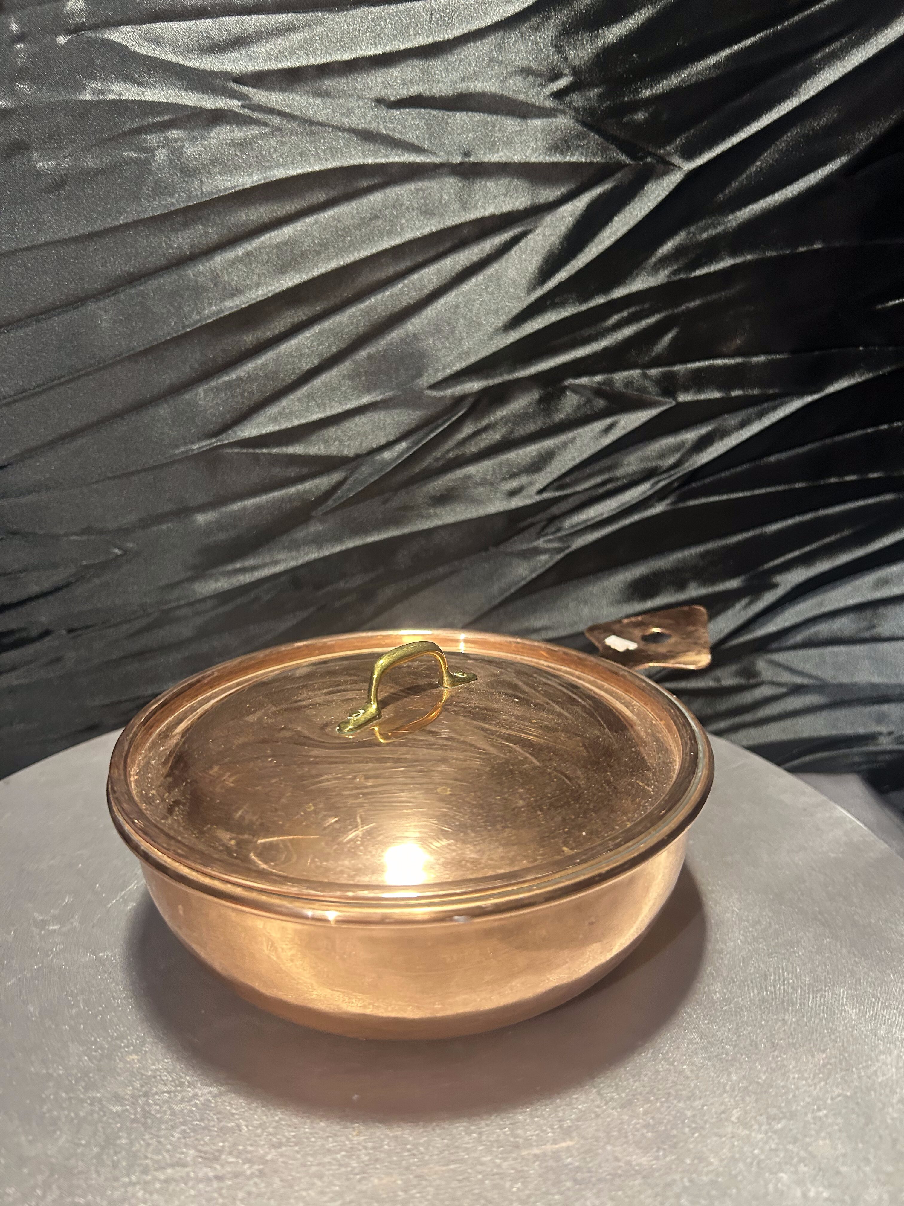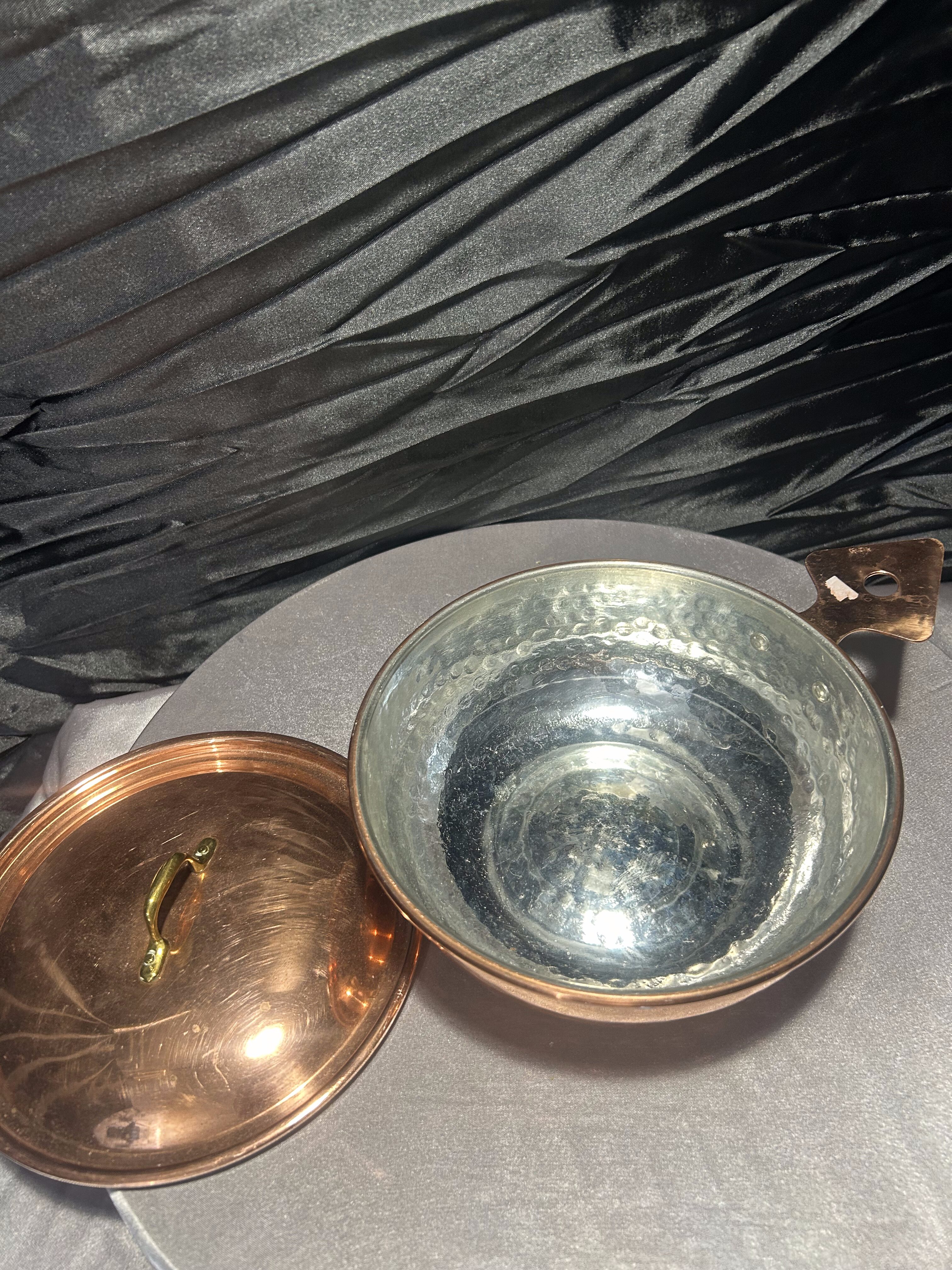 Piękny rondel wykonany z miedzi, z dopasowaną pokrywką i poręcznym uchwytem. Wnętrze w stanie niemal idealnym – czyste, gotowe do użytku lub do ekspozycji jako ozdoba. Klasyczny design i delikatnie młotkowana powierzchnia dodają mu rustykalnego uroku. Doskonały zarówno do kuchni w stylu retro, jak i jako stylowy element dekoracyjny.