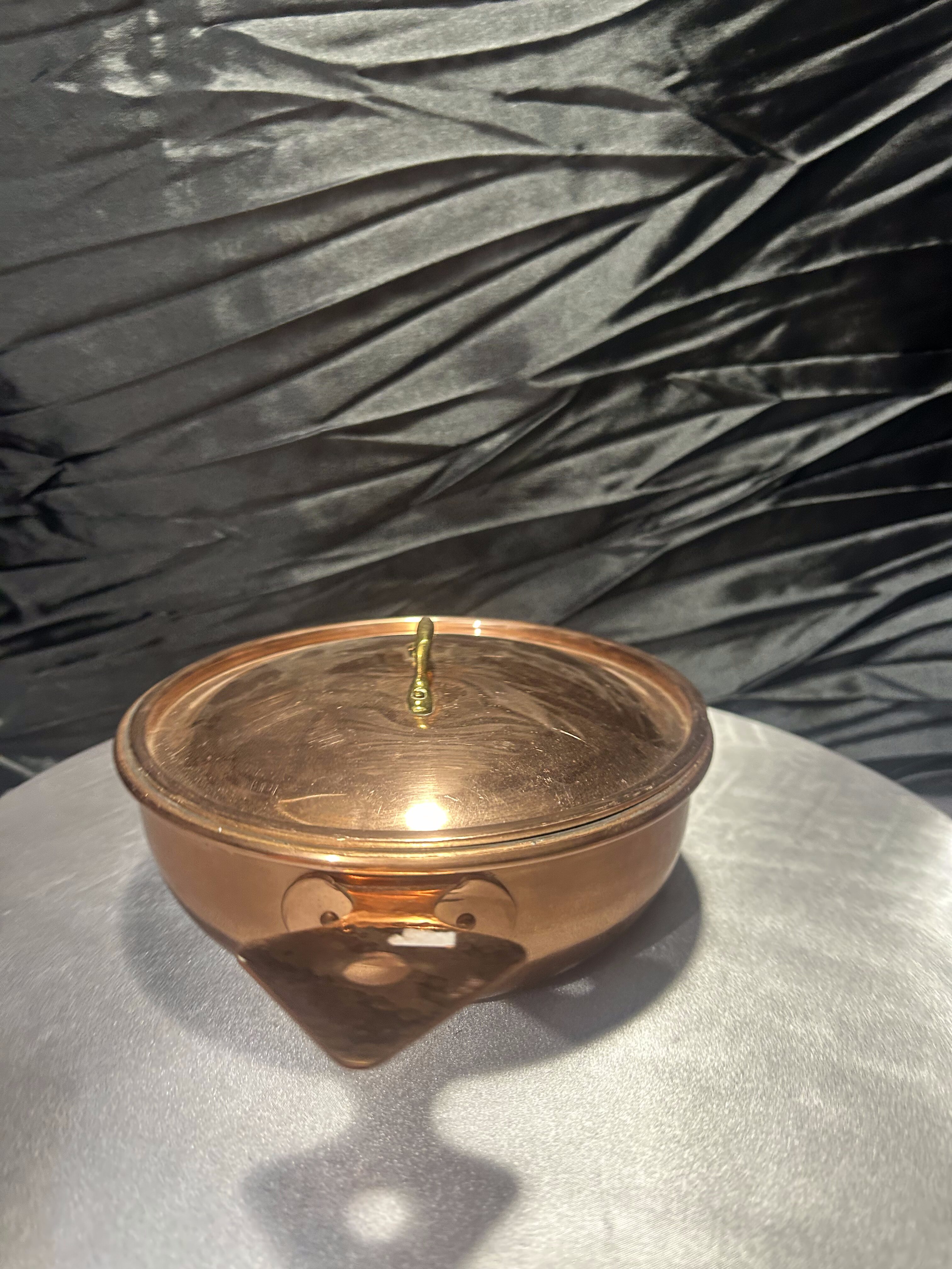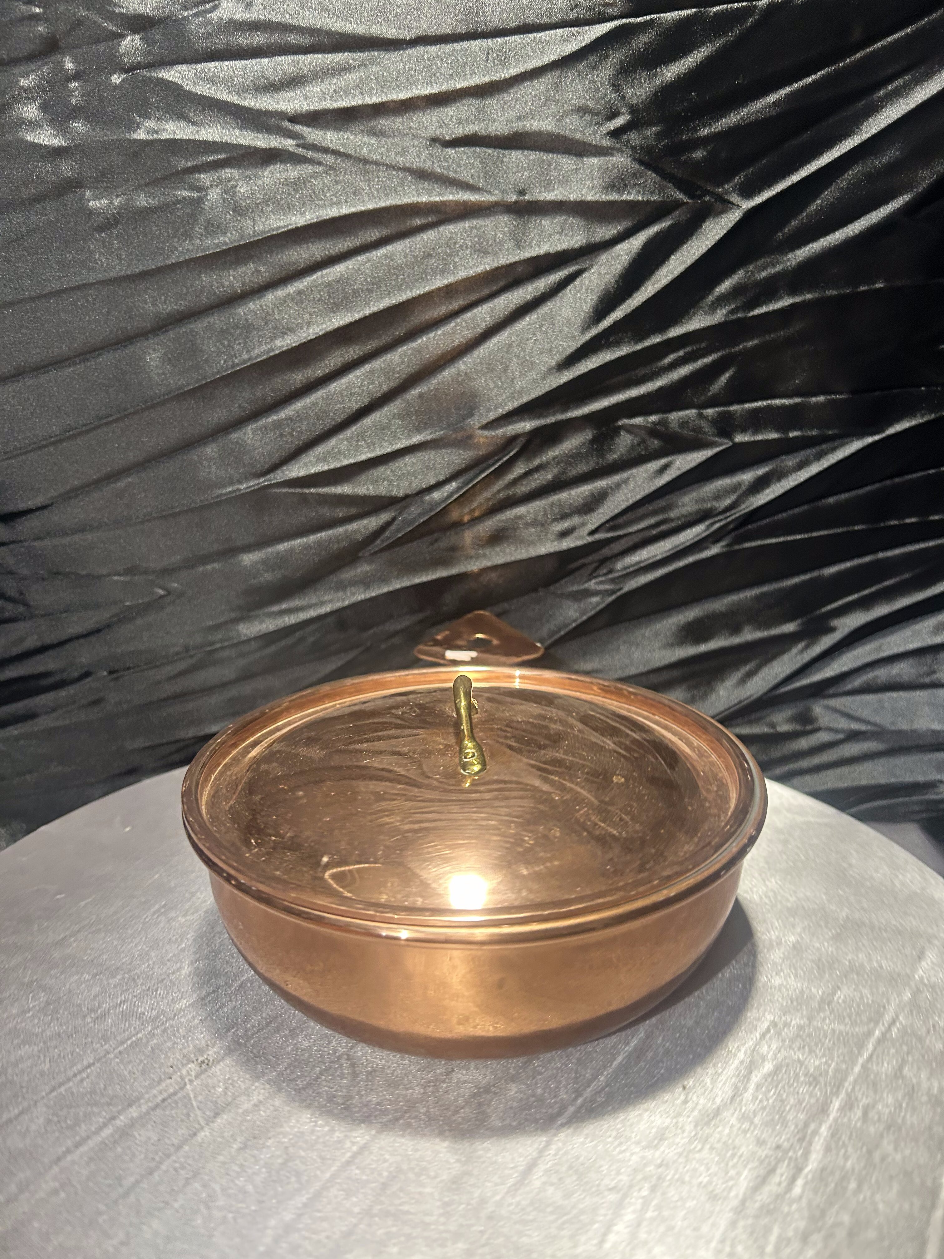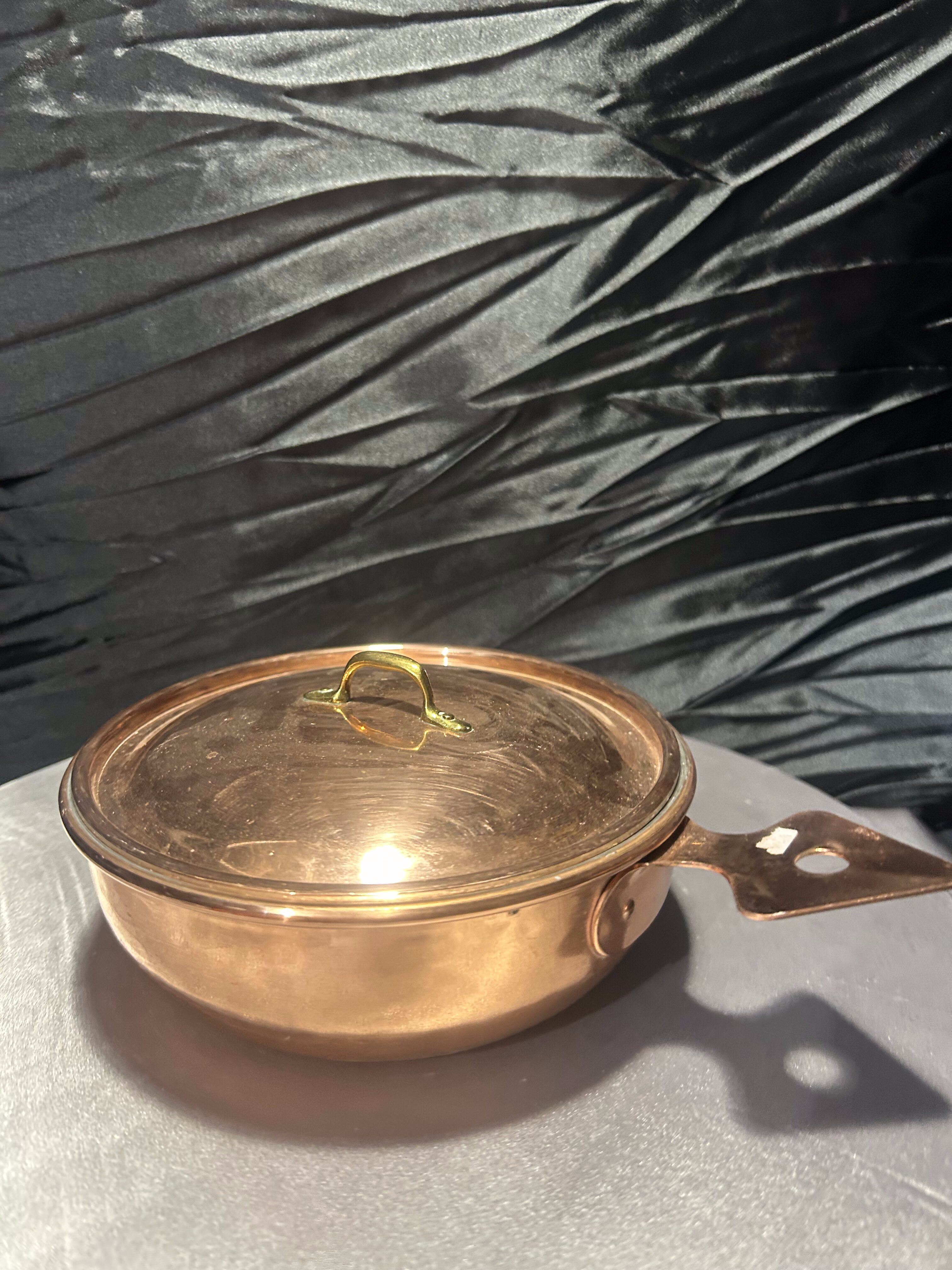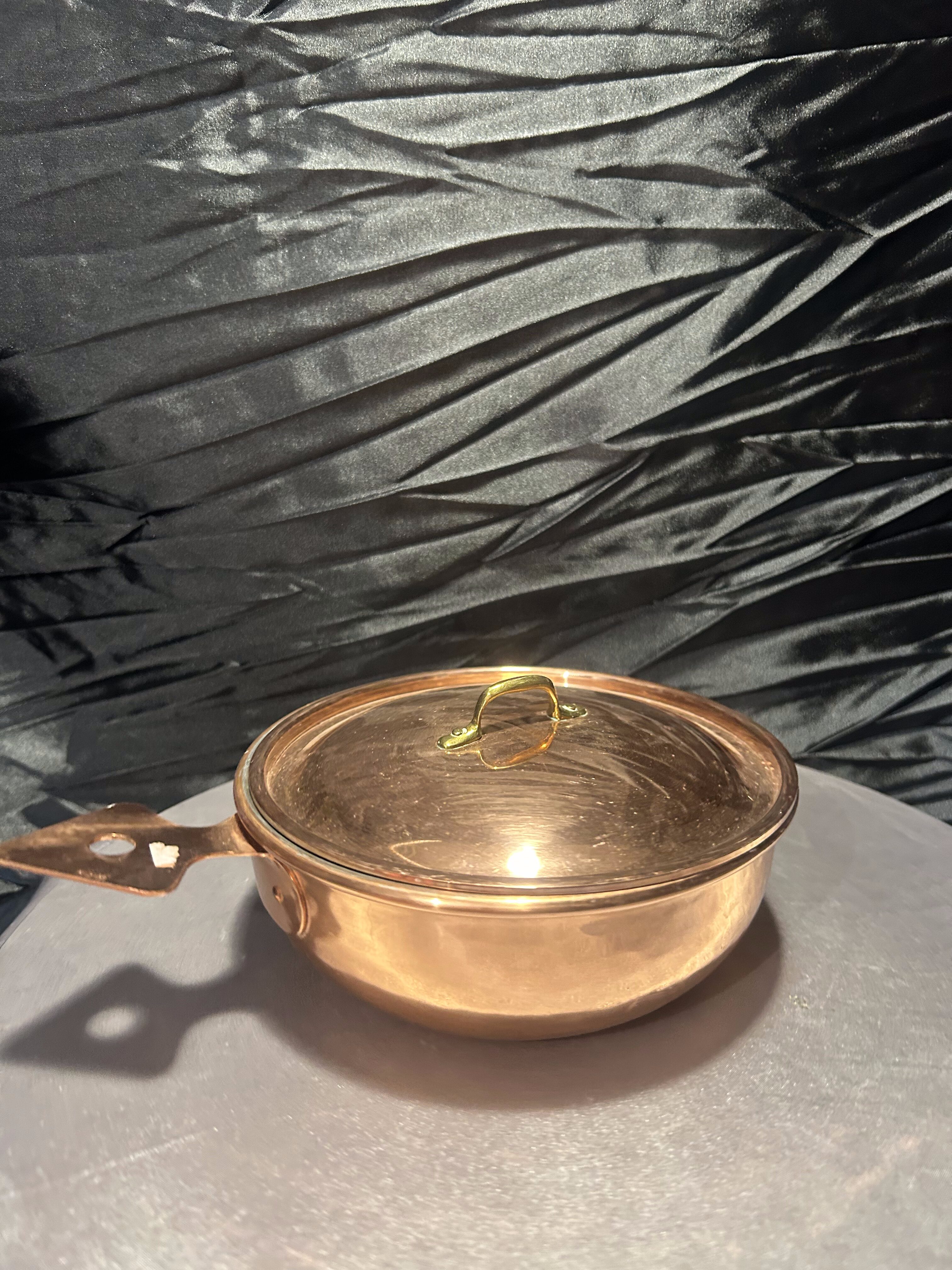 Piękny rondel wykonany z miedzi, z dopasowaną pokrywką i poręcznym uchwytem. Wnętrze w stanie niemal idealnym – czyste, gotowe do użytku lub do ekspozycji jako ozdoba. Klasyczny design i delikatnie młotkowana powierzchnia dodają mu rustykalnego uroku. Doskonały zarówno do kuchni w stylu retro, jak i jako stylowy element dekoracyjny.