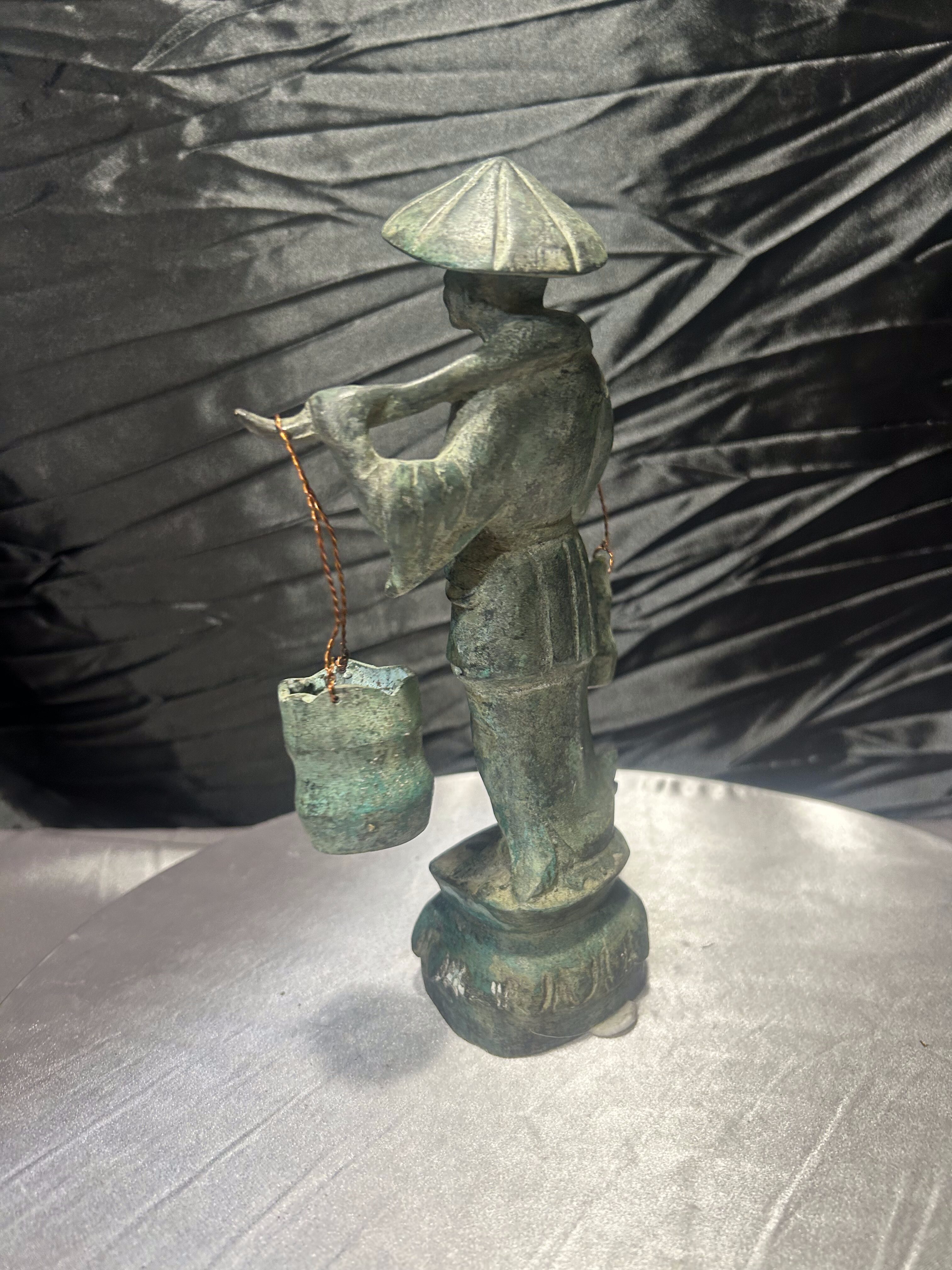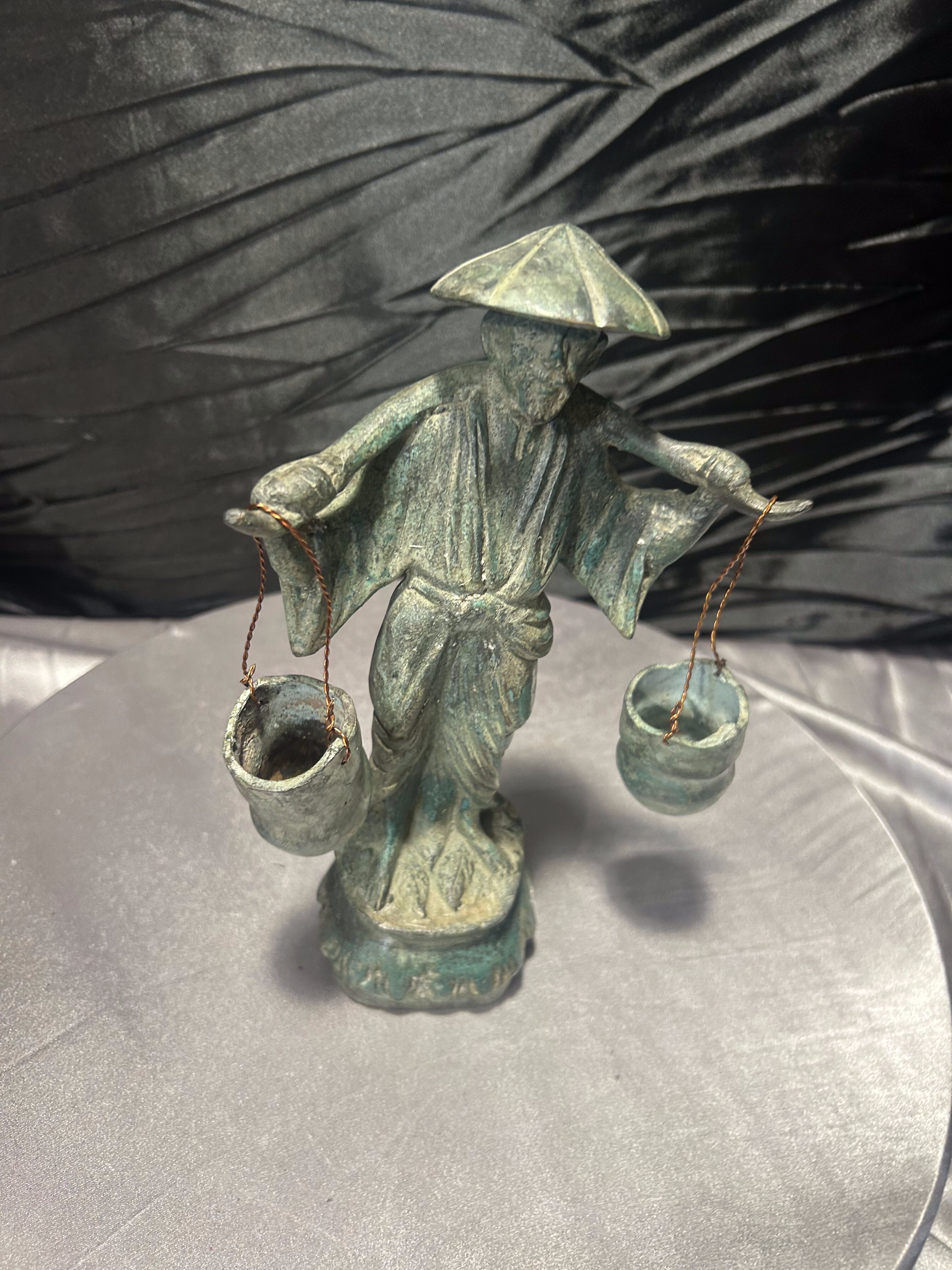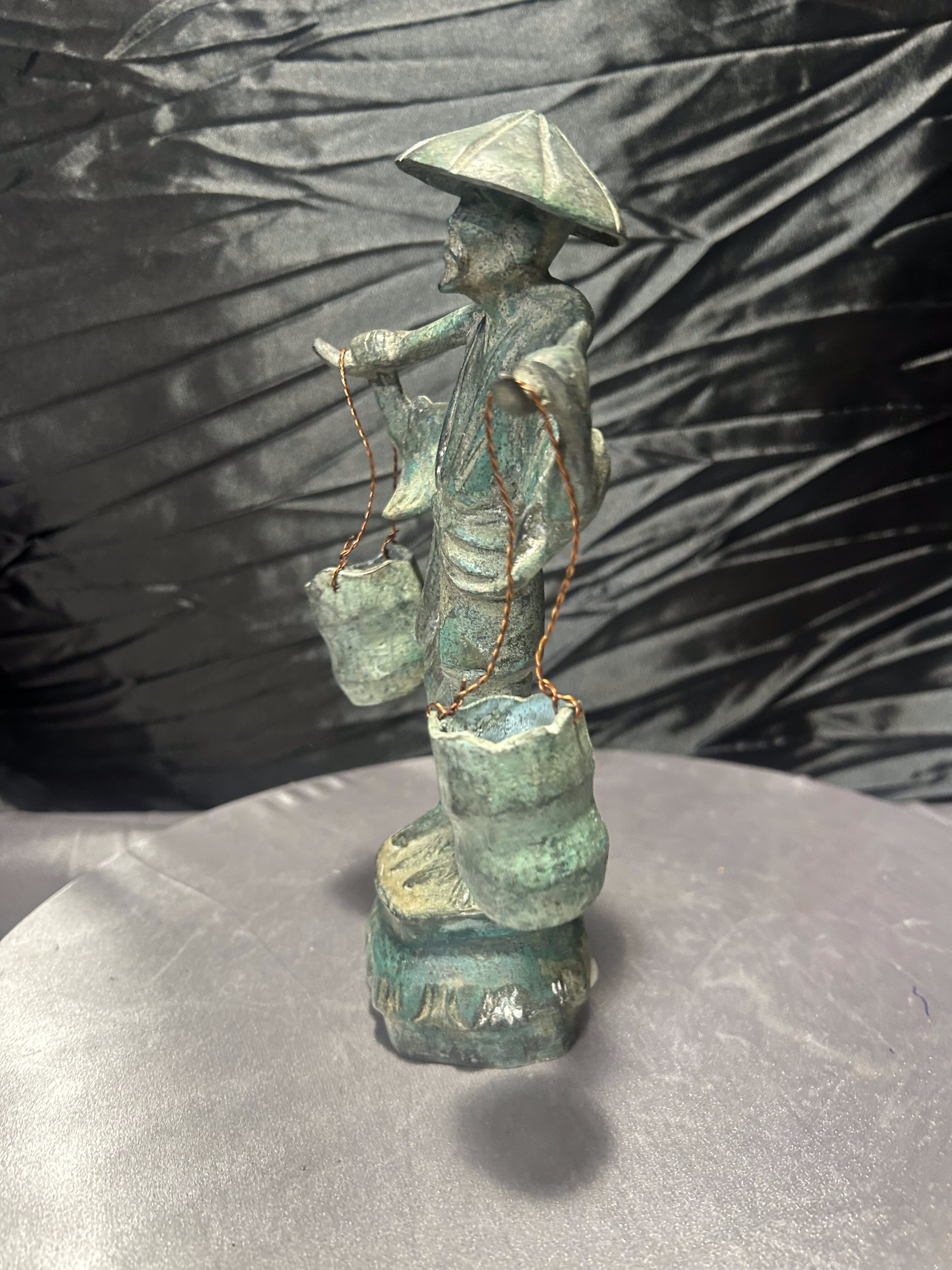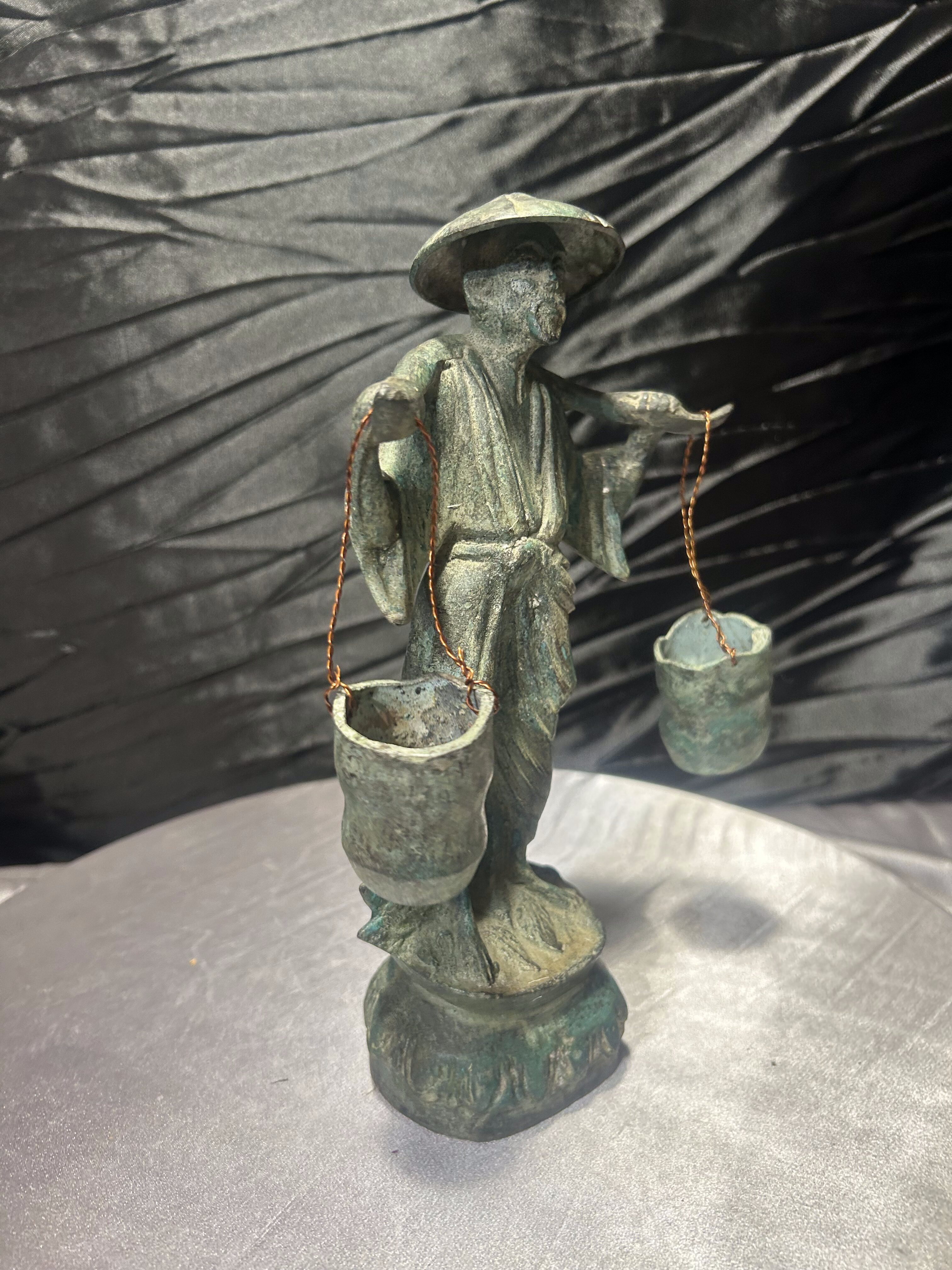 Rzeźba Azjata z cebrzykami – mosiądz z patyną – styl orientalny