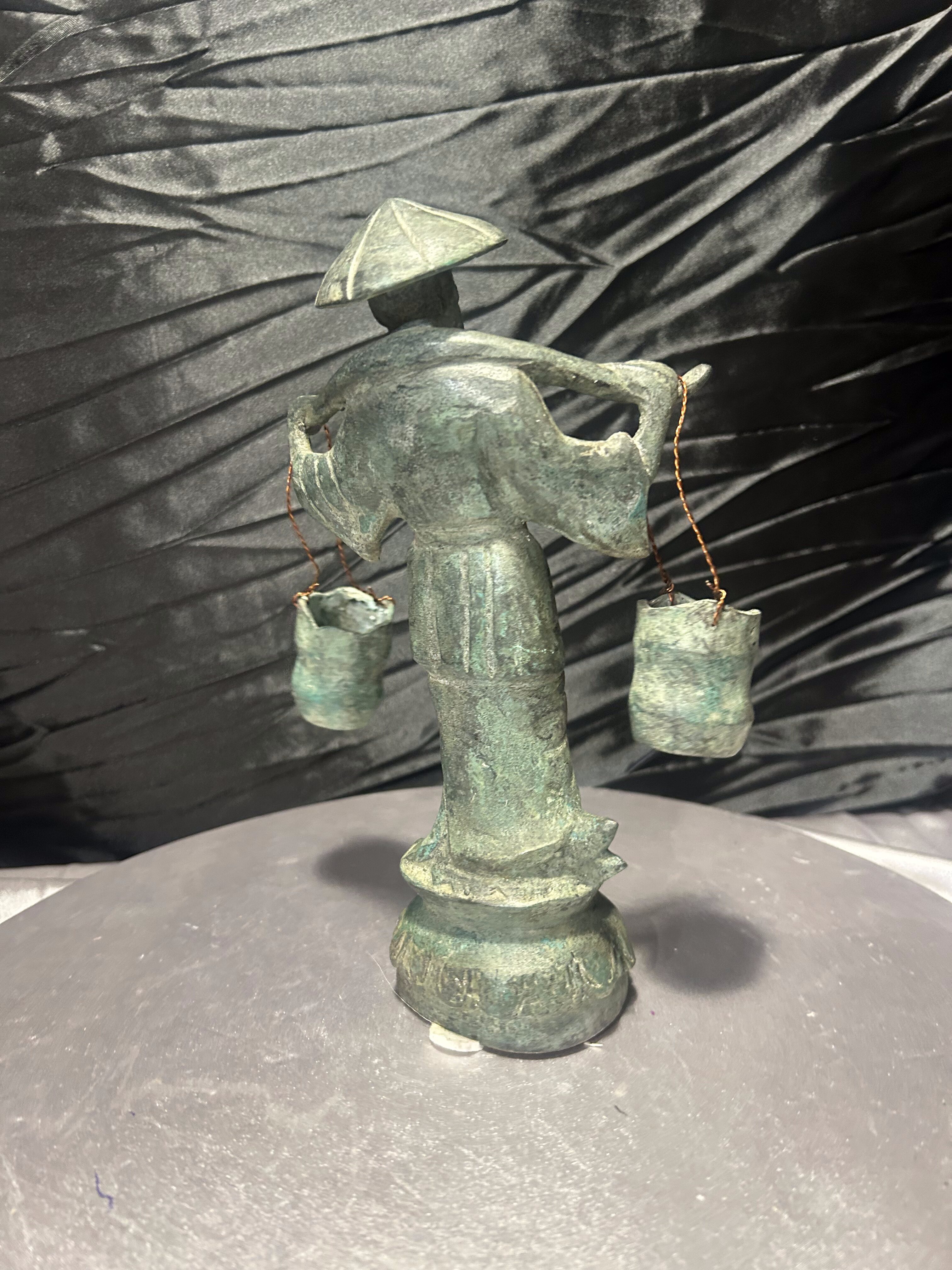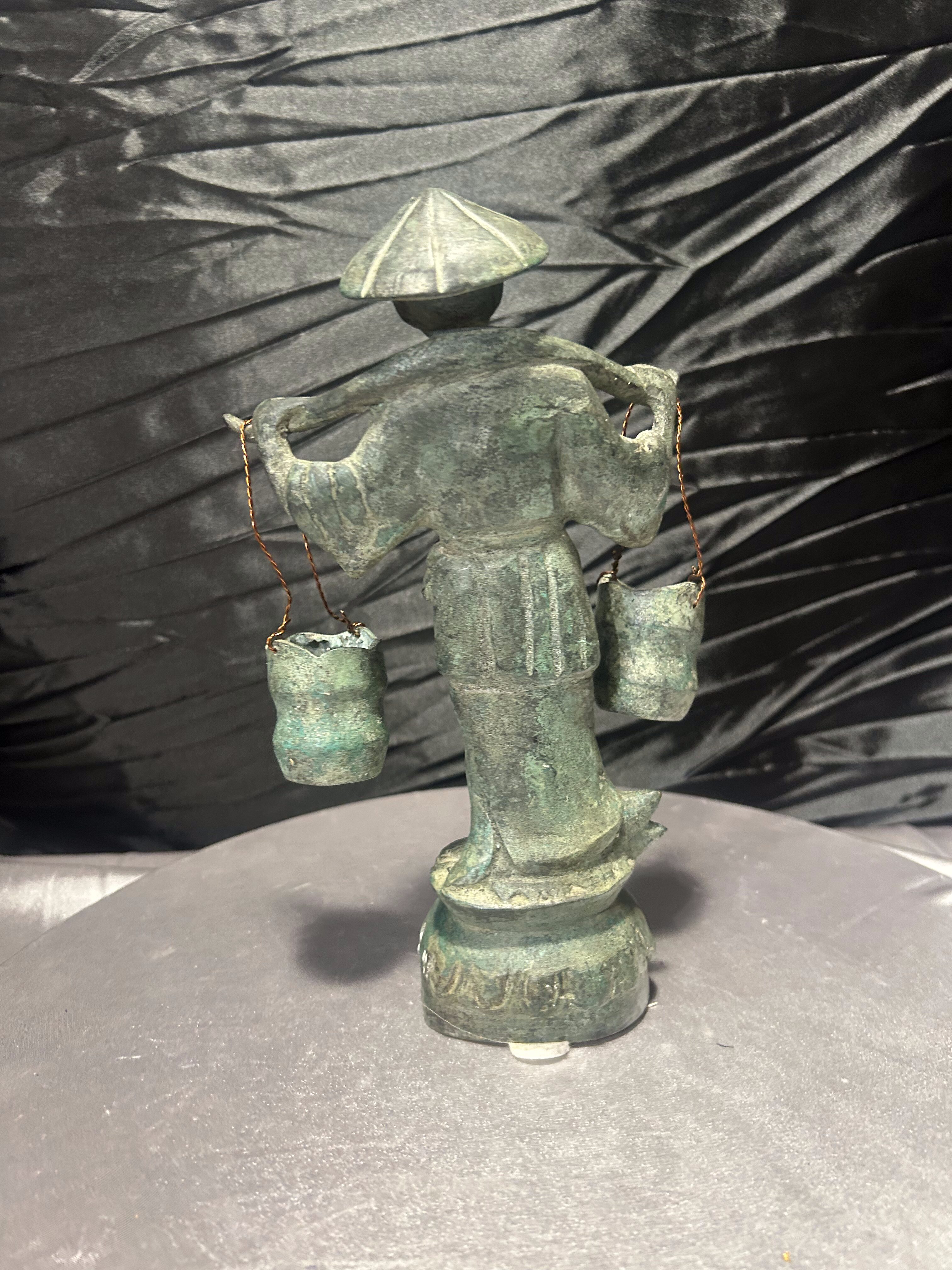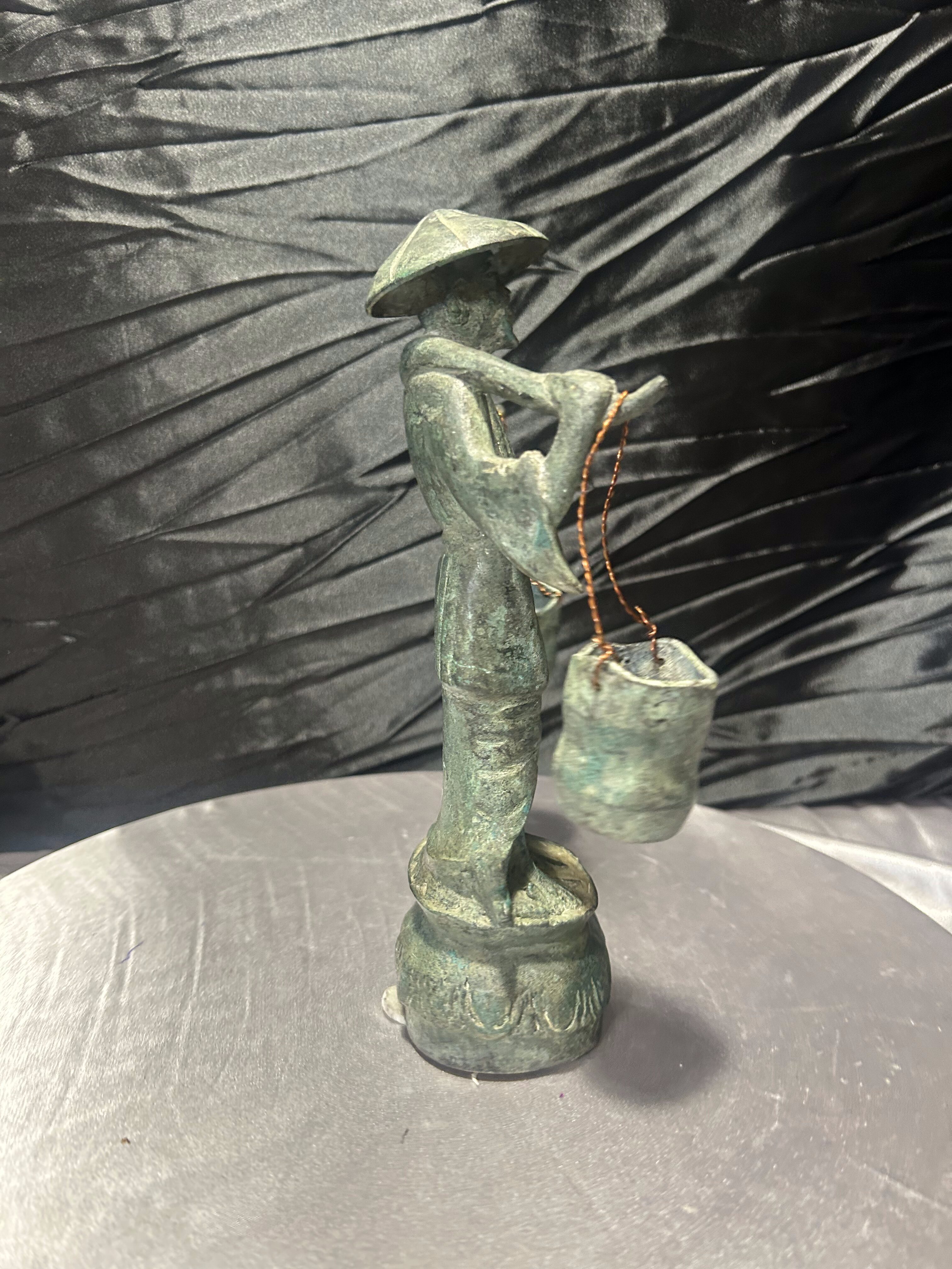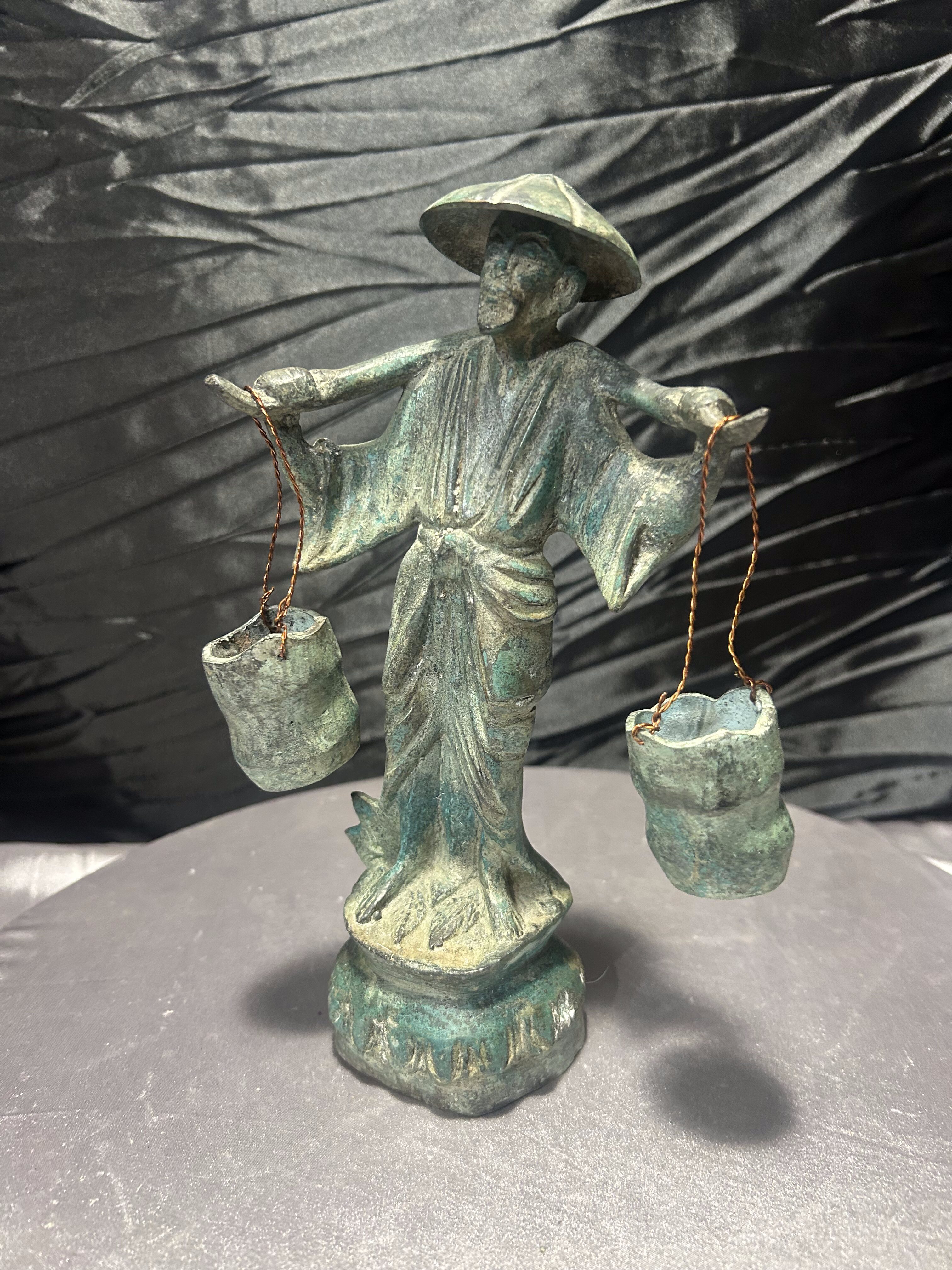 Rzeźba Azjata z cebrzykami – mosiądz z patyną – styl orientalny