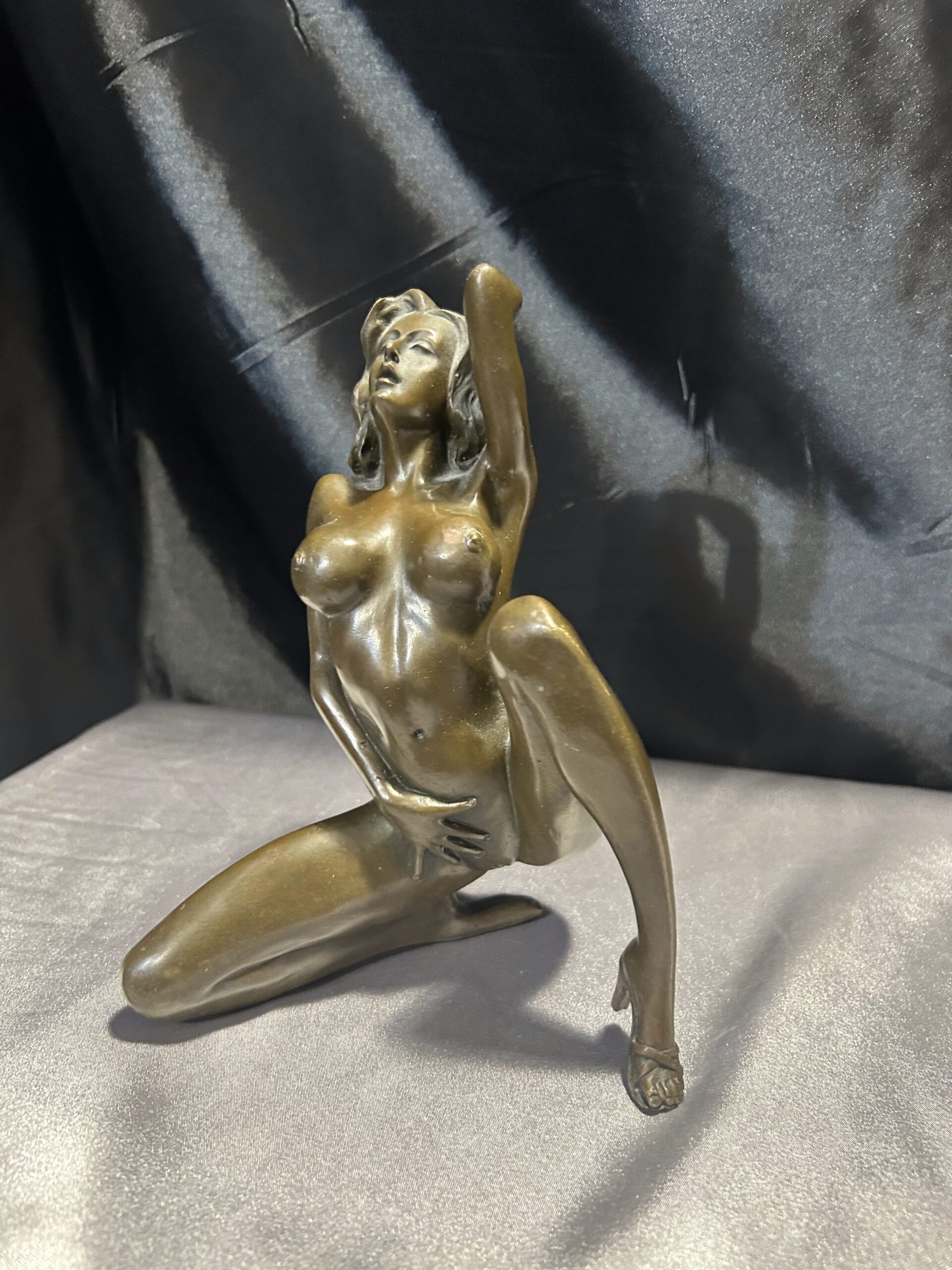 Wyjątkowa rzeźba z brązu przedstawiająca realistyczny akt kobiety klęczącej na jednym kolanie. Niezwykły detal w postaci tylko jednego buta nadaje rzeźbie intrygującego charakteru. Wykonana z precyzją i dbałością o szczegóły, rzeźba jest sygnowana: M. NICK, co potwierdza jej autentyczność i artystyczną wartość.