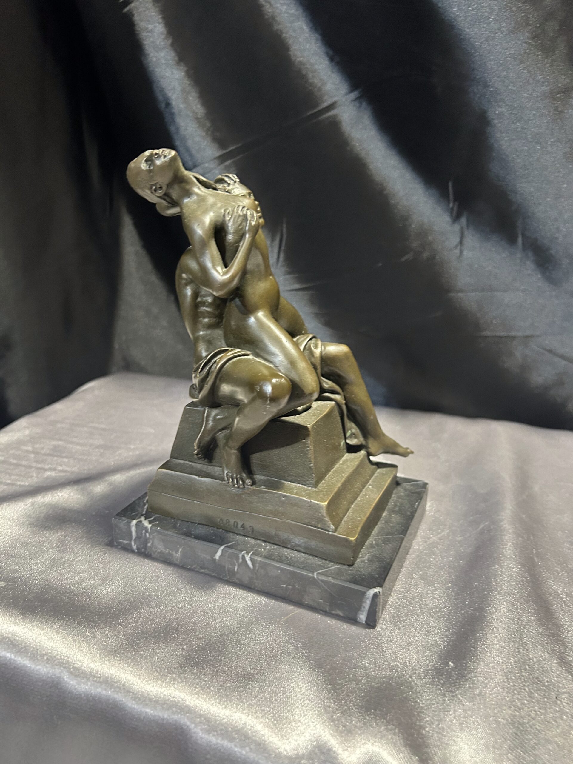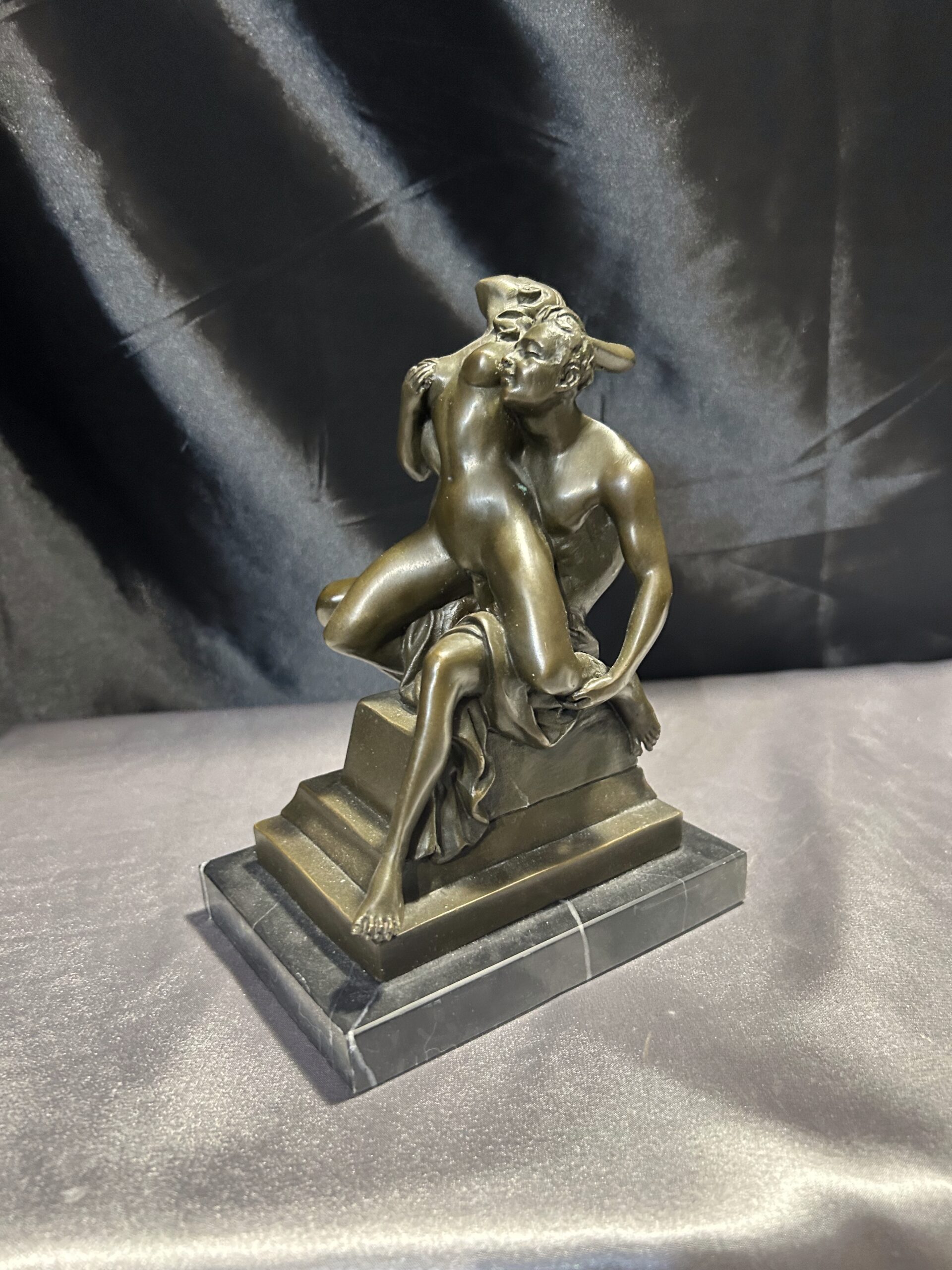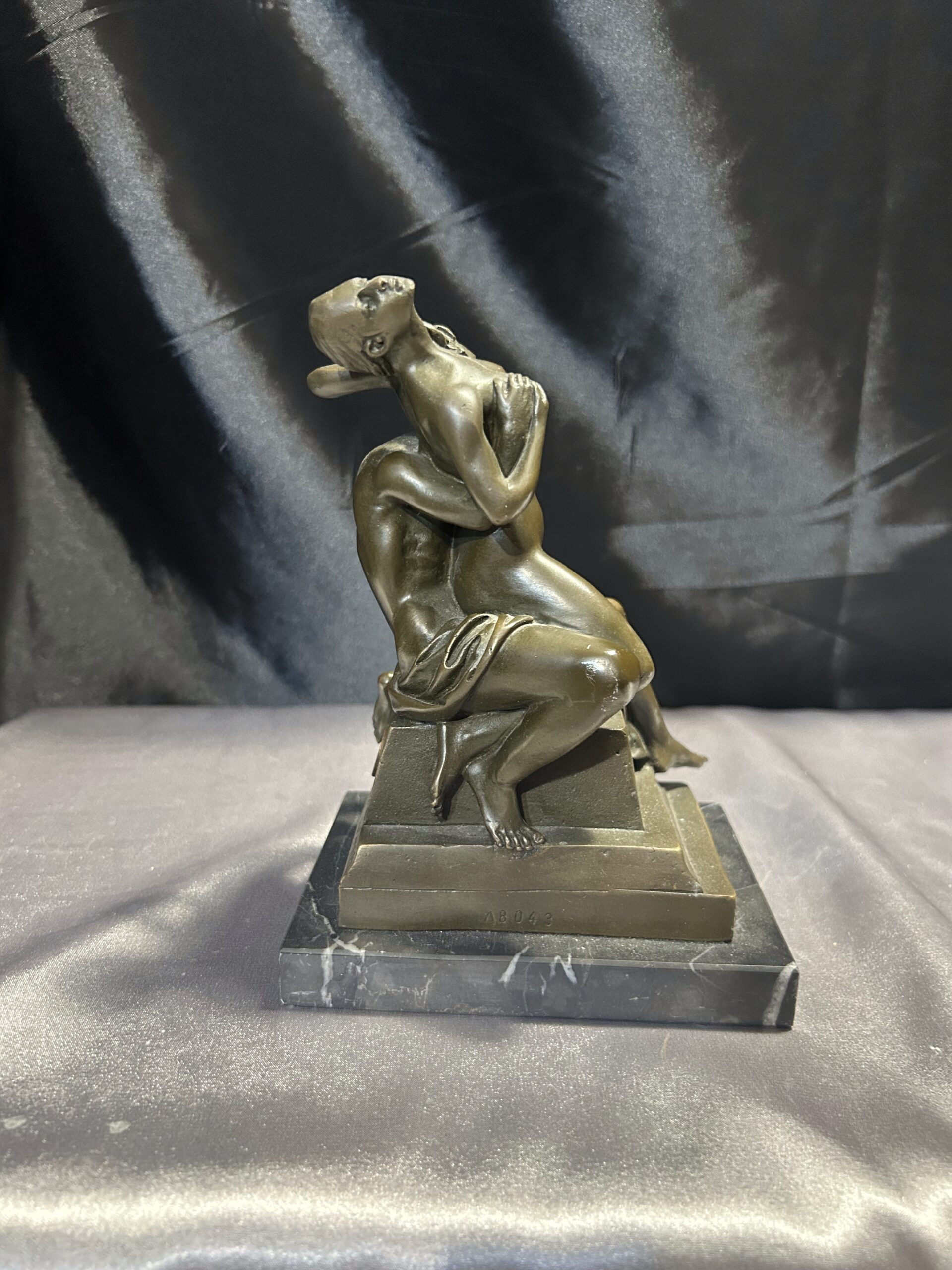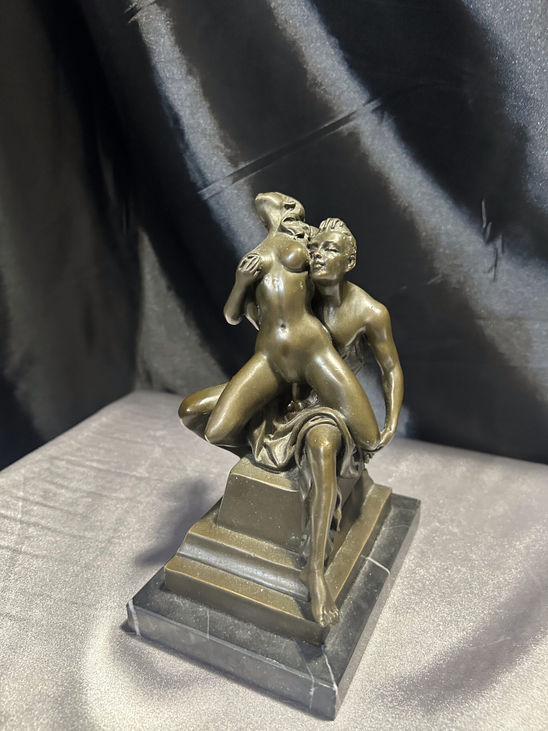 Elegancka rzeźba z brązu przedstawiająca realistyczny akt kobiety i mężczyzny w wyrafinowanej kompozycji. Osadzona na marmurowym, prostokątnym postumencie, dodaje całości solidności i klasycznego charakteru. Sygnowana: BORDS DE SEINE FONDERIE B. ZACH, co potwierdza jej autentyczność i wyjątkową wartość artystyczną.