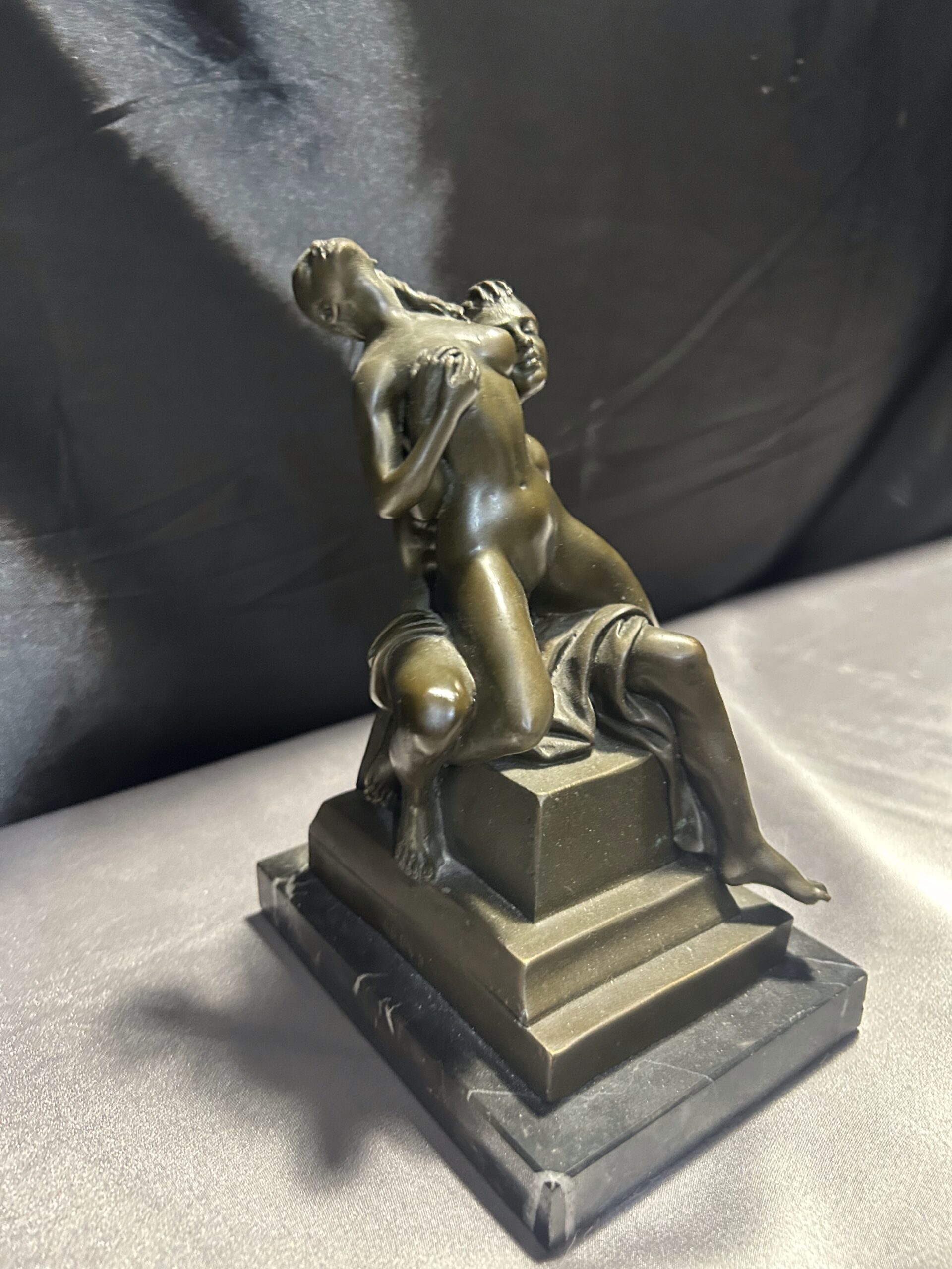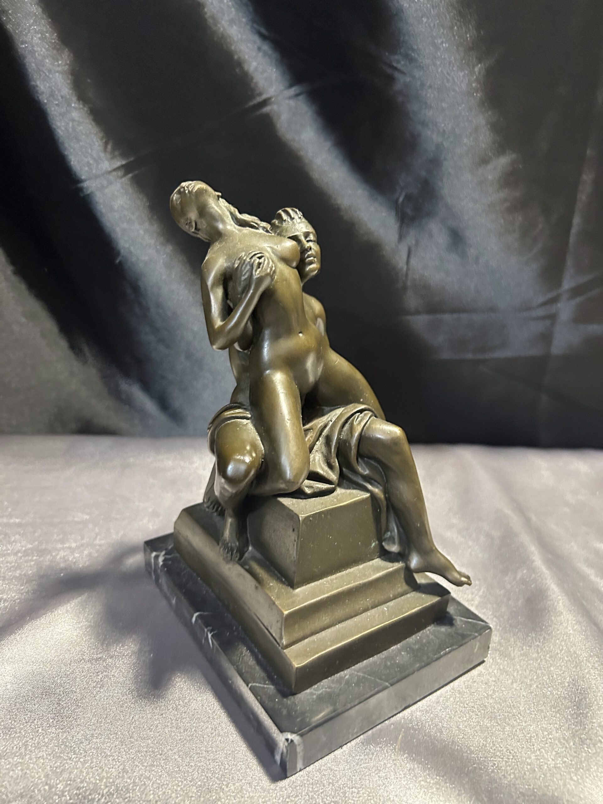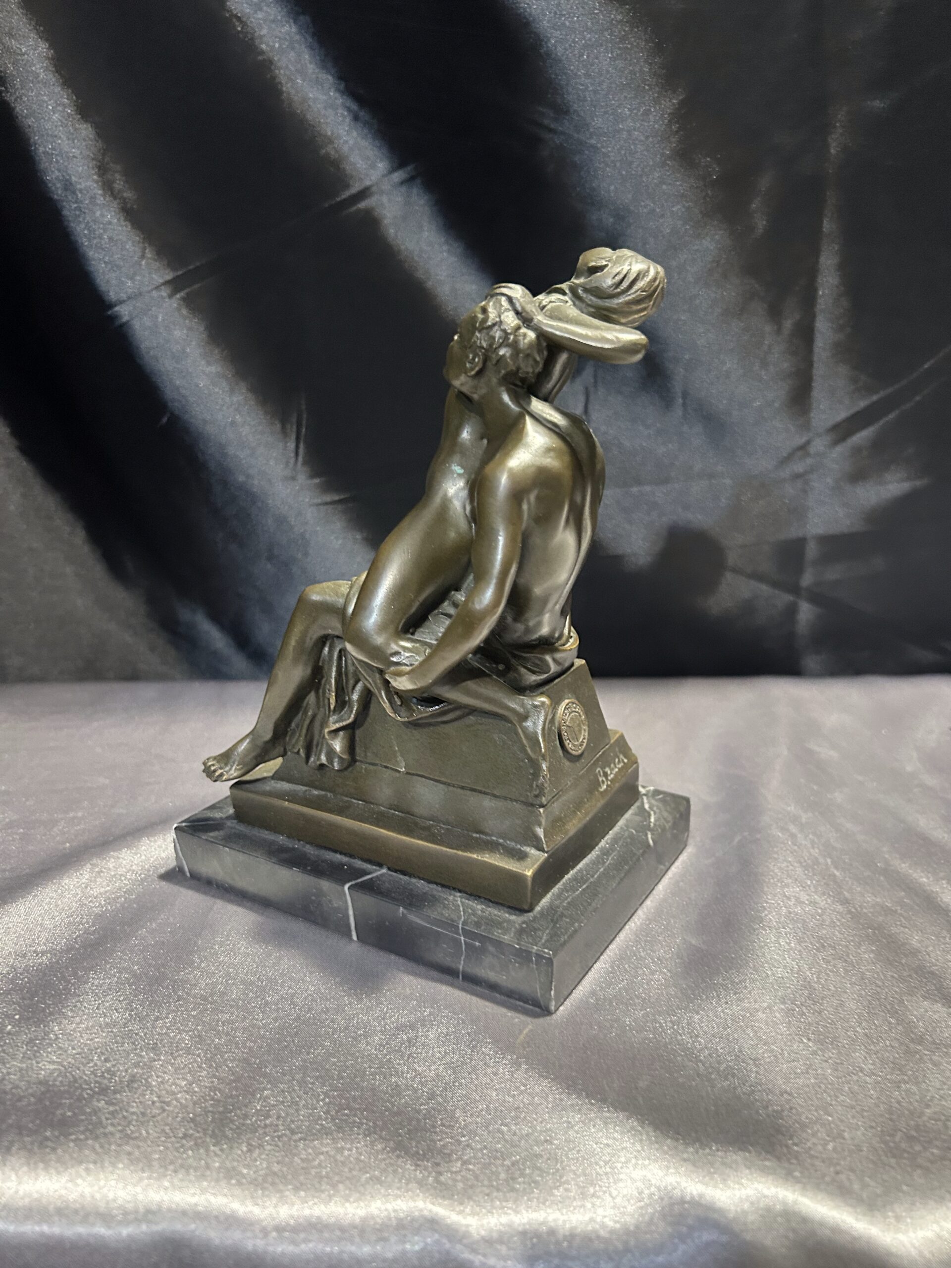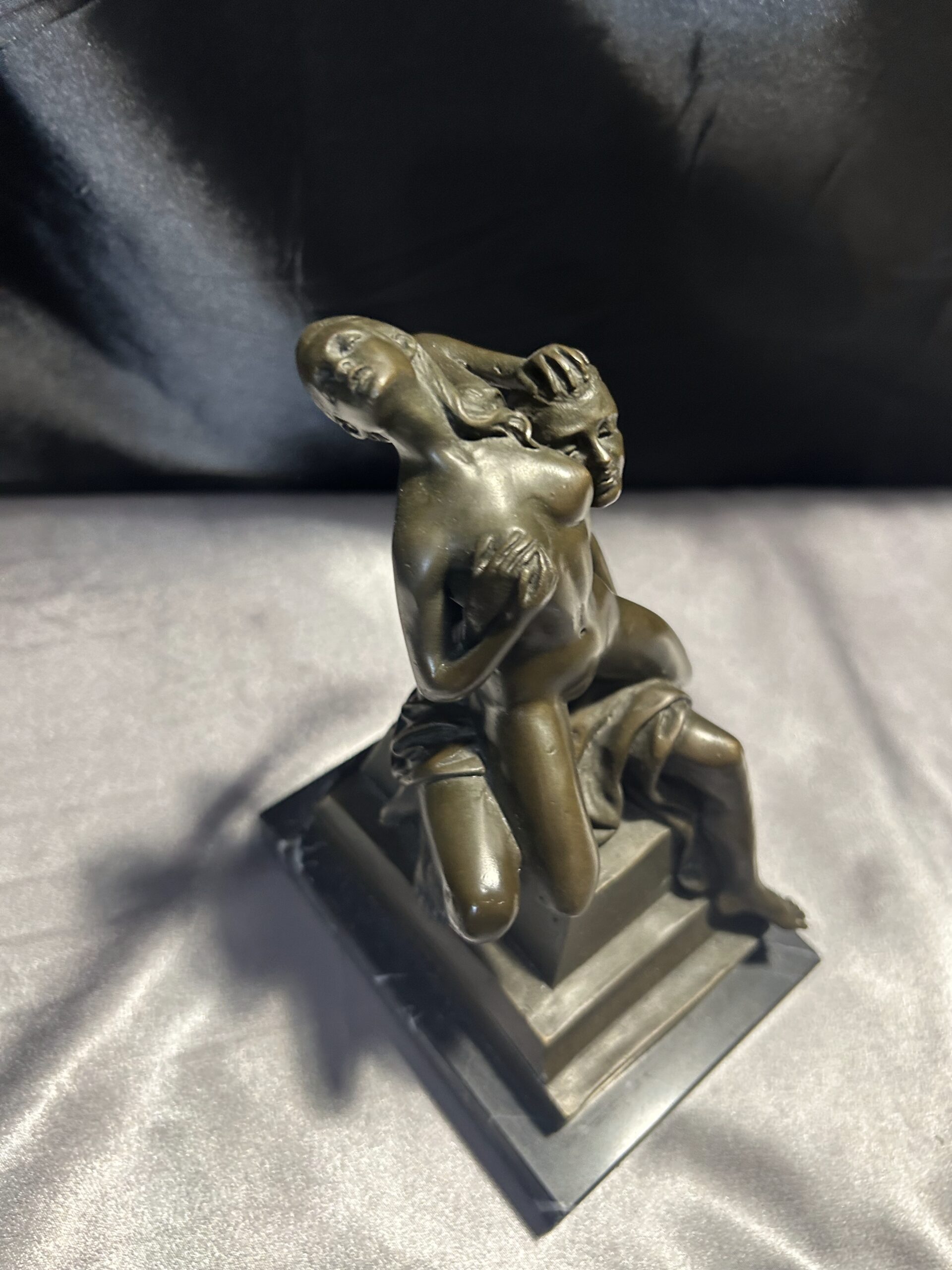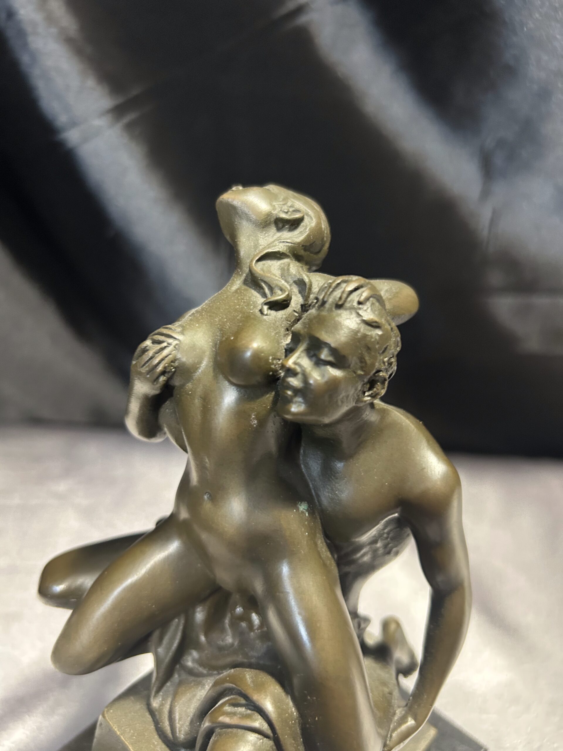 Elegancka rzeźba z brązu przedstawiająca realistyczny akt kobiety i mężczyzny w wyrafinowanej kompozycji. Osadzona na marmurowym, prostokątnym postumencie, dodaje całości solidności i klasycznego charakteru. Sygnowana: BORDS DE SEINE FONDERIE B. ZACH, co potwierdza jej autentyczność i wyjątkową wartość artystyczną.