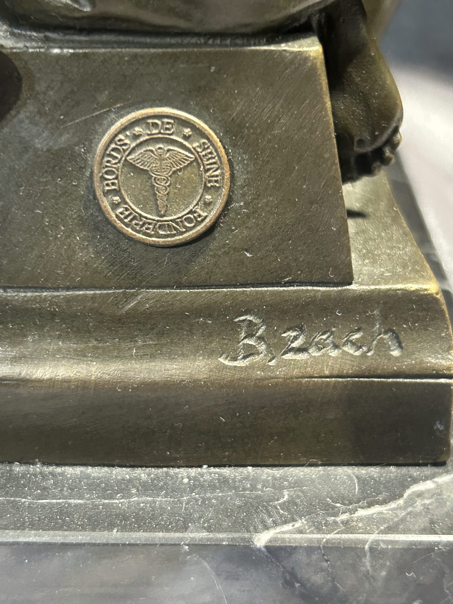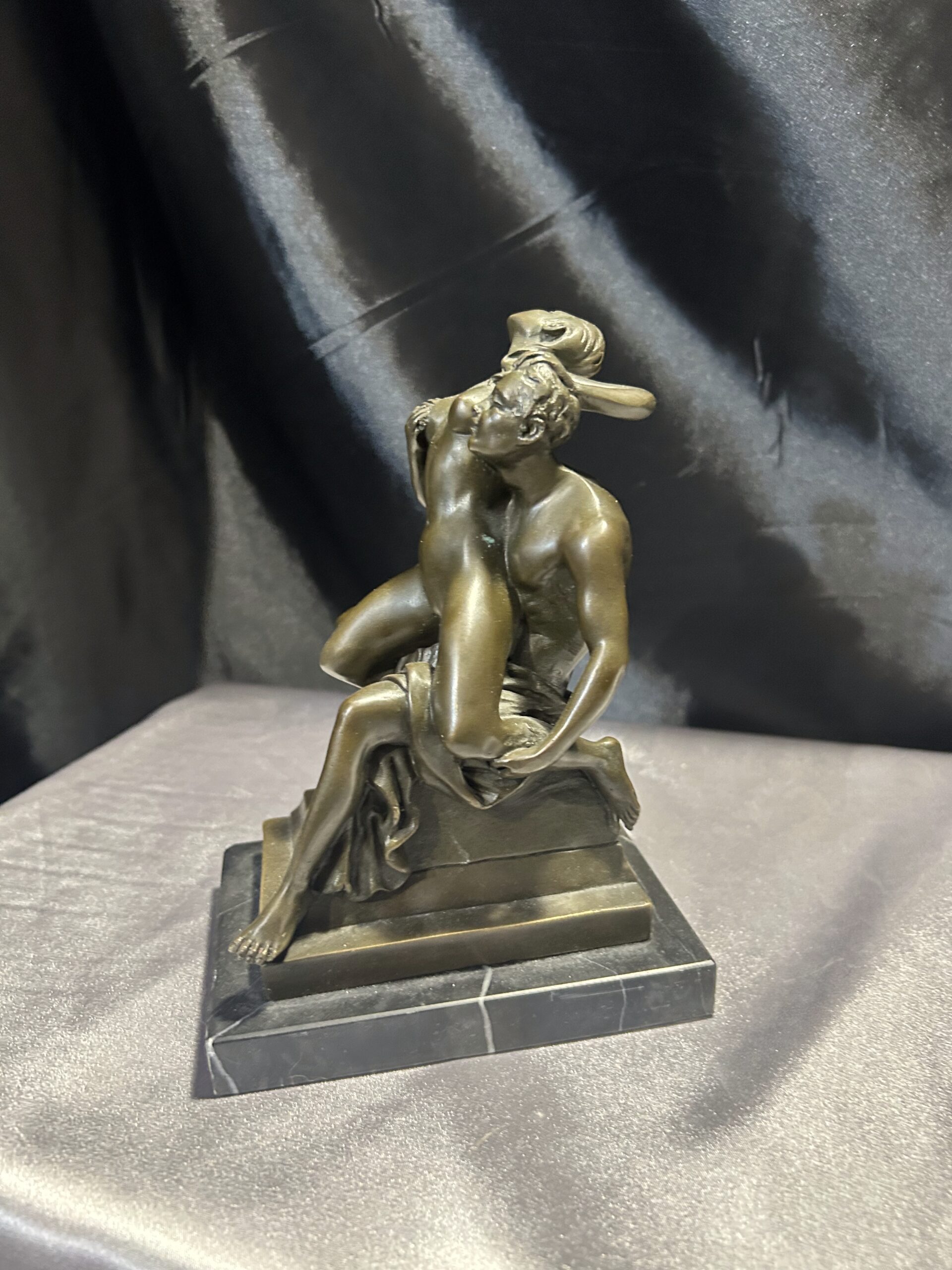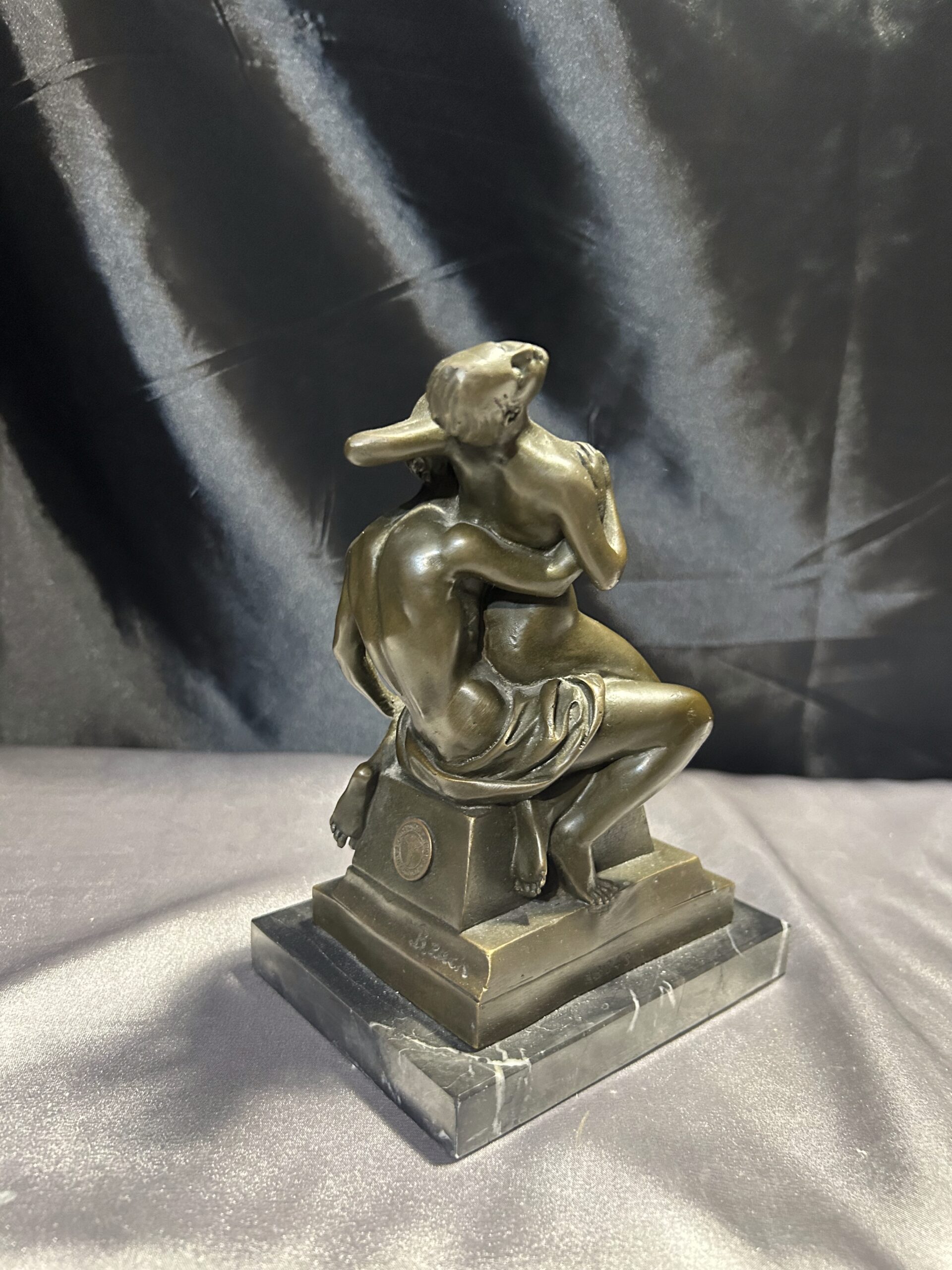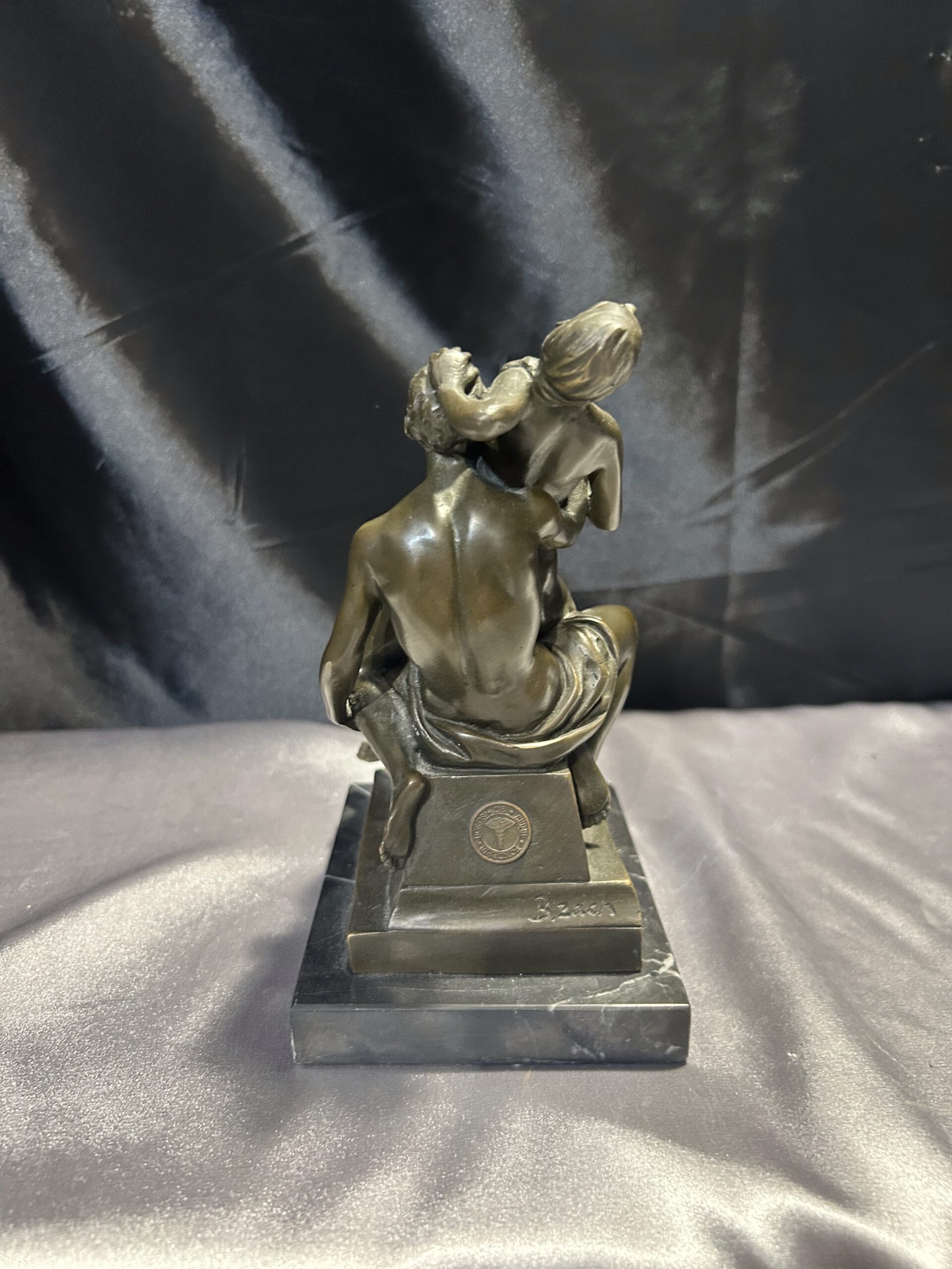 Elegancka rzeźba z brązu przedstawiająca realistyczny akt kobiety i mężczyzny w wyrafinowanej kompozycji. Osadzona na marmurowym, prostokątnym postumencie, dodaje całości solidności i klasycznego charakteru. Sygnowana: BORDS DE SEINE FONDERIE B. ZACH, co potwierdza jej autentyczność i wyjątkową wartość artystyczną.