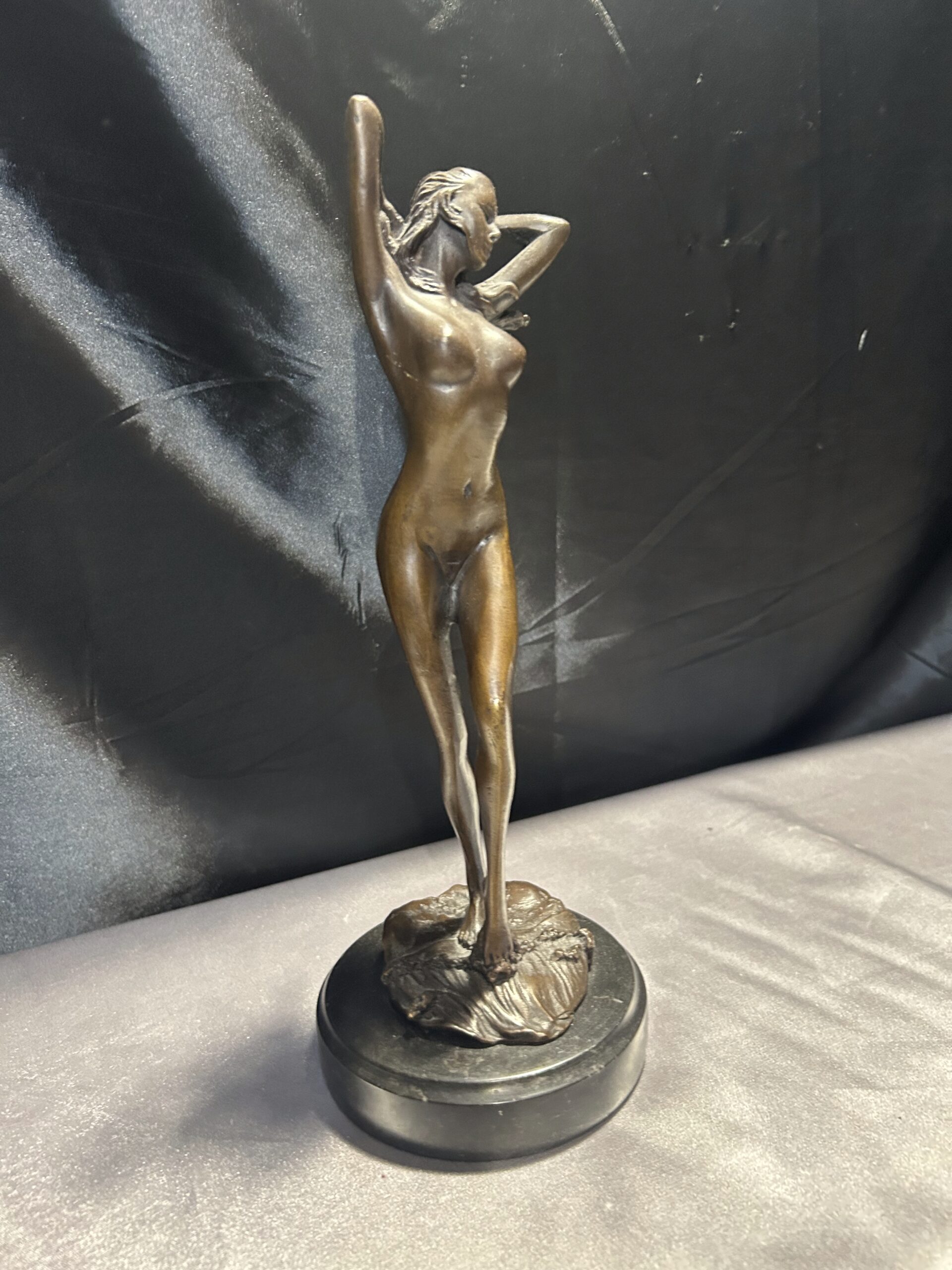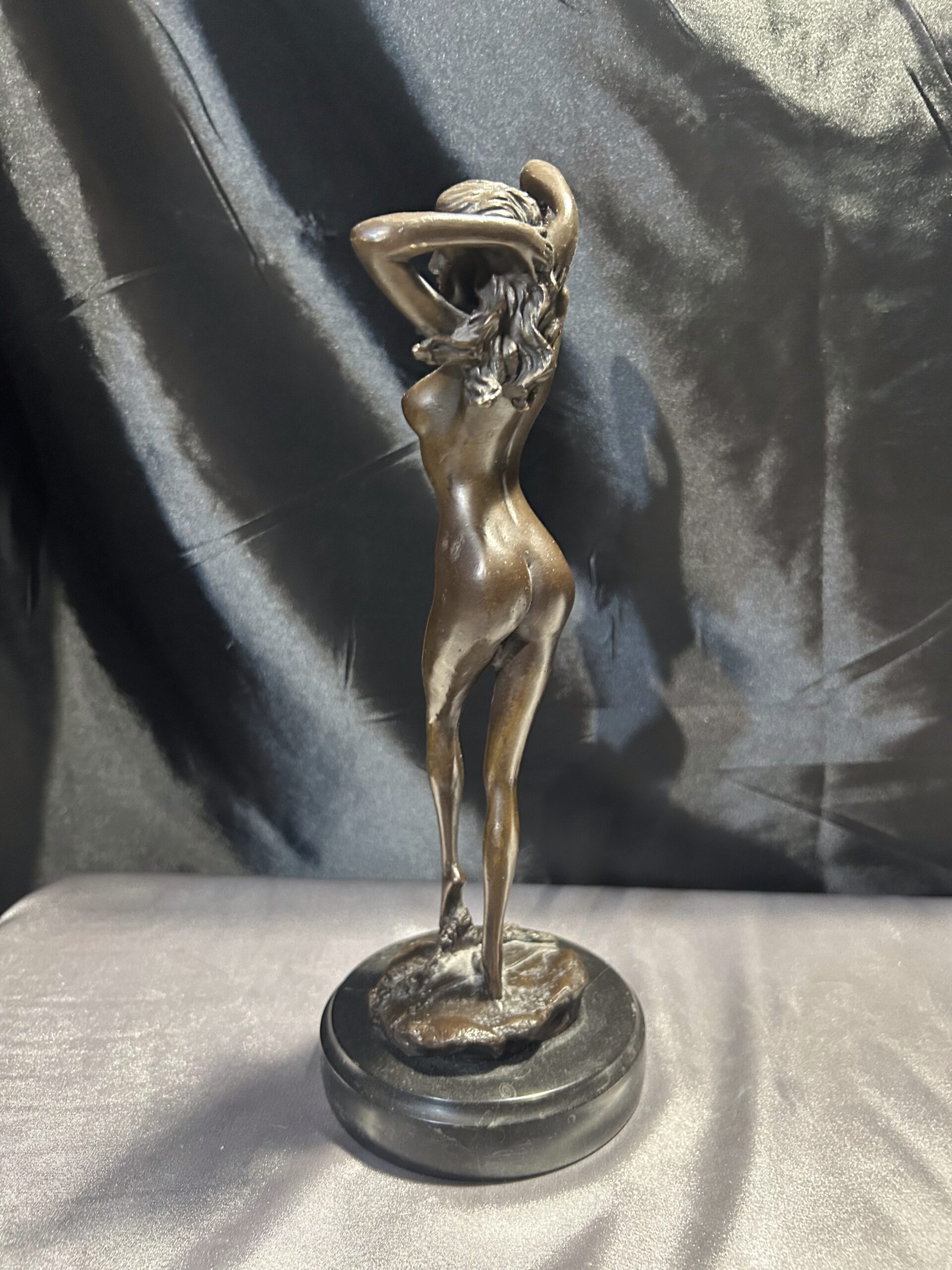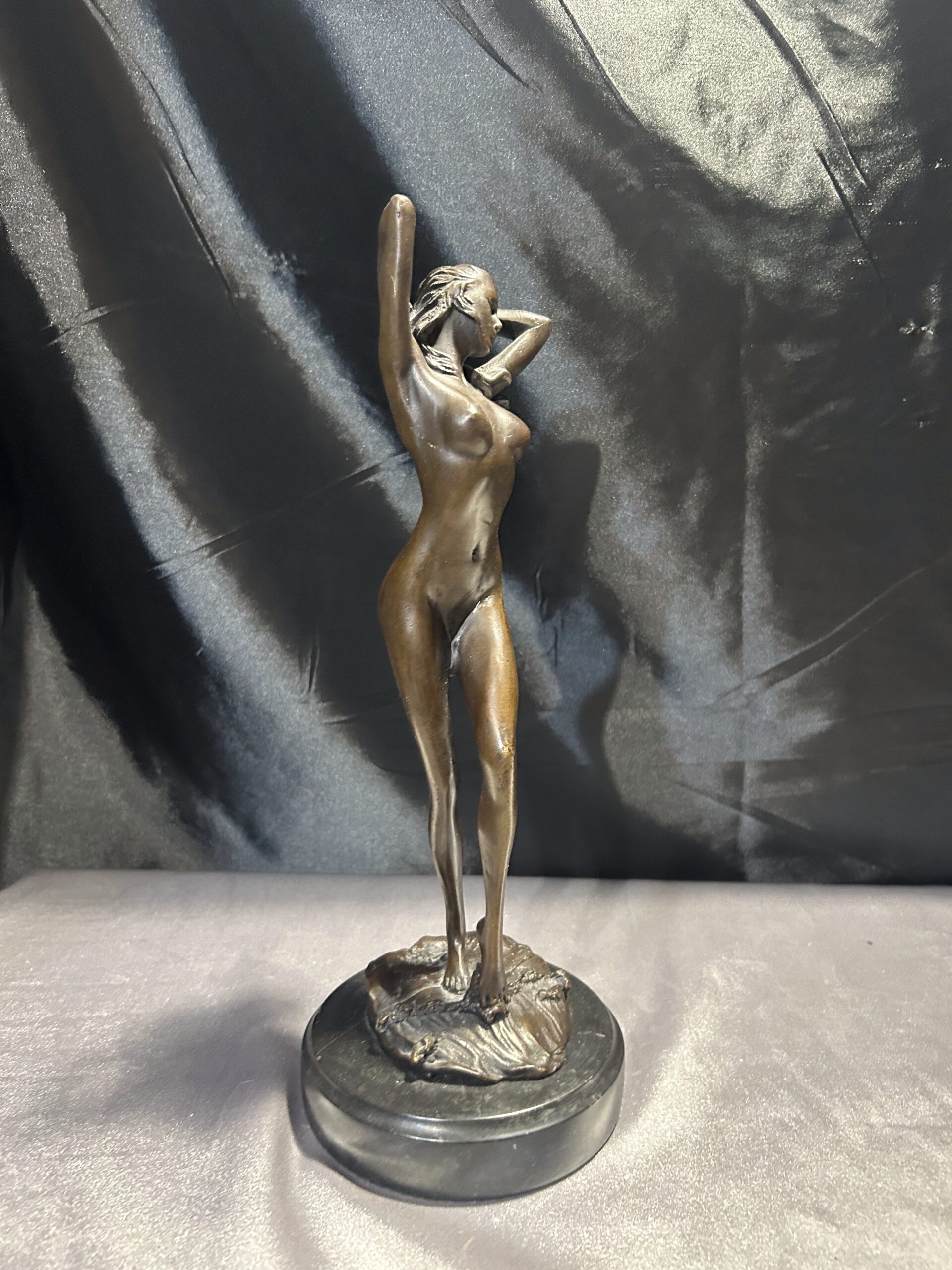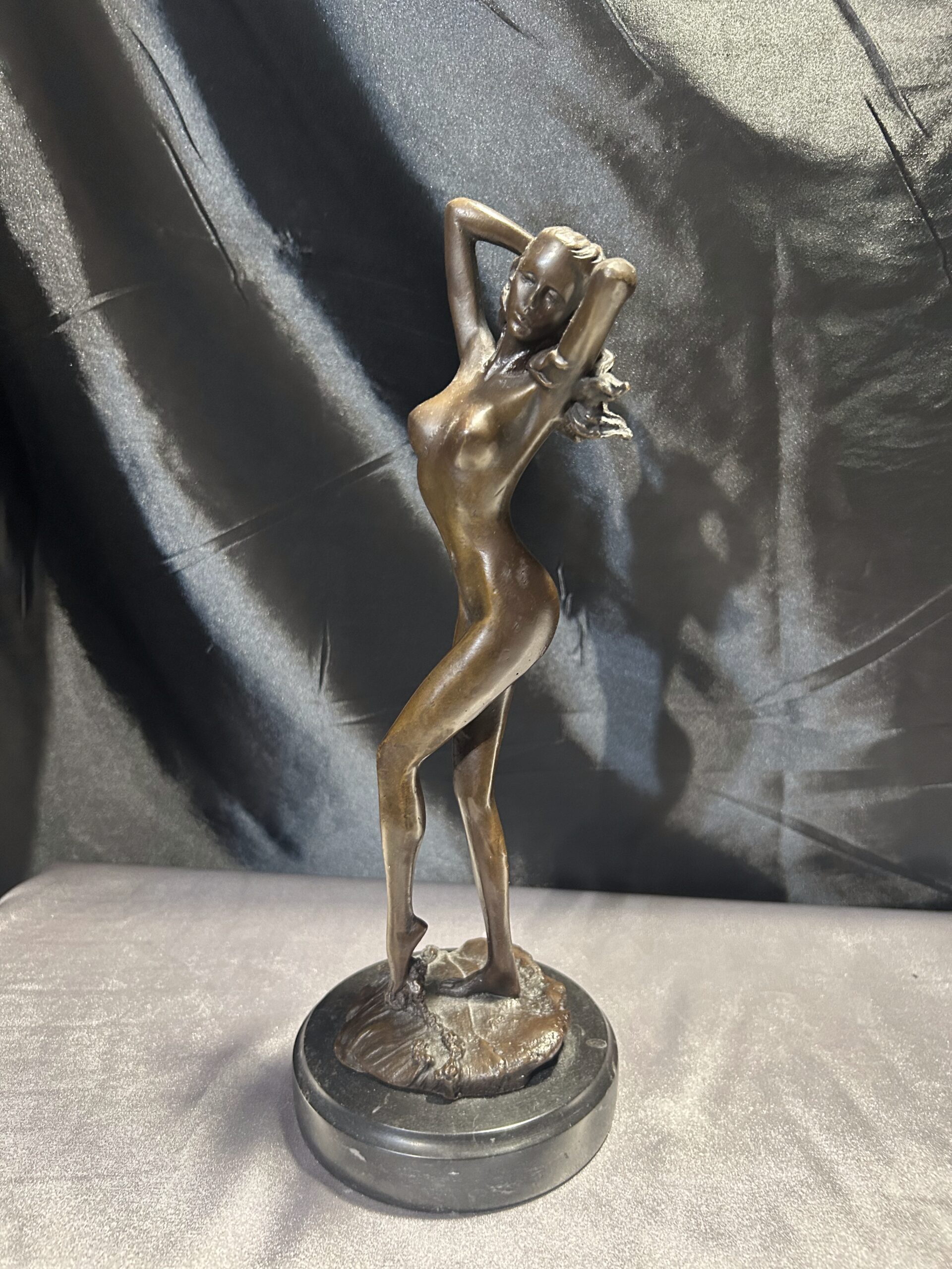 Elegancka rzeźba wykonana z brązu, przedstawiająca stojącą kobietę z rękami we włosach. Realistyczne detale, takie jak fala obmywająca stopę, nadają dziełu dynamizmu i artystycznego wyrazu. Rzeźba osadzona na solidnym, okrągłym postumencie. Sygnowana: PHILLI 8 CK, co podkreśla jej autentyczność i wartość artystyczną.