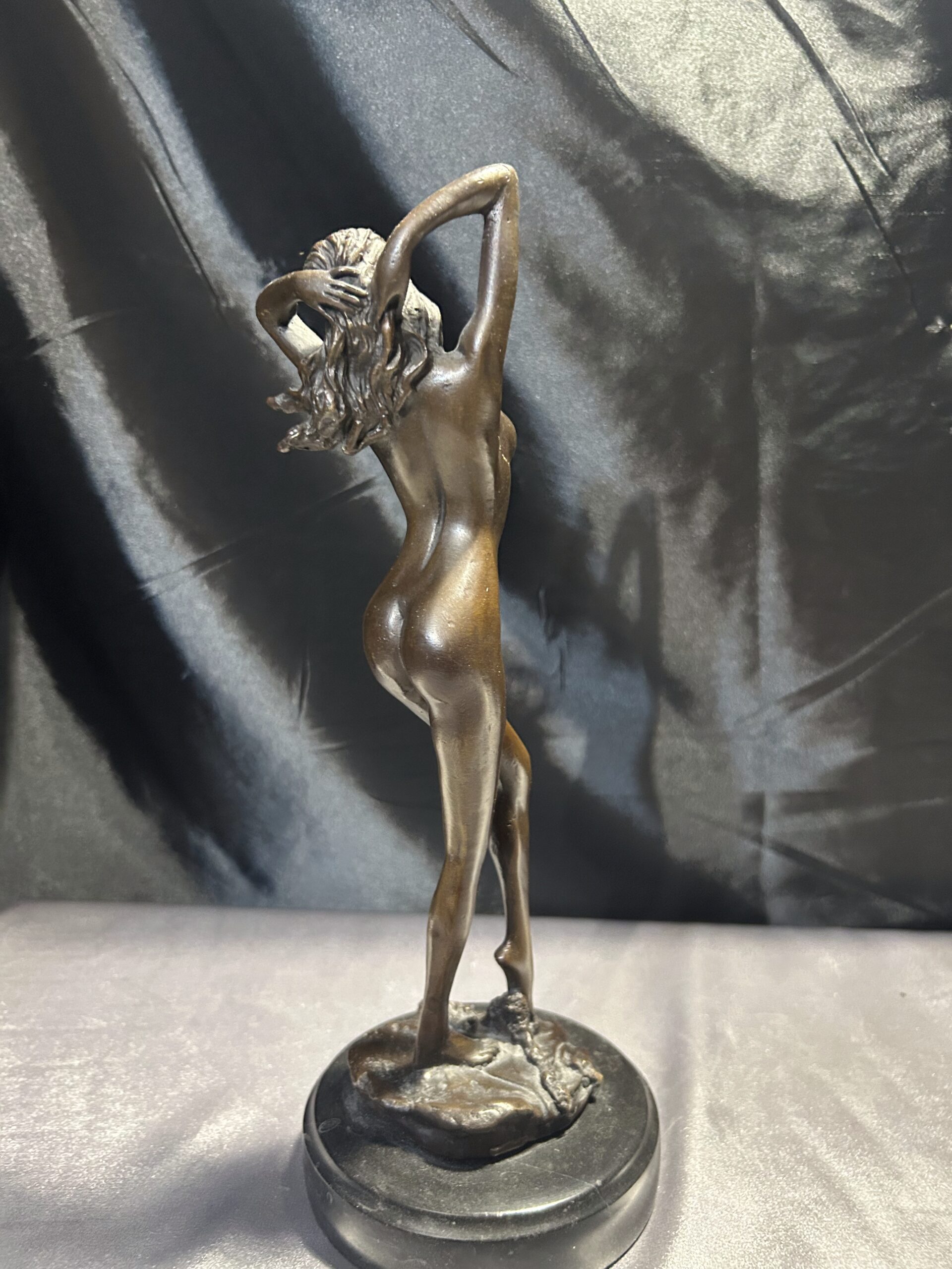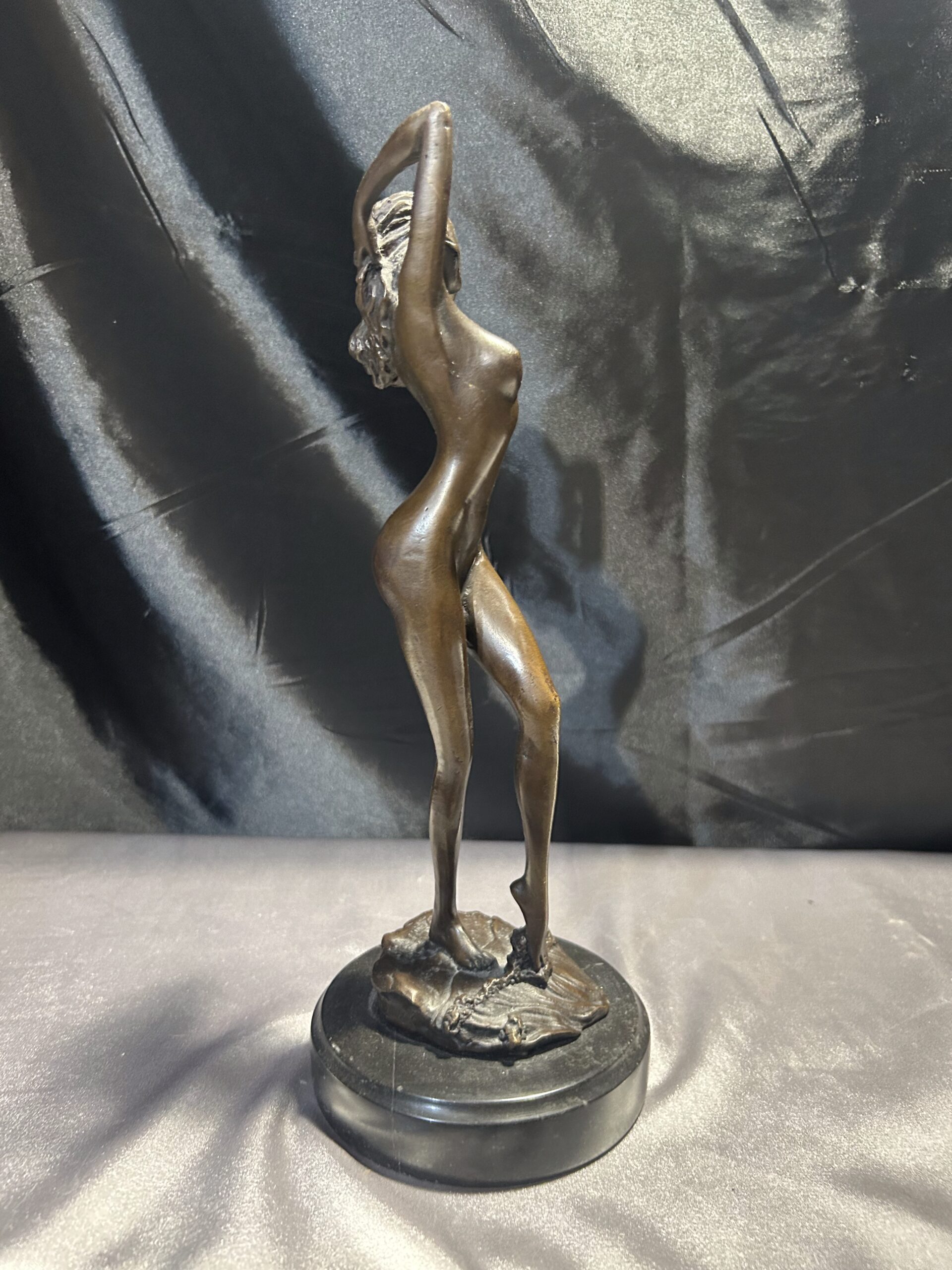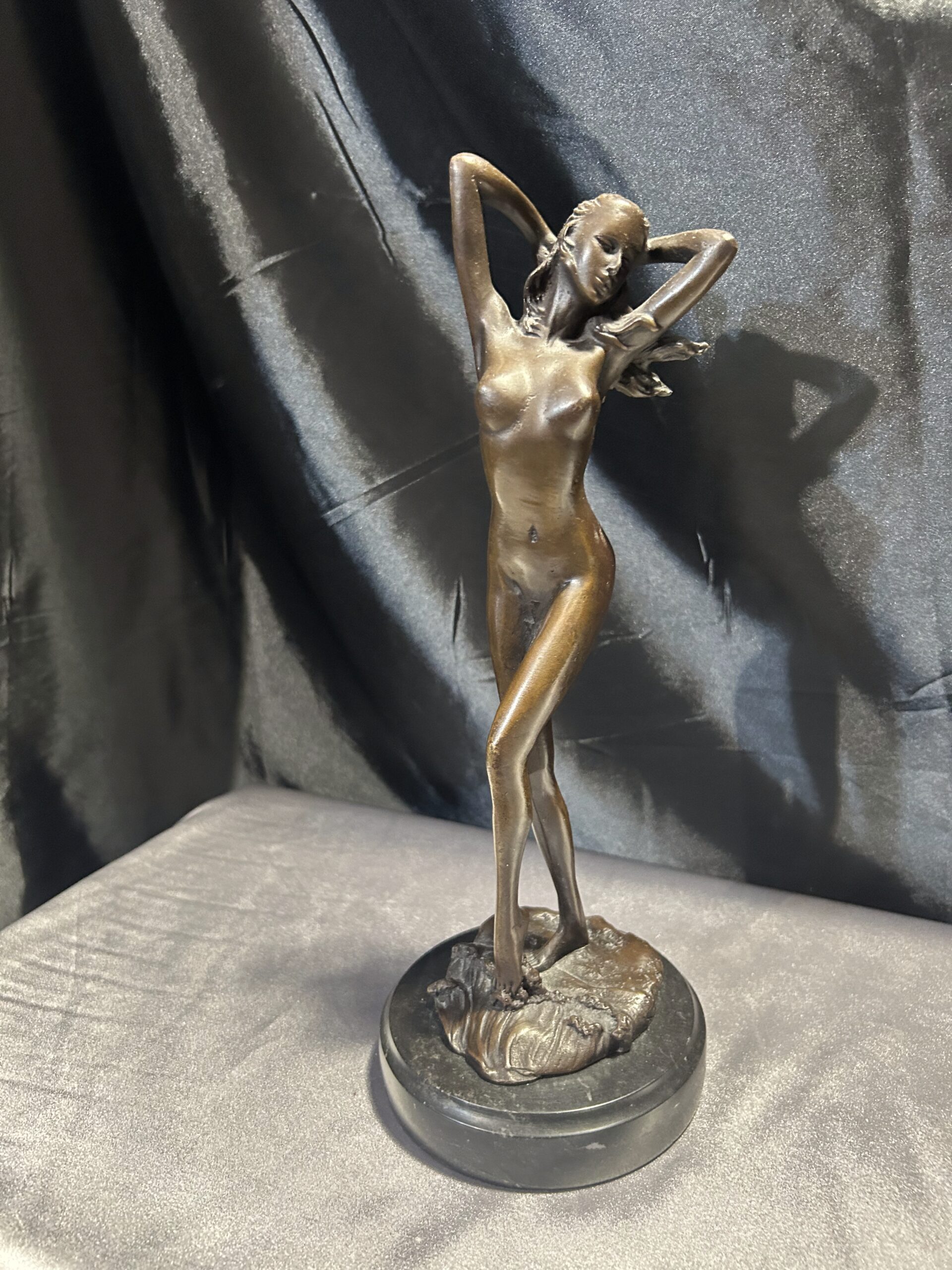 Elegancka rzeźba wykonana z brązu, przedstawiająca stojącą kobietę z rękami we włosach. Realistyczne detale, takie jak fala obmywająca stopę, nadają dziełu dynamizmu i artystycznego wyrazu. Rzeźba osadzona na solidnym, okrągłym postumencie. Sygnowana: PHILLI 8 CK, co podkreśla jej autentyczność i wartość artystyczną.