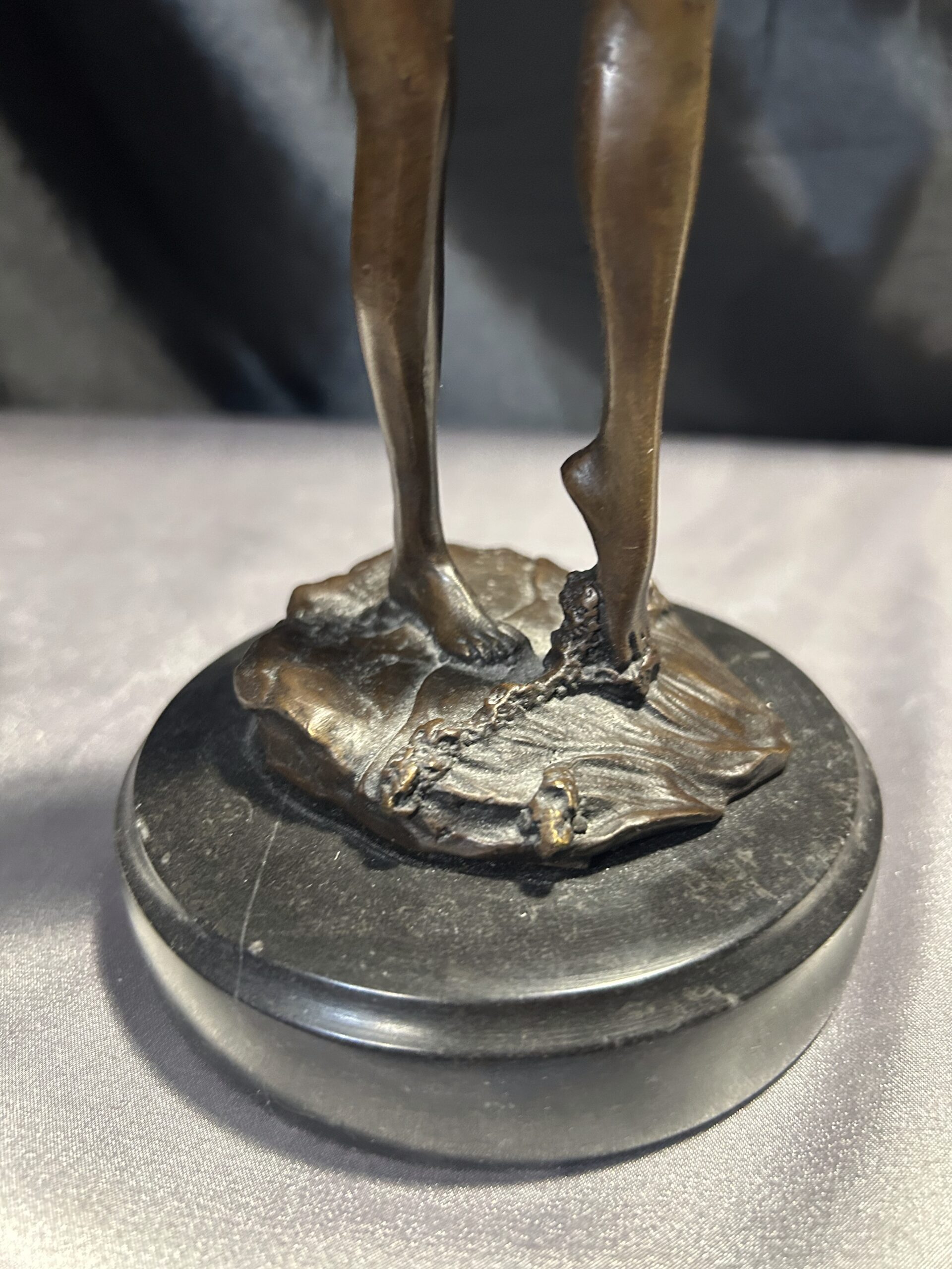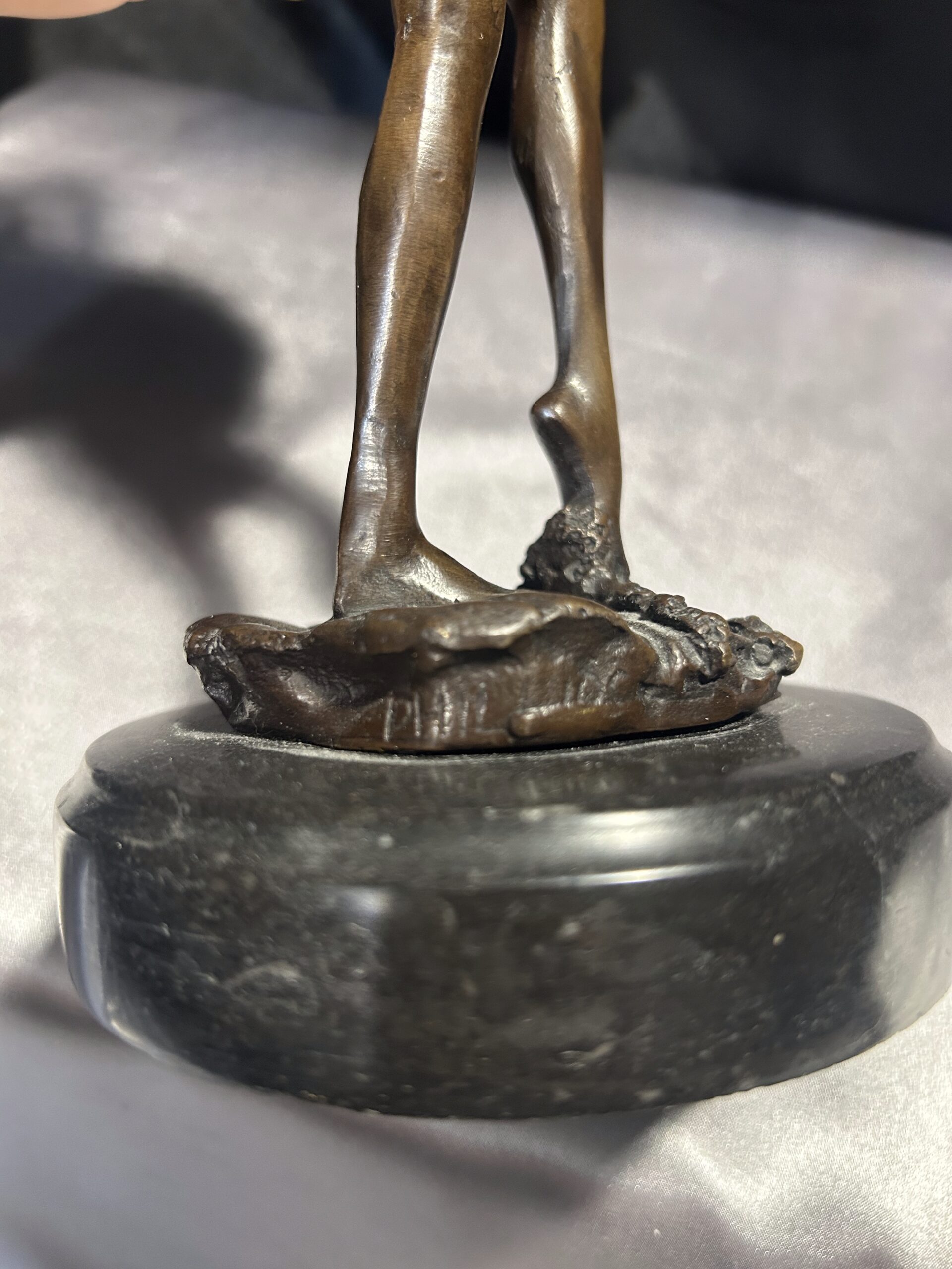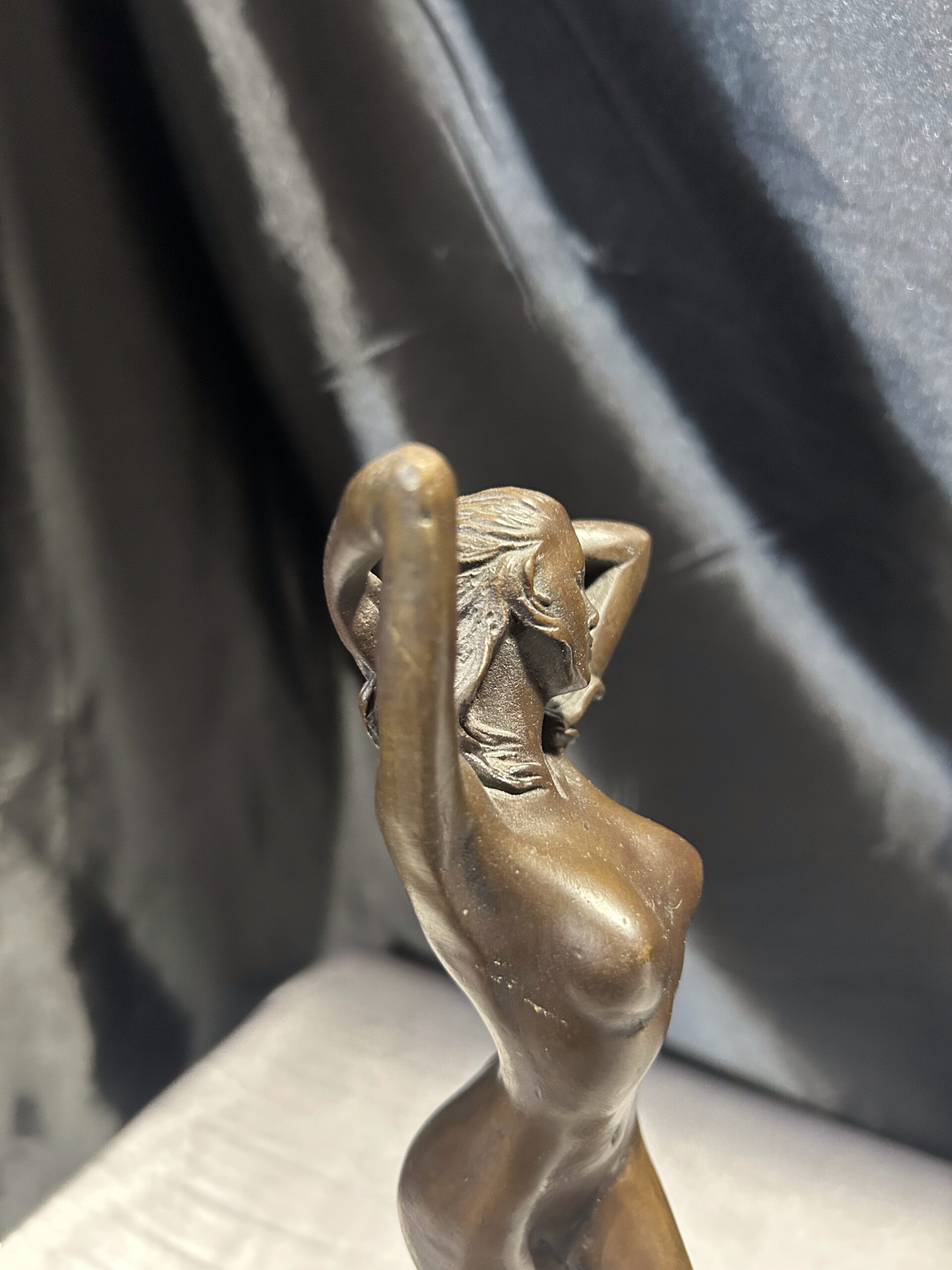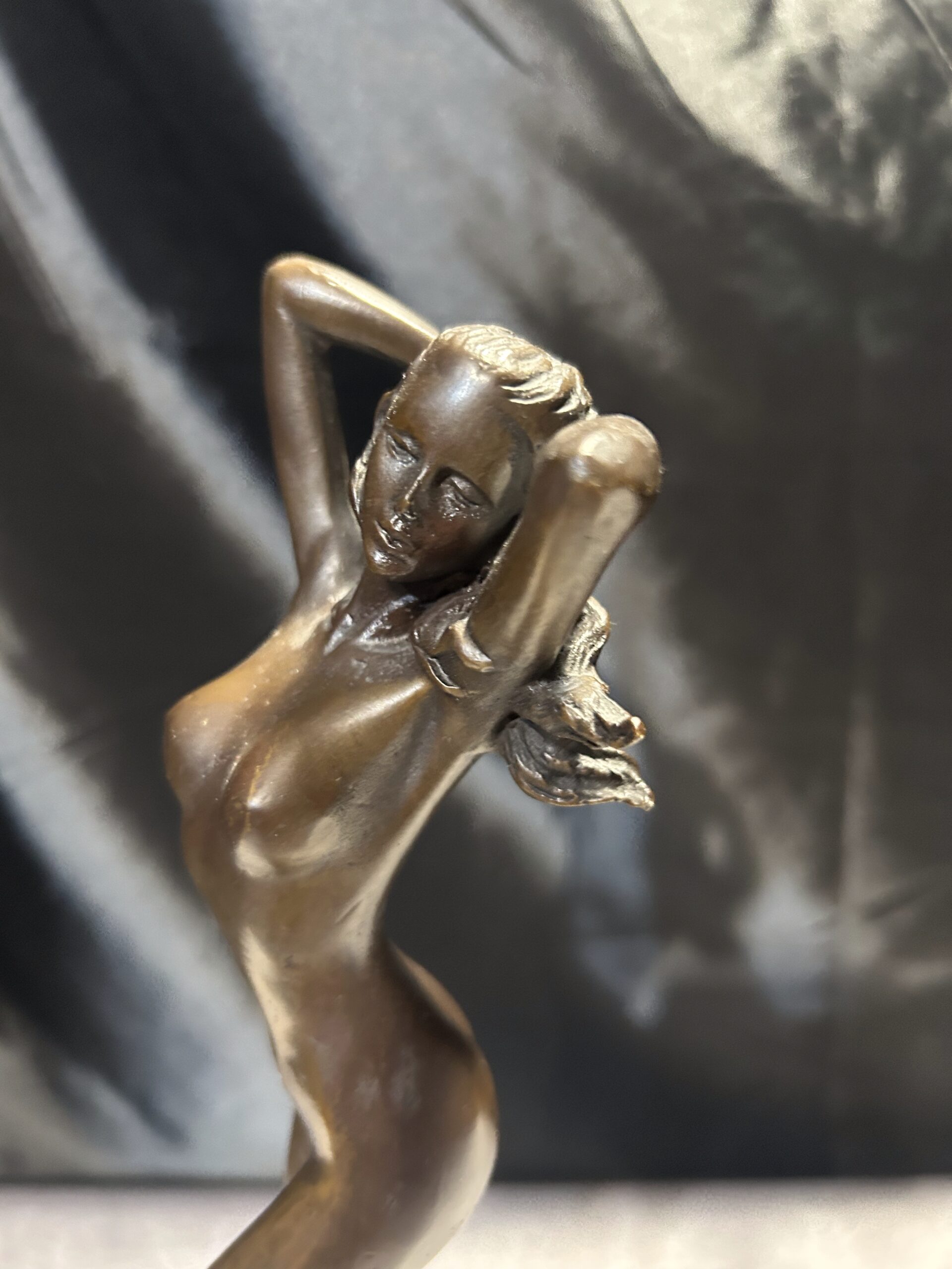 Elegancka rzeźba wykonana z brązu, przedstawiająca stojącą kobietę z rękami we włosach. Realistyczne detale, takie jak fala obmywająca stopę, nadają dziełu dynamizmu i artystycznego wyrazu. Rzeźba osadzona na solidnym, okrągłym postumencie. Sygnowana: PHILLI 8 CK, co podkreśla jej autentyczność i wartość artystyczną.
