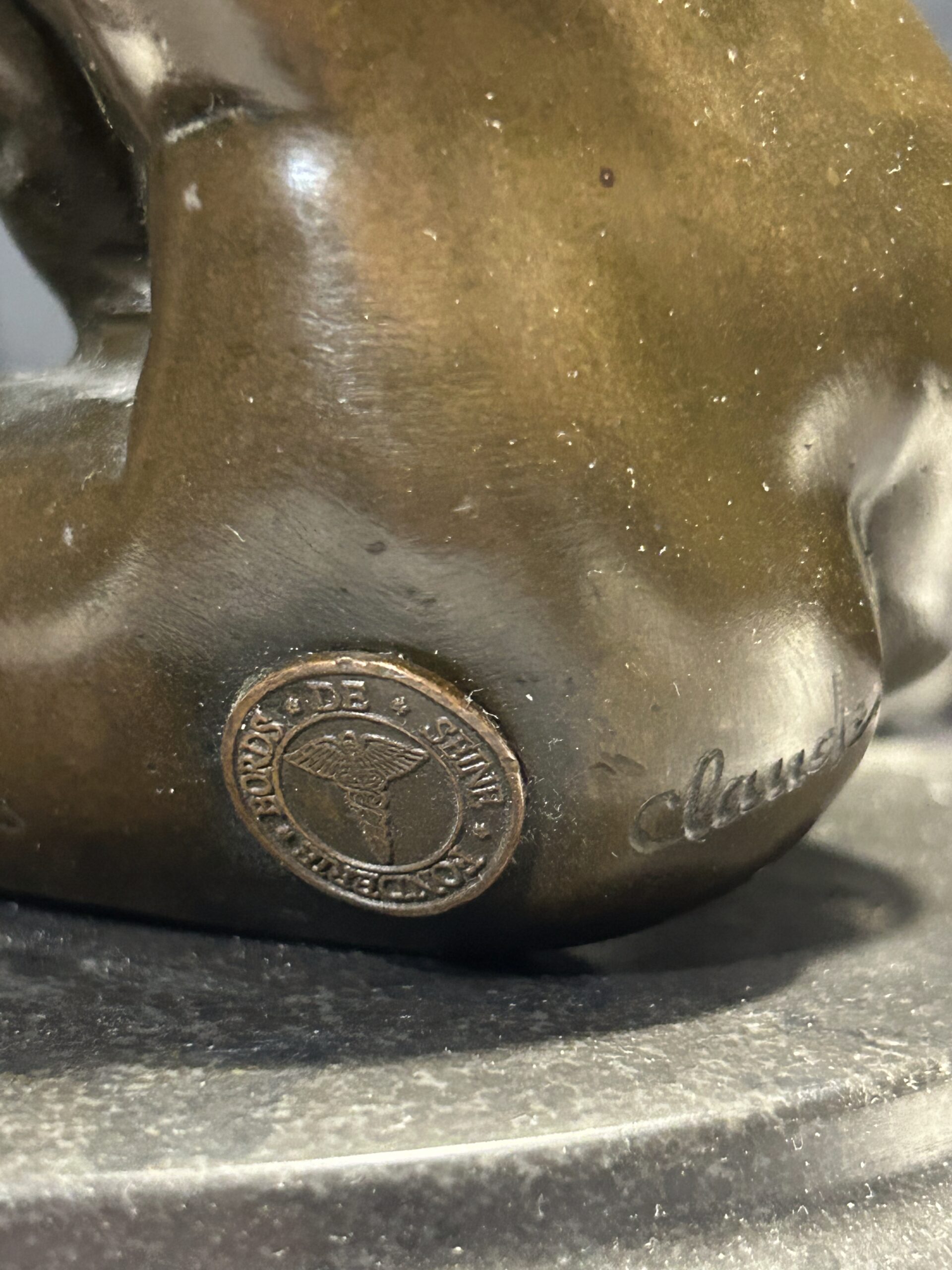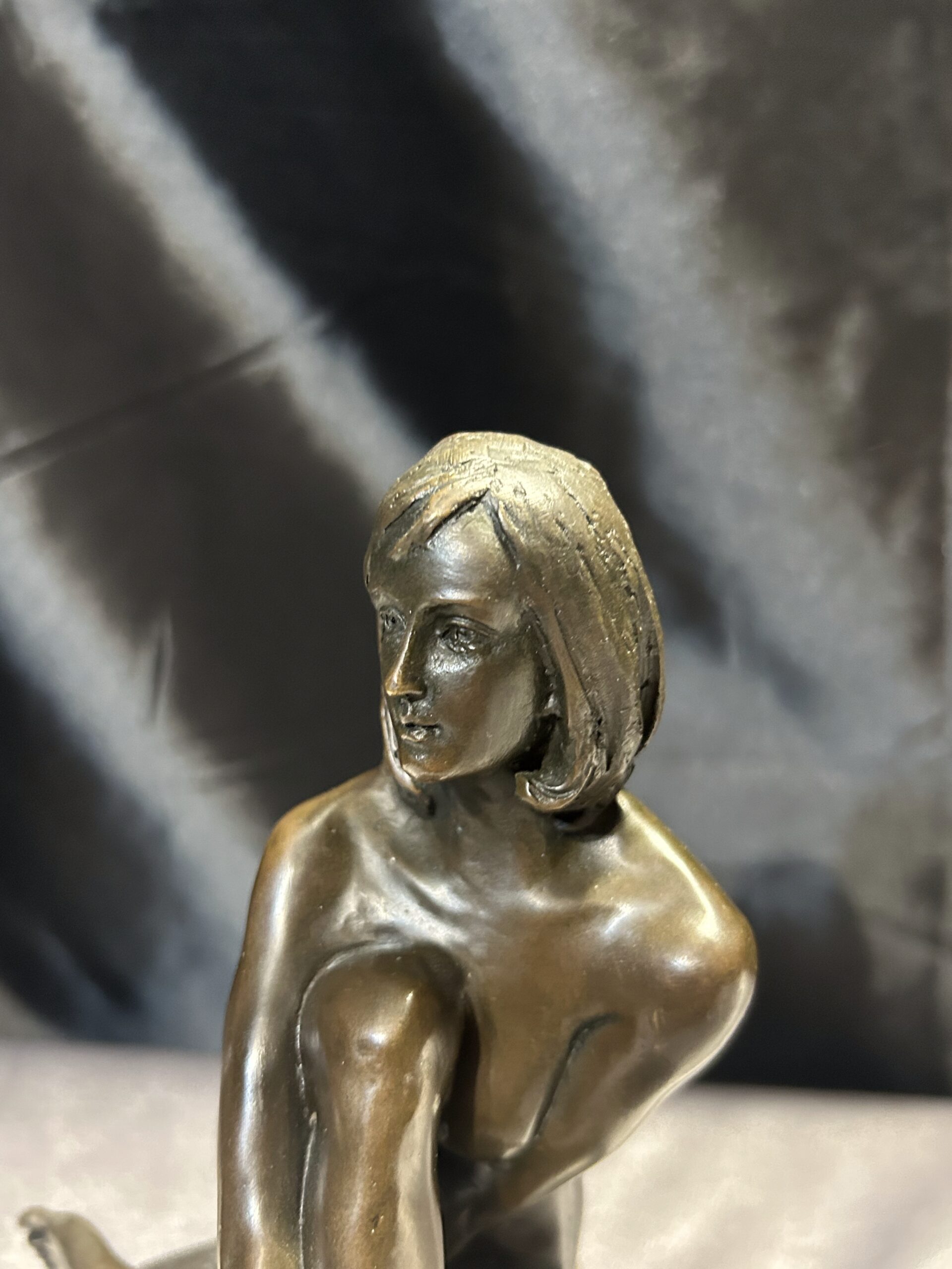 Wyjątkowa rzeźba z brązu przedstawiająca realistyczny akt kobiety w siedzącej pozie. Subtelne detale i staranne wykonanie nadają jej niezwykłej elegancji. Osadzona na okrągłym postumencie, stanowi prawdziwe dzieło sztuki. Sygnowana: BORDS DE SEINE FONDERTE CLAUDE, co podkreśla jej autentyczność i wartość artystyczną.