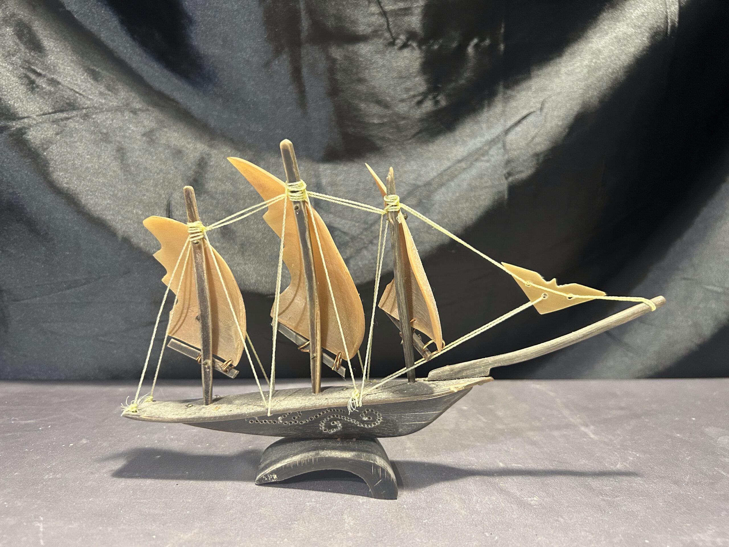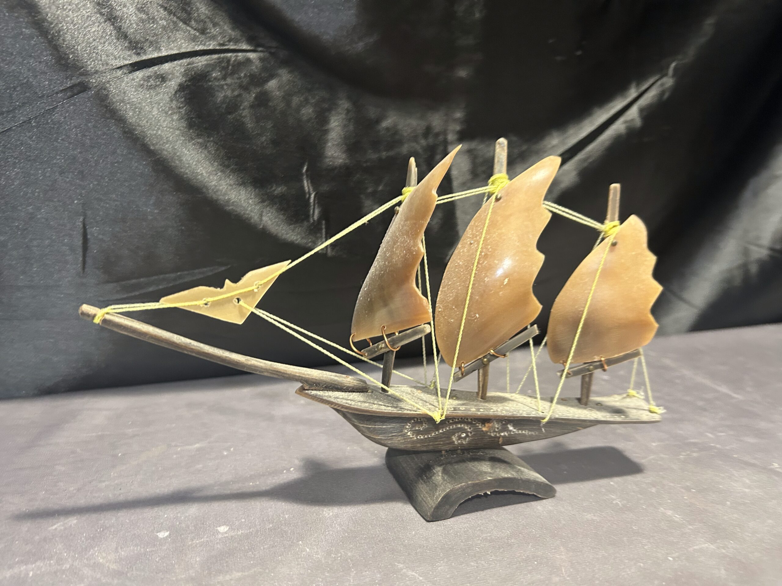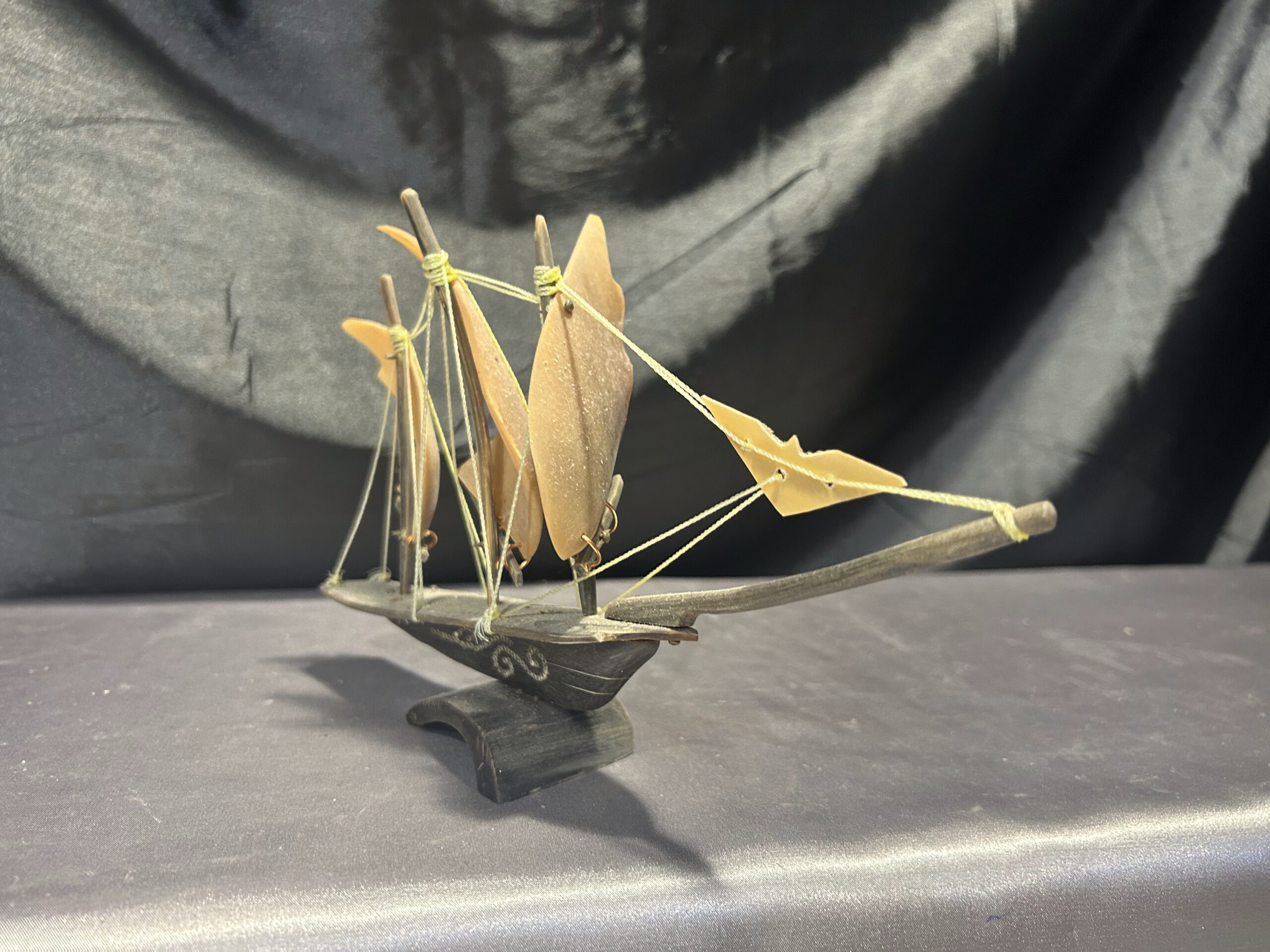 Rzeźbiony drewniany statek z żaglami z muszli – unikatowa dekoracja