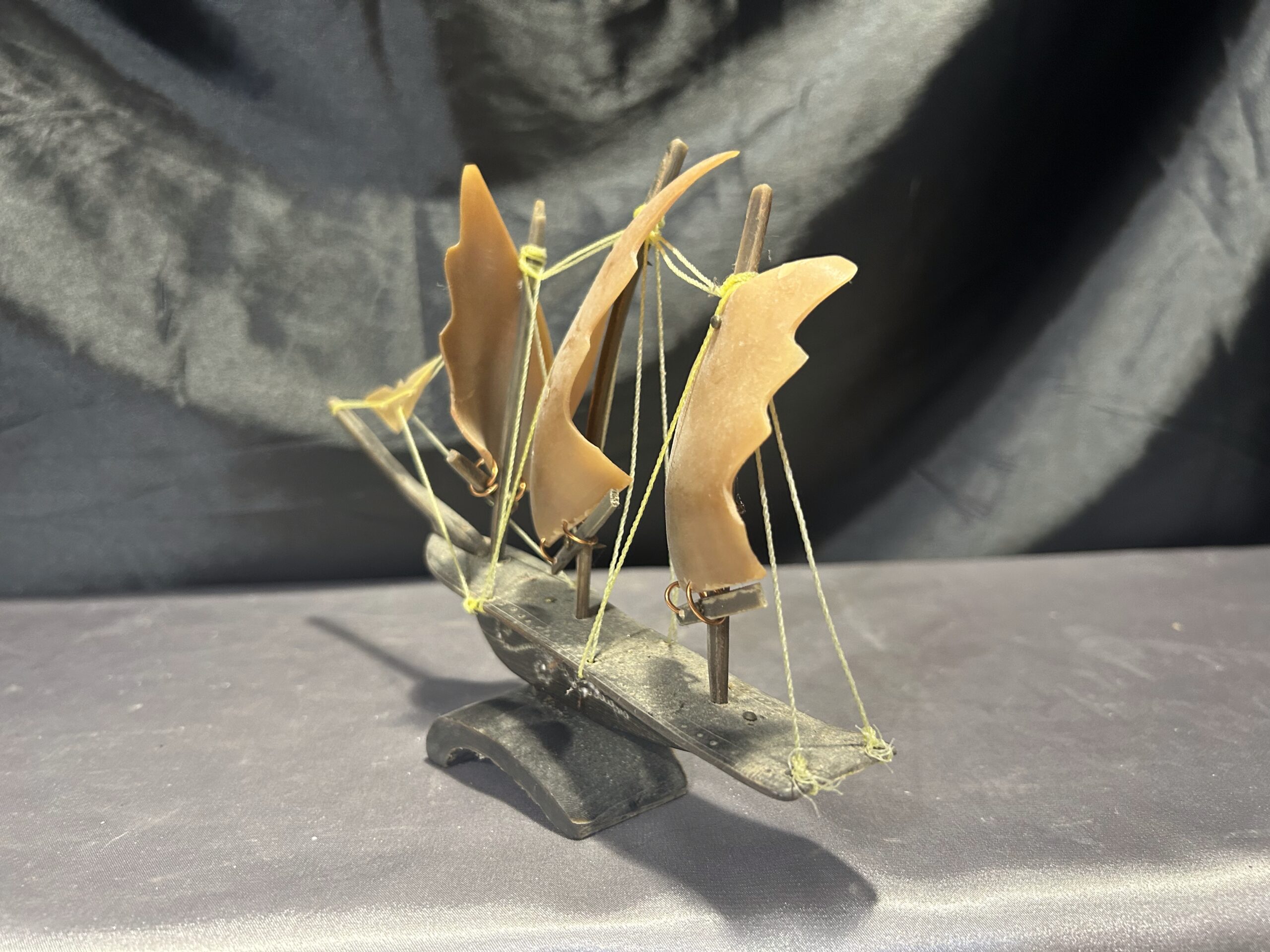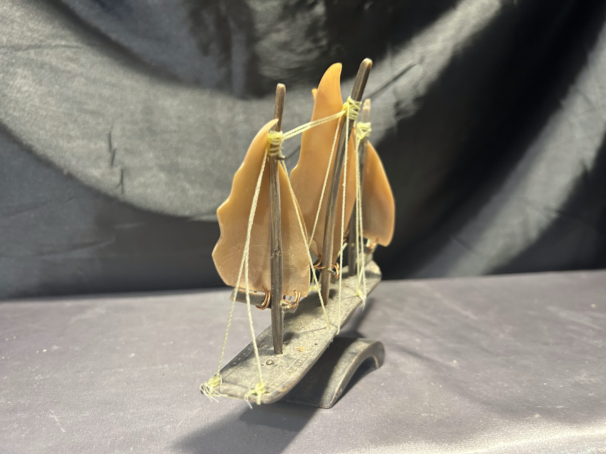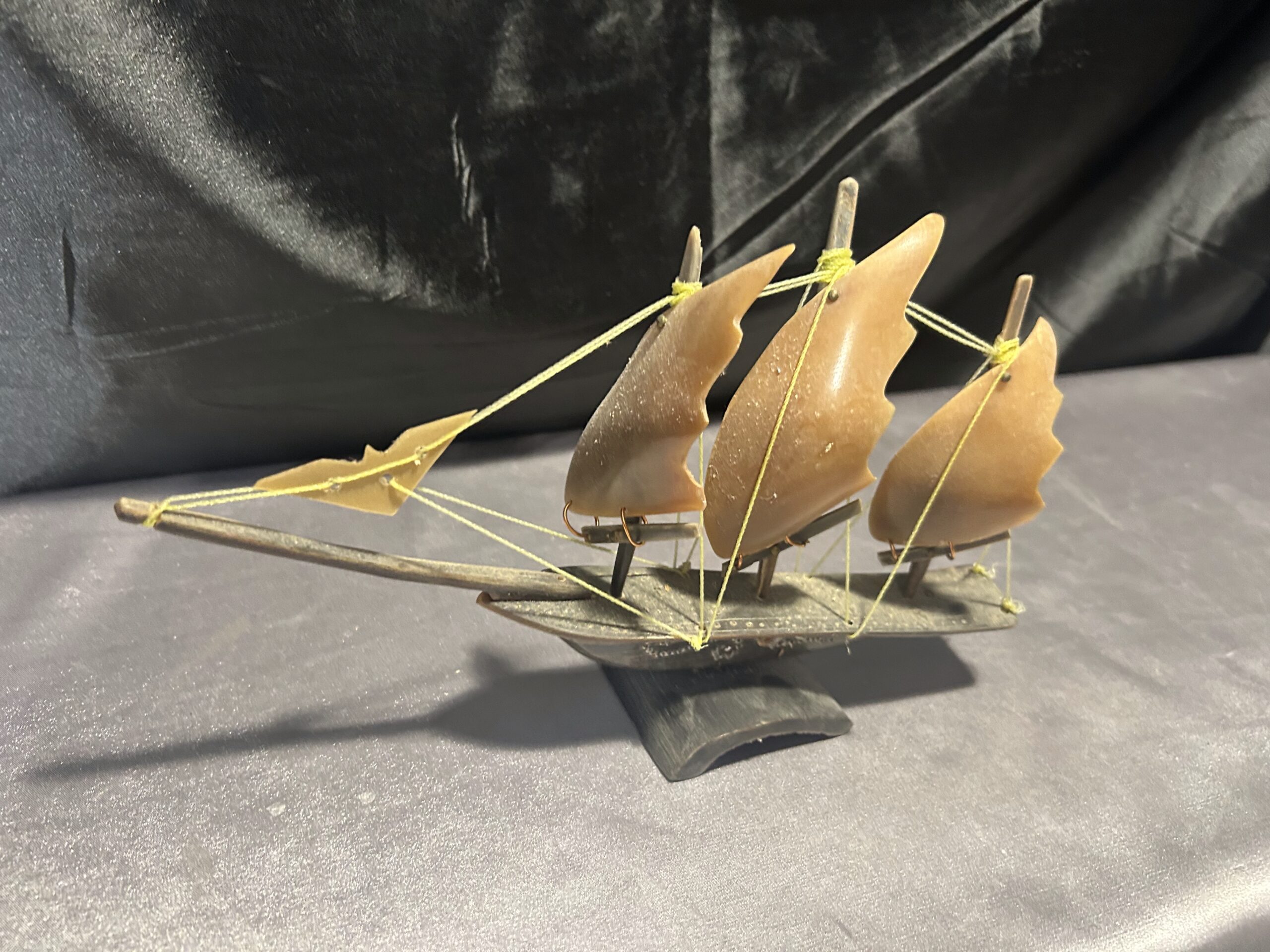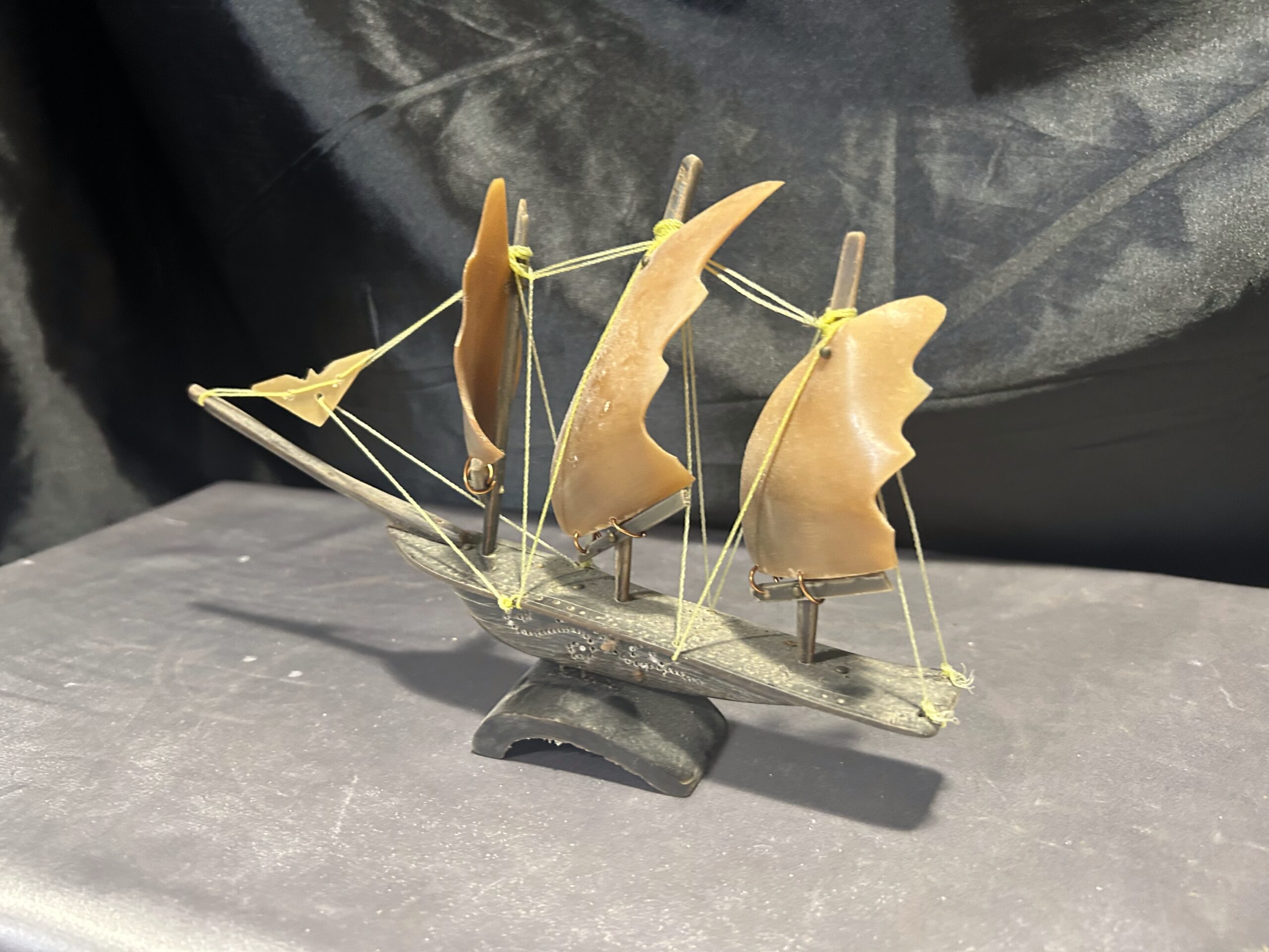 Rzeźbiony drewniany statek z żaglami z muszli – unikatowa dekoracja
