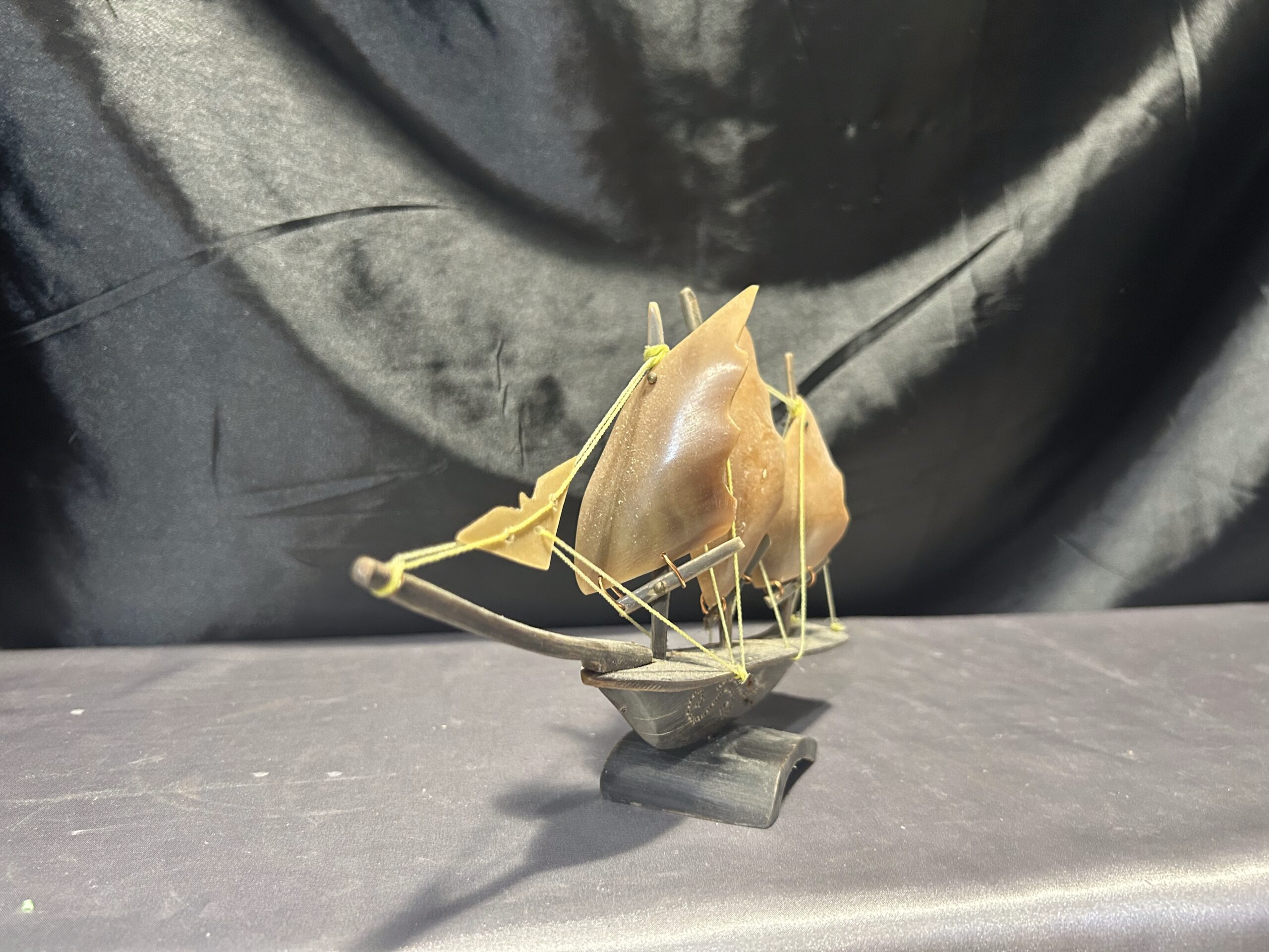 Przedmiotem oferty jest wyjątkowy rzeźbiony drewniany statek, którego żagle wykonane są z naturalnych muszli. To piękny, ręcznie wykonany przedmiot, który łączy w sobie marynistyczny charakter z eleganckim rzemiosłem. Model jest pełen detali, co czyni go doskonałym elementem dekoracyjnym dla miłośników żeglarstwa i unikalnych przedmiotów.