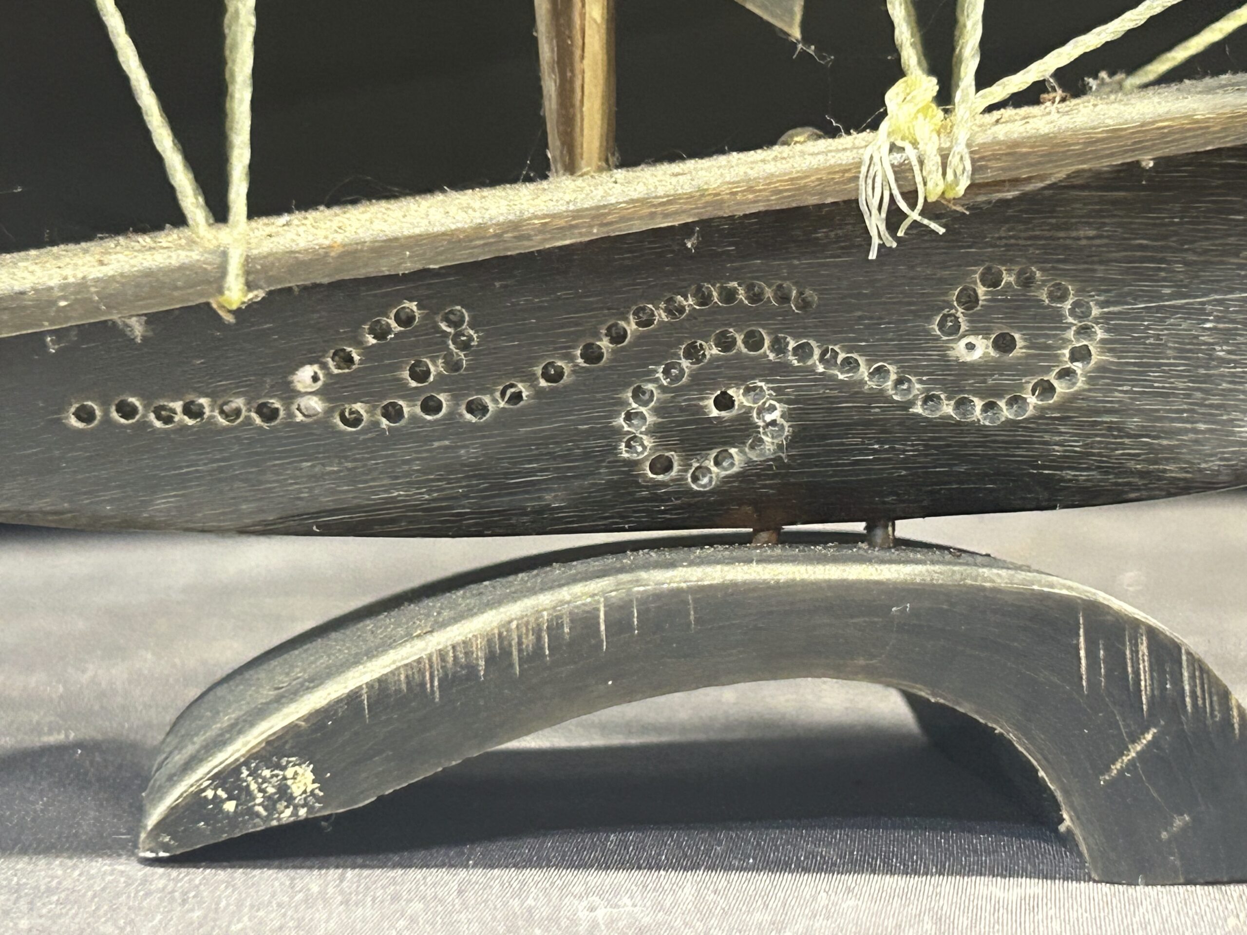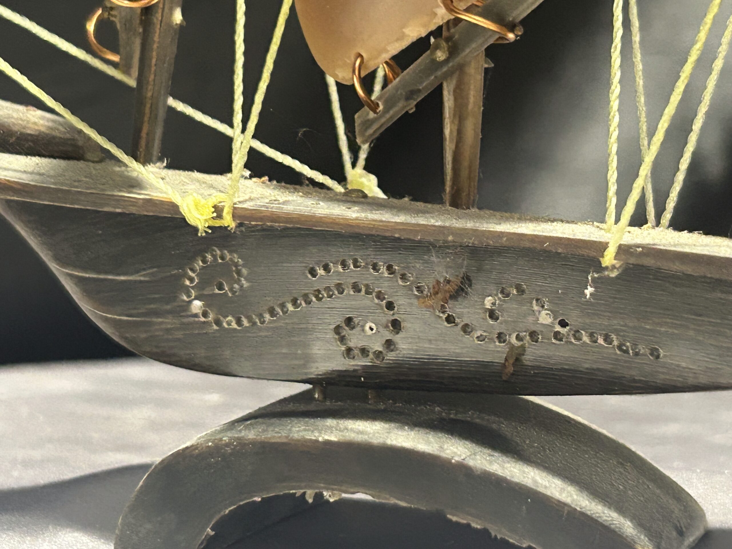 Statek w bardzo dobrym stanie, starannie wykonany i pełen dekoracyjnych detali. Doskonały jako ozdoba na półkę, biurko czy komodę, idealnie pasujący do wnętrz w stylu klasycznym i marynistycznym. Istnieje możliwość wysyłki po wcześniejszym ustaleniu szczegółów.