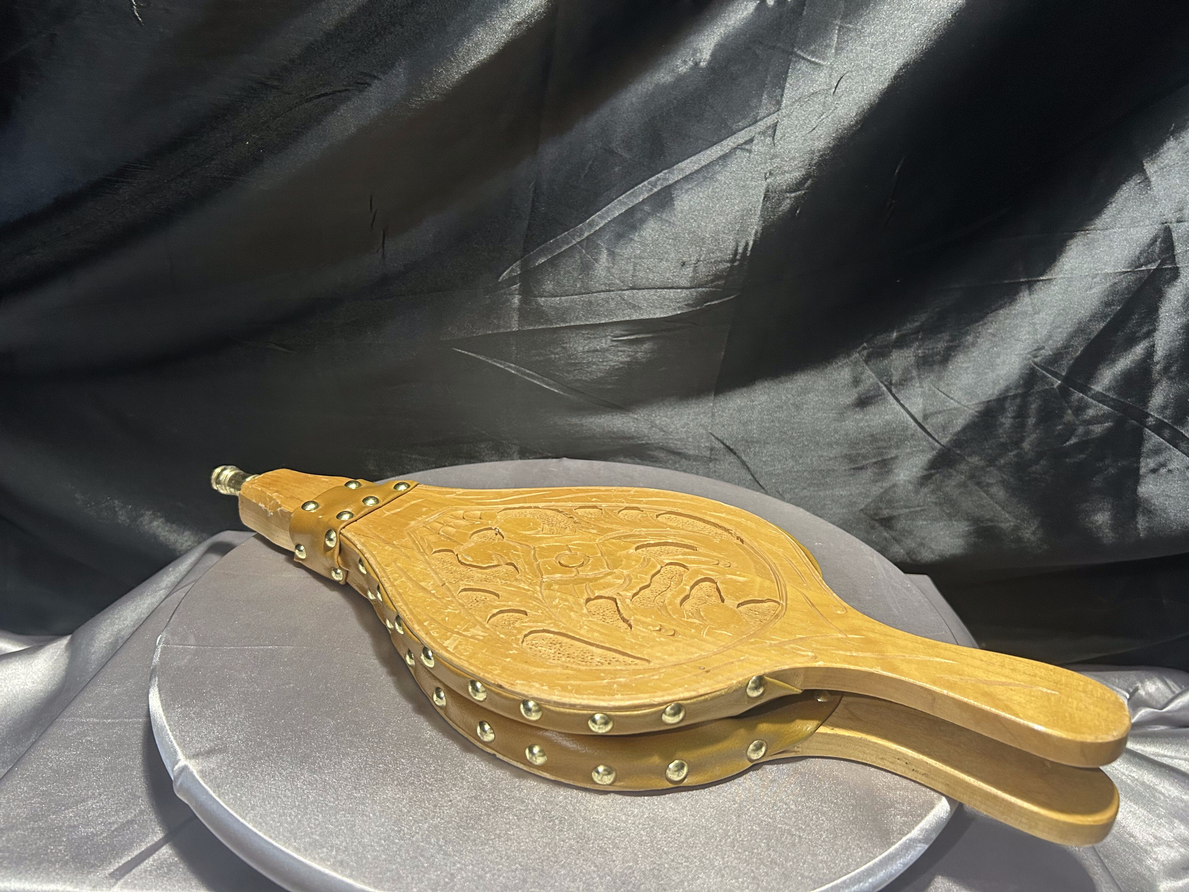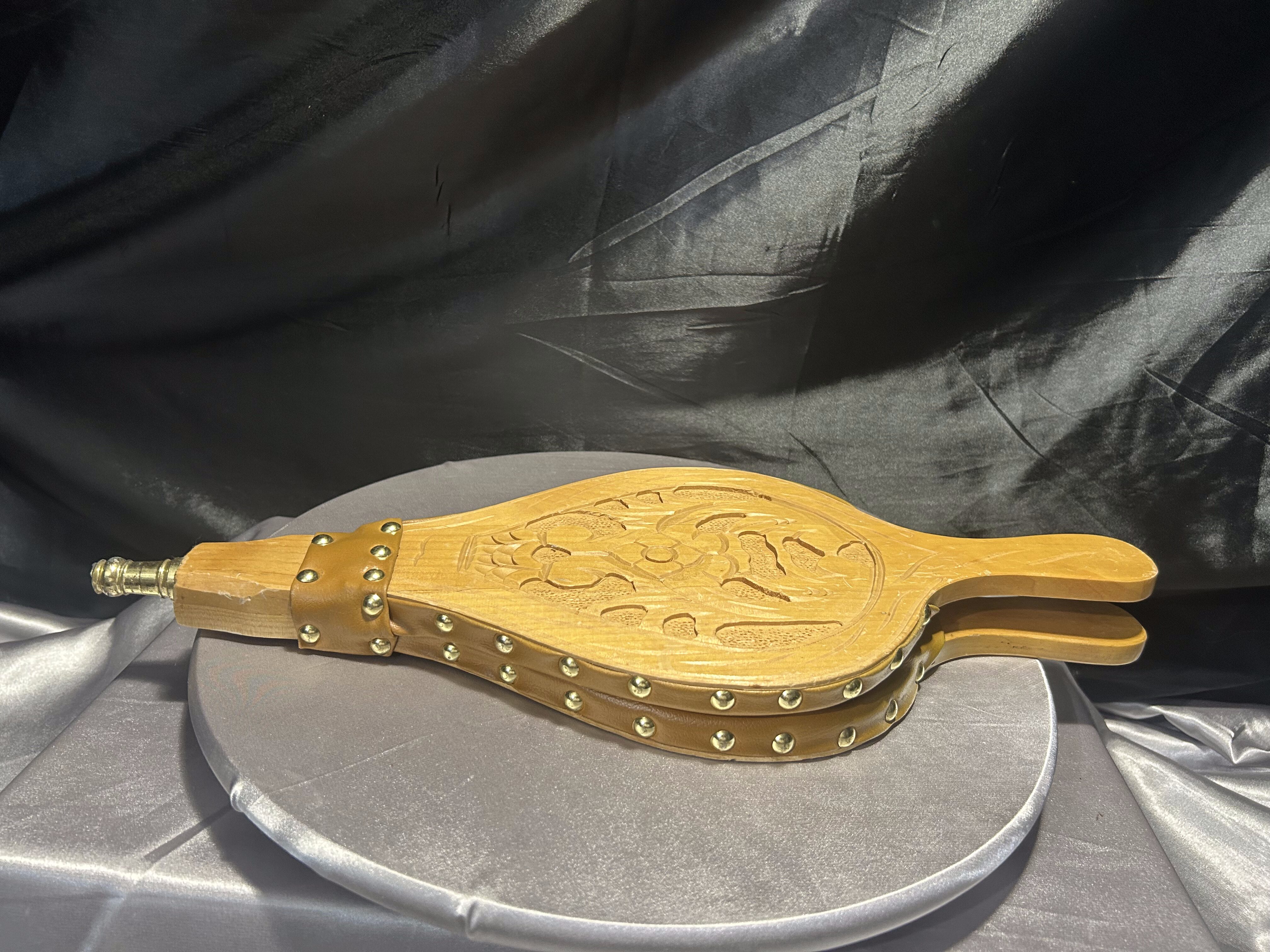 Rzeźbiony miech kominkowy – jasne drewno i eko-skóra – regionalny wzór kwiatowy