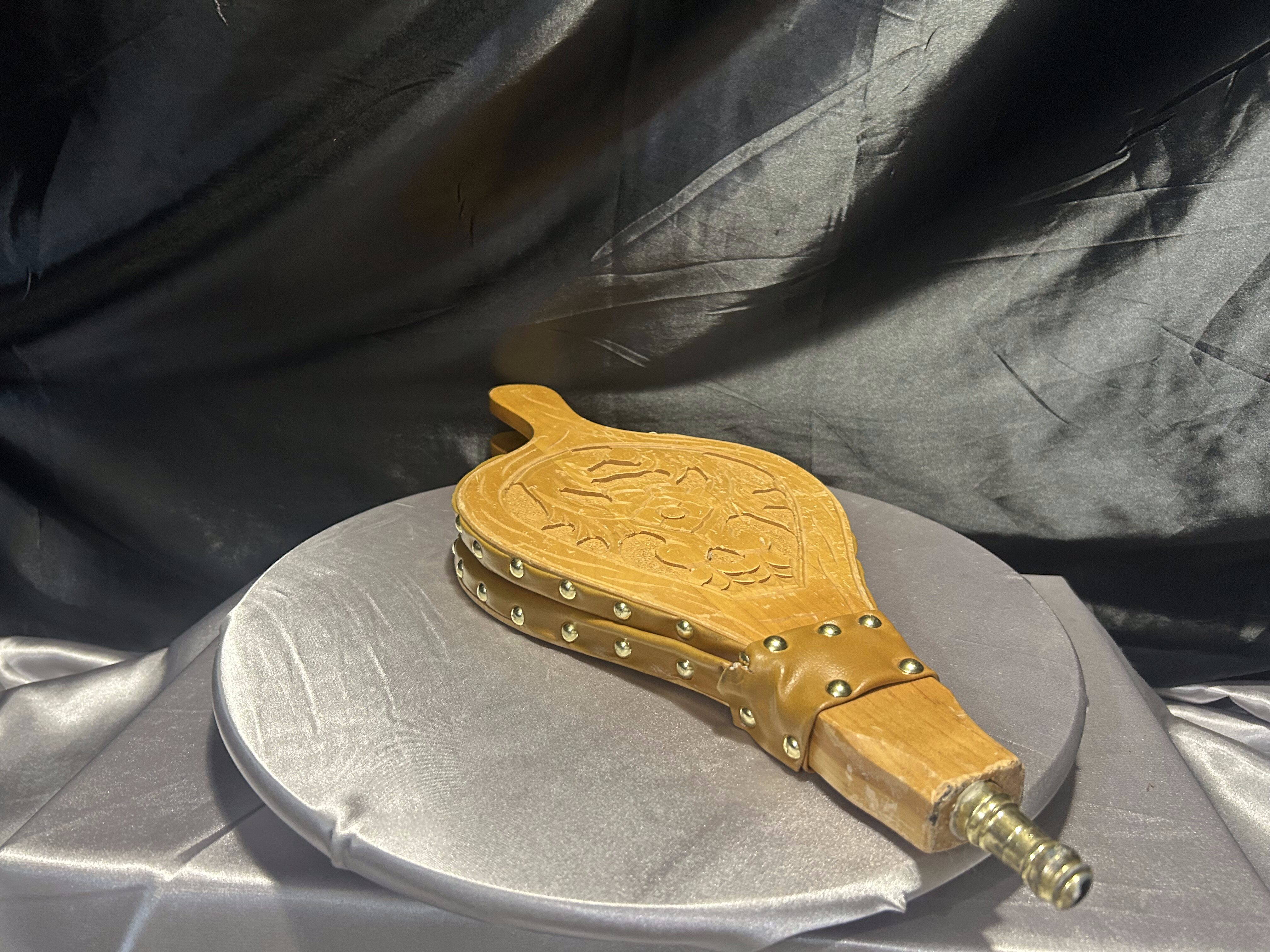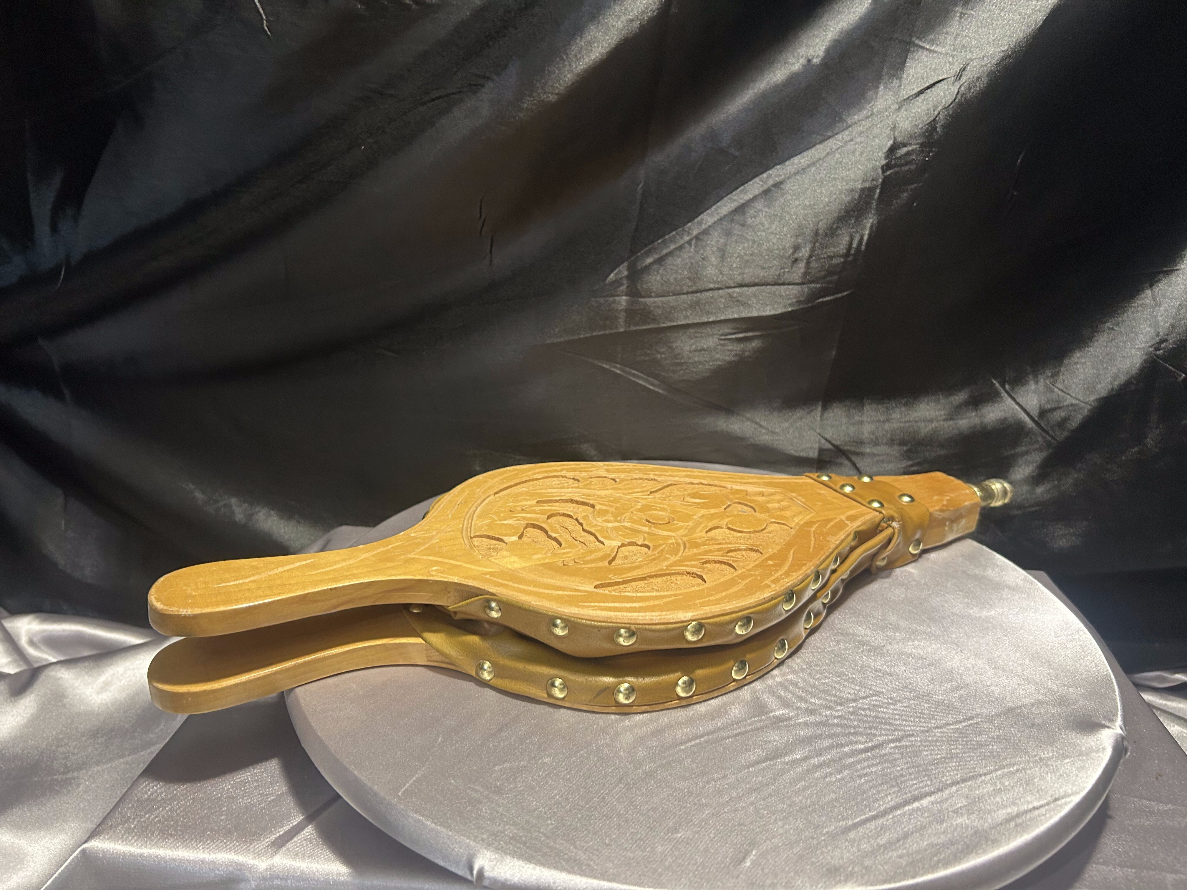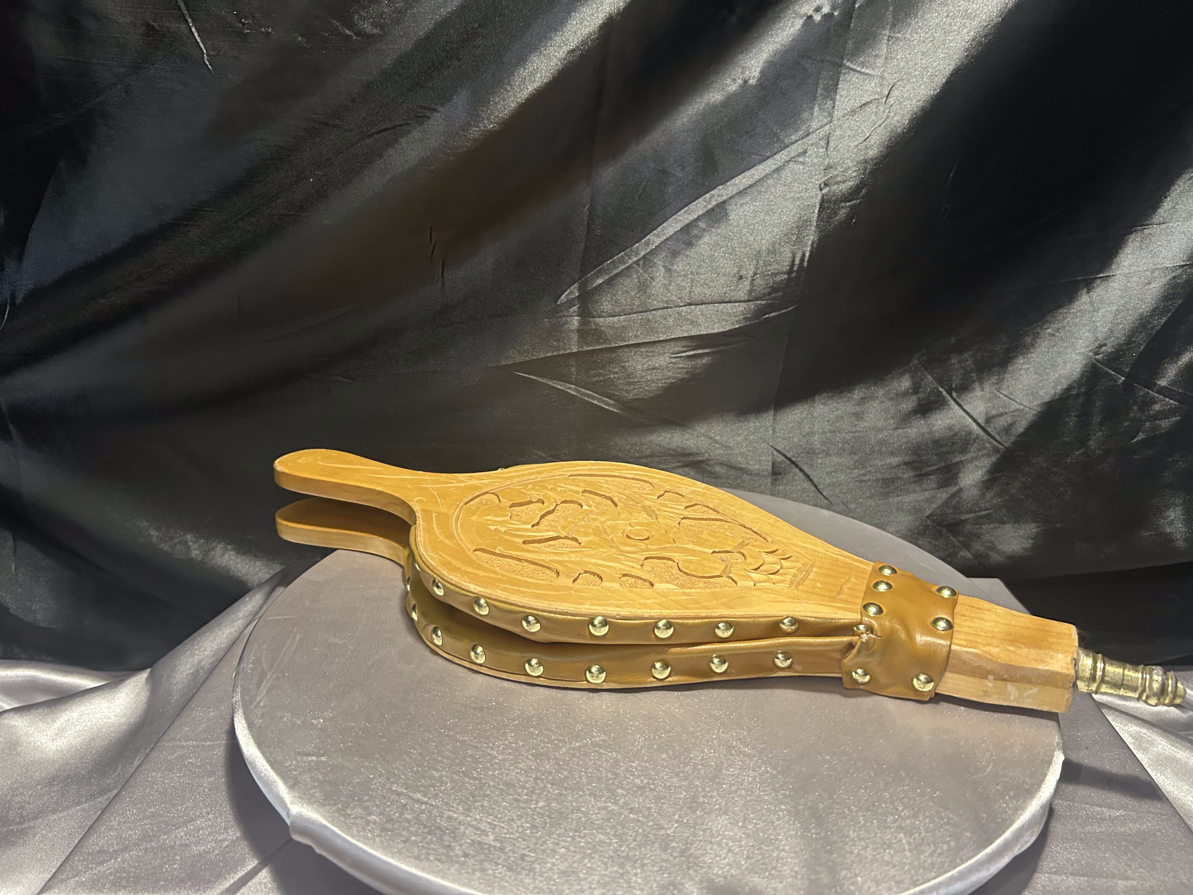 Ozdobny miech kominkowy wykonany z jasnego, rzeźbionego drewna i wykończony eko-skórą w klasycznym stylu. Zdobiony regionalnym, kwiatowym motywem oraz ozdobnymi złotymi ćwiekami, stanowi nie tylko funkcjonalne narzędzie do rozpalania ognia, ale również atrakcyjny element dekoracyjny. Idealny do wnętrz rustykalnych, góralskich czy klasycznych, dodając im autentycznego charakteru i ciepła.