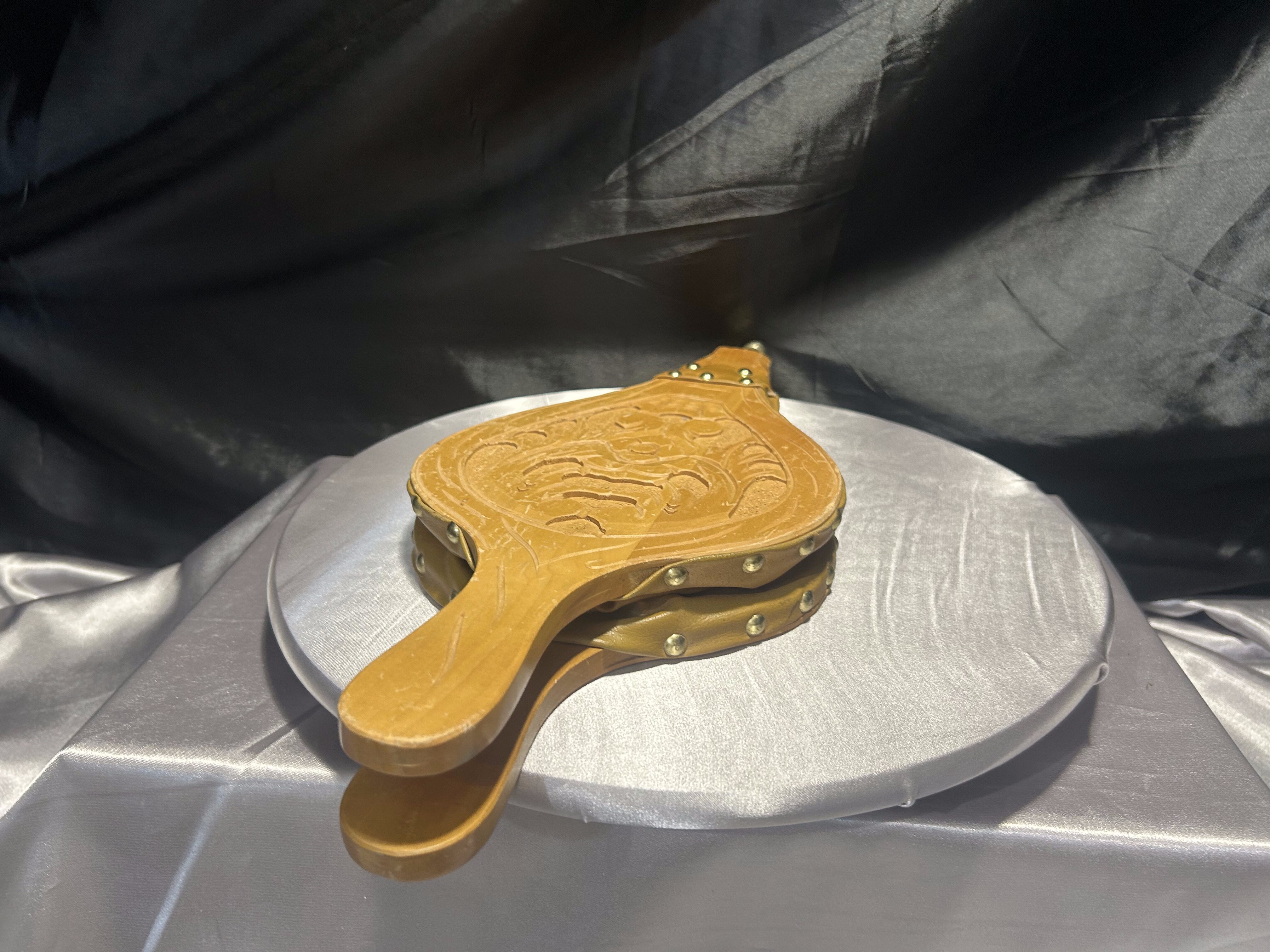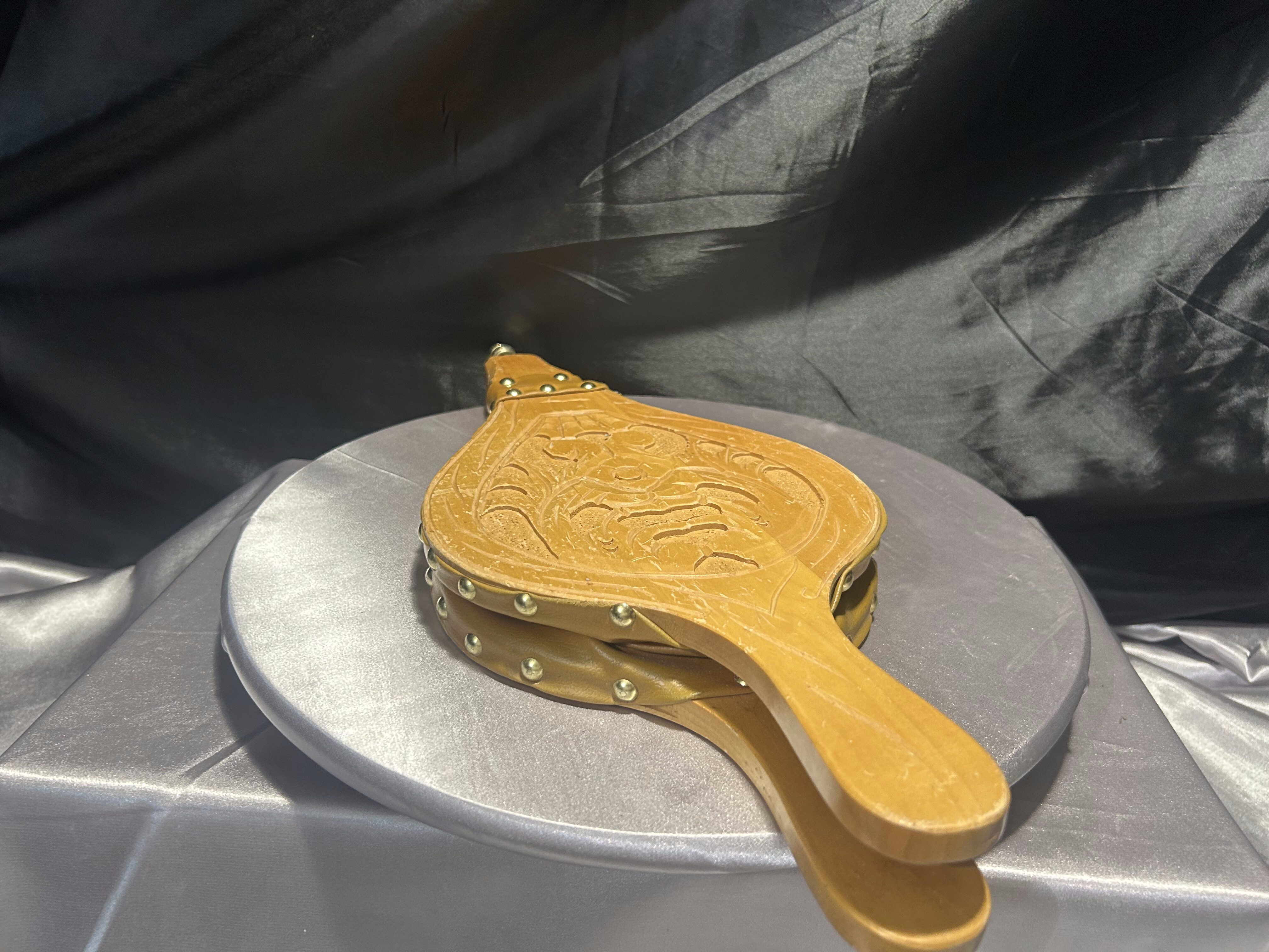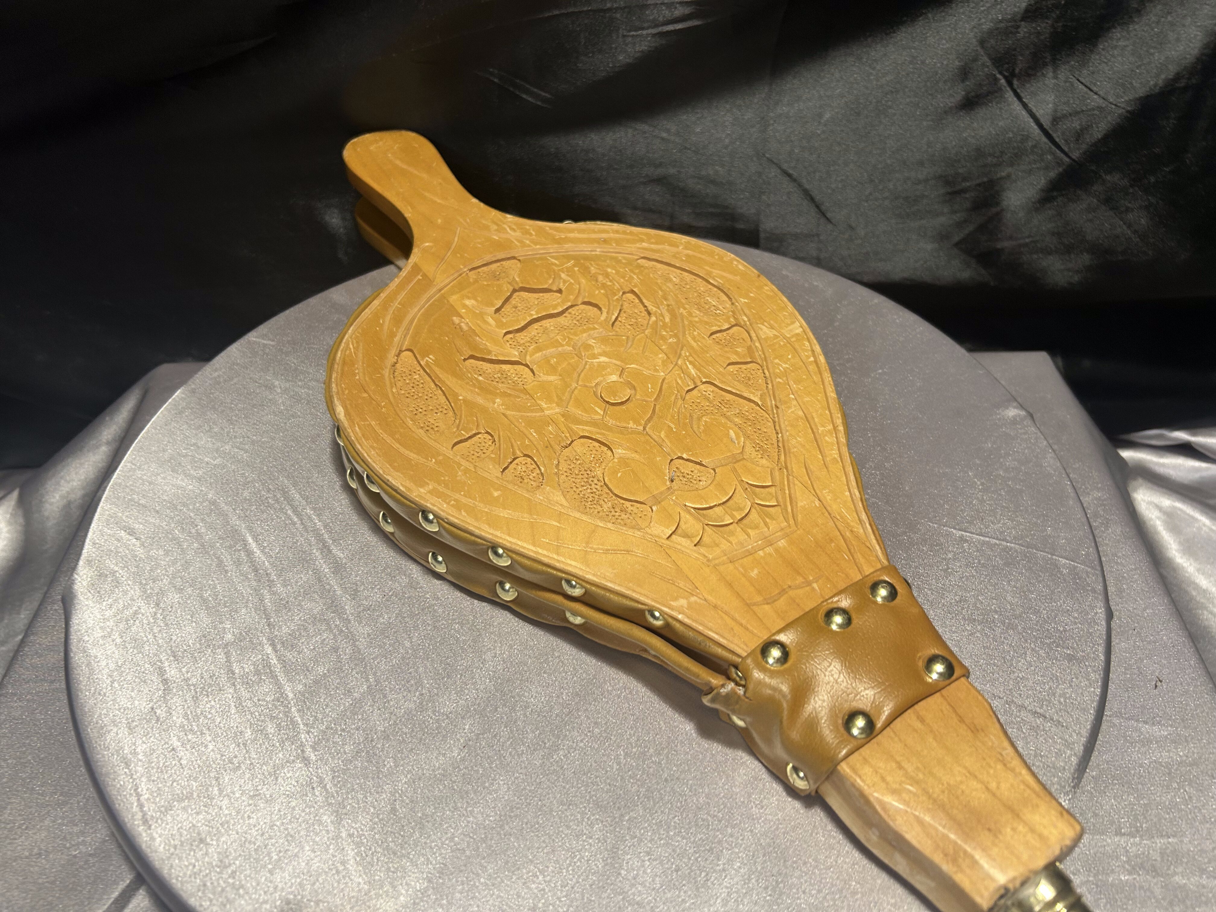 Ozdobny miech kominkowy wykonany z jasnego, rzeźbionego drewna i wykończony eko-skórą w klasycznym stylu. Zdobiony regionalnym, kwiatowym motywem oraz ozdobnymi złotymi ćwiekami, stanowi nie tylko funkcjonalne narzędzie do rozpalania ognia, ale również atrakcyjny element dekoracyjny. Idealny do wnętrz rustykalnych, góralskich czy klasycznych, dodając im autentycznego charakteru i ciepła.