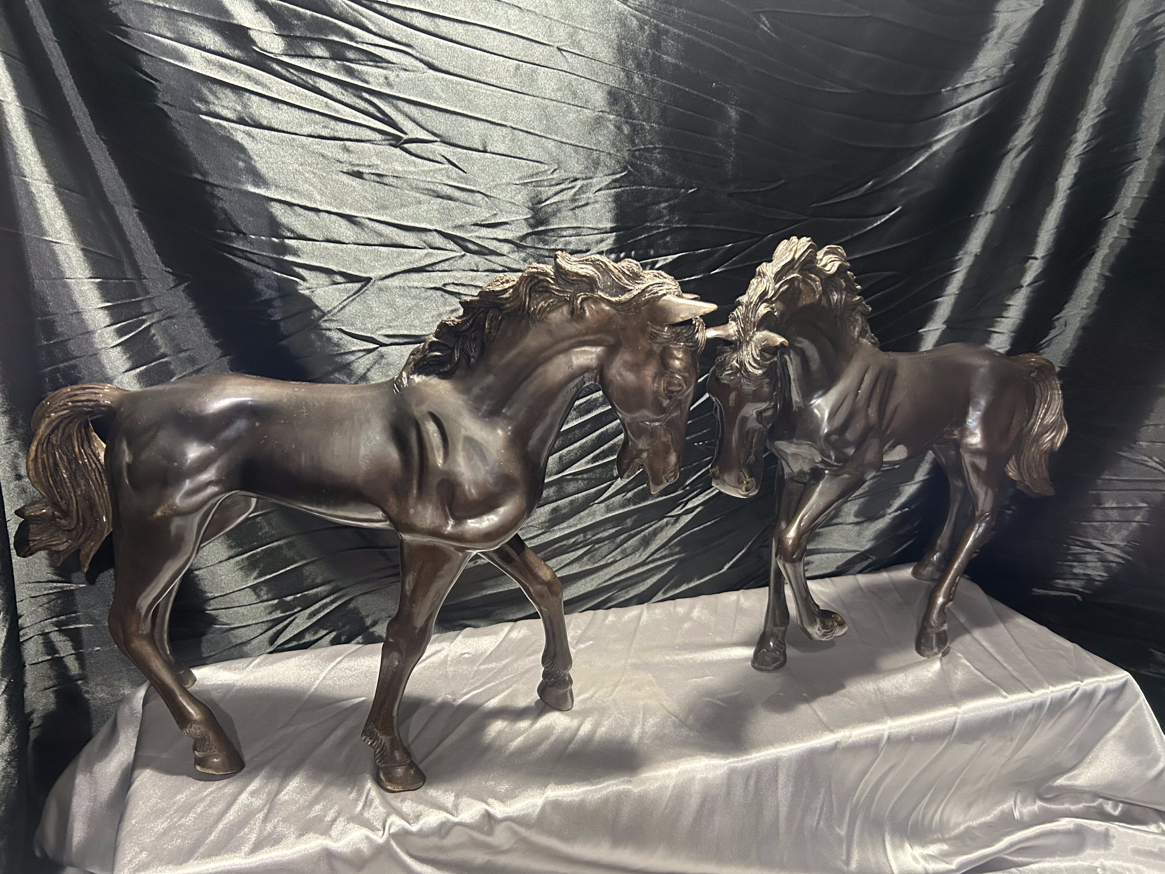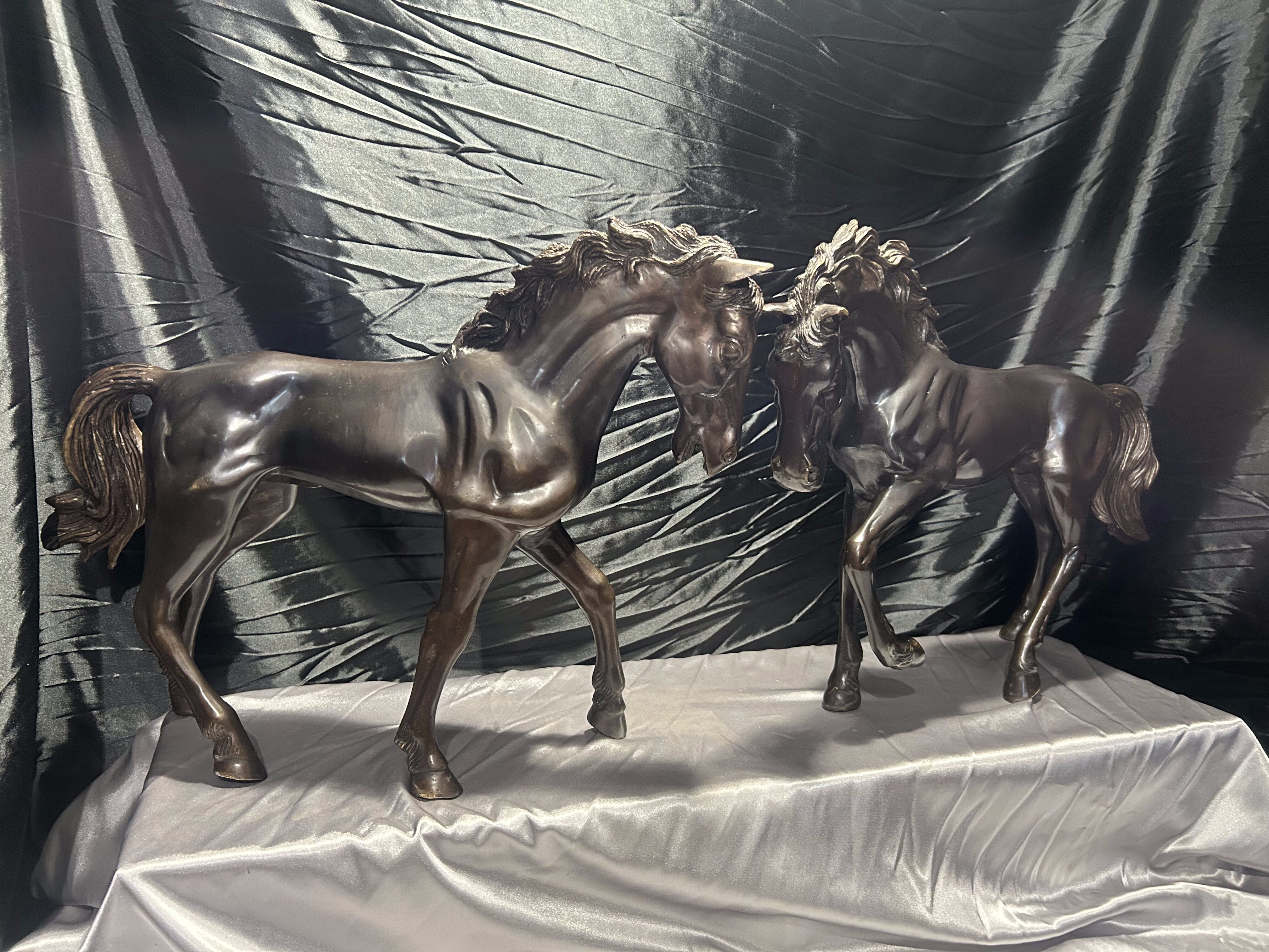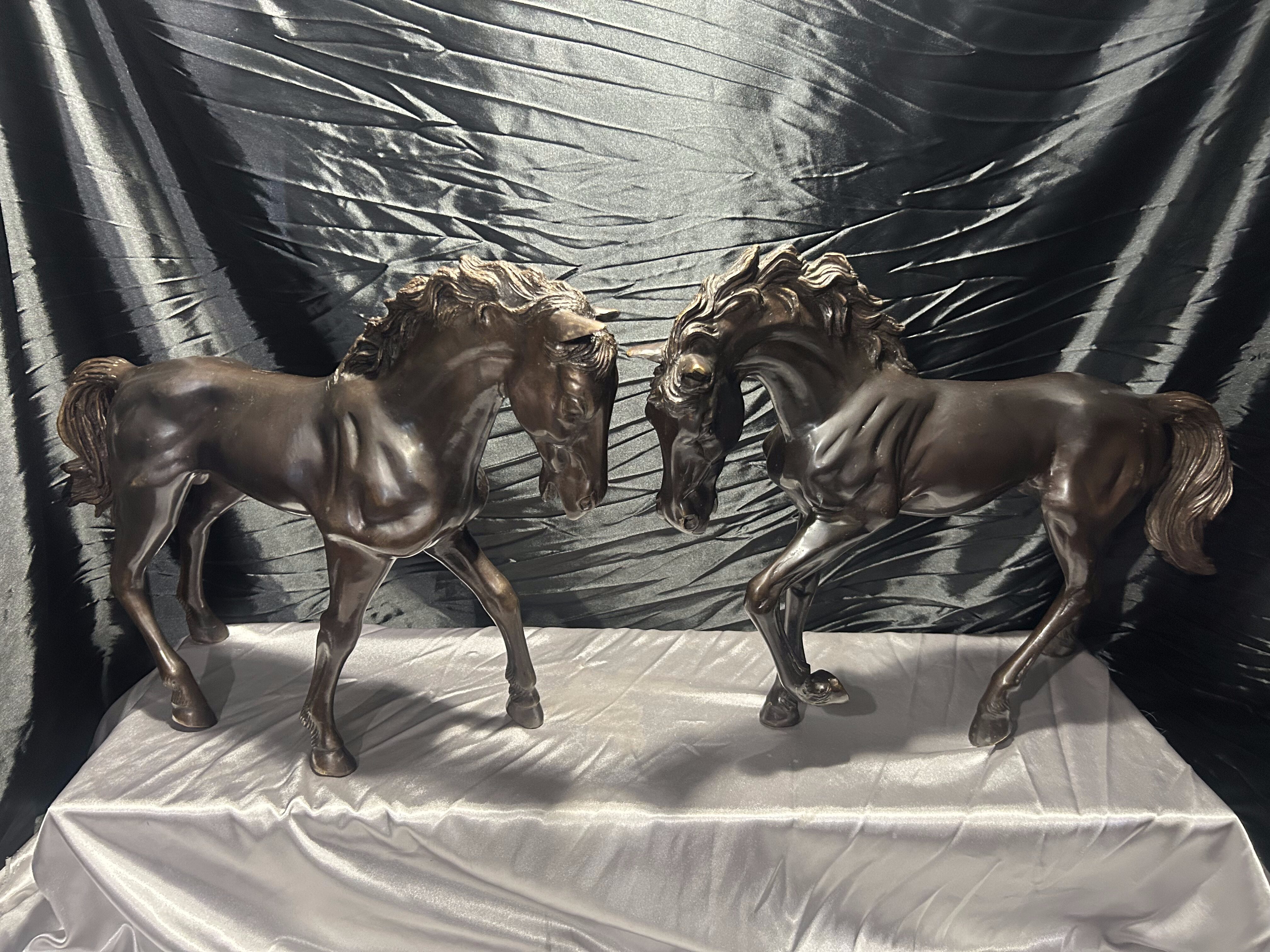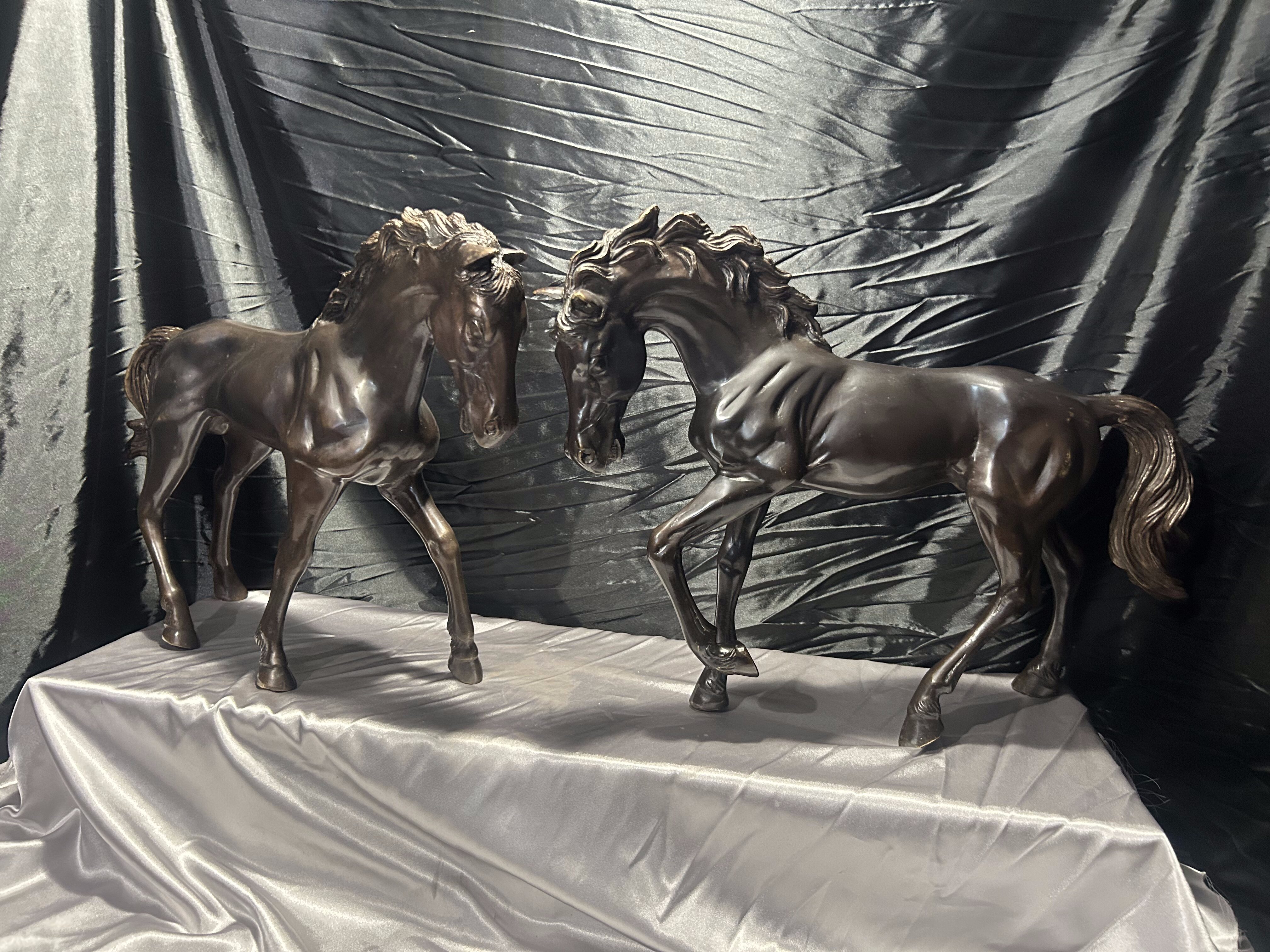 Imponująca para dużych rzeźb koni odlanych w brązie, sygnowanych nazwiskiem Toto. Powstałe w latach 60.–70. XX wieku, stanowią przykład dekoracyjnej sztuki figuralnej inspirowanej dynamiką i siłą natury.