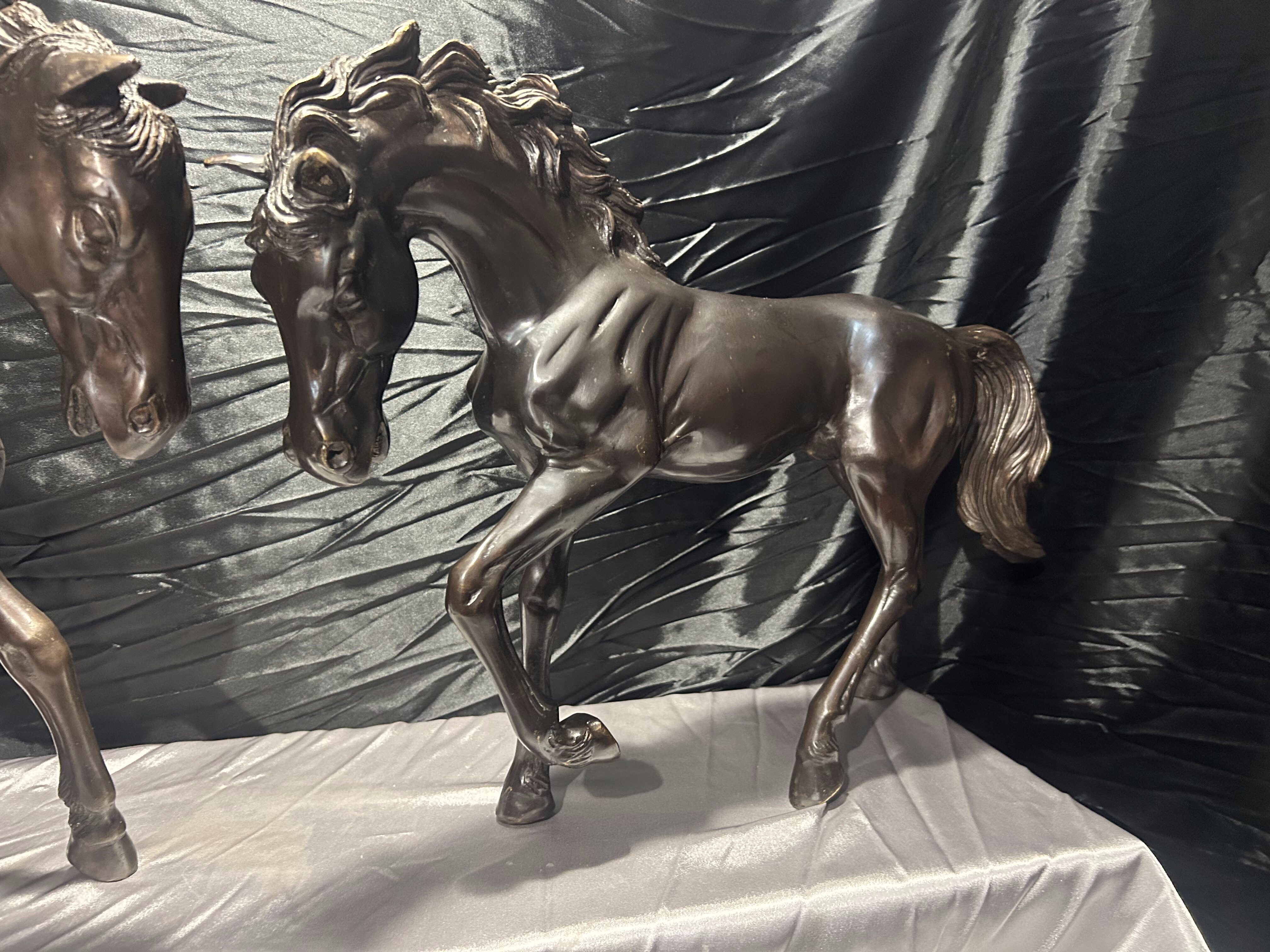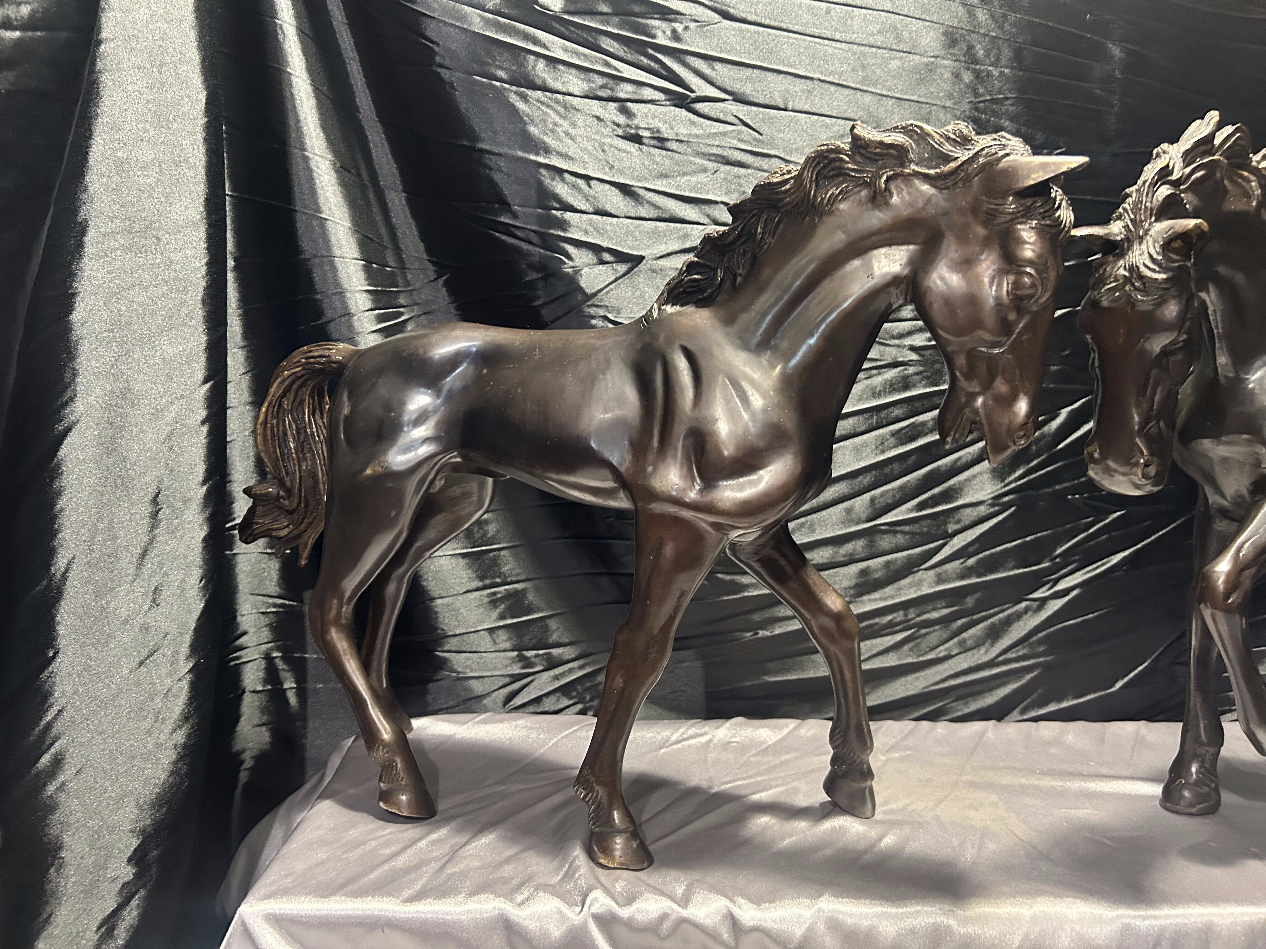Każda z rzeźb przedstawia konia w pełnym ruchu, z podkreślonymi mięśniami i finezyjnie oddaną sylwetką. Patyna brązu wydobywa kontrasty światła i cienia, nadając całości elegancji i ponadczasowego charakteru. Obie figury tworzą harmonijną parę – mogą być eksponowane razem lub osobno, zawsze przyciągając uwagę.