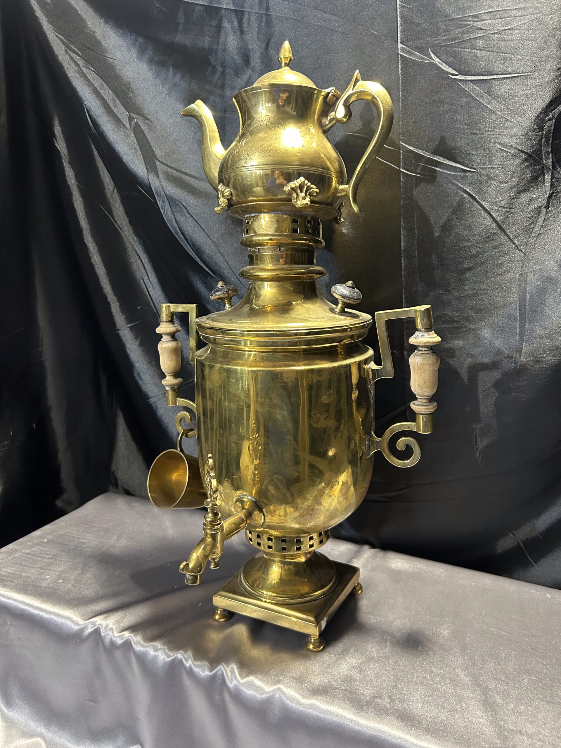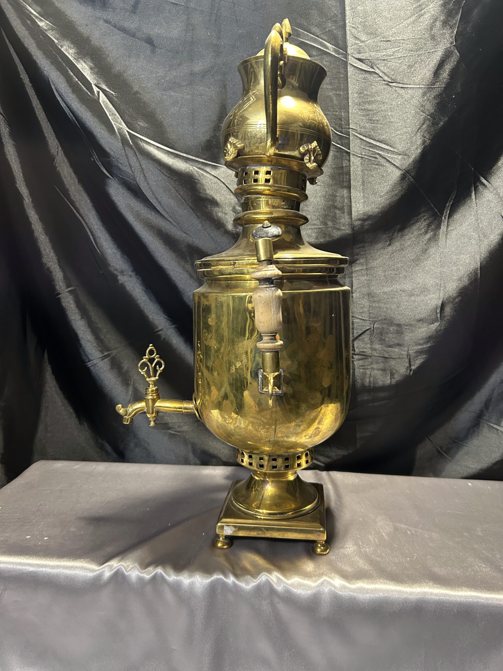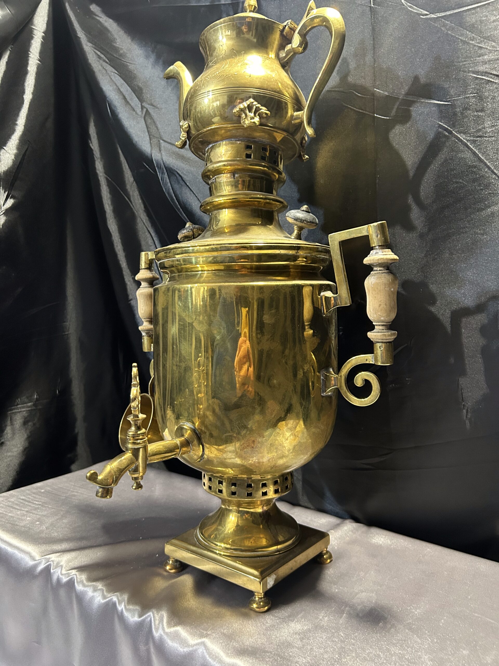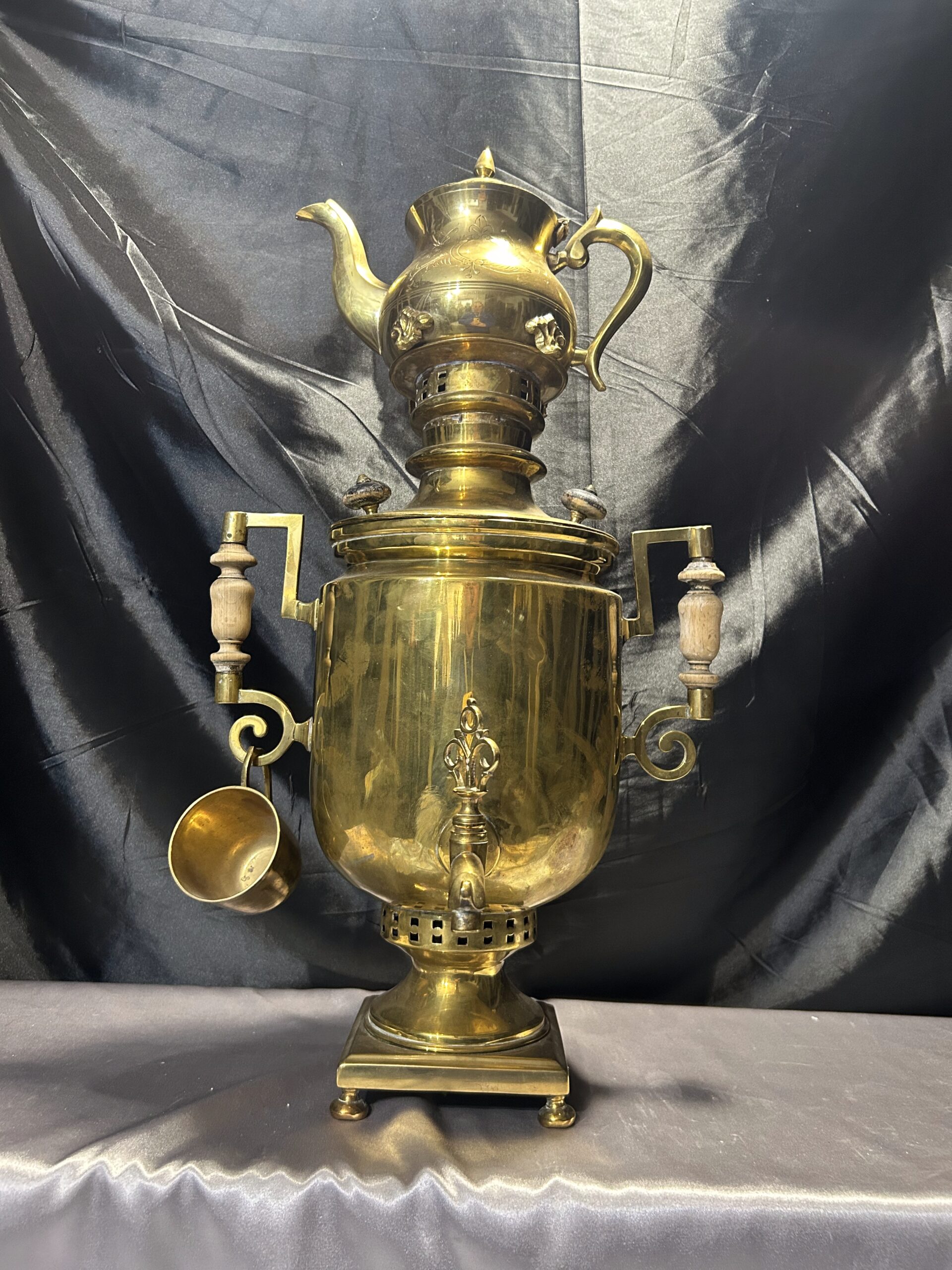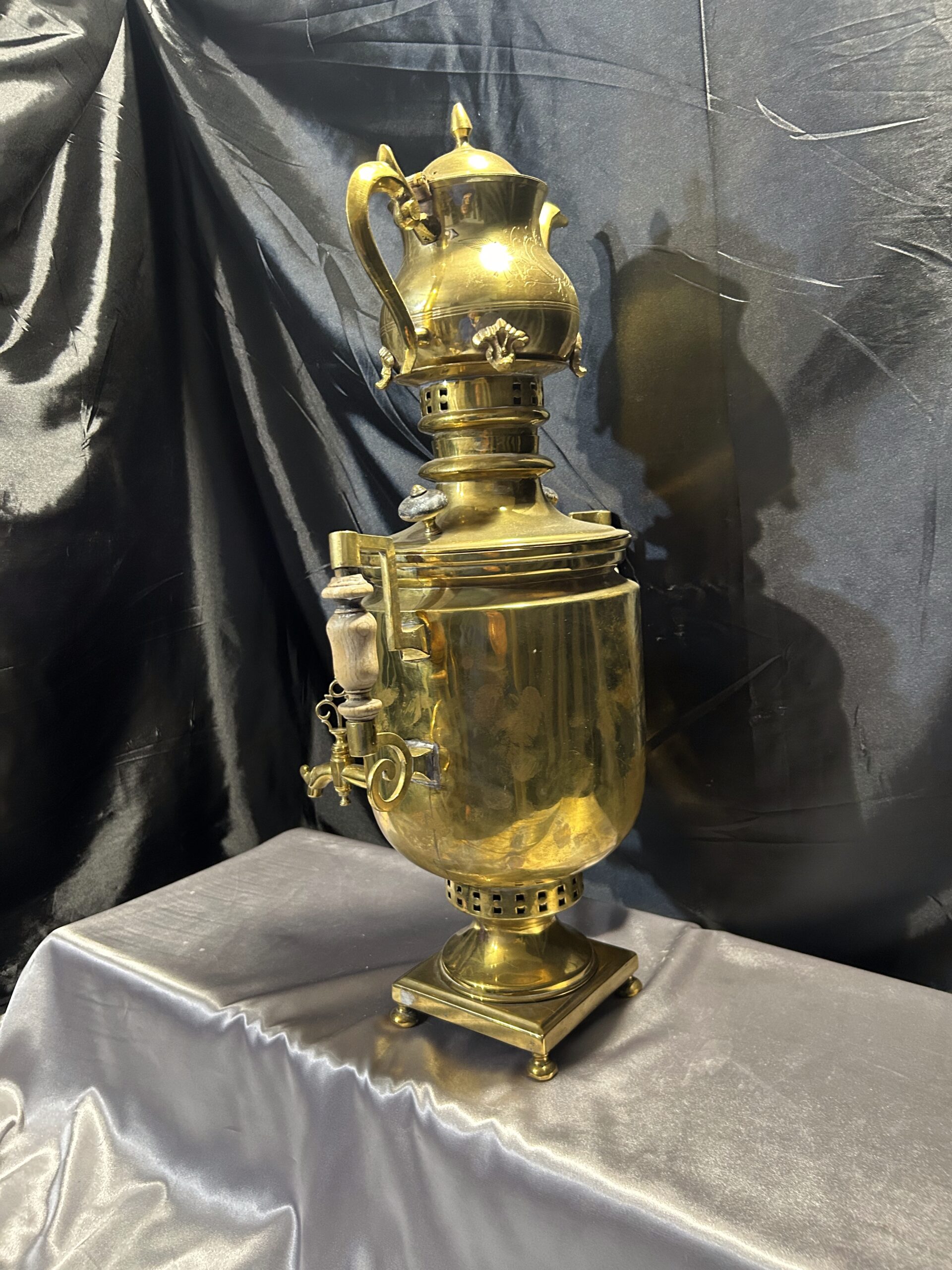 Klasyczny samowar wykonany z mosiądzu, wyróżniający się eleganckim designem i zdobionym czajniczkiem (imbryczkiem). Wyposażony w praktyczny kubeczek i drewniane uchwyty, które dodają mu tradycyjnego charakteru. Idealny zarówno jako funkcjonalny element, jak i ozdoba wnętrza.