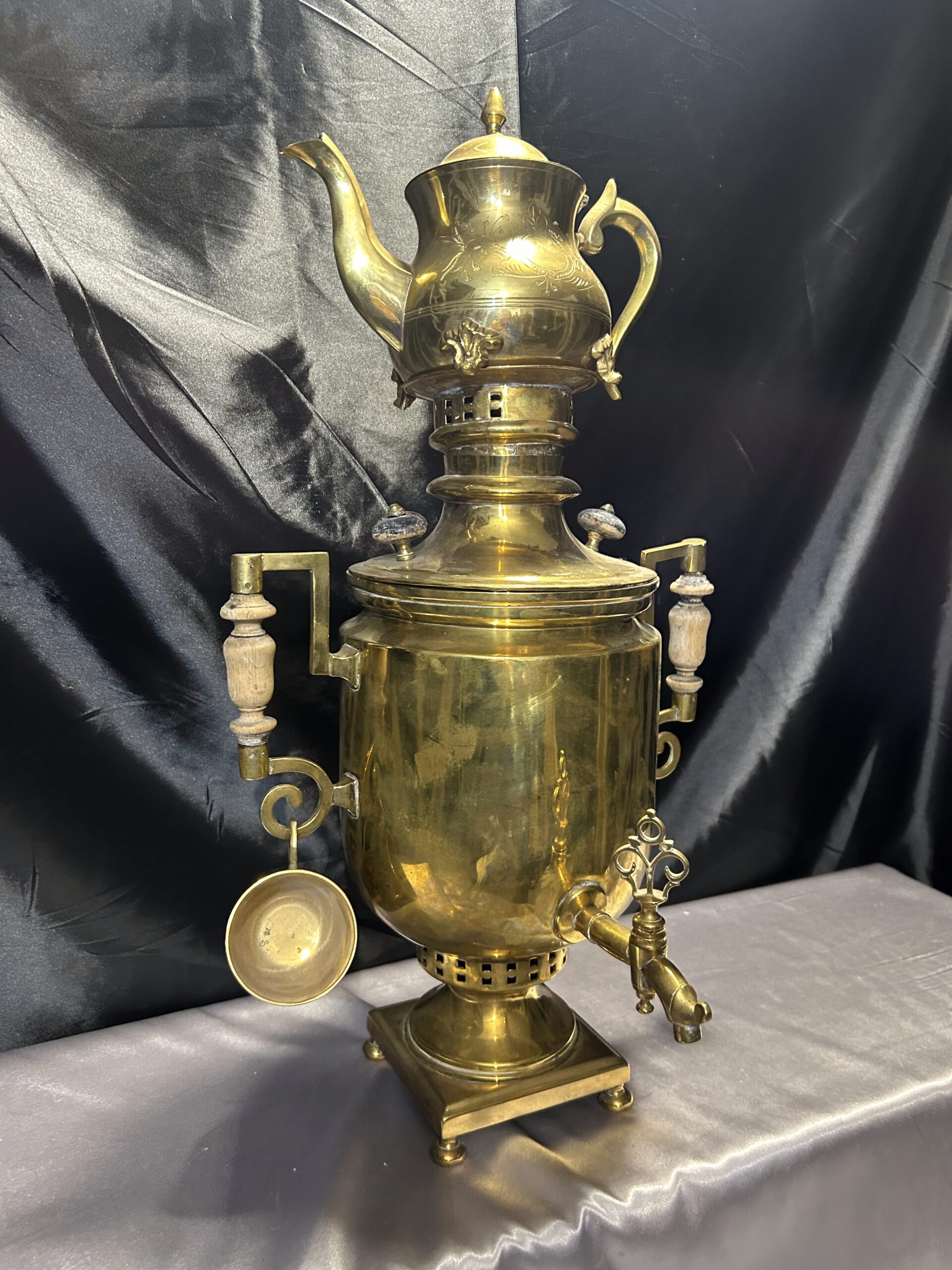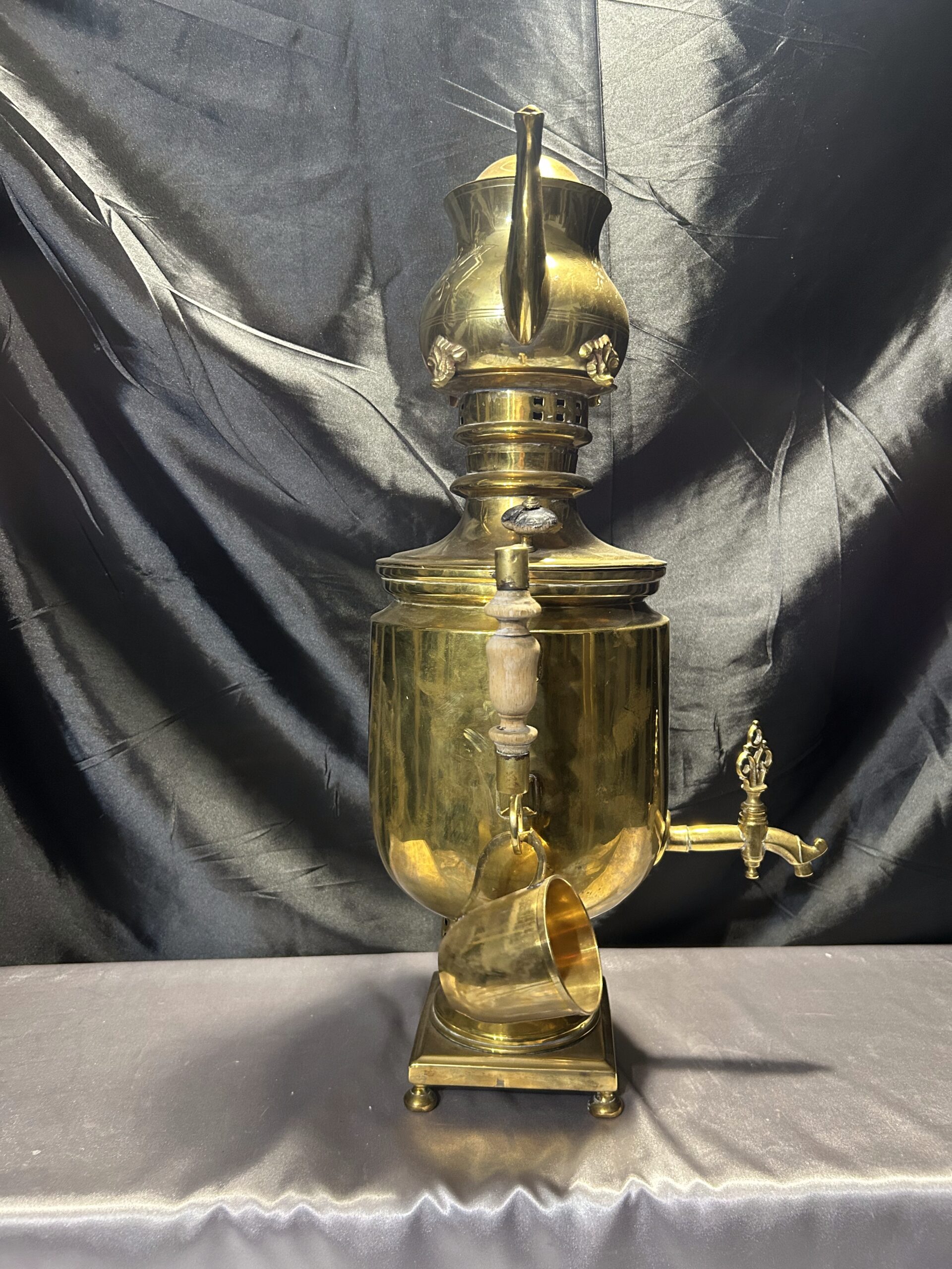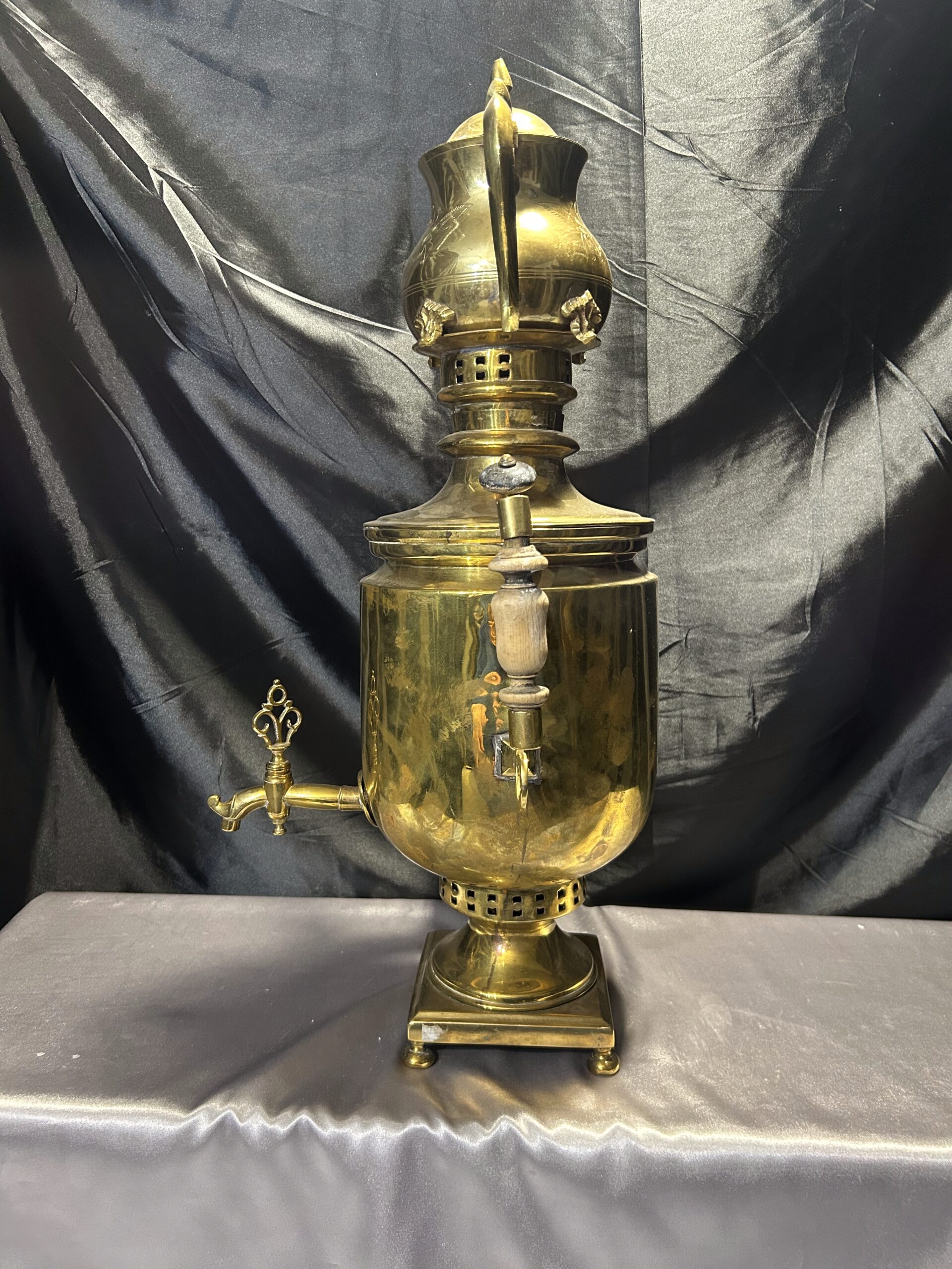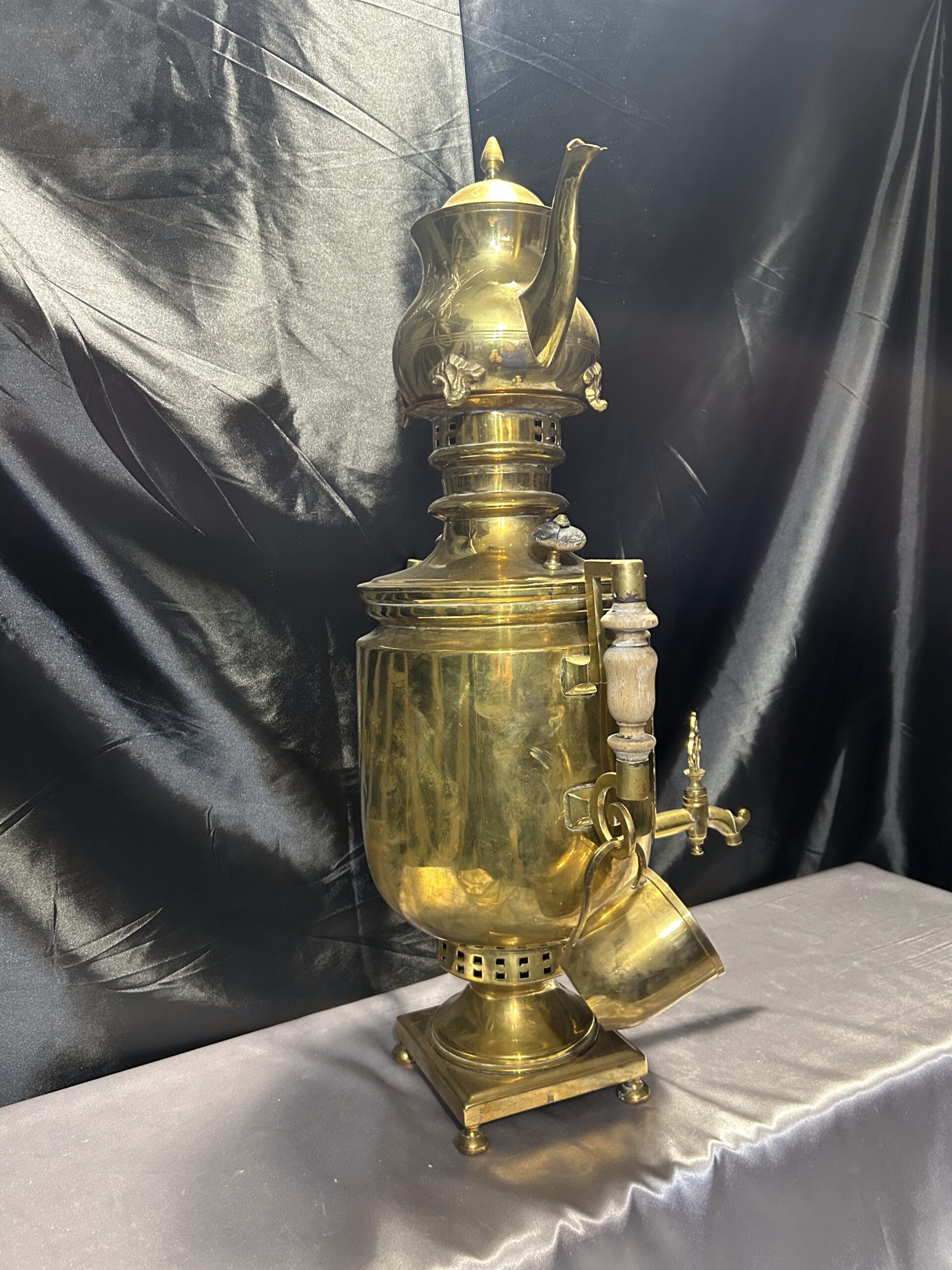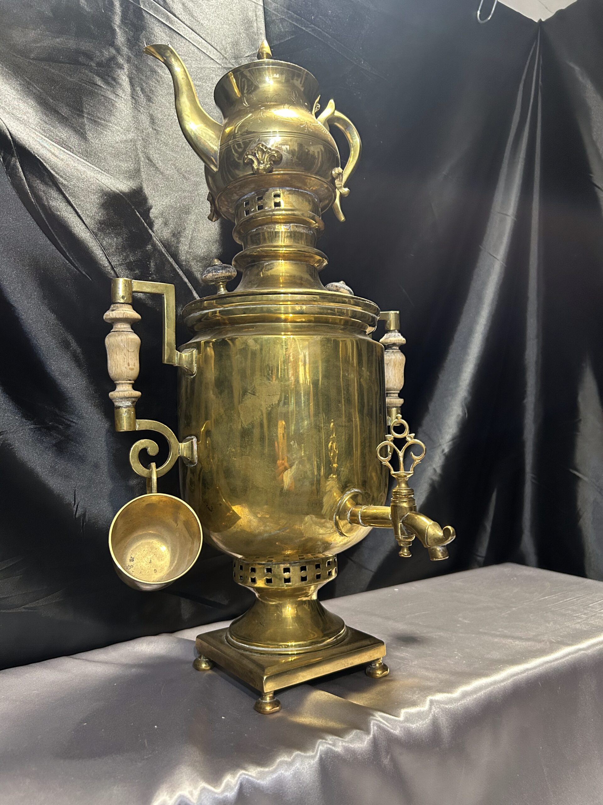 Klasyczny samowar wykonany z mosiądzu, wyróżniający się eleganckim designem i zdobionym czajniczkiem (imbryczkiem). Wyposażony w praktyczny kubeczek i drewniane uchwyty, które dodają mu tradycyjnego charakteru. Idealny zarówno jako funkcjonalny element, jak i ozdoba wnętrza.