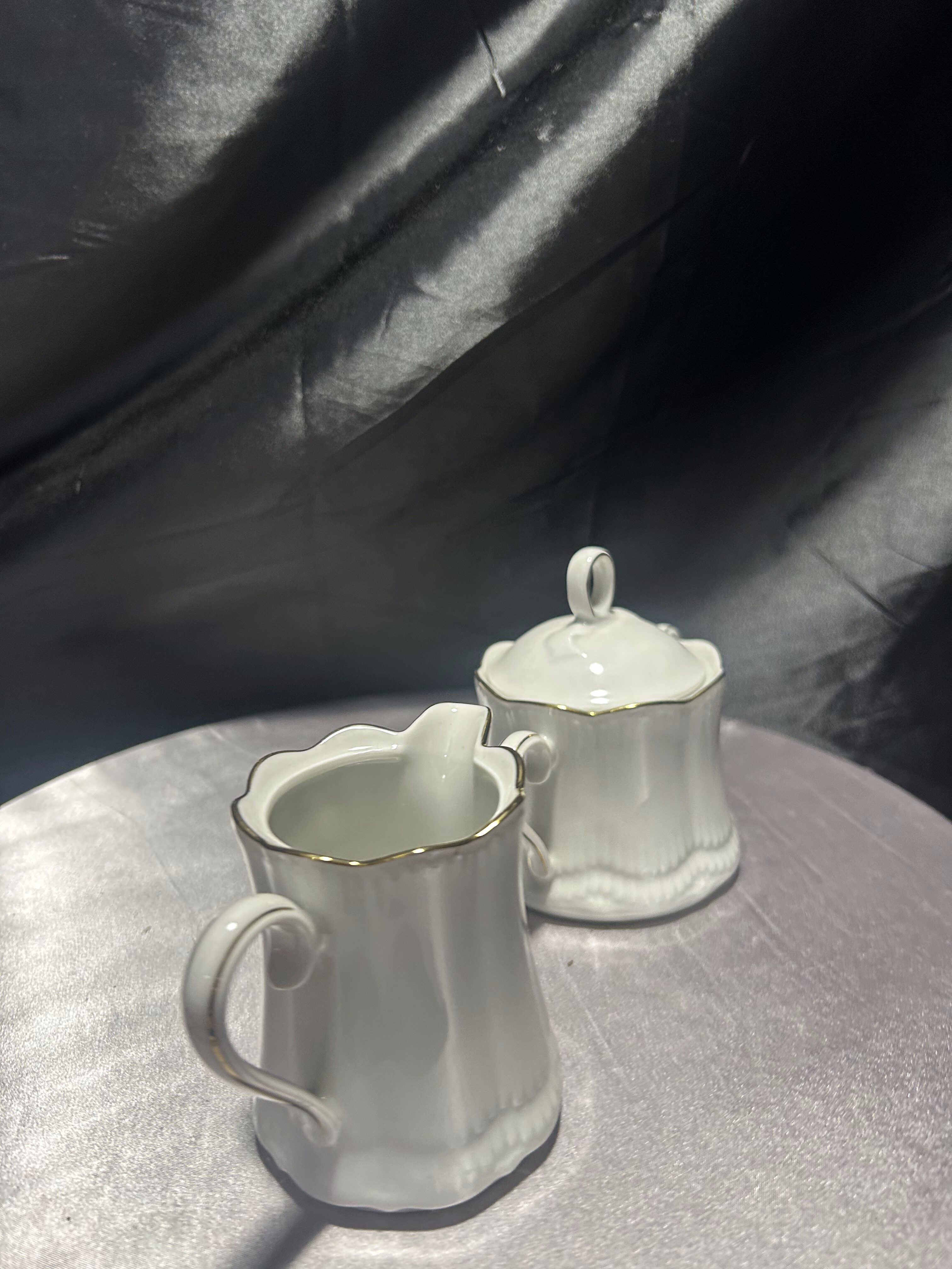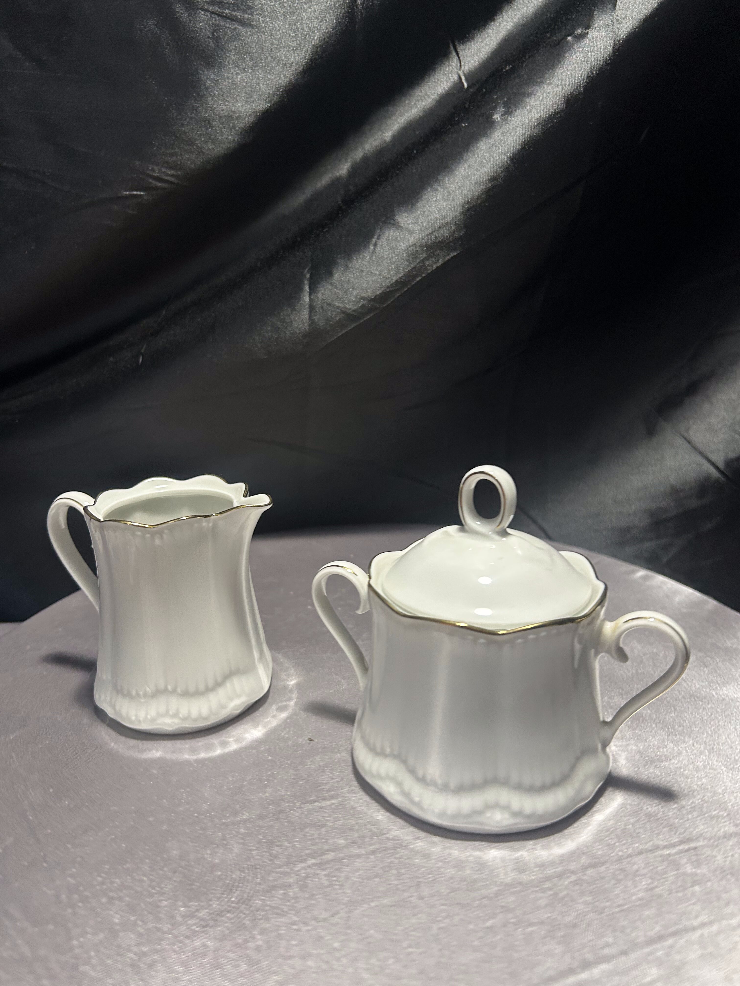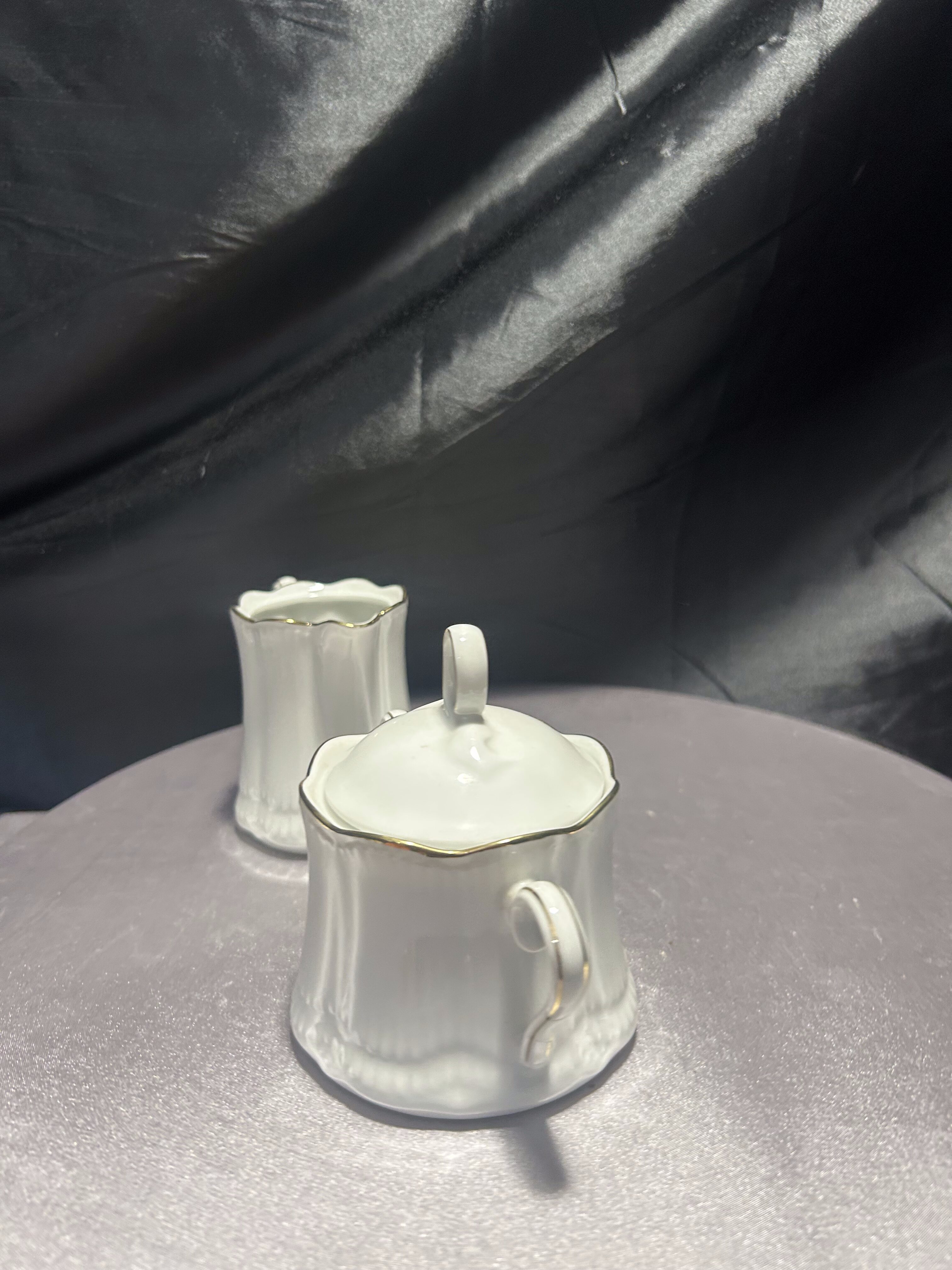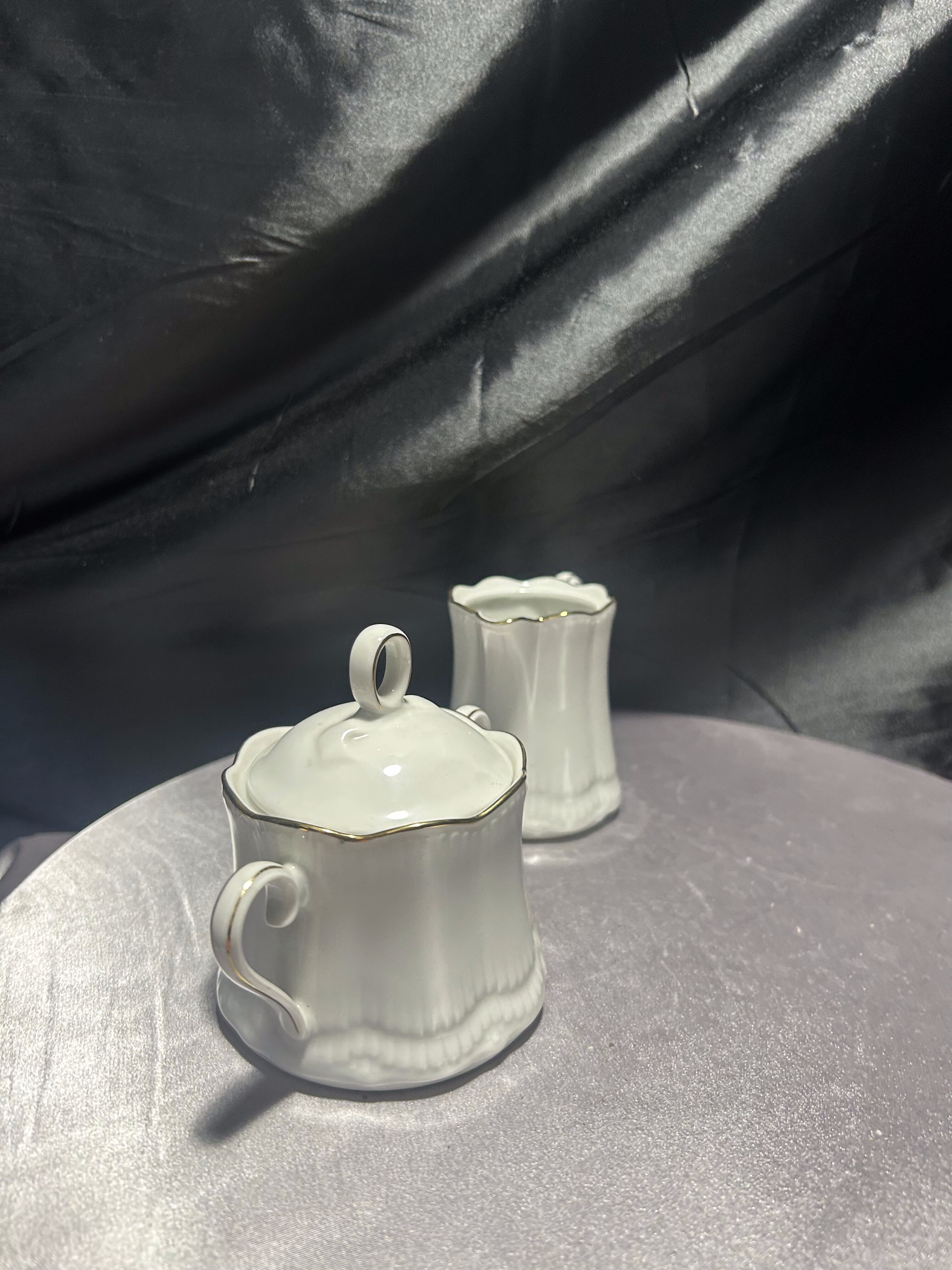 Elegancki zestaw składający się z porcelanowej cukiernicy z pokrywką i mlecznika, oba sygnowane „Schirnding Bavaria” (Made in W. Germany). Klasyczna forma ze złoconym wykończeniem i delikatną falą przy brzegu. Doskonałe do serwowania kawy lub herbaty, wyróżniające się estetyką lat 60./70.