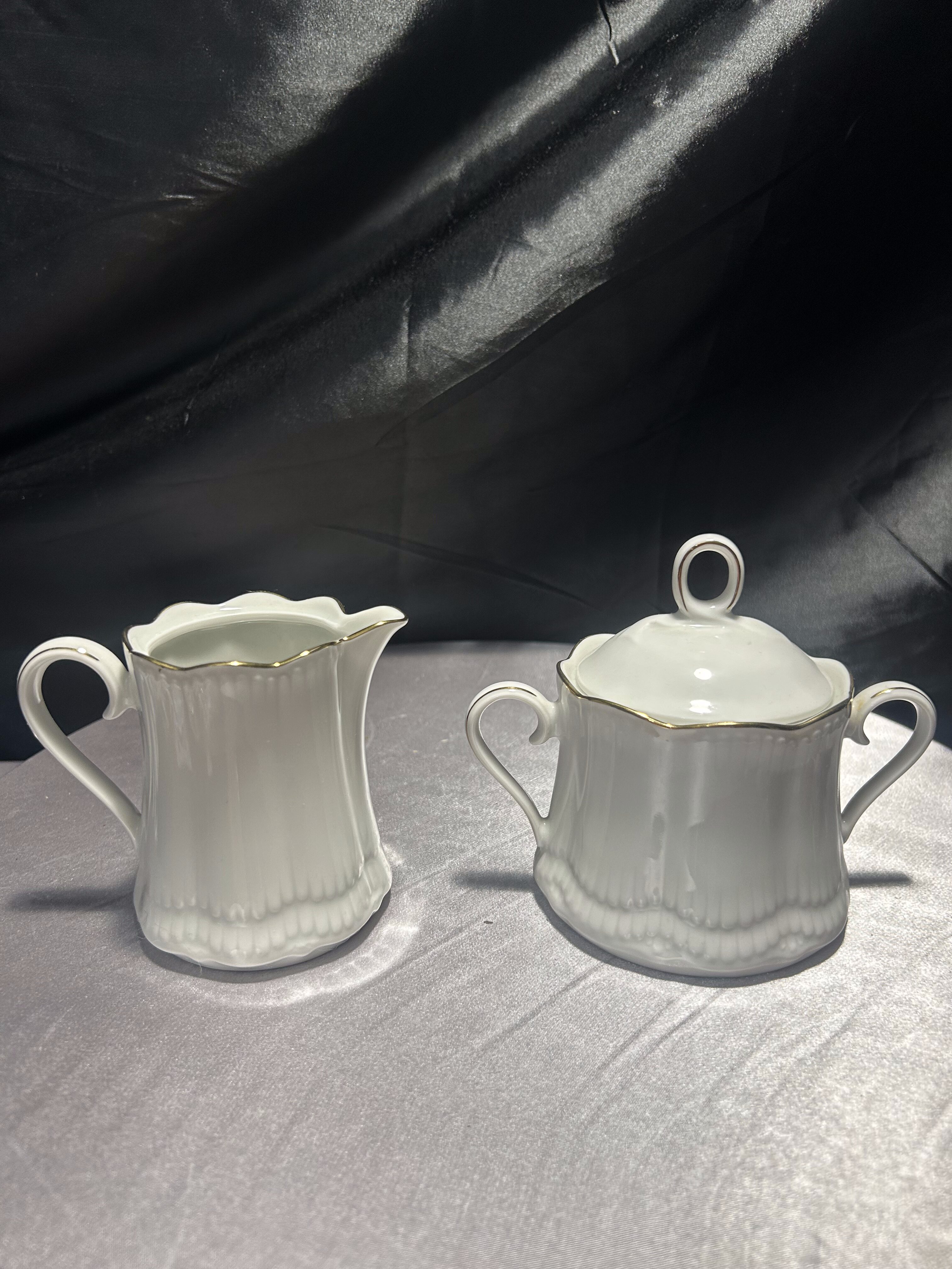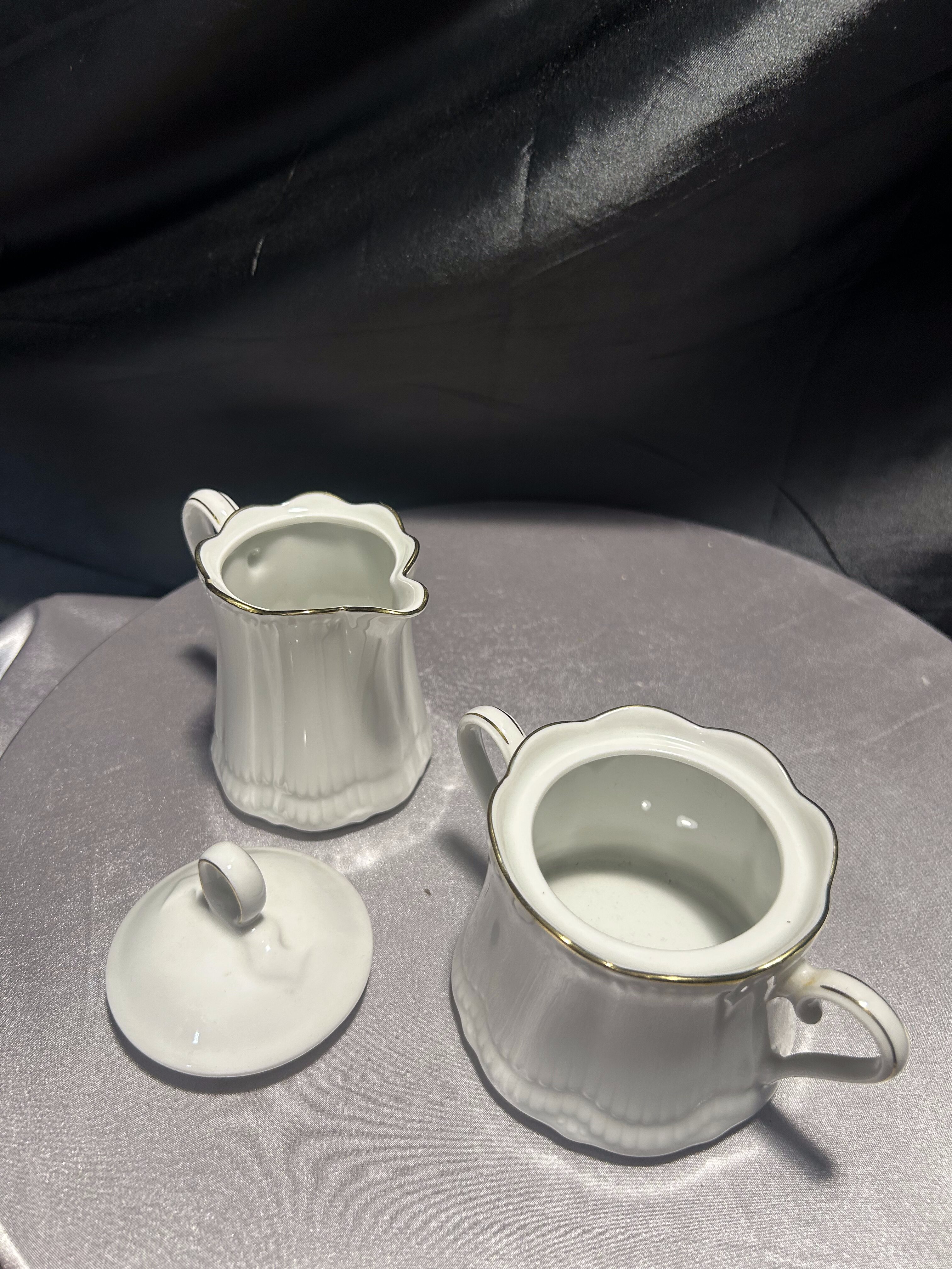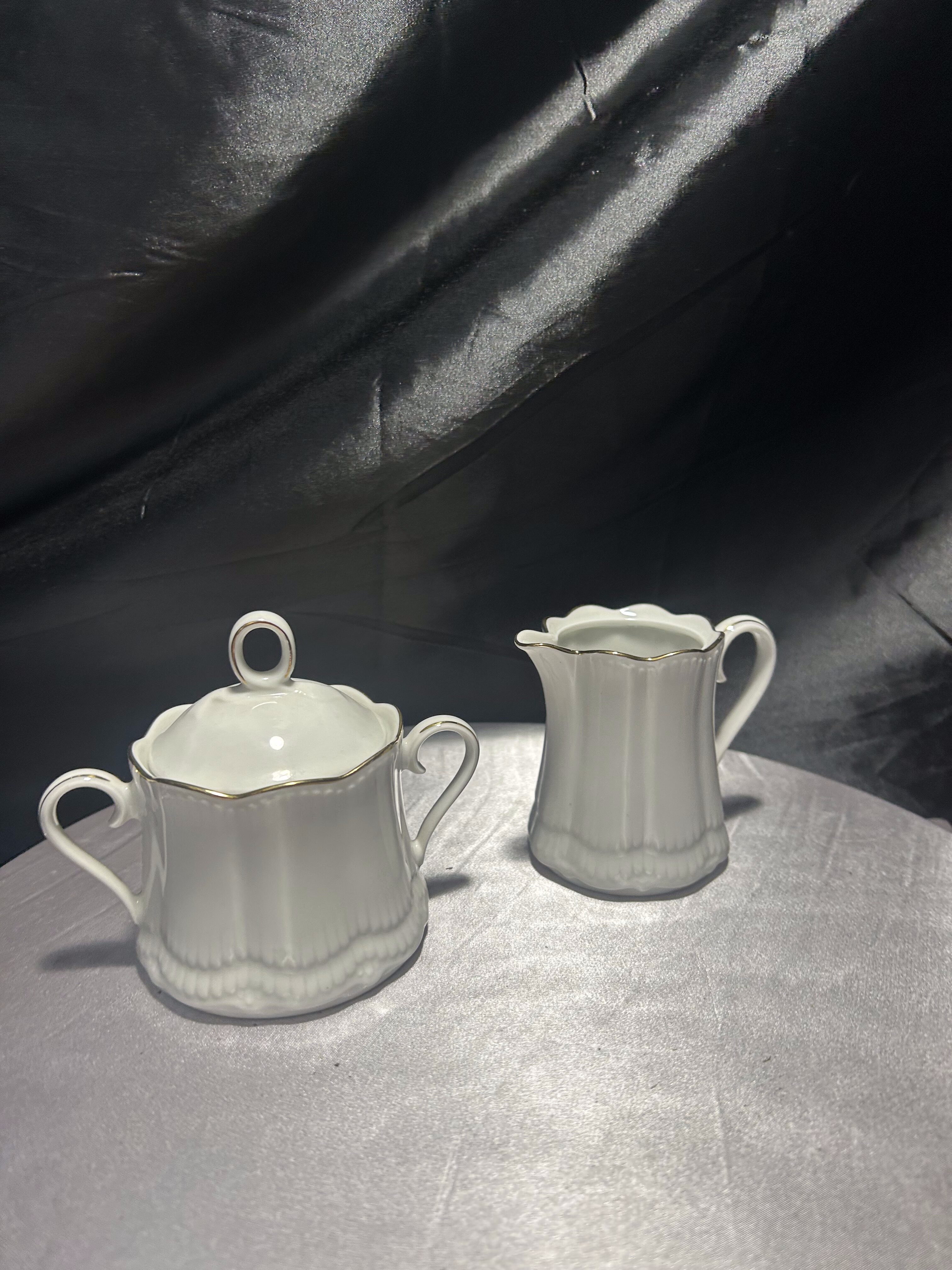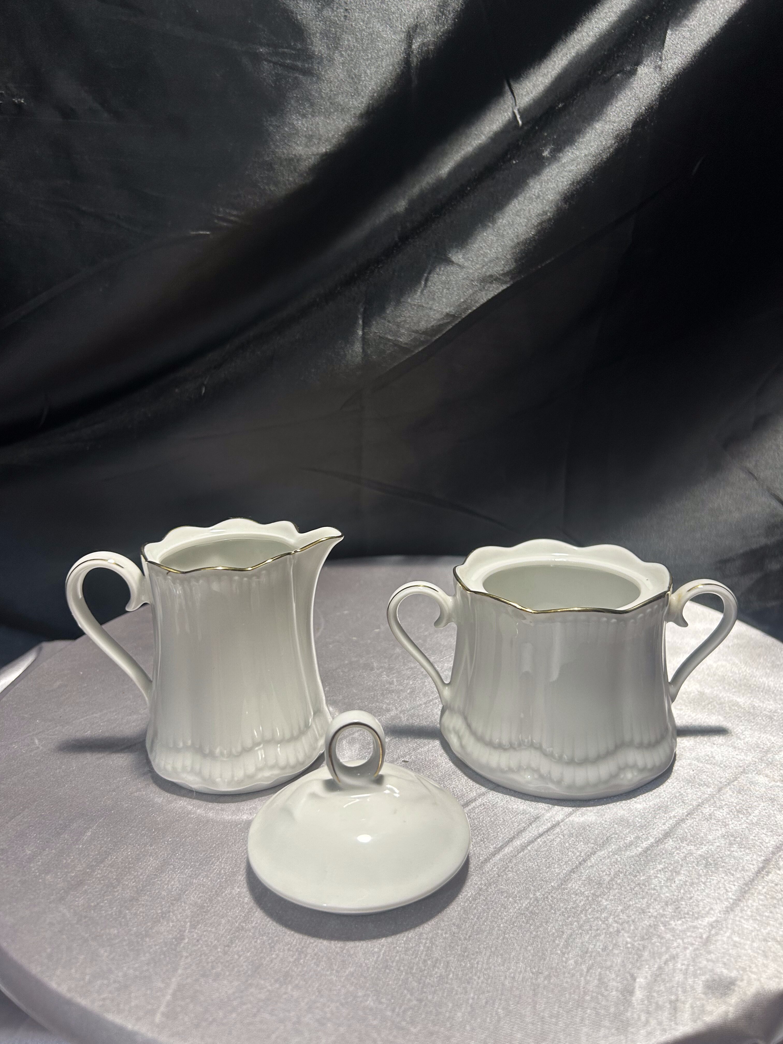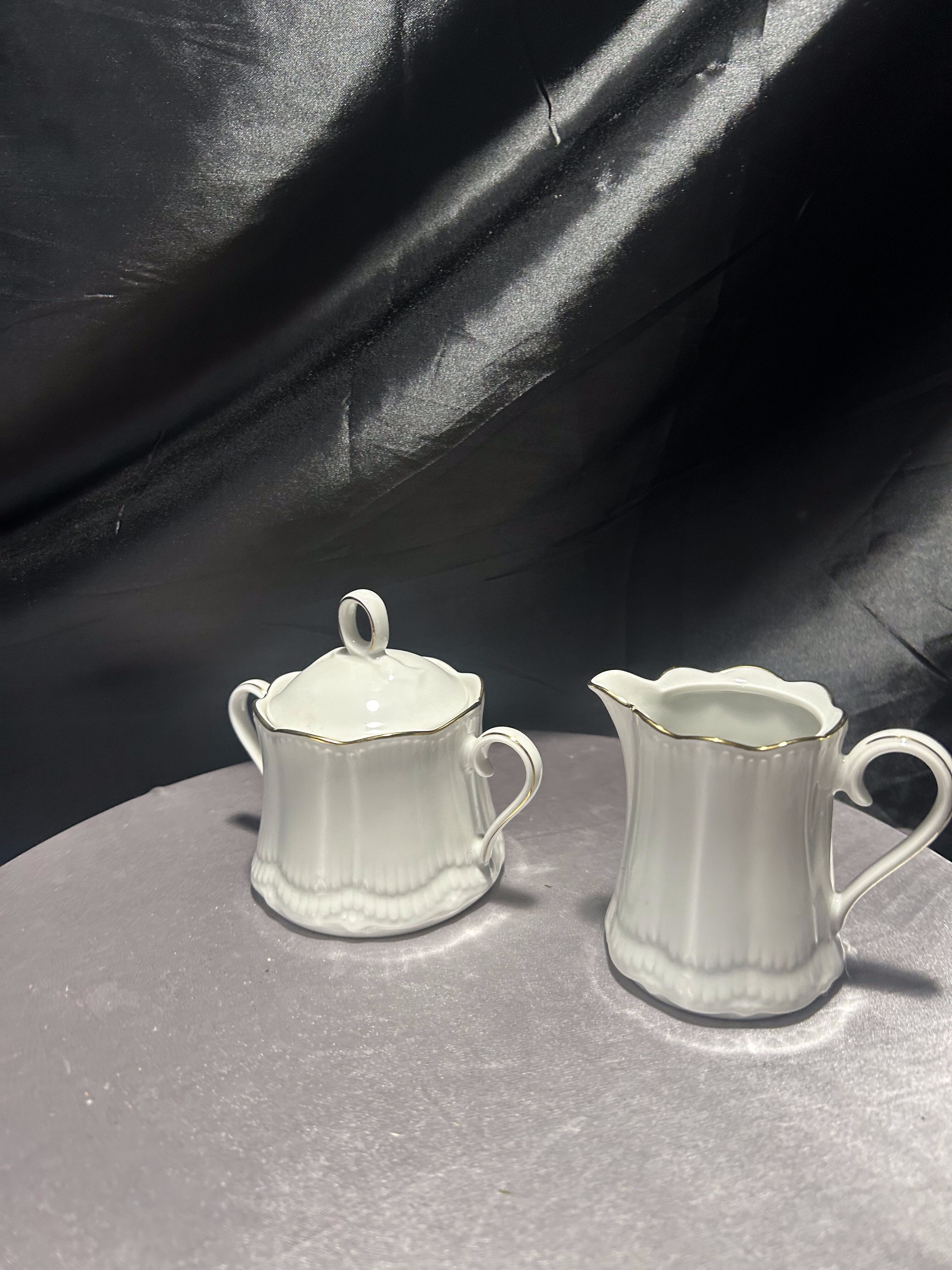 Elegancki zestaw składający się z porcelanowej cukiernicy z pokrywką i mlecznika, oba sygnowane „Schirnding Bavaria” (Made in W. Germany). Klasyczna forma ze złoconym wykończeniem i delikatną falą przy brzegu. Doskonałe do serwowania kawy lub herbaty, wyróżniające się estetyką lat 60./70.