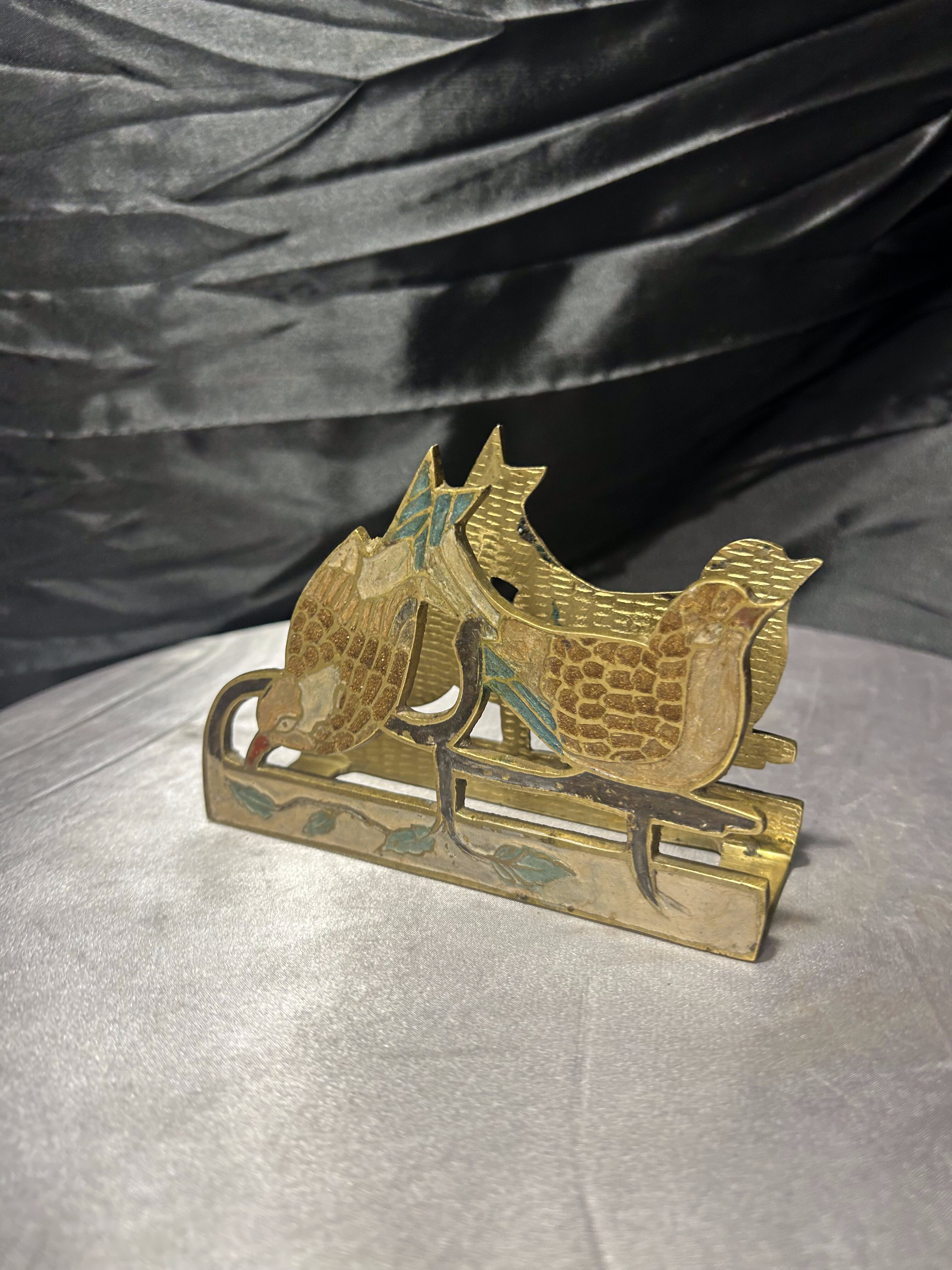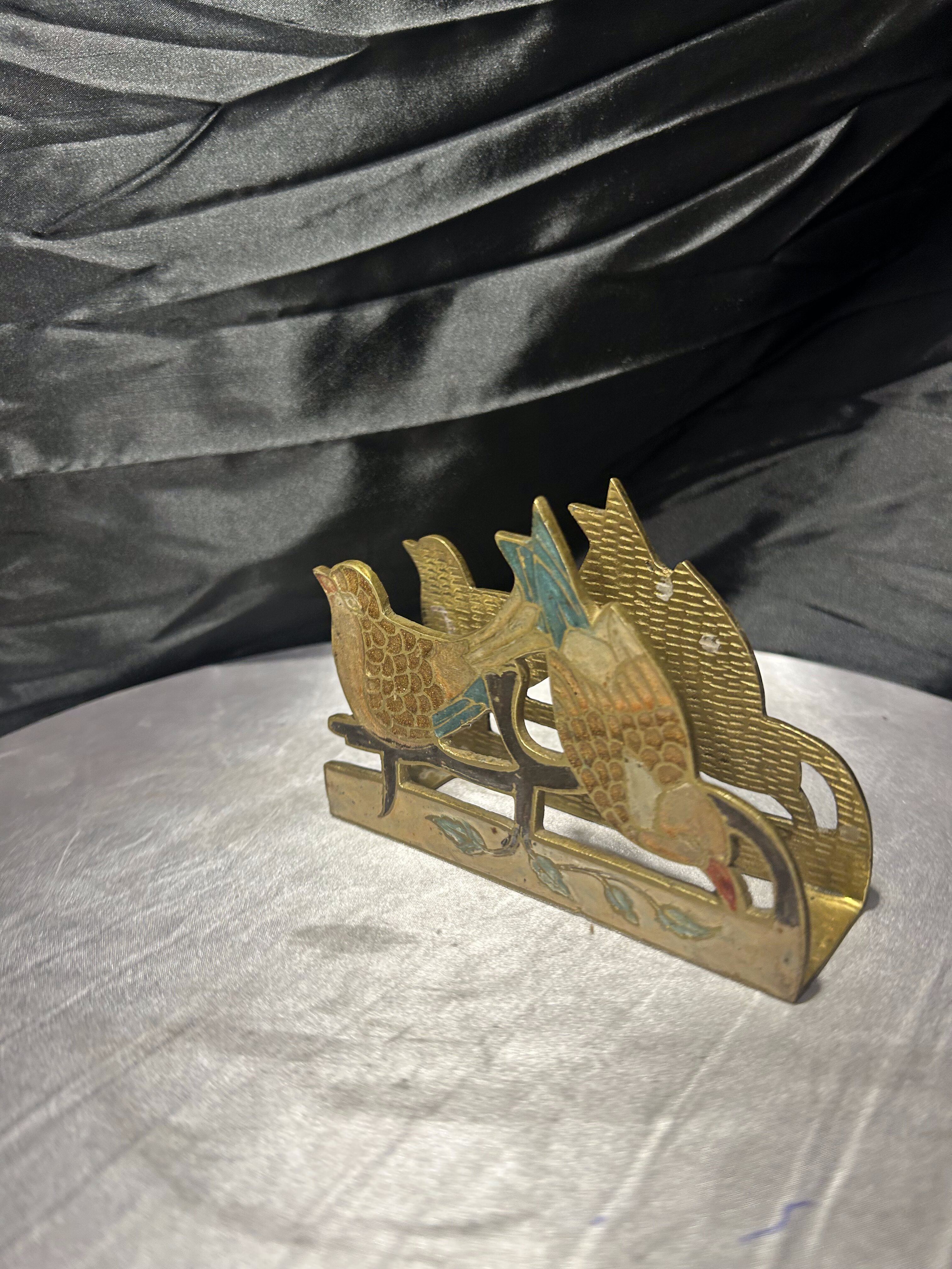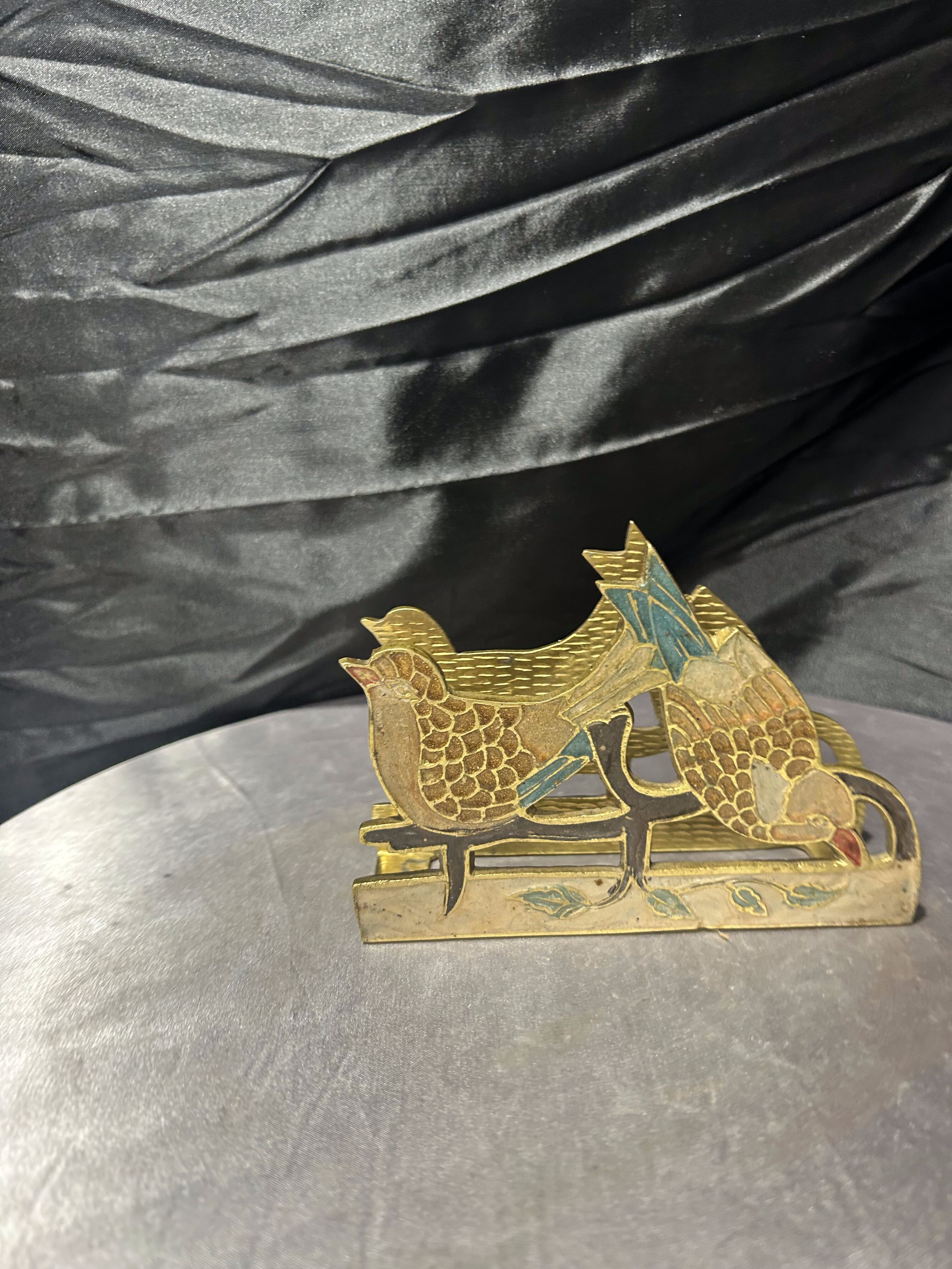 Dekoracyjny serwetnik wykonany z mosiądzu, ozdobiony motywem dwóch ptaszków. Całość wzbogacona subtelną emalią, która nadaje przedmiotowi lekkości i kolorystycznego uroku. Stylizowana forma oraz staranne opracowanie detali sprawiają, że serwetnik pełni nie tylko funkcję użytkową, ale również dekoracyjną.