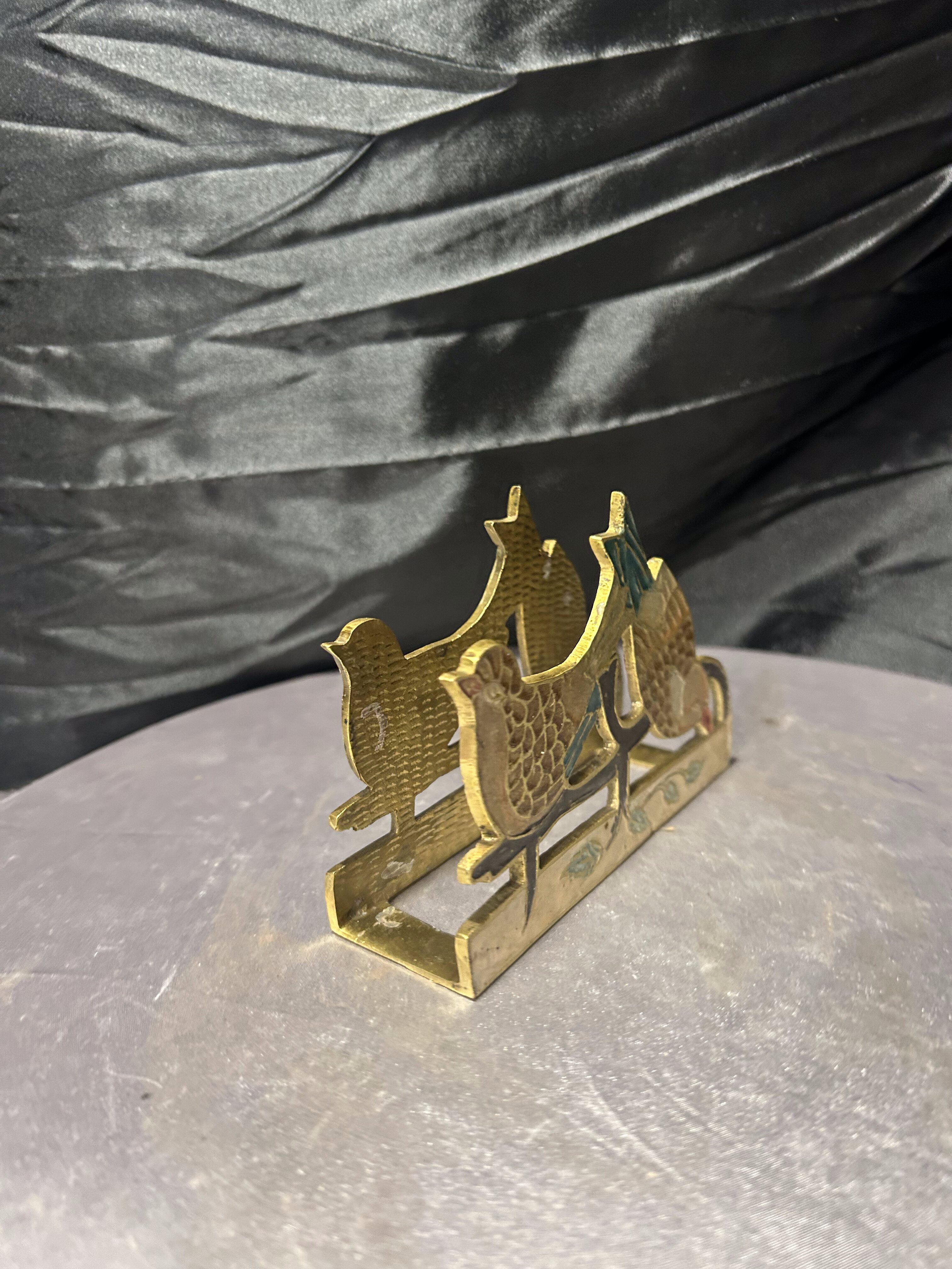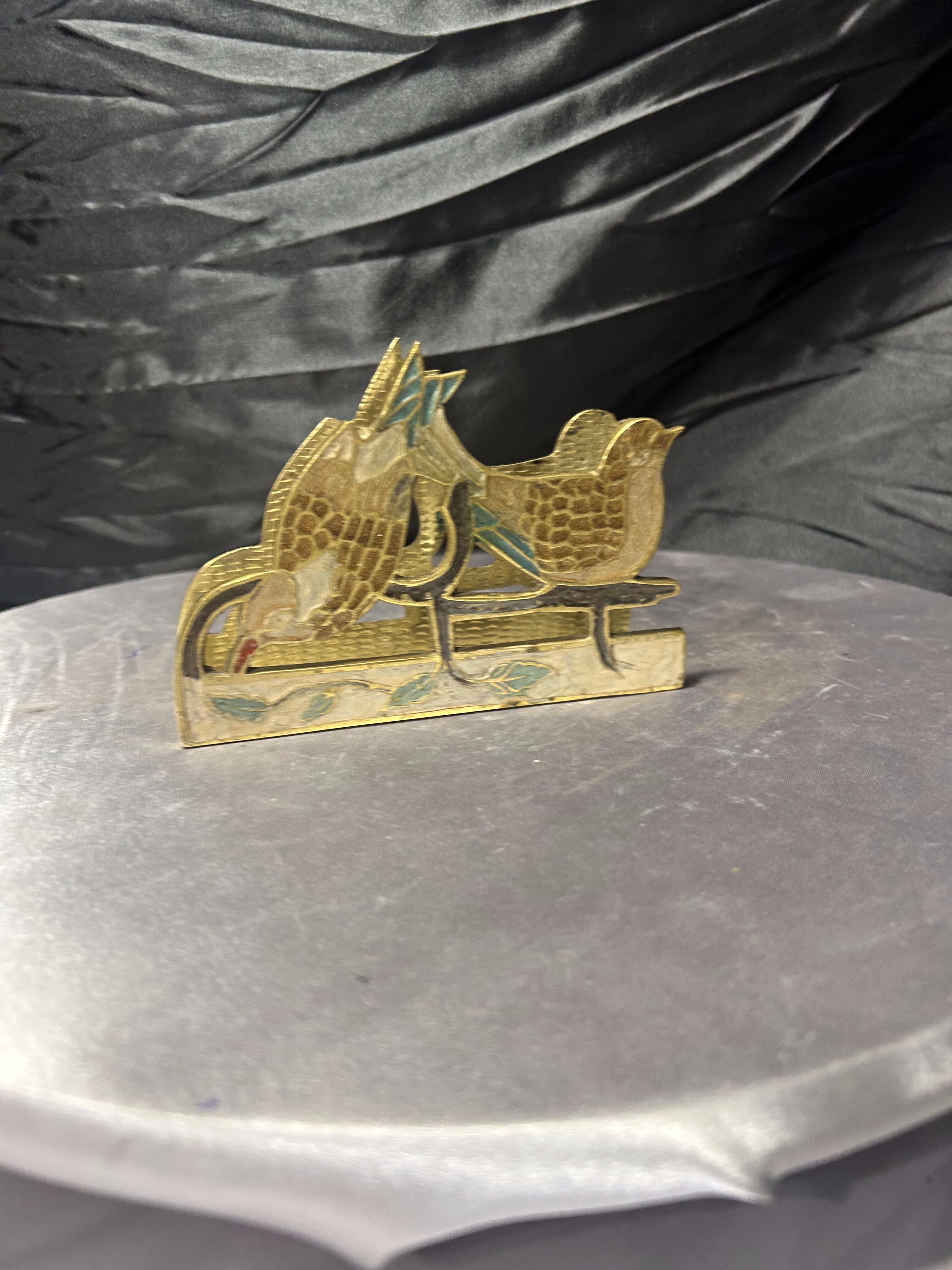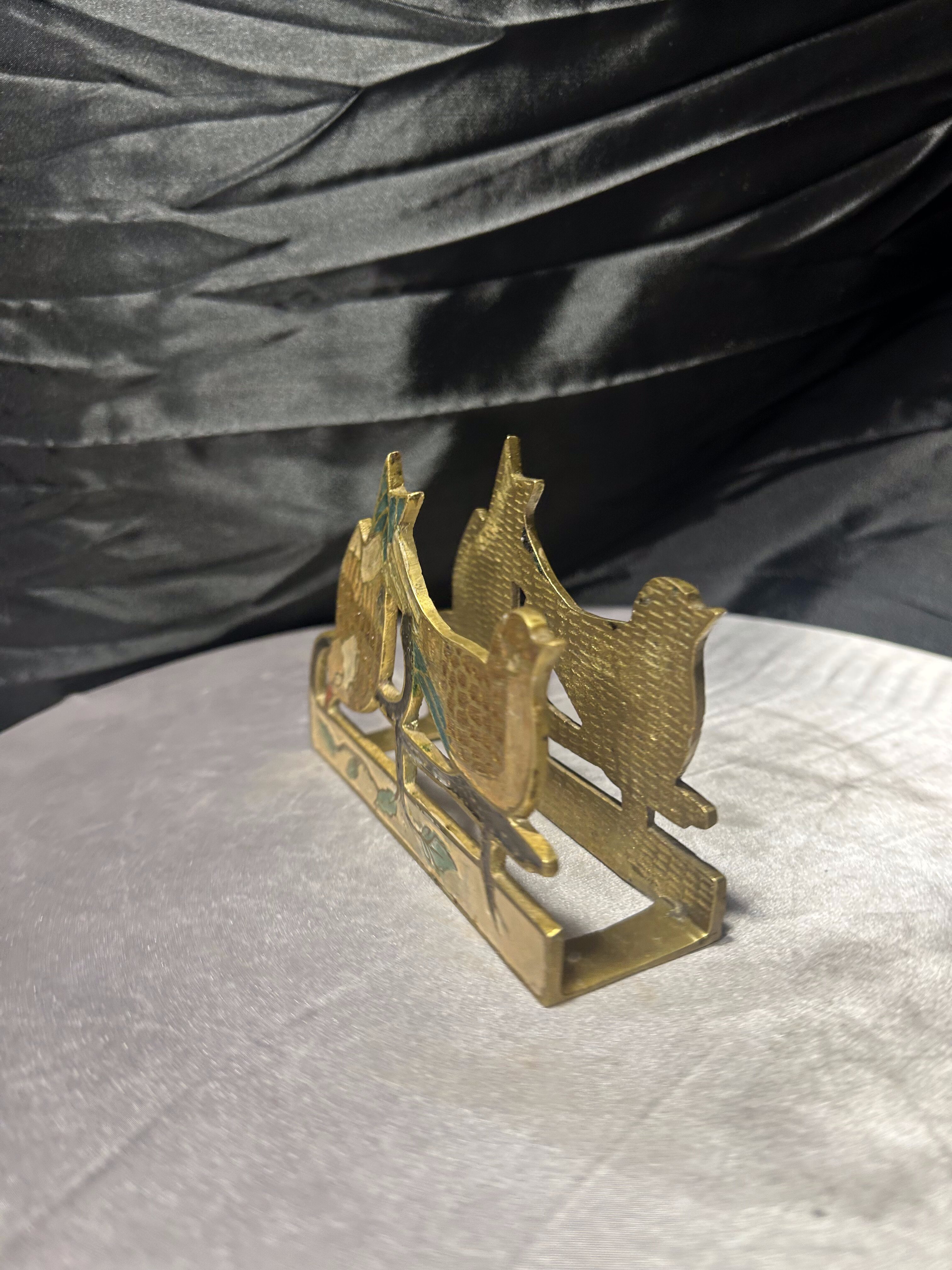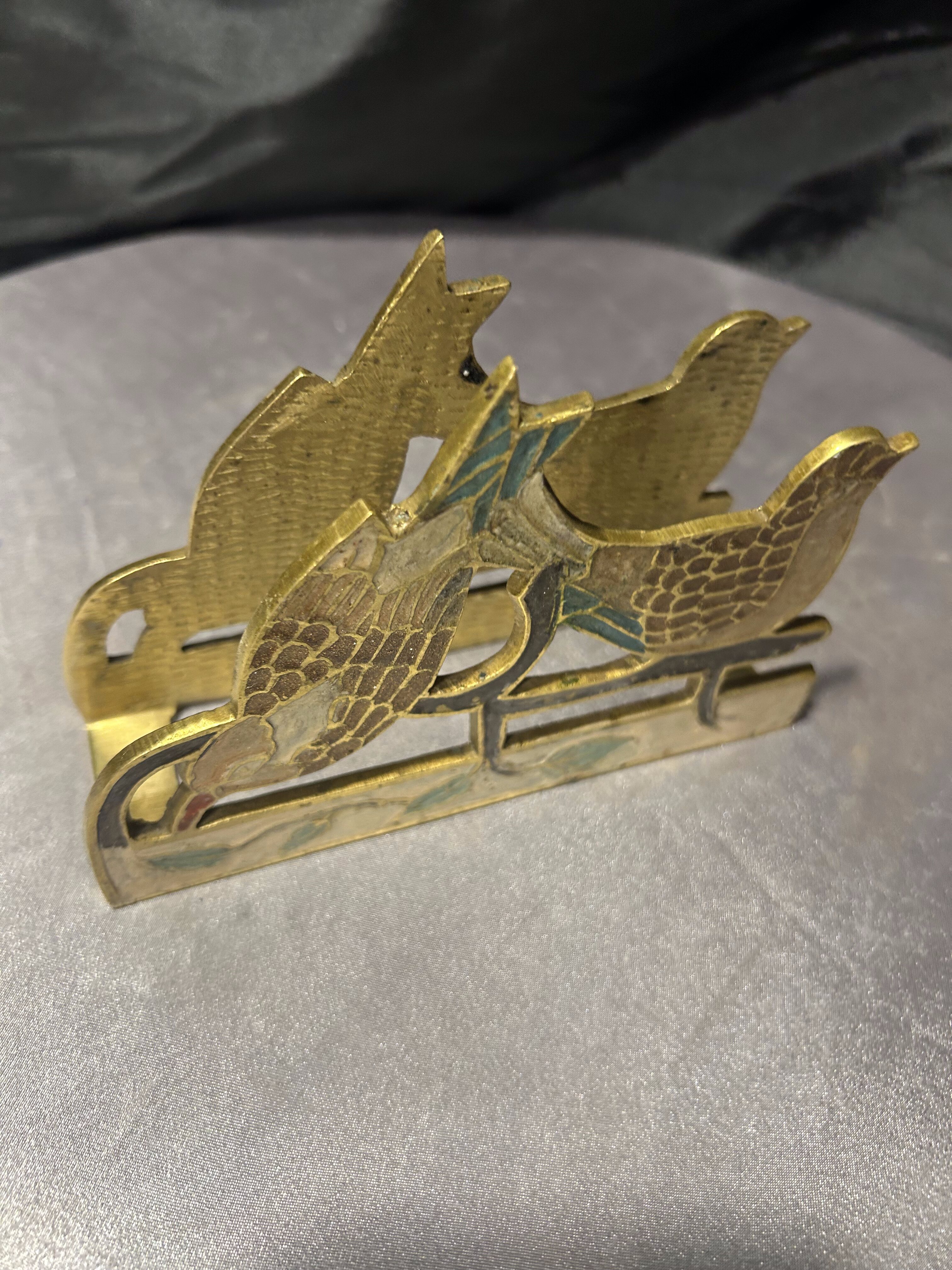 Dekoracyjny serwetnik wykonany z mosiądzu, ozdobiony motywem dwóch ptaszków. Całość wzbogacona subtelną emalią, która nadaje przedmiotowi lekkości i kolorystycznego uroku. Stylizowana forma oraz staranne opracowanie detali sprawiają, że serwetnik pełni nie tylko funkcję użytkową, ale również dekoracyjną.