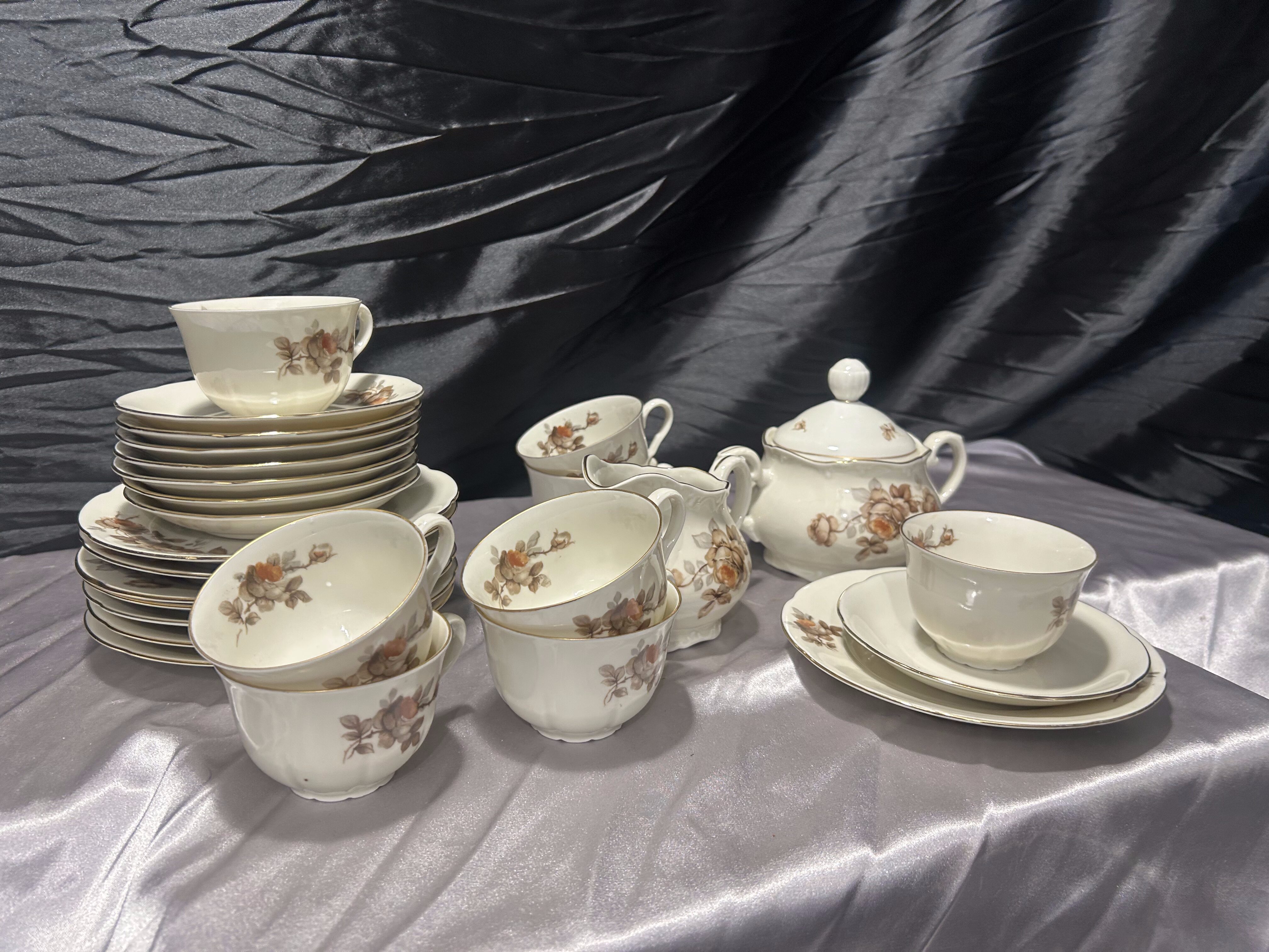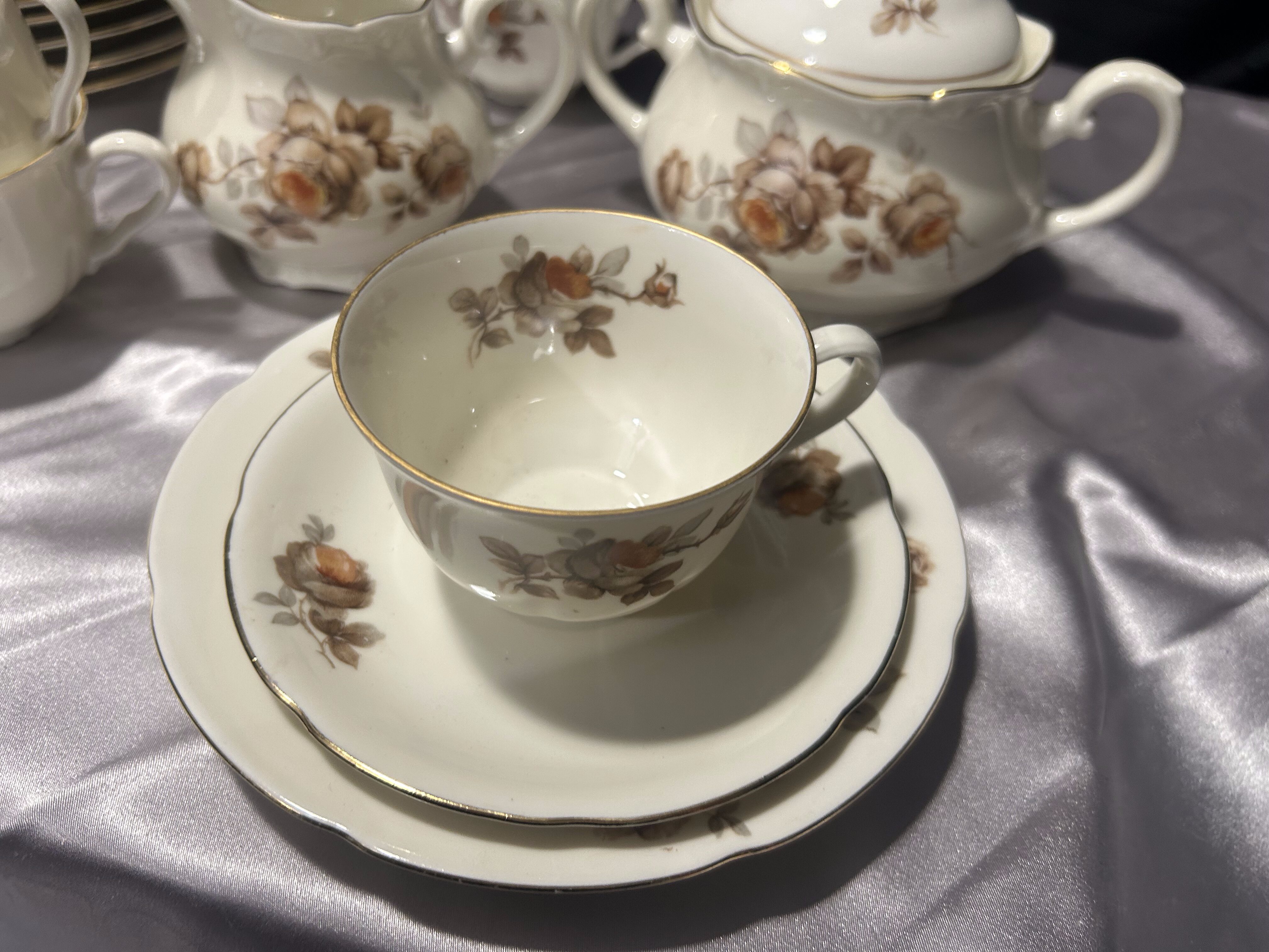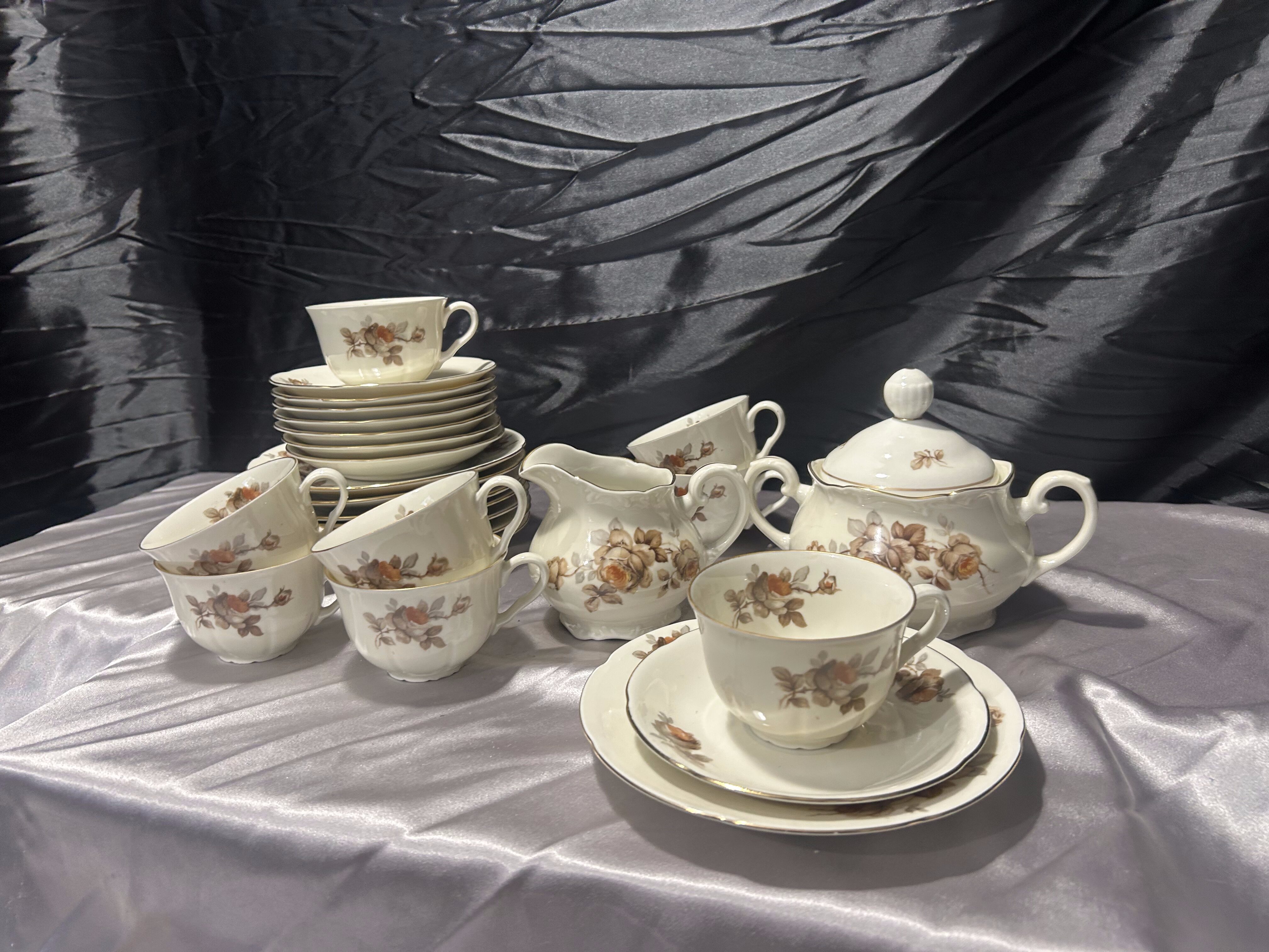 Elegancki zestaw porcelany dla ośmiu osób, składający się z filiżanek, podstawek oraz talerzyków deserowych, uzupełniony mlecznikiem i cukiernicą. Całość utrzymana w klasycznej, kremowej tonacji z subtelnym, kwiatowym motywem w ciepłych odcieniach brązu i beżu.