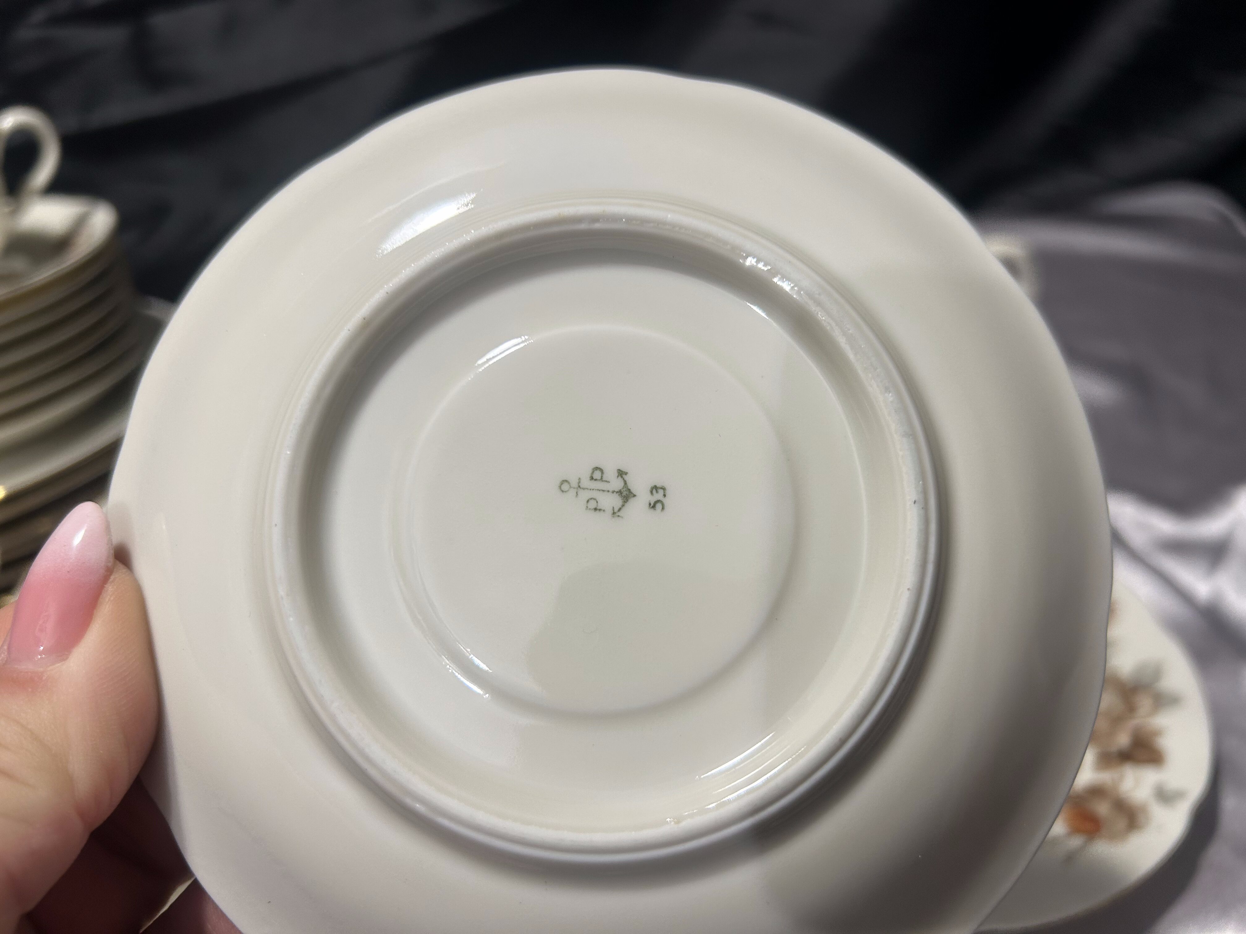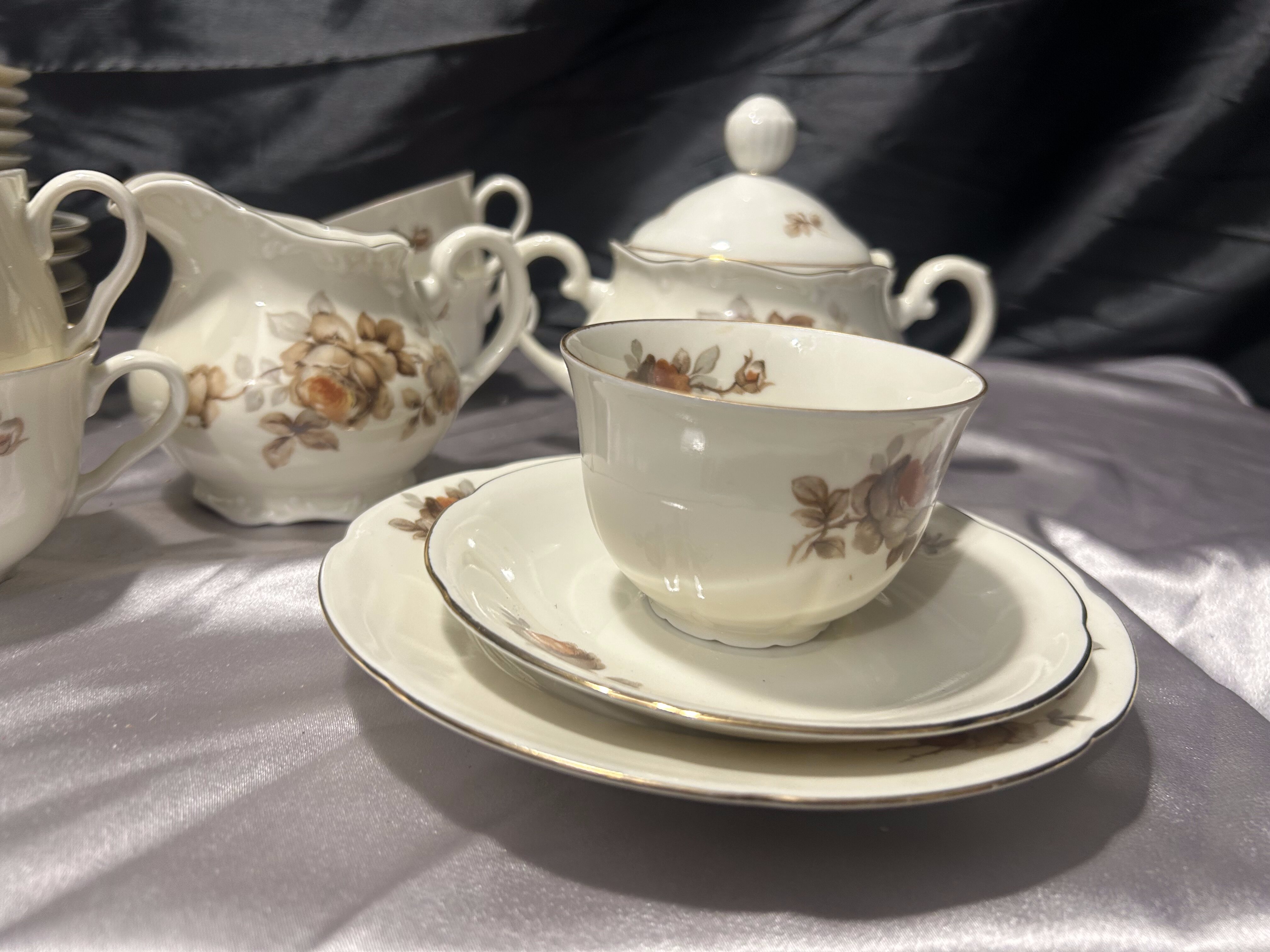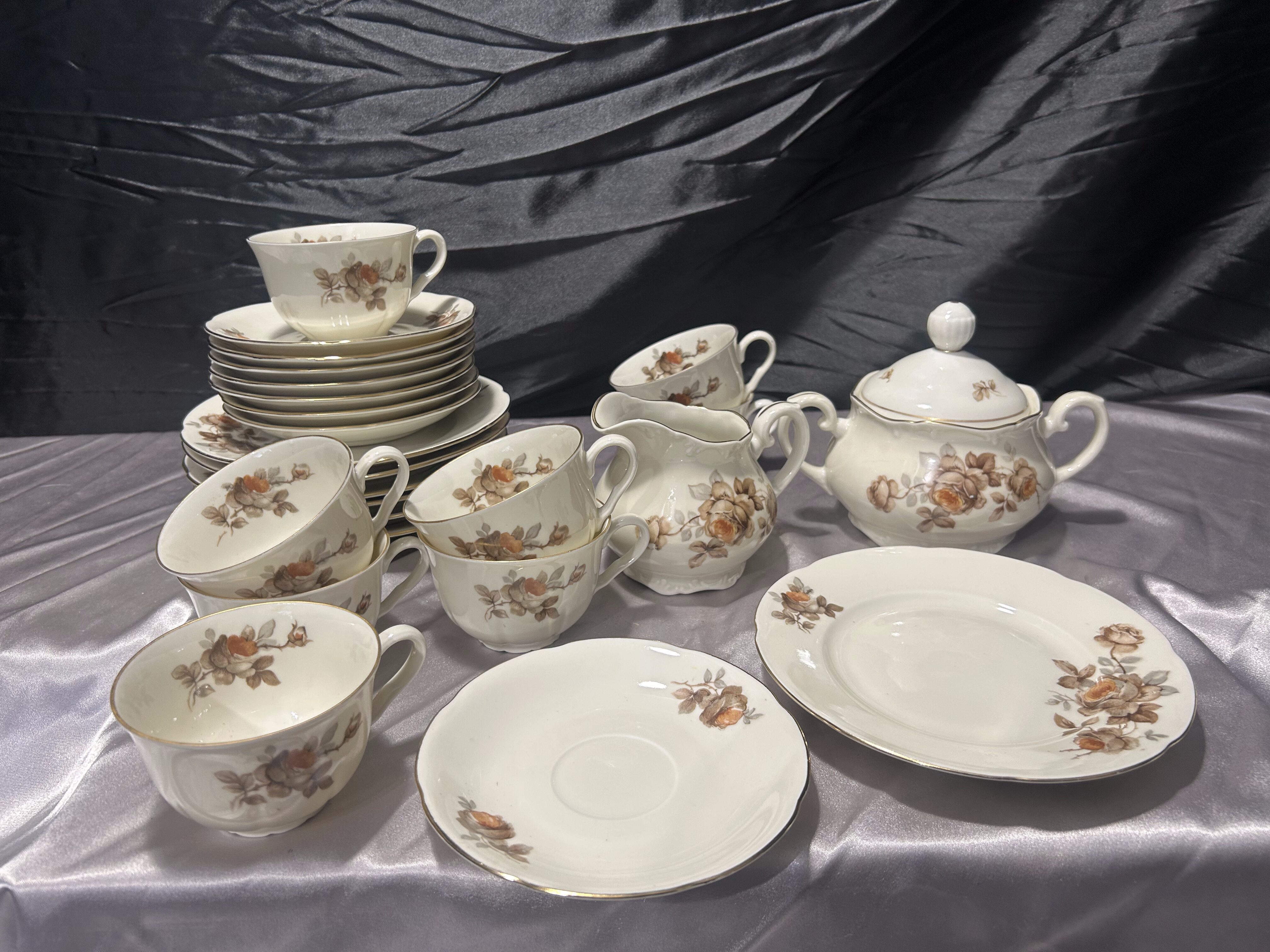 Elegancki zestaw porcelany dla ośmiu osób, składający się z filiżanek, podstawek oraz talerzyków deserowych, uzupełniony mlecznikiem i cukiernicą. Całość utrzymana w klasycznej, kremowej tonacji z subtelnym, kwiatowym motywem w ciepłych odcieniach brązu i beżu.