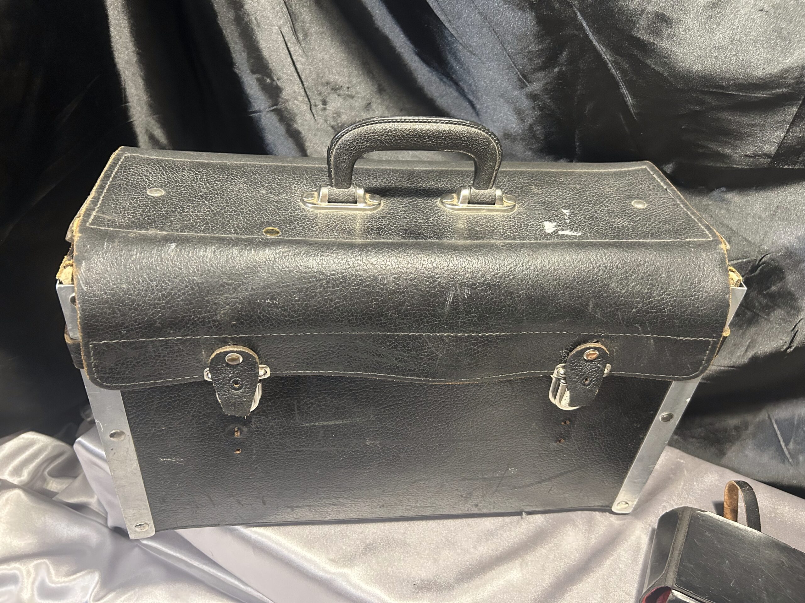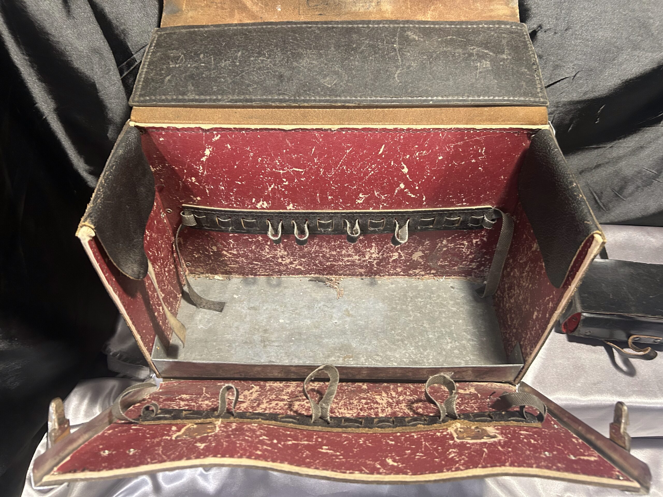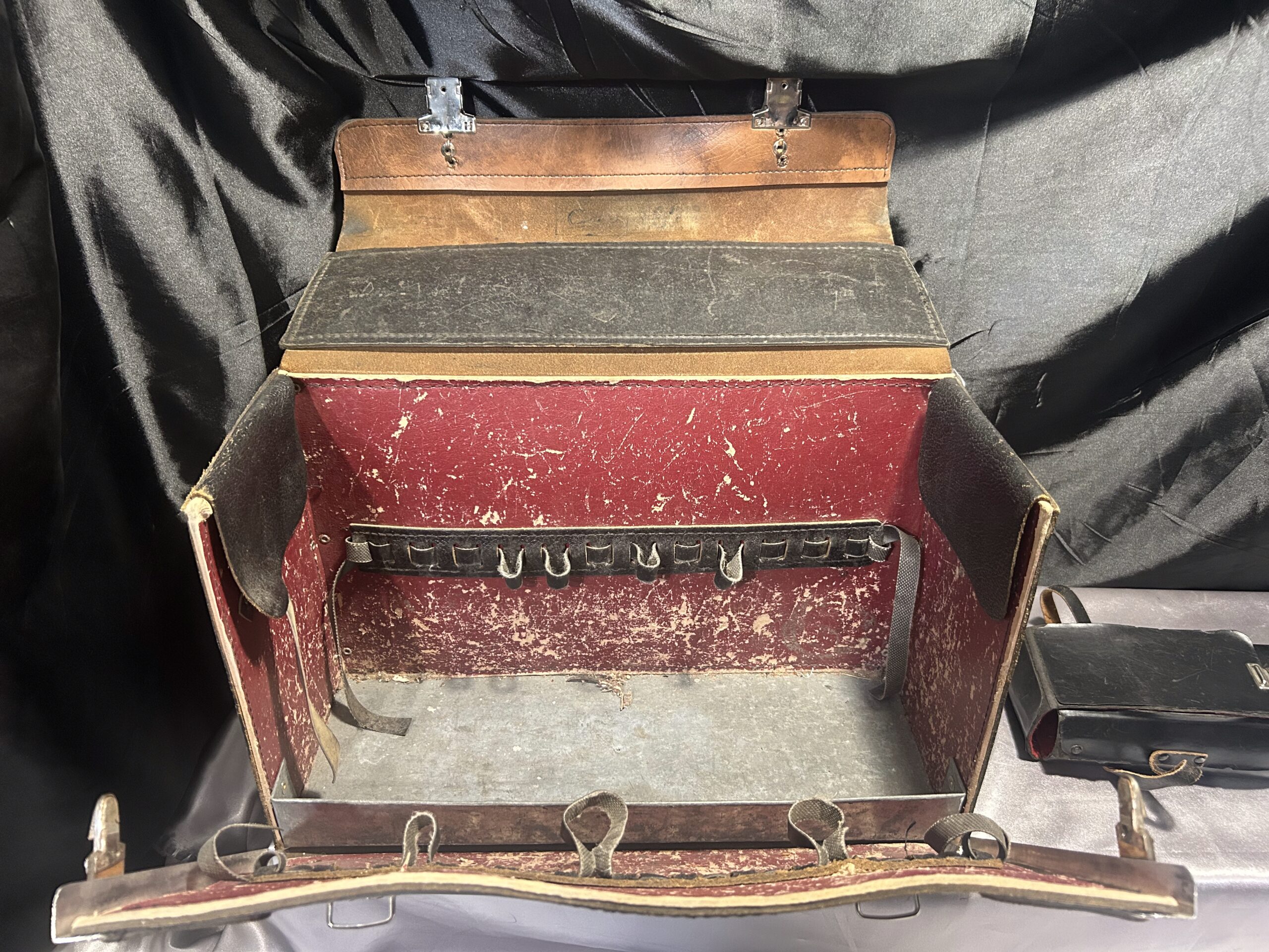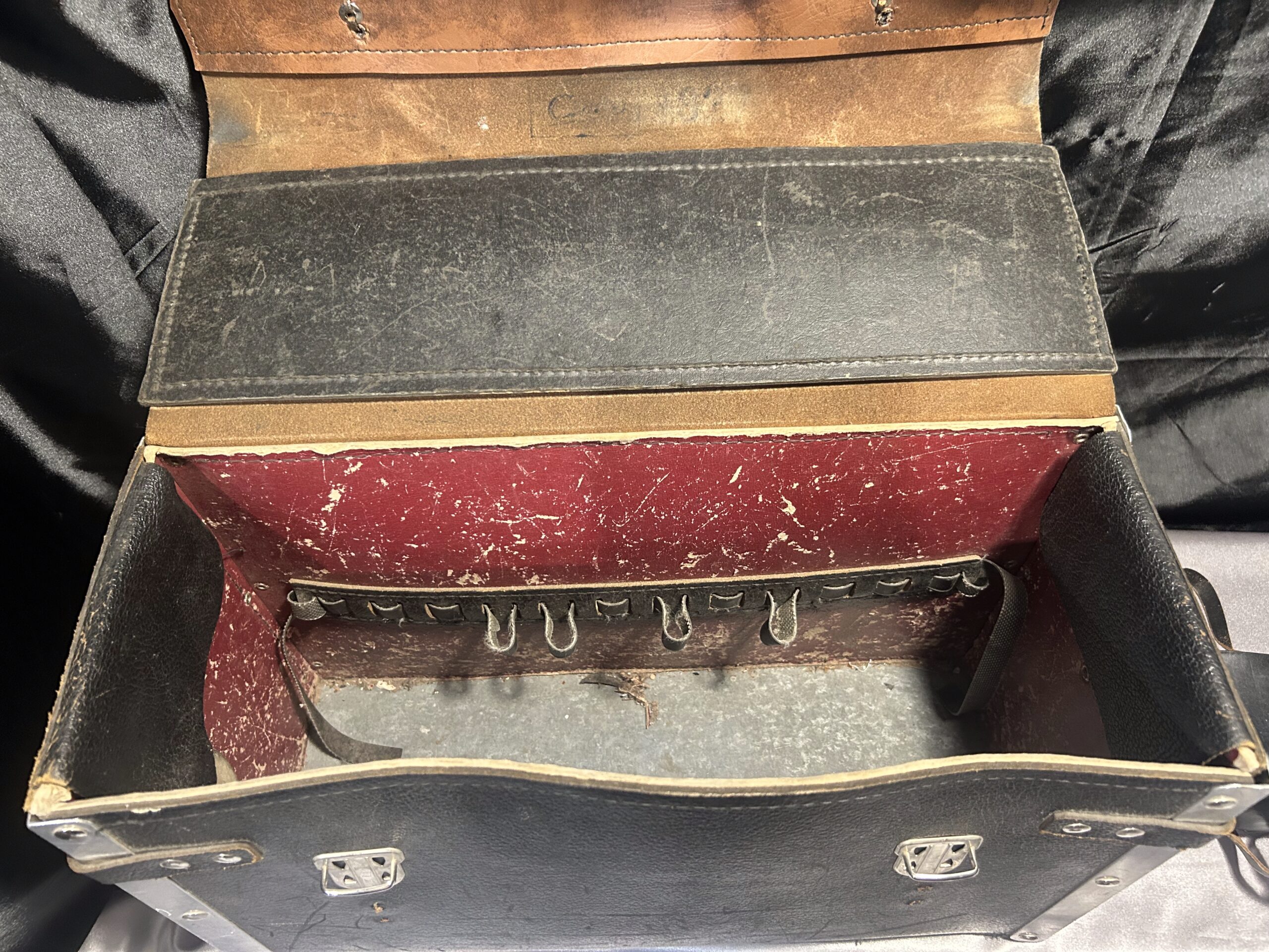 Torba w bardzo dobrym stanie, skóra zachowana w świetnej kondycji. Doskonała dla profesjonalistów, rzemieślników oraz majsterkowiczów, którzy potrzebują solidnej i praktycznej walizki na narzędzia. Istnieje możliwość wysyłki po wcześniejszym ustaleniu szczegółów.