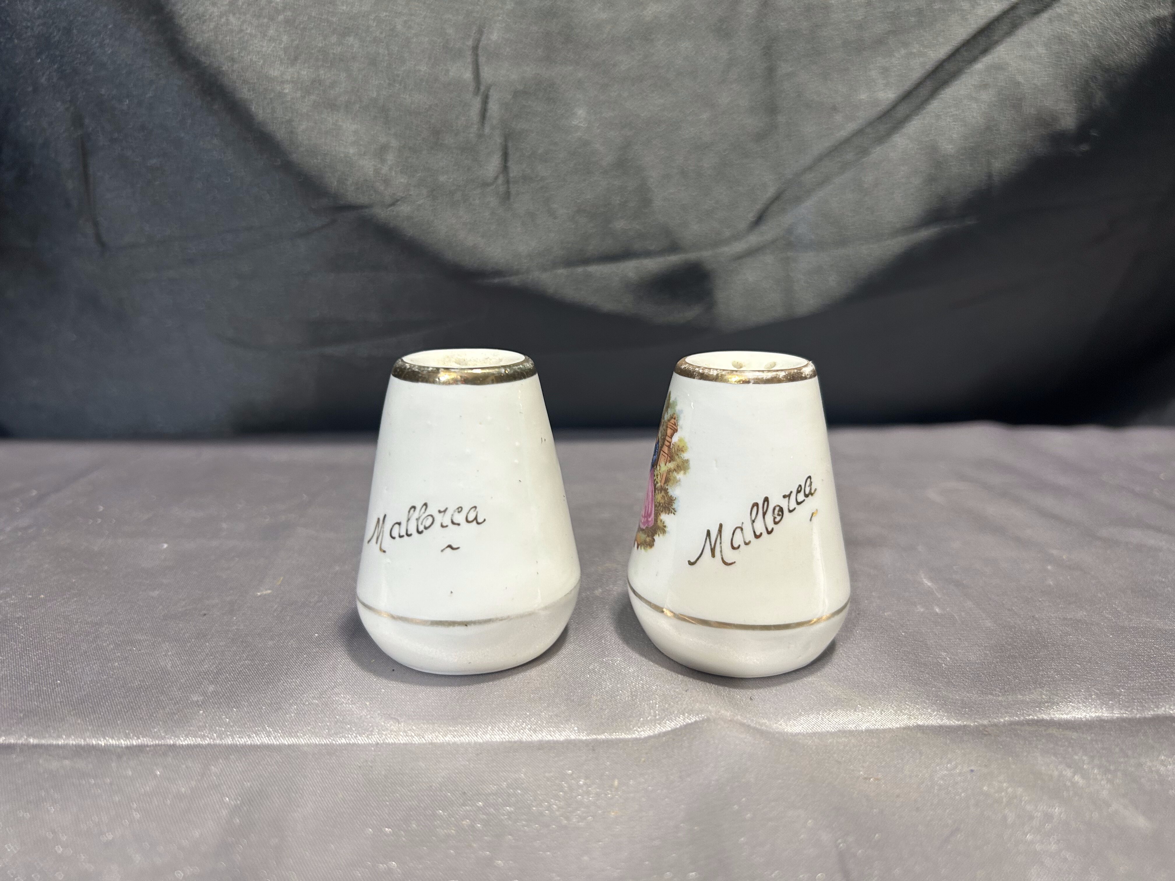 Na sprzedaż dekoracyjny zestaw ceramicznych przyprawników w stożkowatym kształcie, ozdobionych malowidłami w starym stylu i delikatnymi złotymi obwódkami. To elegancki i subtelny dodatek, który doda szyku każdemu nakryciu stołu.