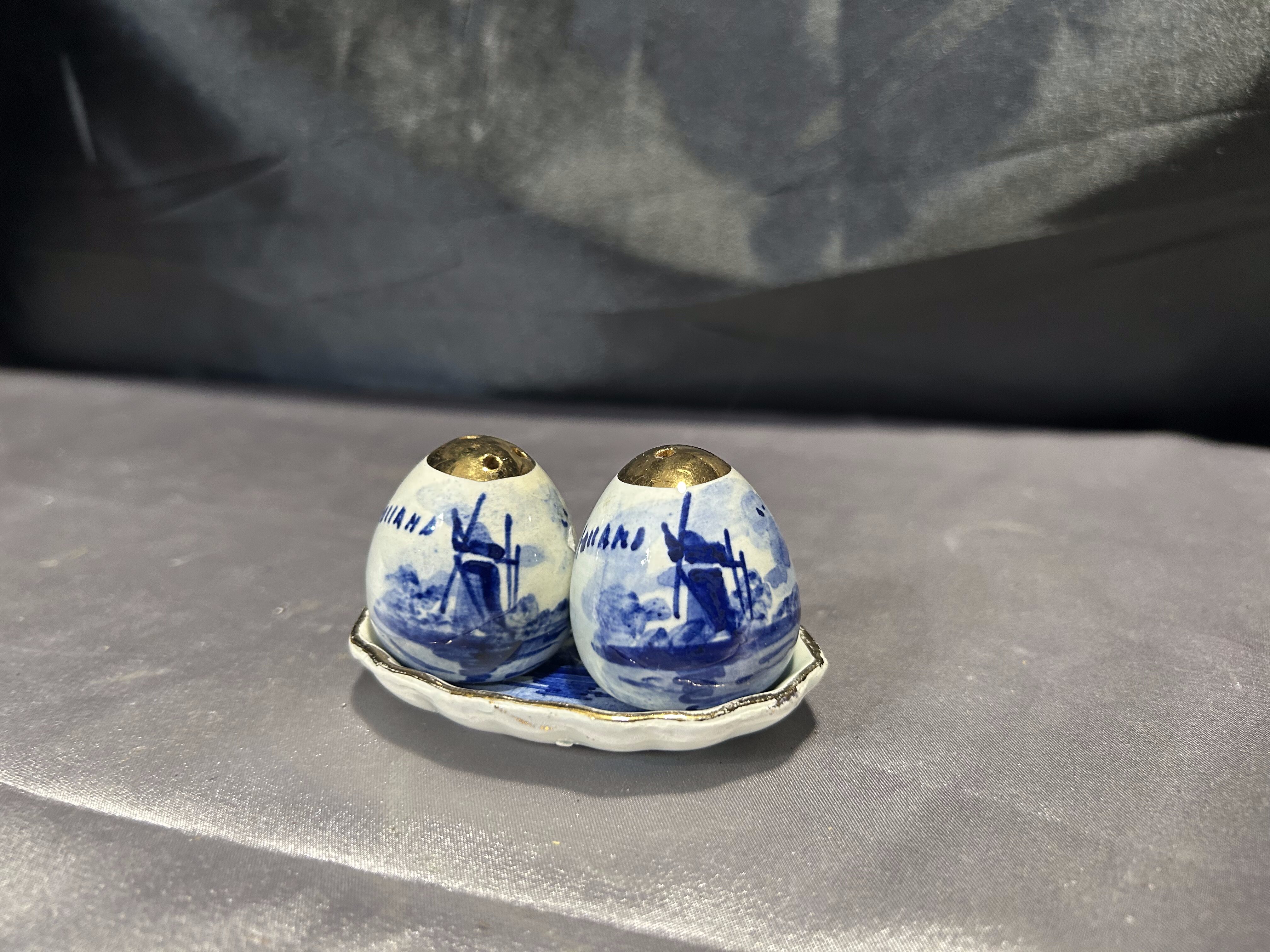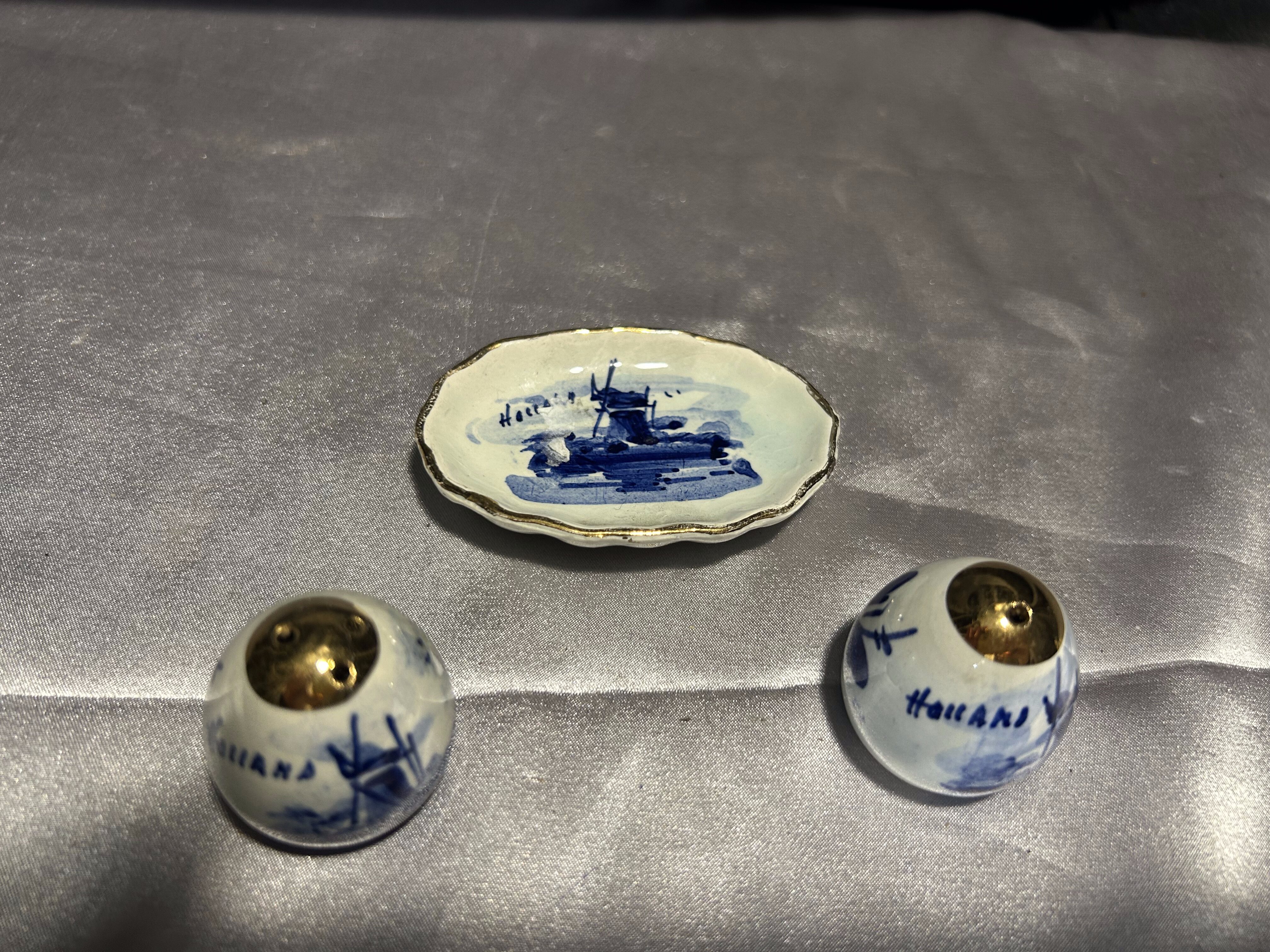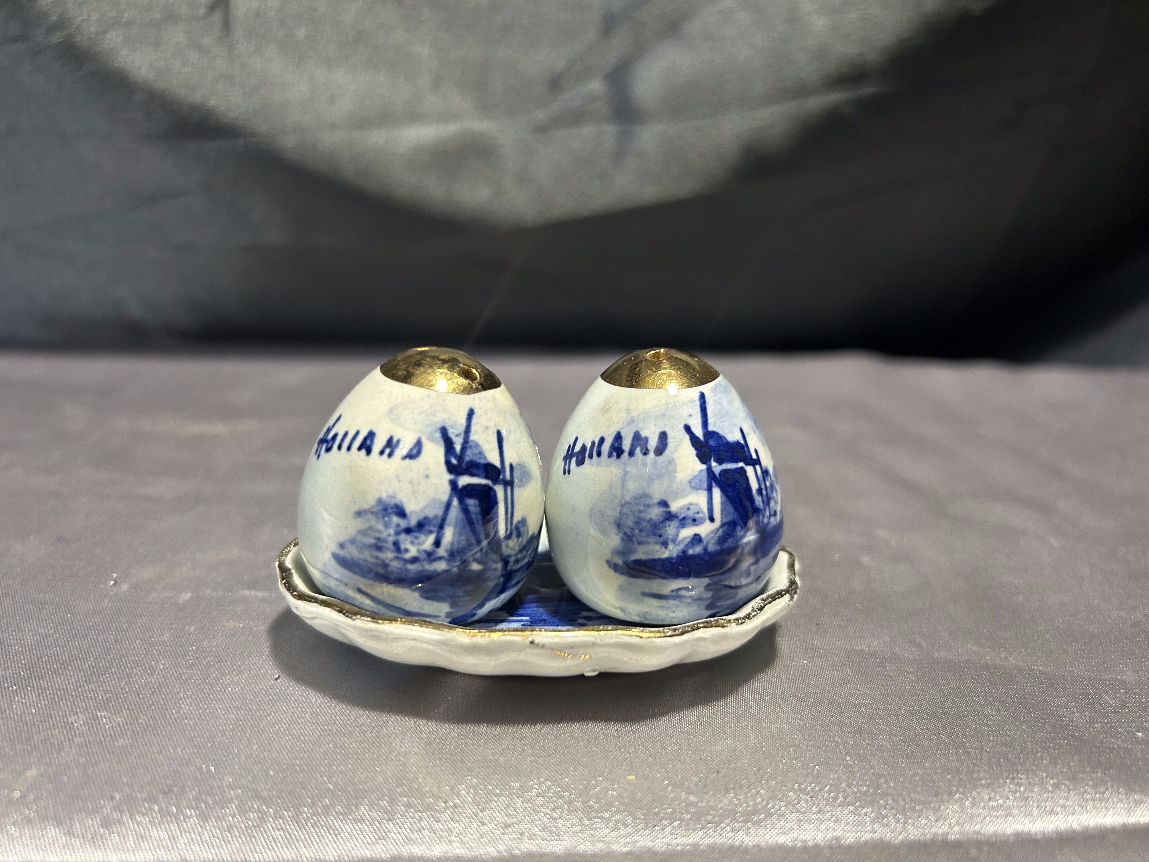 Na sprzedaż uroczy zestaw ceramicznych przyprawników – solniczka i pieprzniczka na dopasowanym talerzyku. Białe, ręcznie malowane w klasyczny motyw niebieskich wiatraków, z metalowymi (miedzianymi) wieczkami. W jednym z pojemników brakuje korkowej zatyczki, co zostało uwzględnione w niższej cenie.