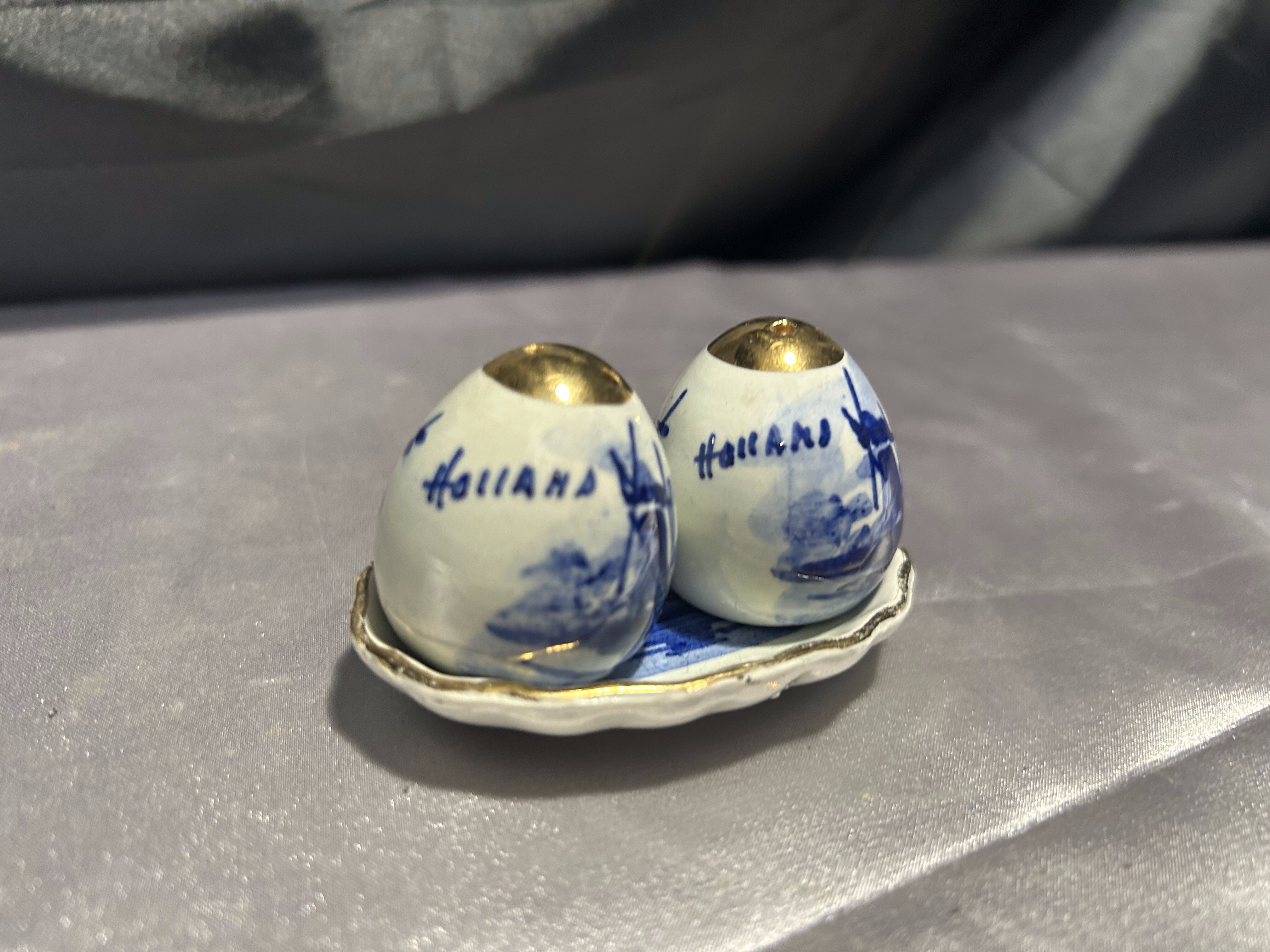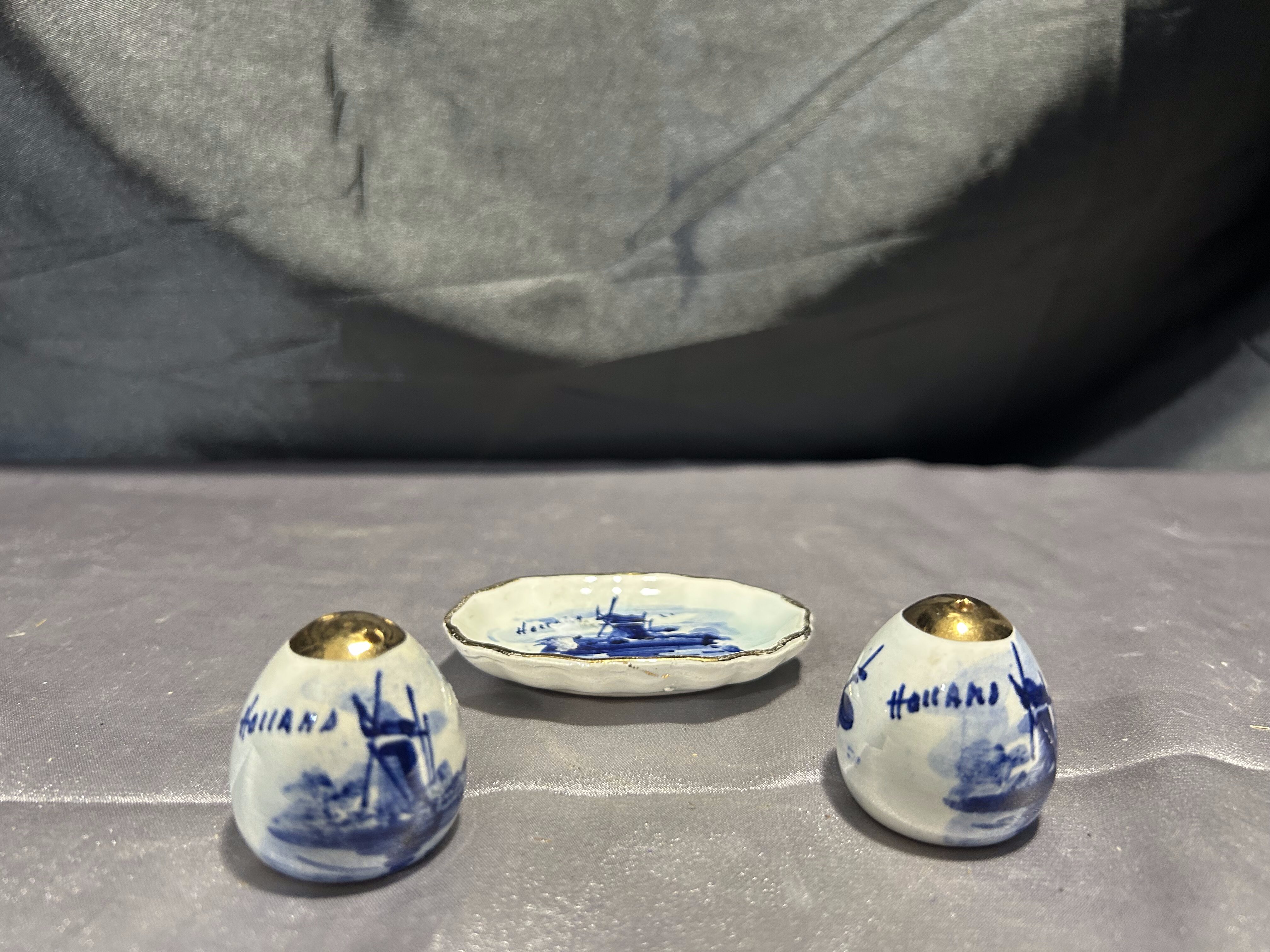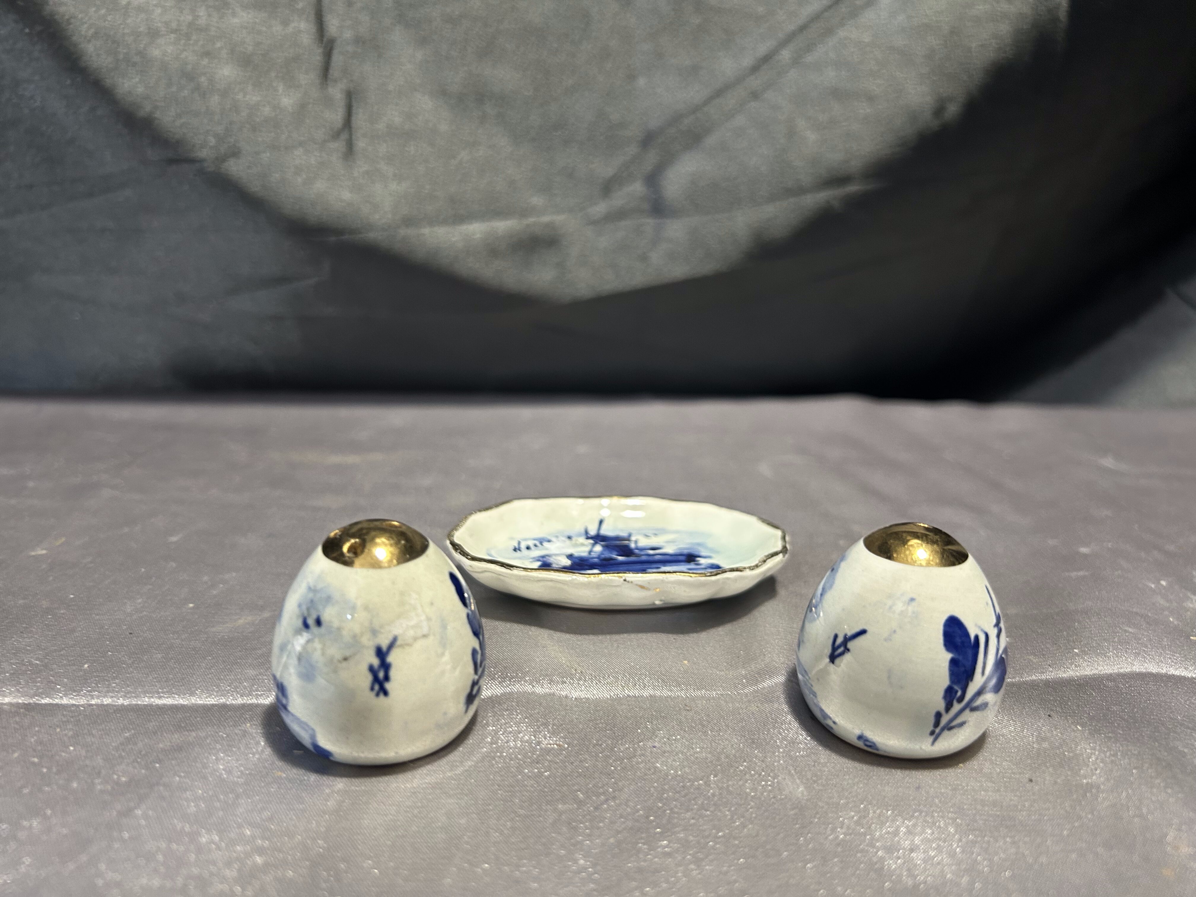 Na sprzedaż uroczy zestaw ceramicznych przyprawników – solniczka i pieprzniczka na dopasowanym talerzyku. Białe, ręcznie malowane w klasyczny motyw niebieskich wiatraków, z metalowymi (miedzianymi) wieczkami. W jednym z pojemników brakuje korkowej zatyczki, co zostało uwzględnione w niższej cenie.